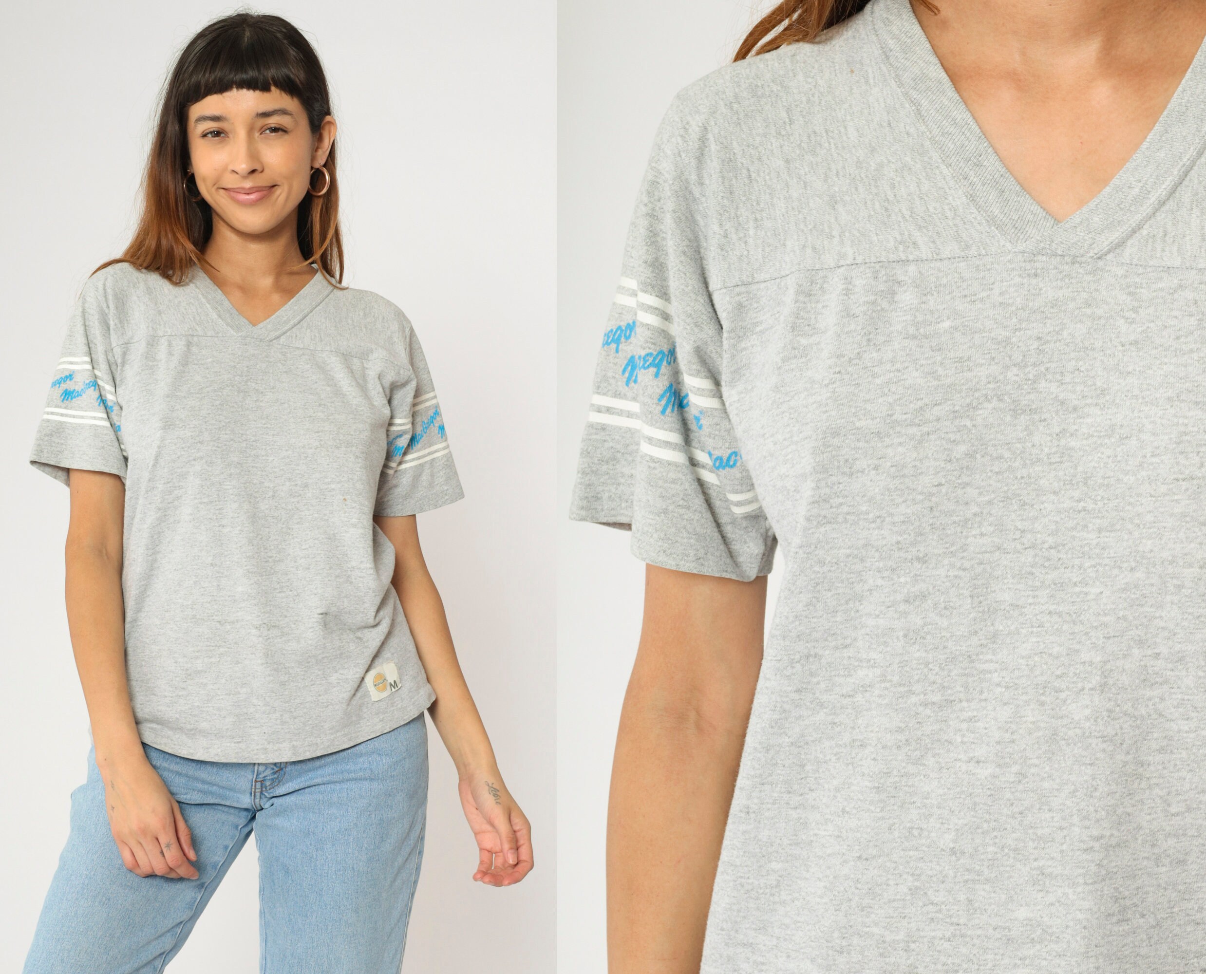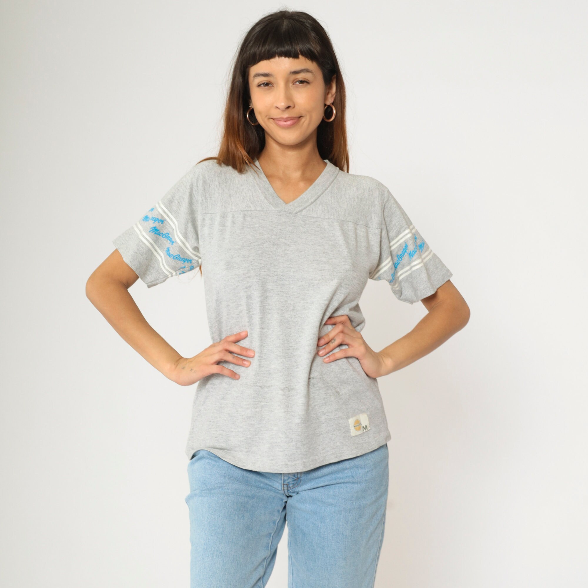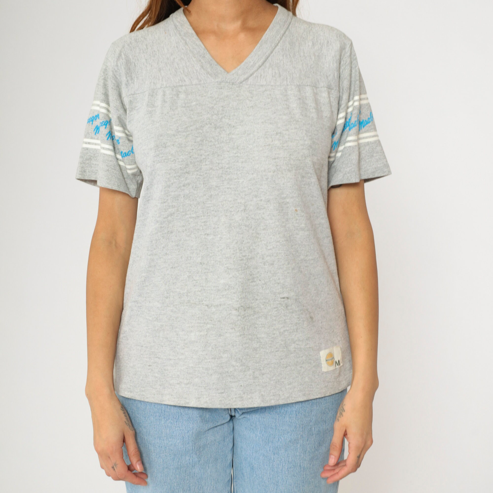 Vintage 80s shirt by MacGregor in grey with spellout sleeves and a v neck.