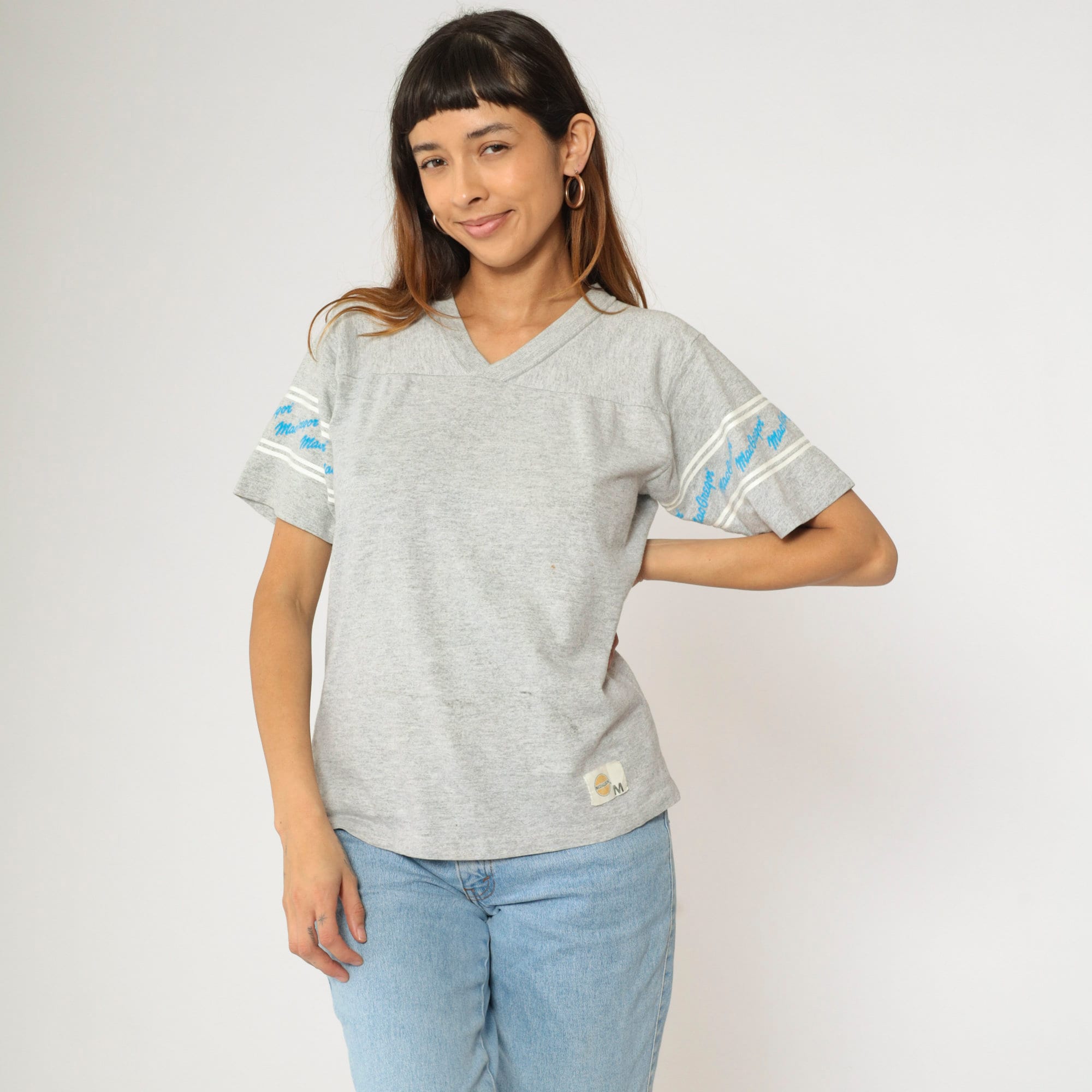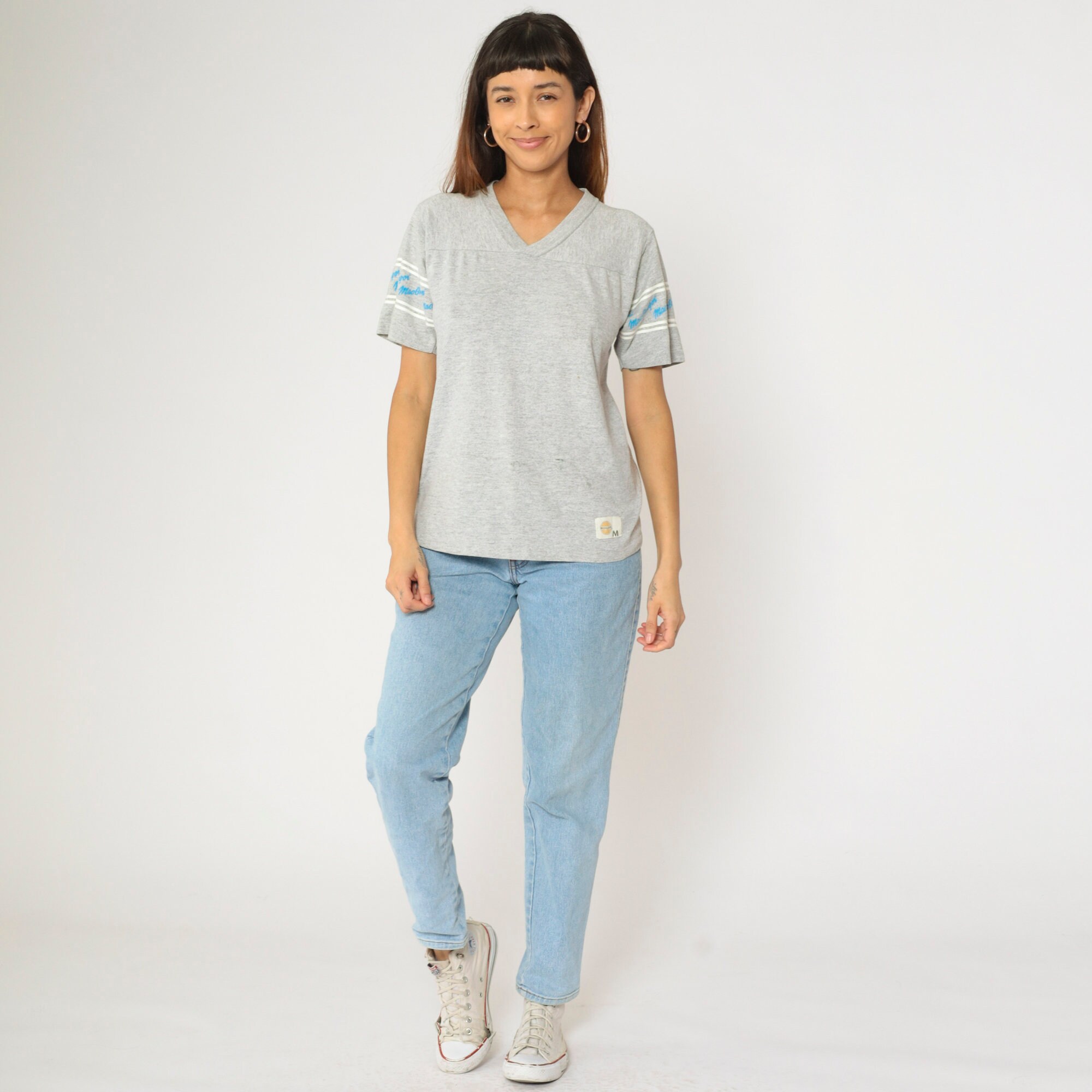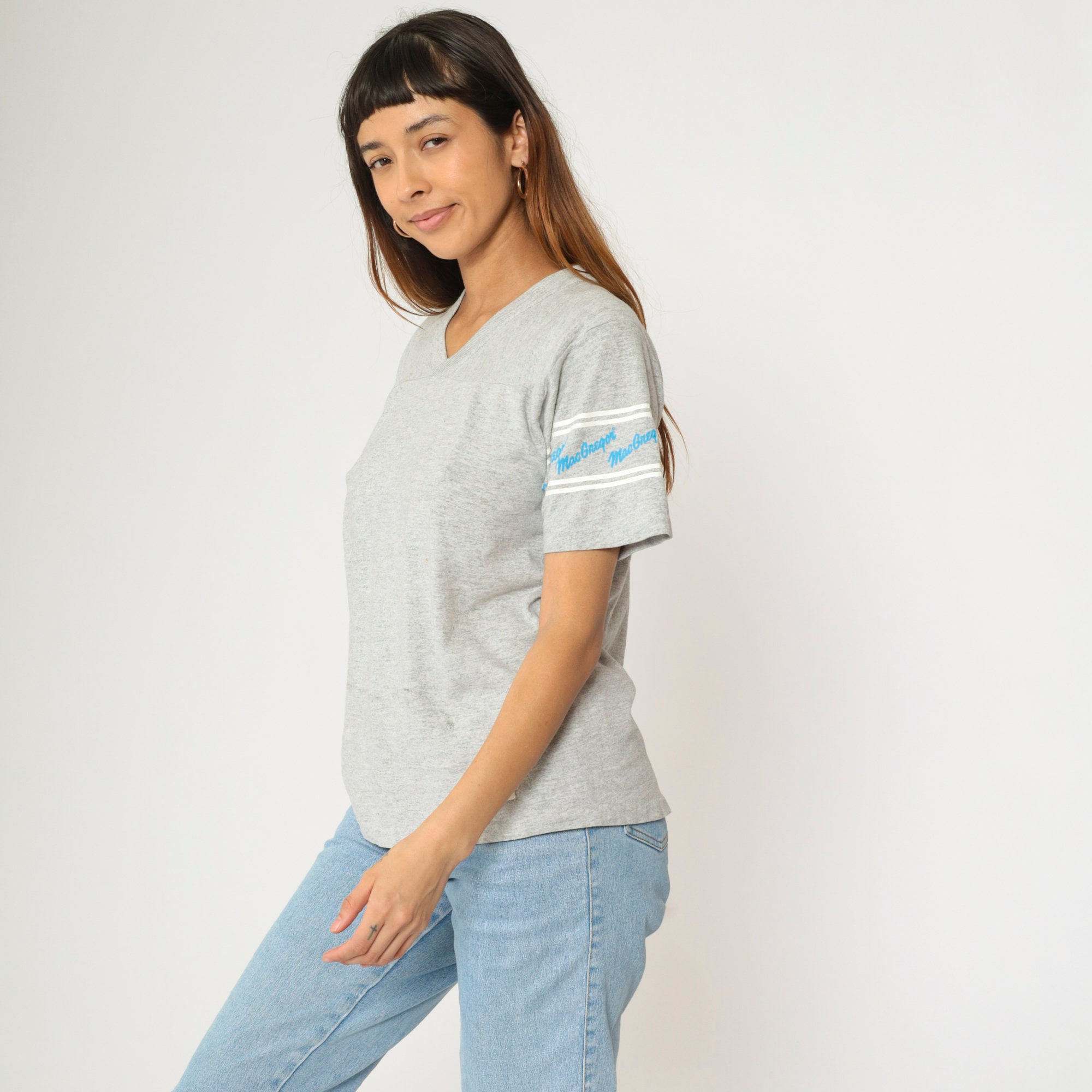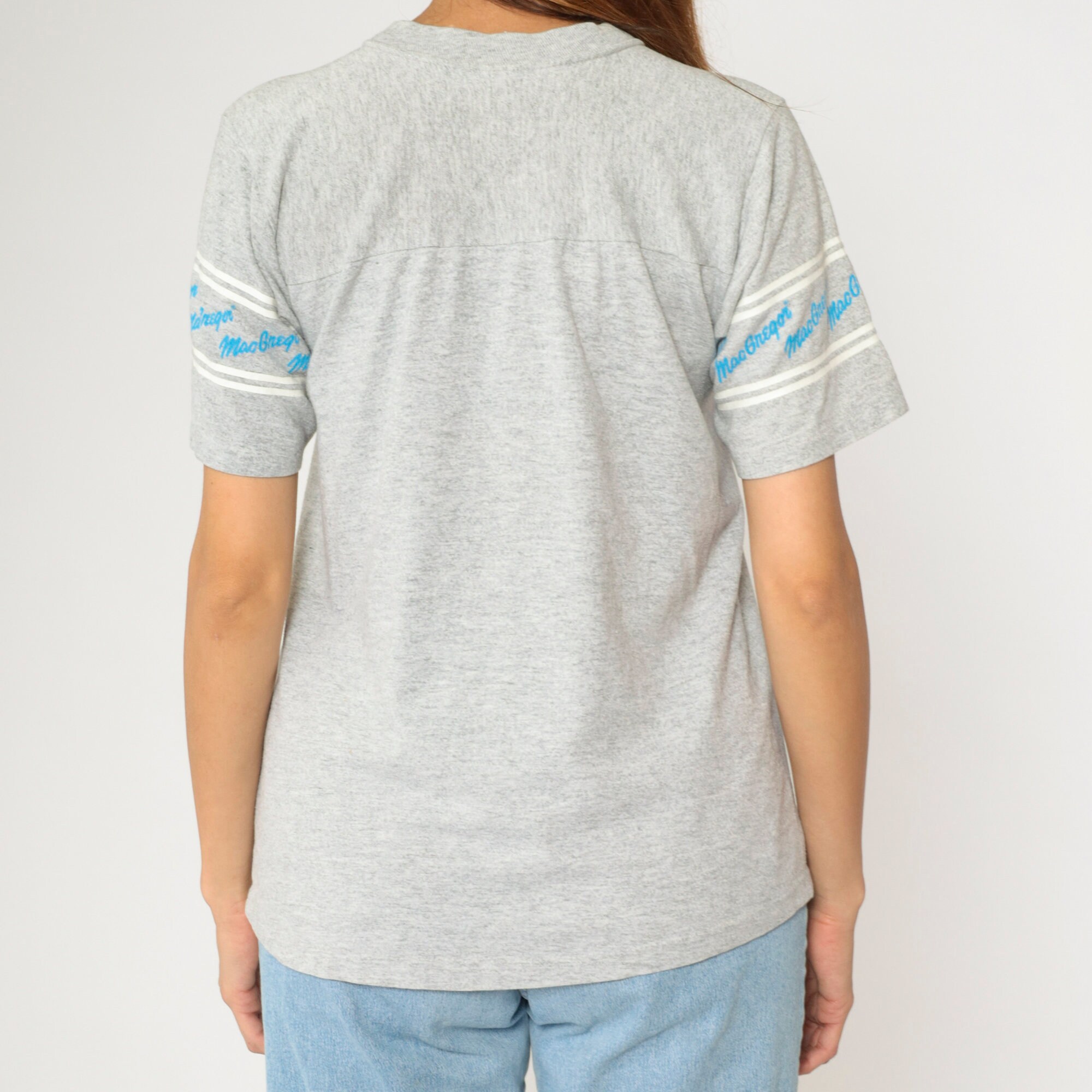 Vintage 80s shirt by MacGregor in grey with spellout sleeves and a v neck.