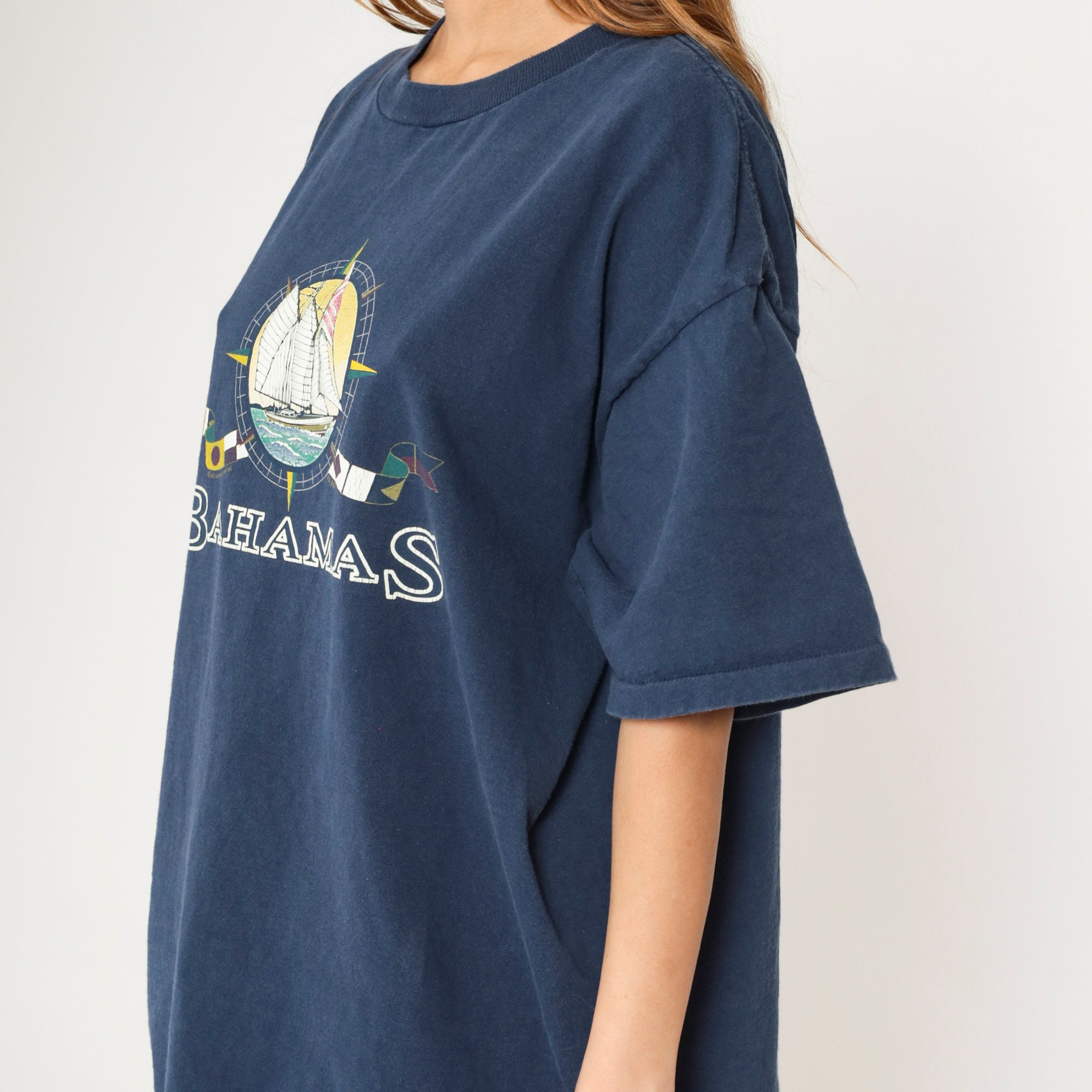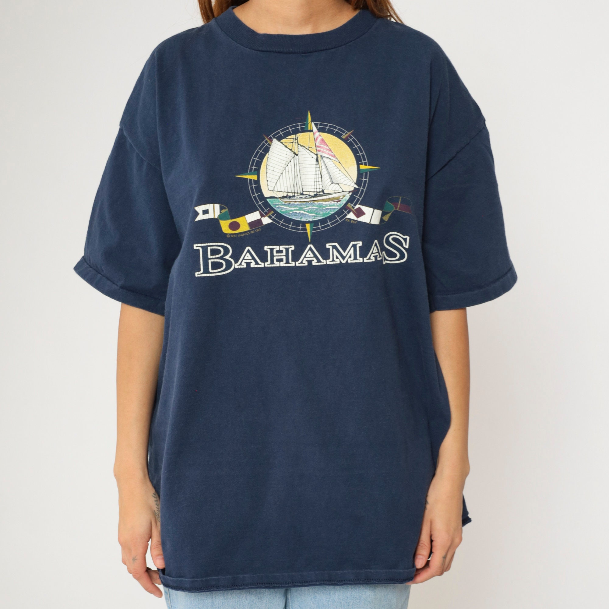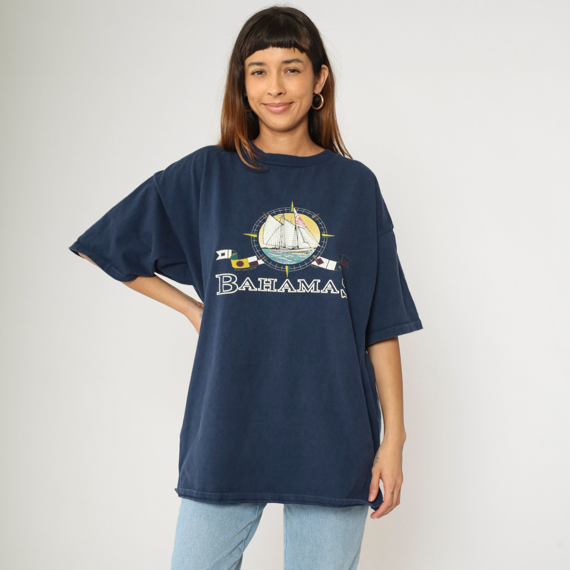 Vintage 90s T shirt from the Bahamas with a sailboat and nautical flags.