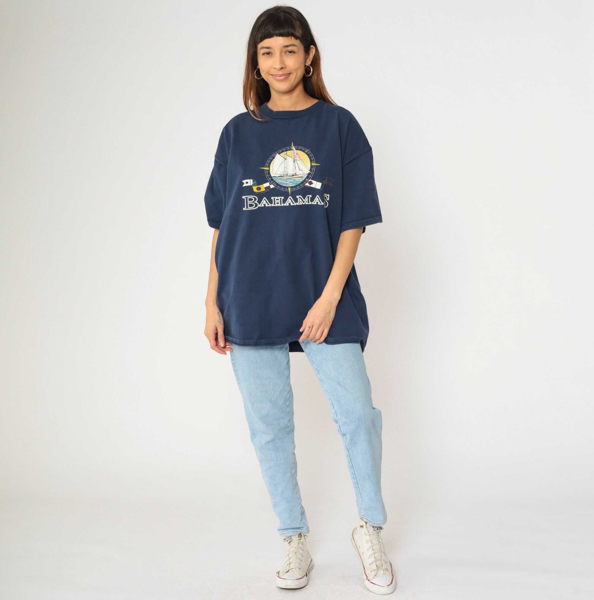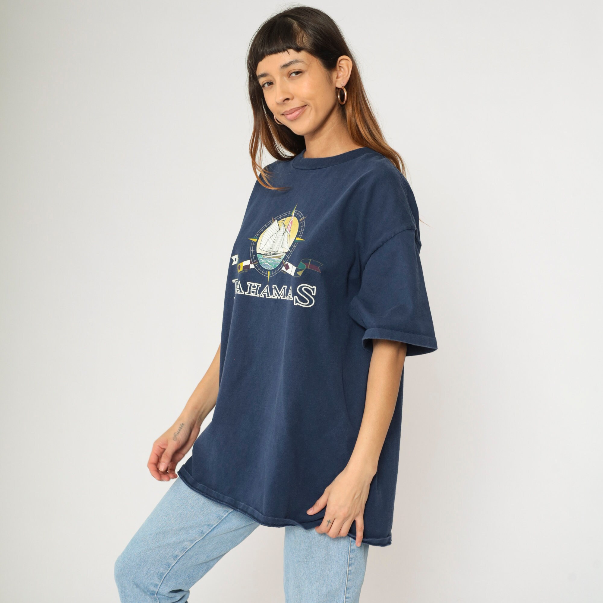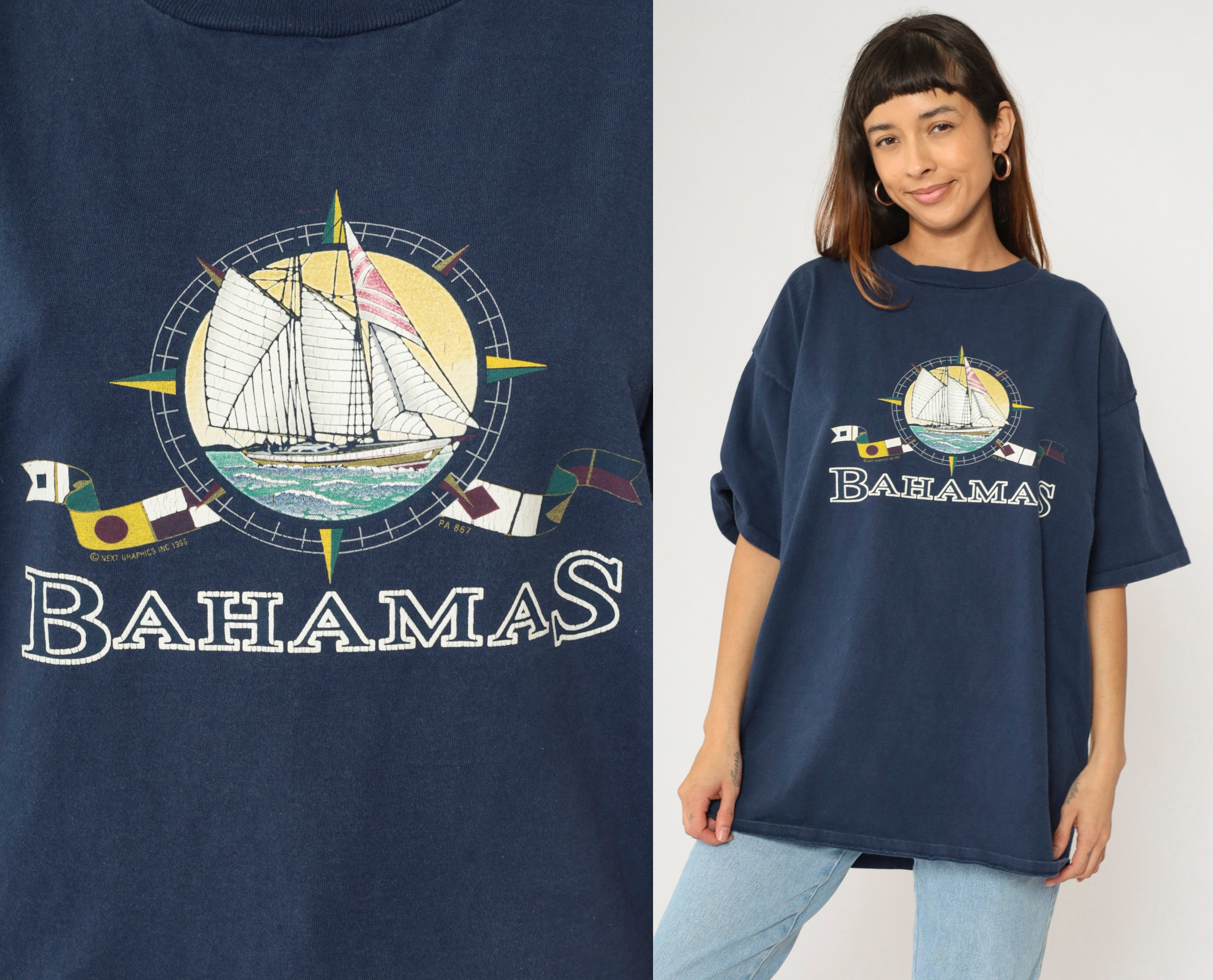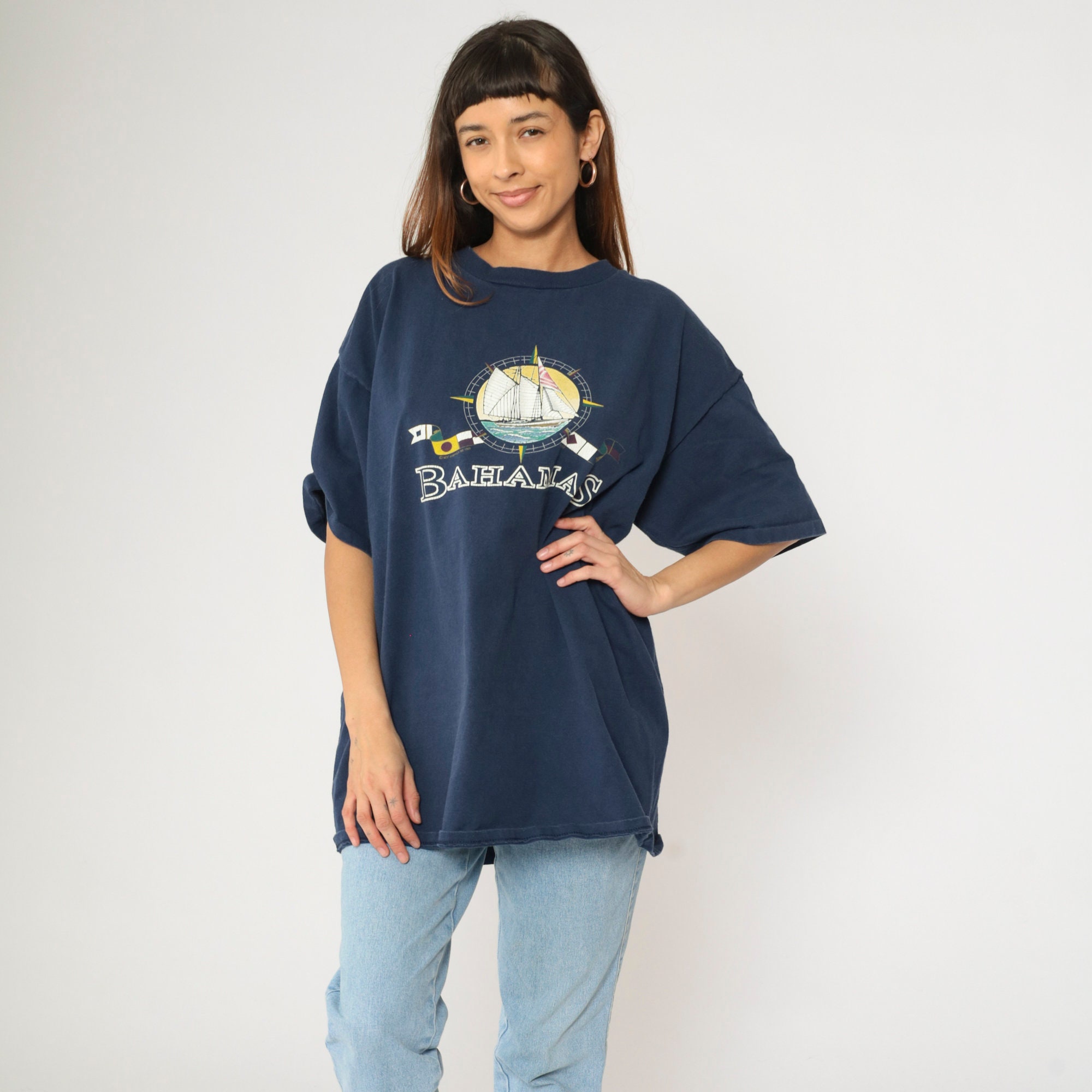Vintage 90s T shirt from the Bahamas with a sailboat and nautical flags.