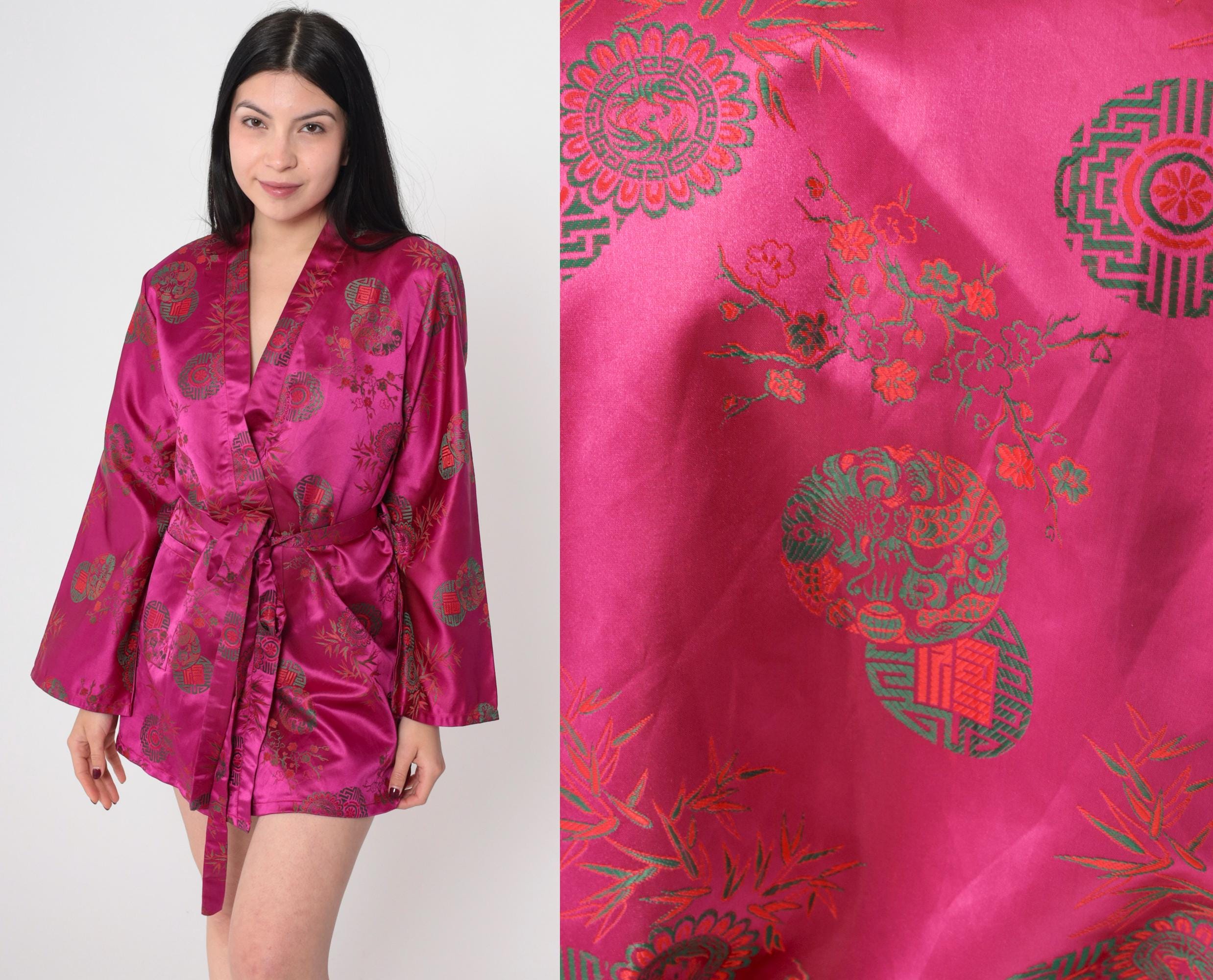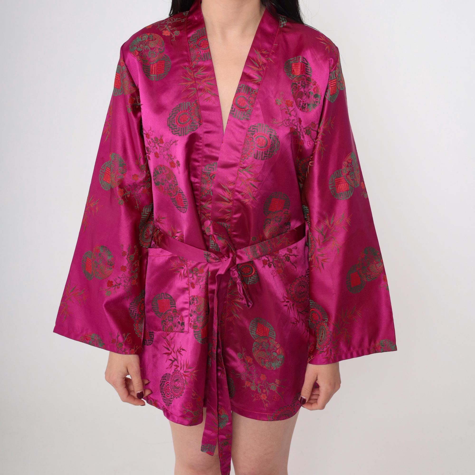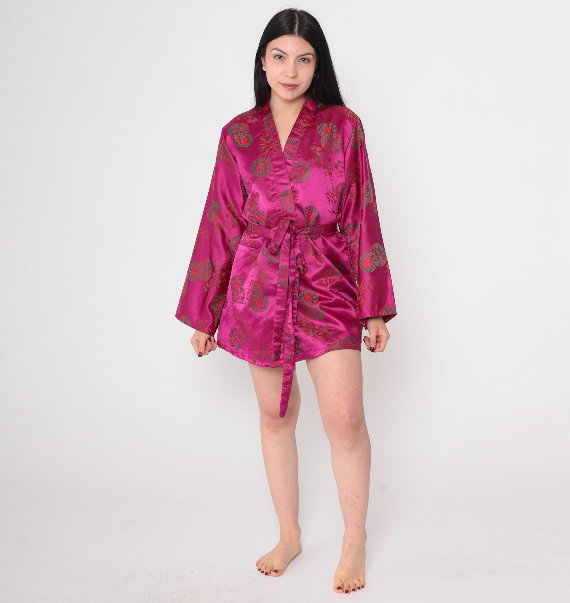 Vintage 90s kimono robe in a vibrant magenta satin with intricate embroidered Asian motifs, including florals and geometric patterns. Features wide short sleeves, a belted wrap design, and a short length.