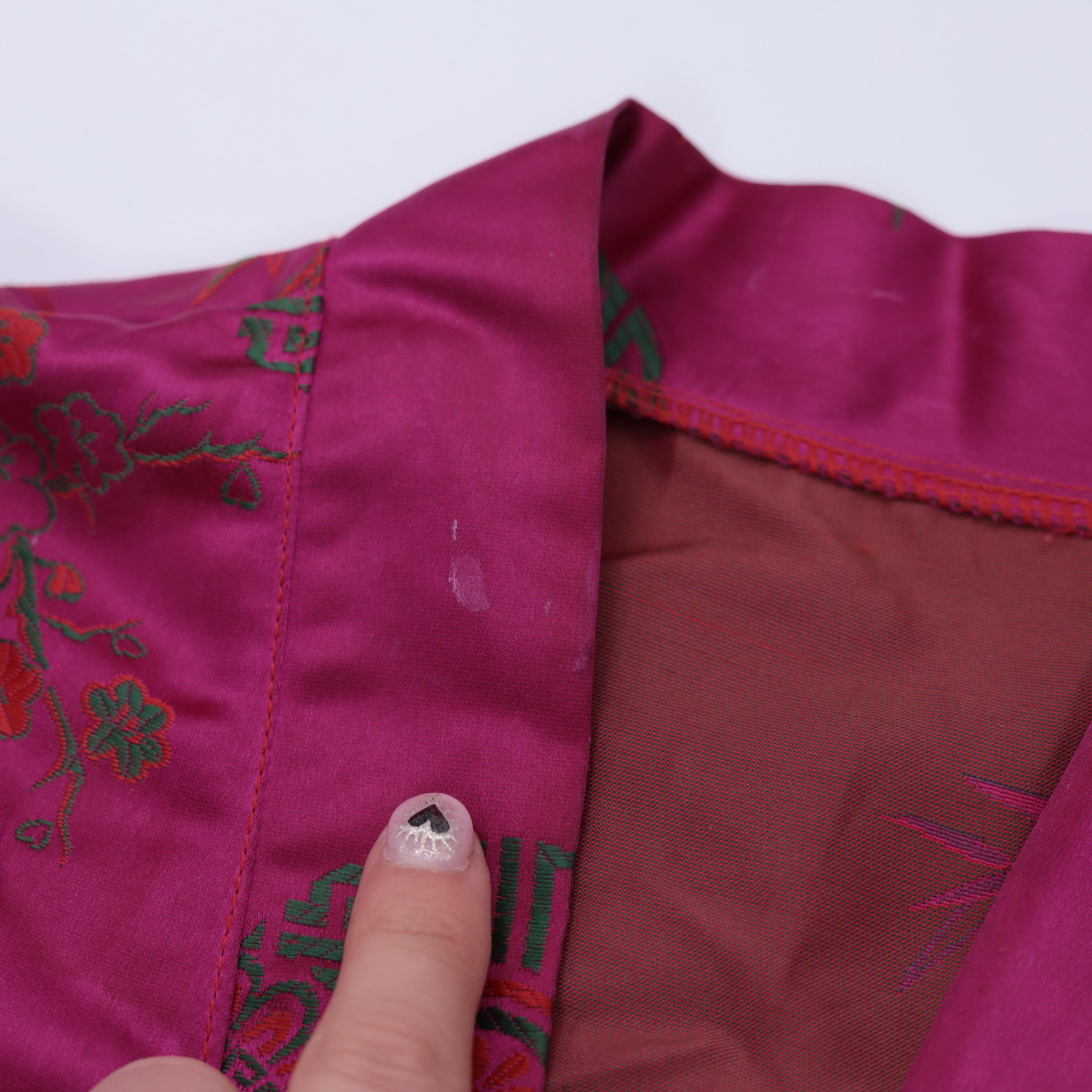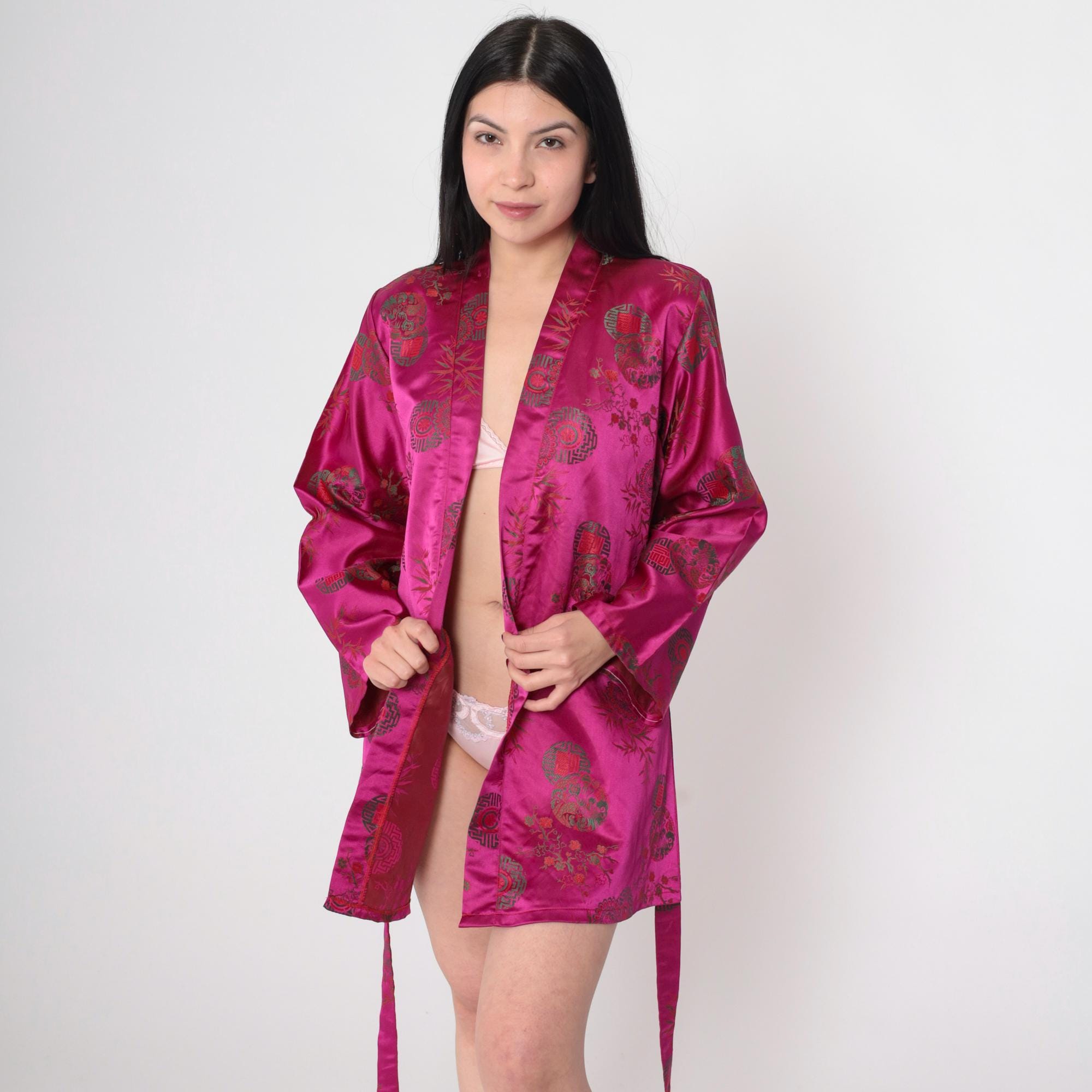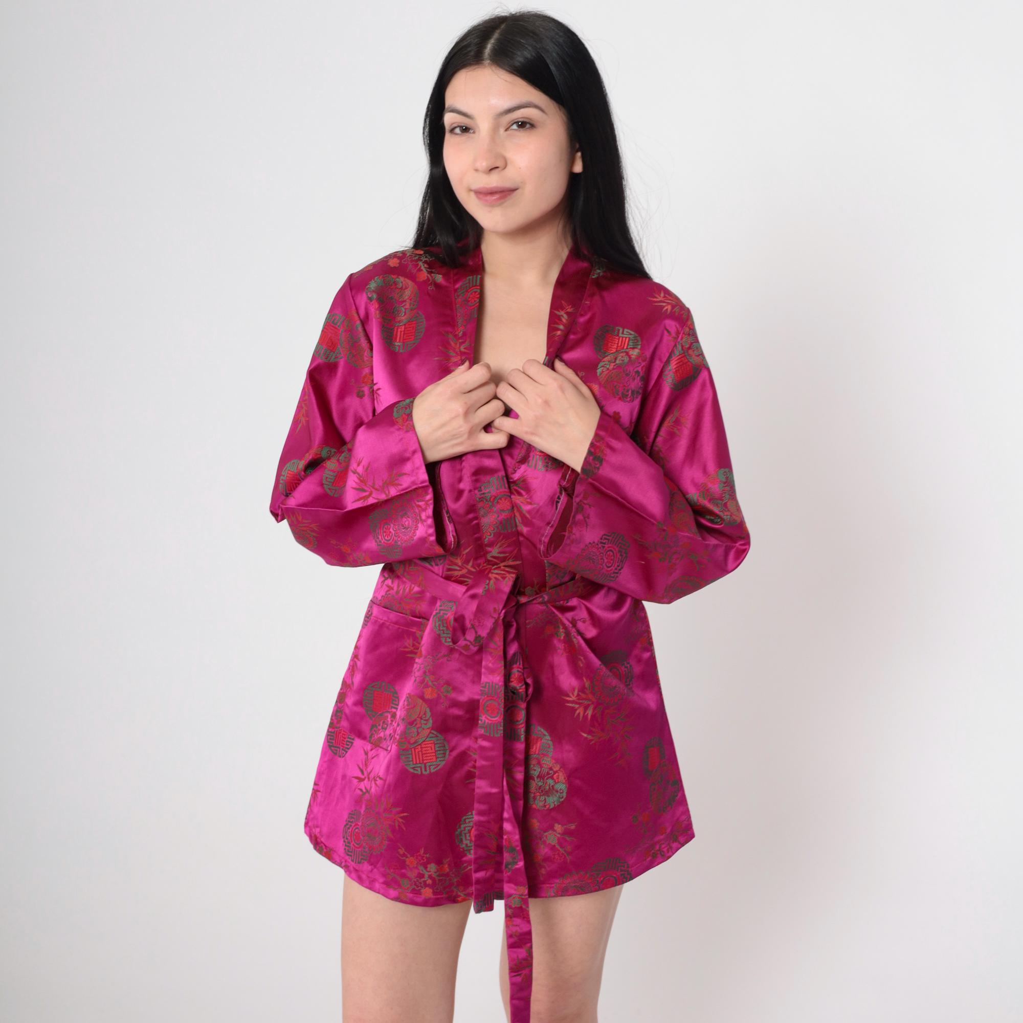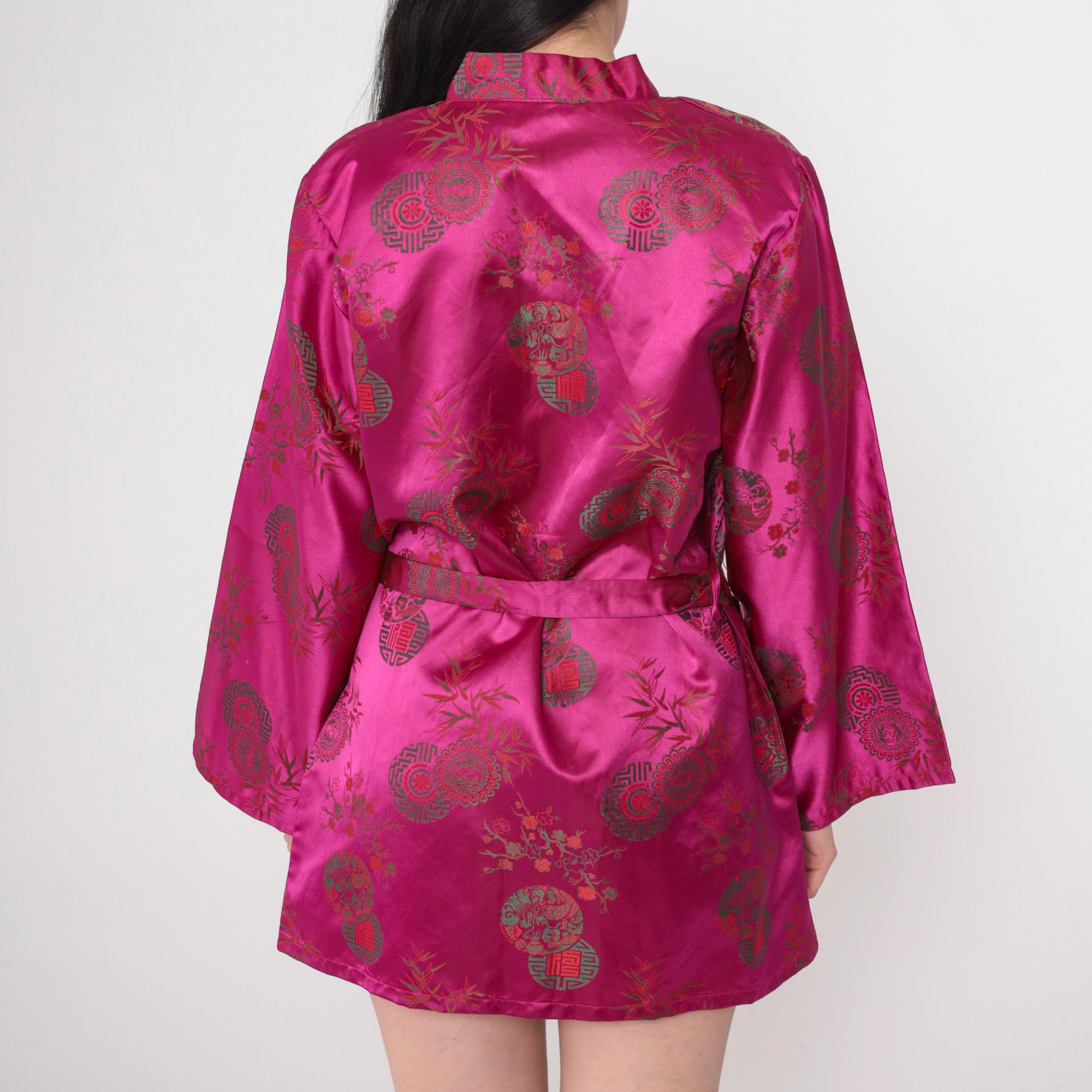 Vintage 90s kimono robe in a vibrant magenta satin with intricate embroidered Asian motifs, including florals and geometric patterns. Features wide short sleeves, a belted wrap design, and a short length.