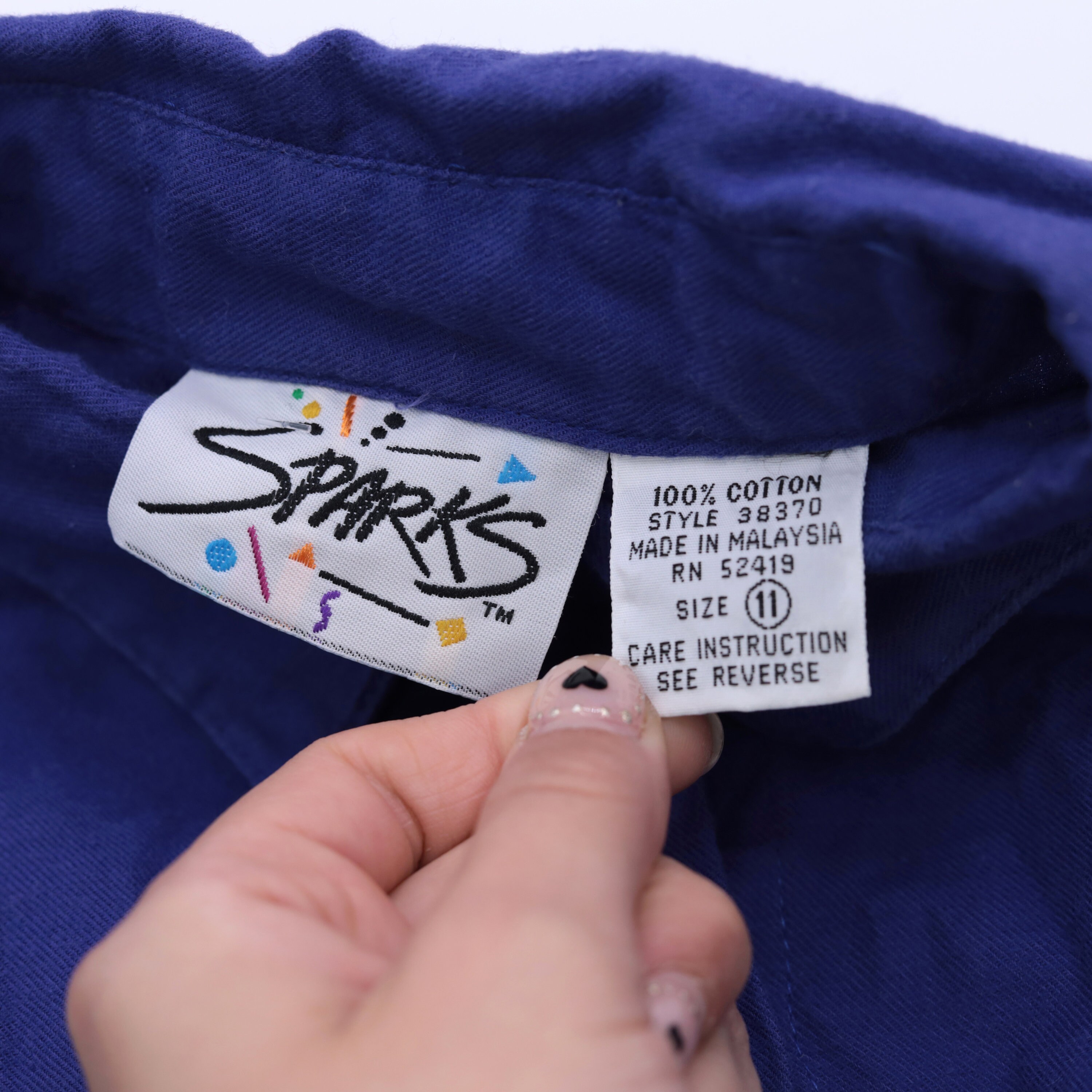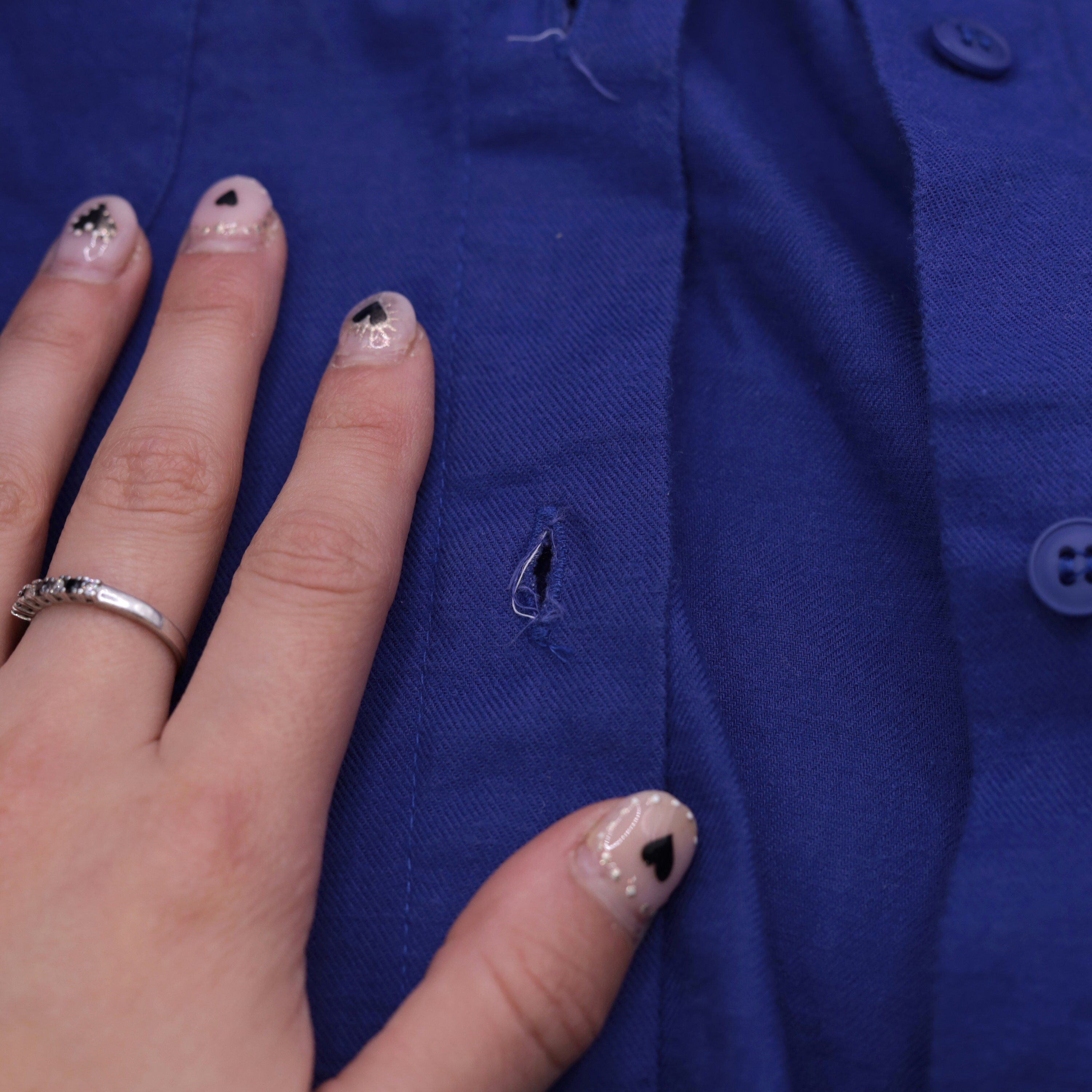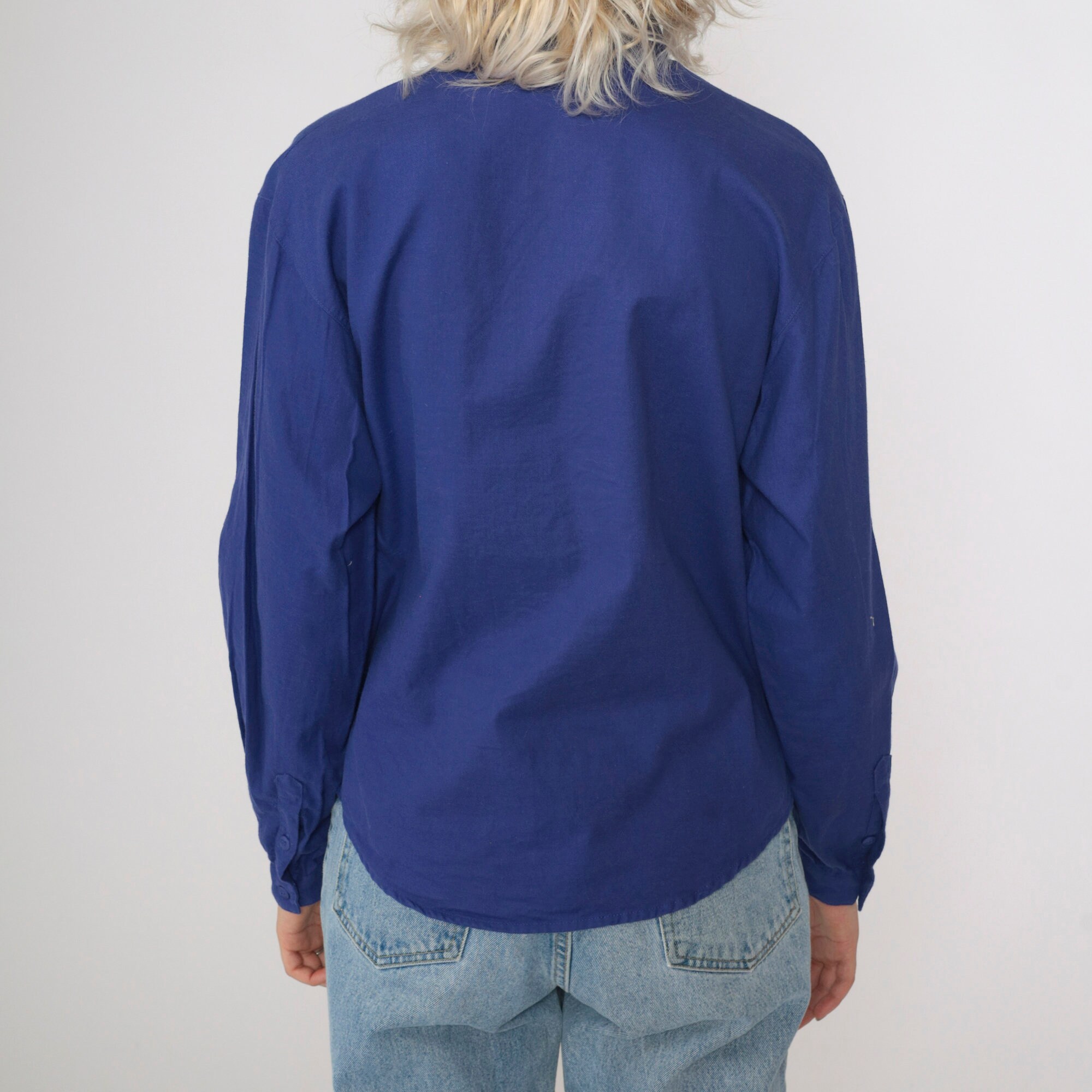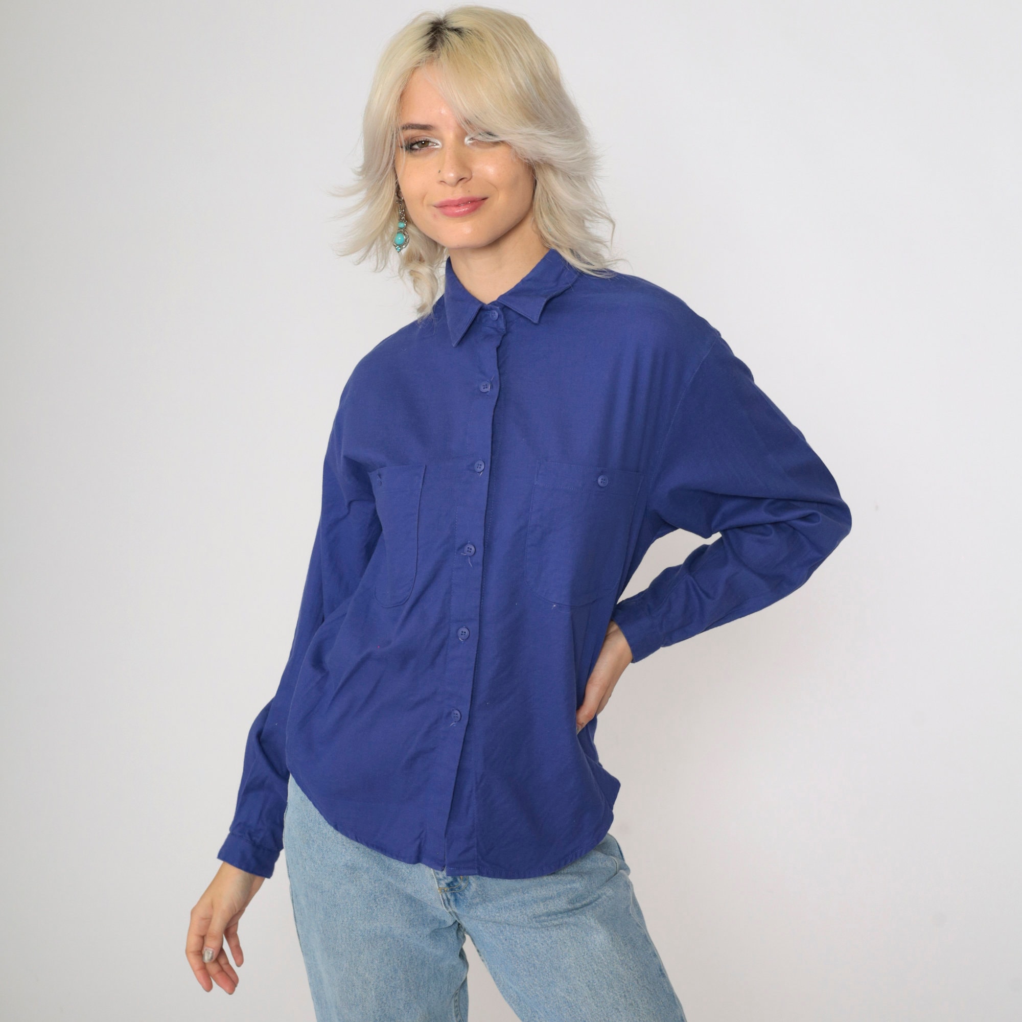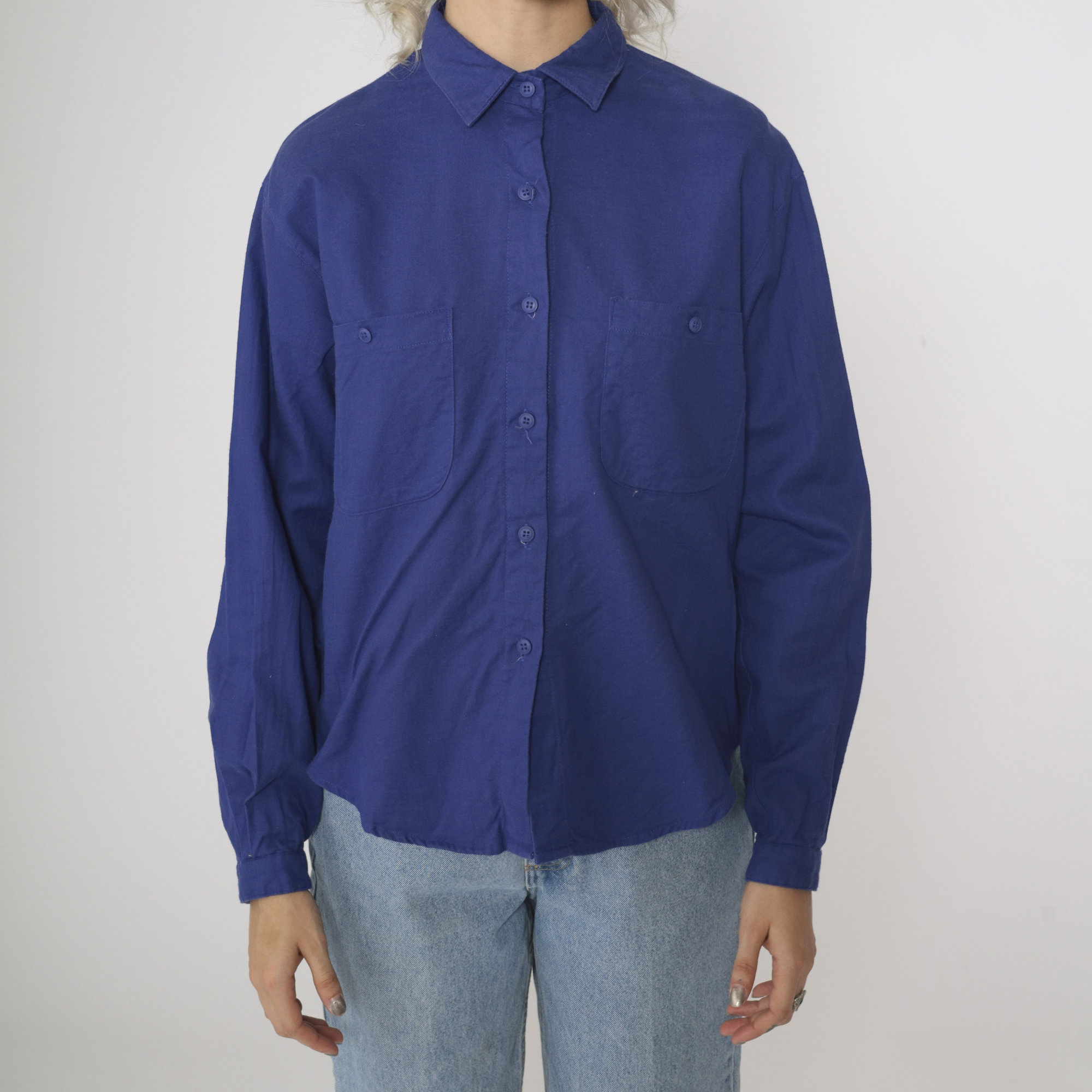 Vintage 90s blouse in purplish blue with chest pockets, long sleeves, a collar, and buttons up the front.