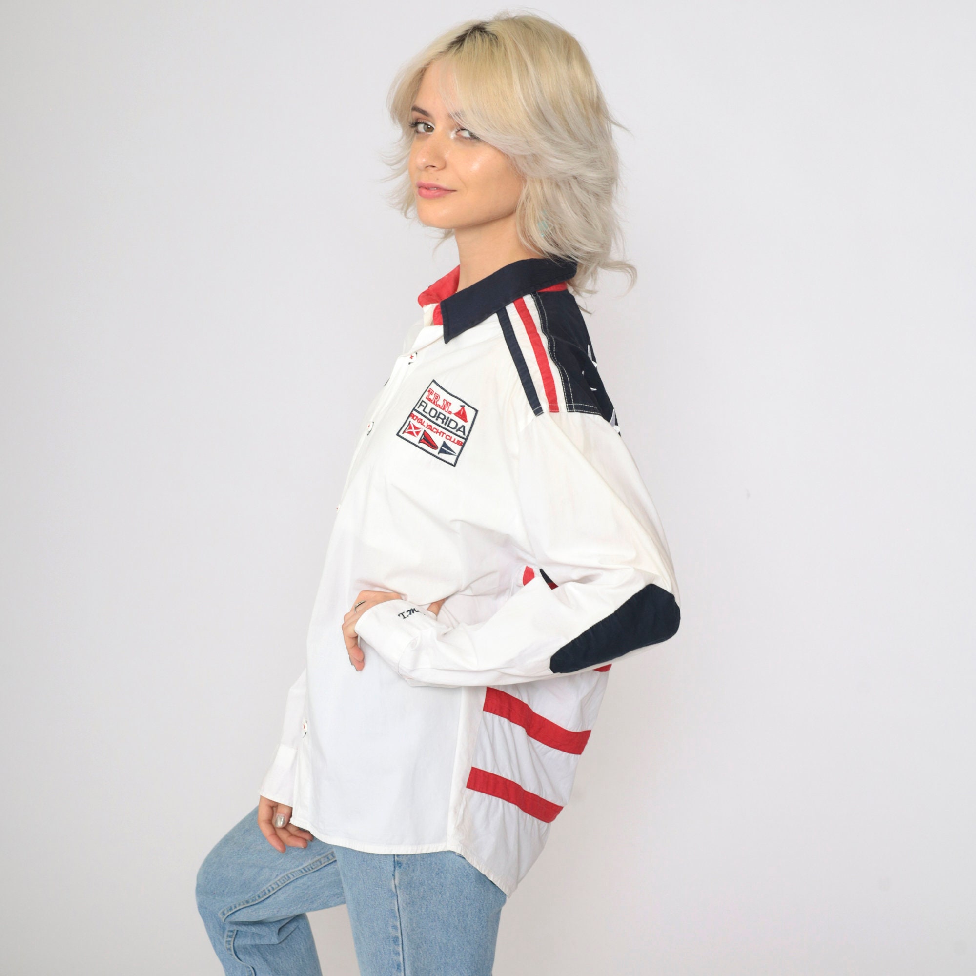 00s USA Patriotic Yacht Club shirt featuring embroidered patches and an American flag design on the back. This long sleeve button-up shirt from Florida's Royal Yacht Club has a contrast collar and elbow patches, with intricate detailing throughout.