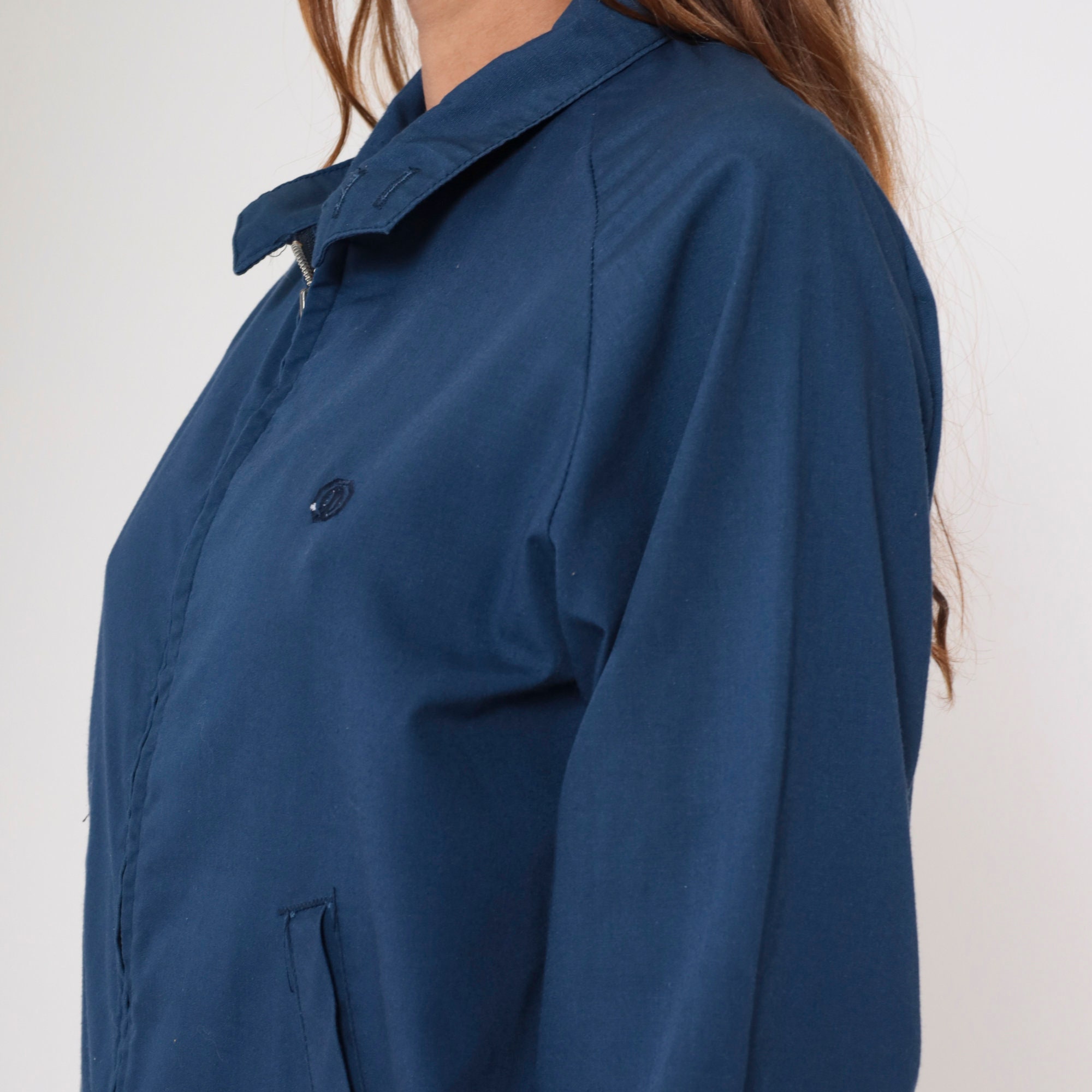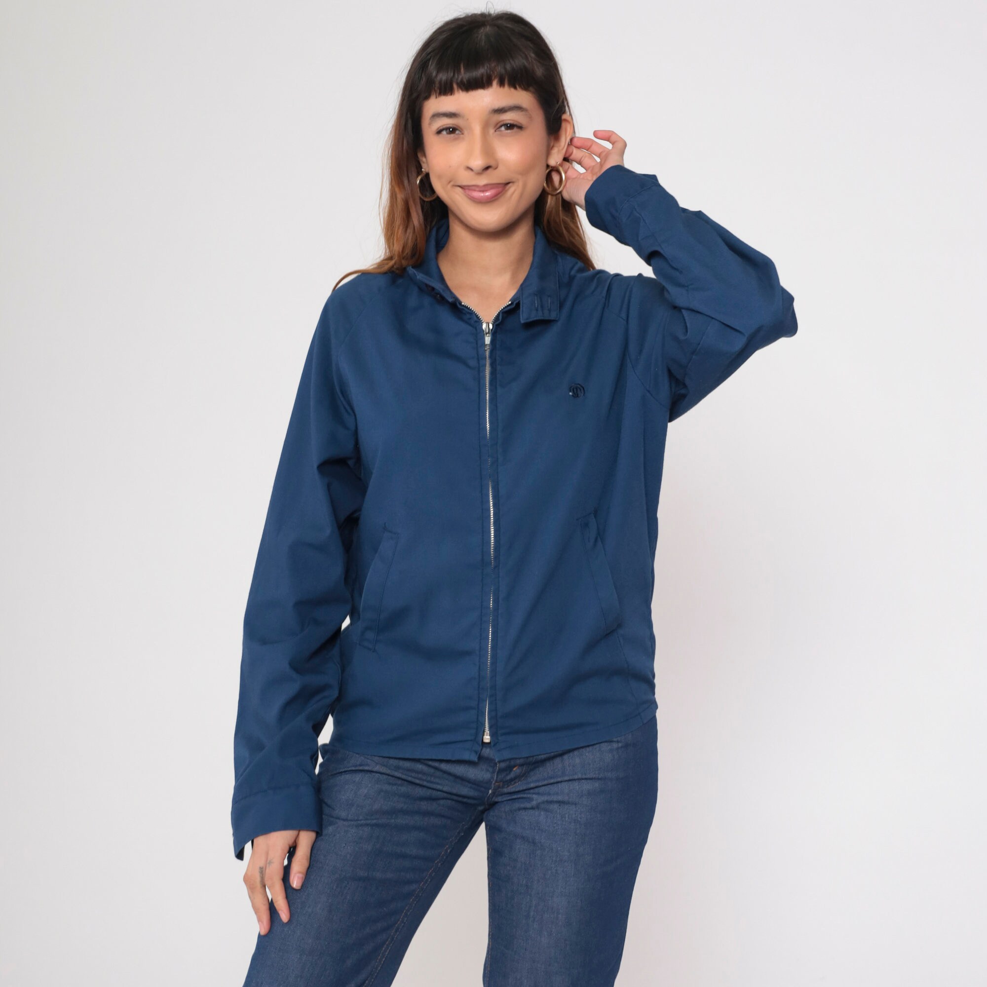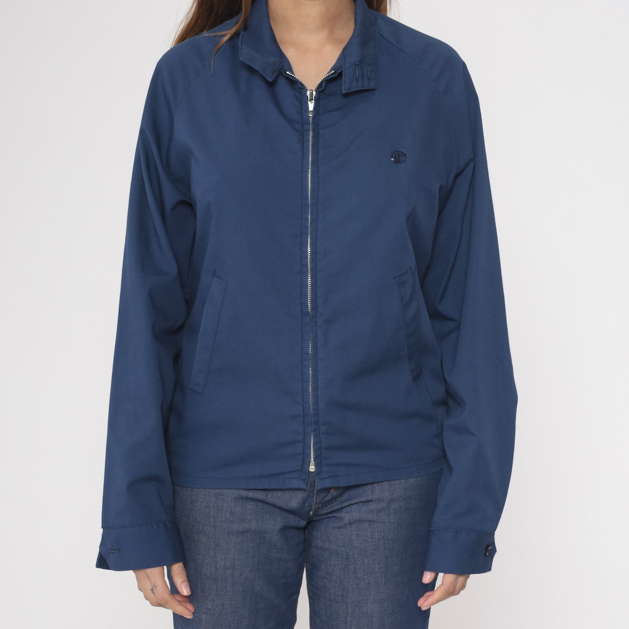 Vintage 80s jacket in navy blue with an embroidered crest and a metal zipper closure.
