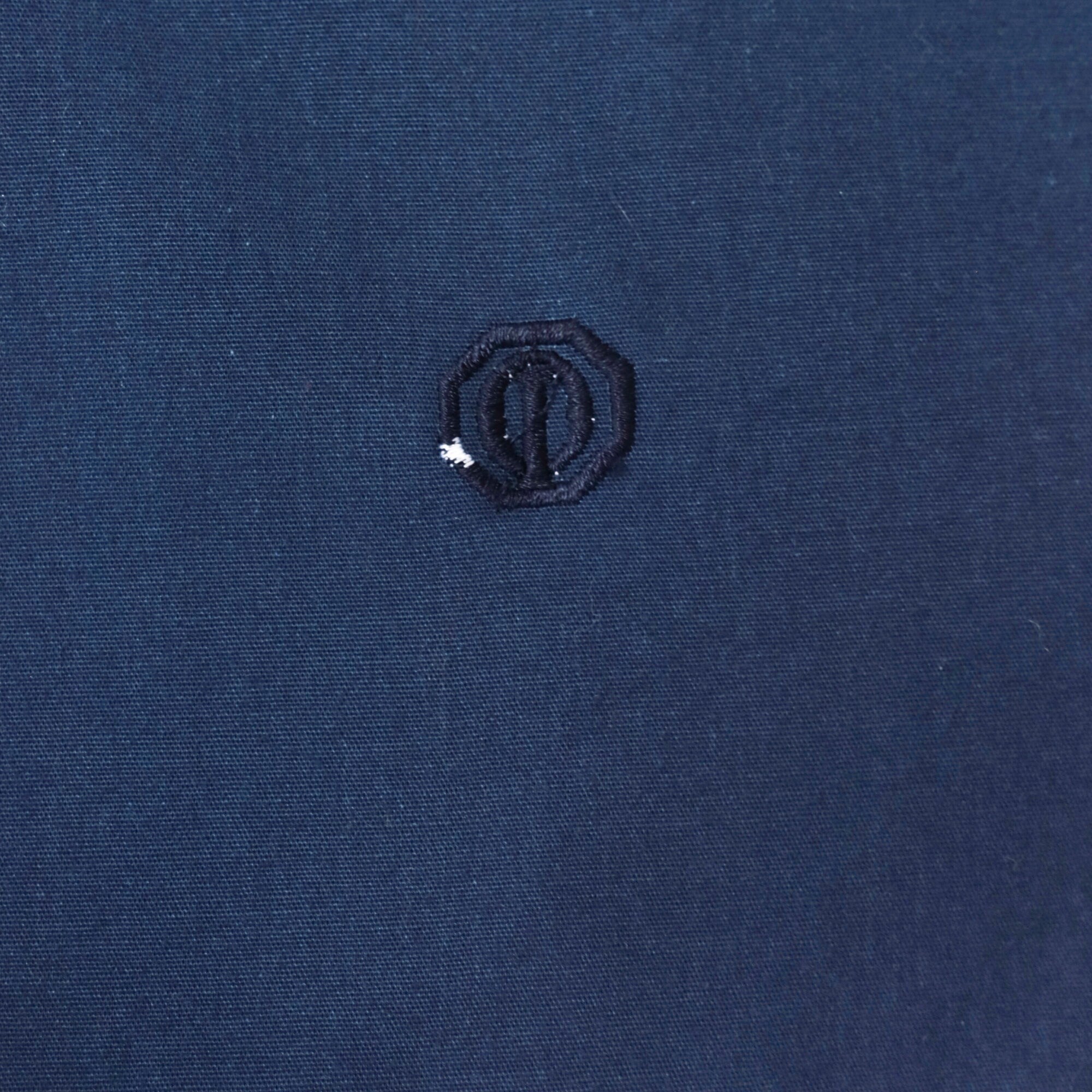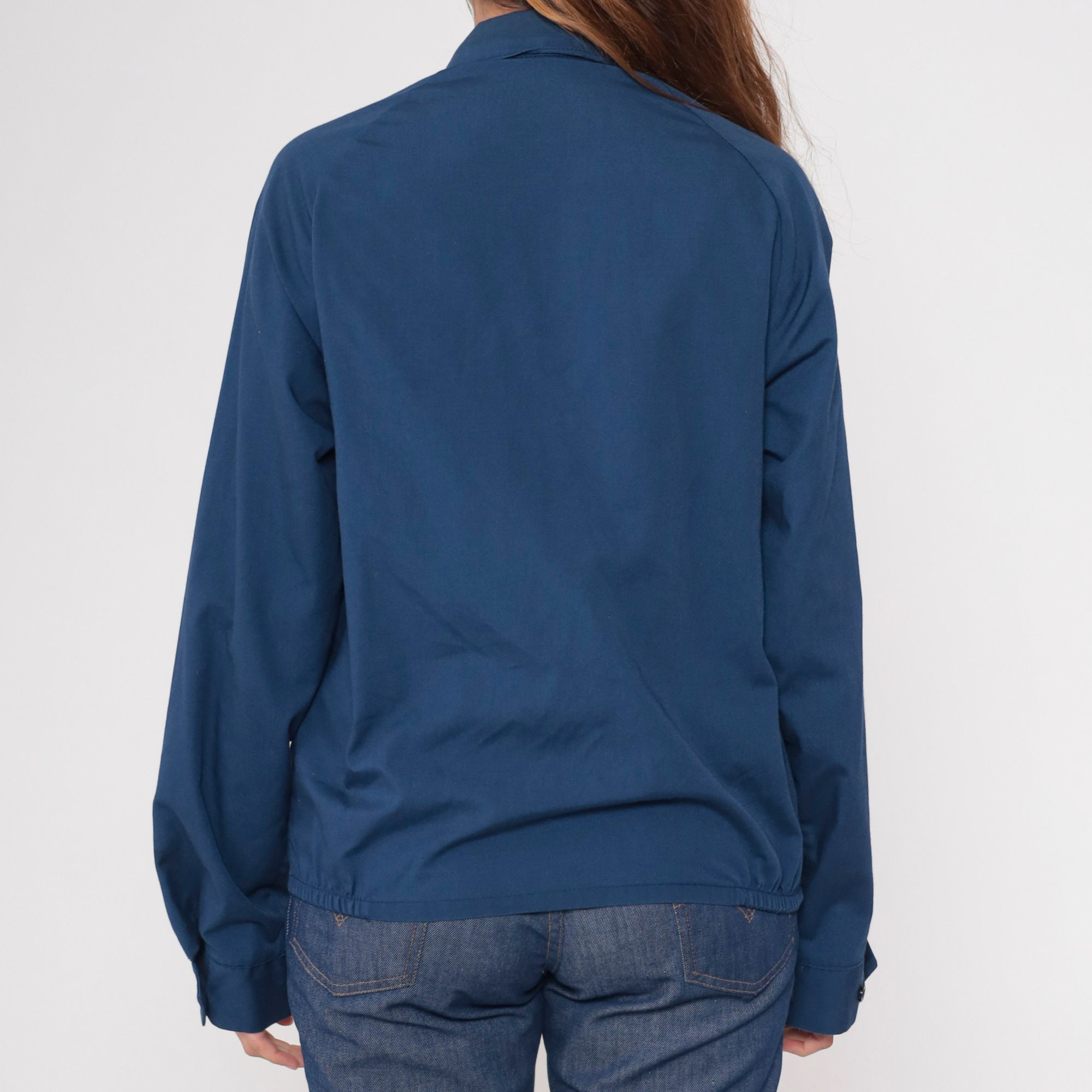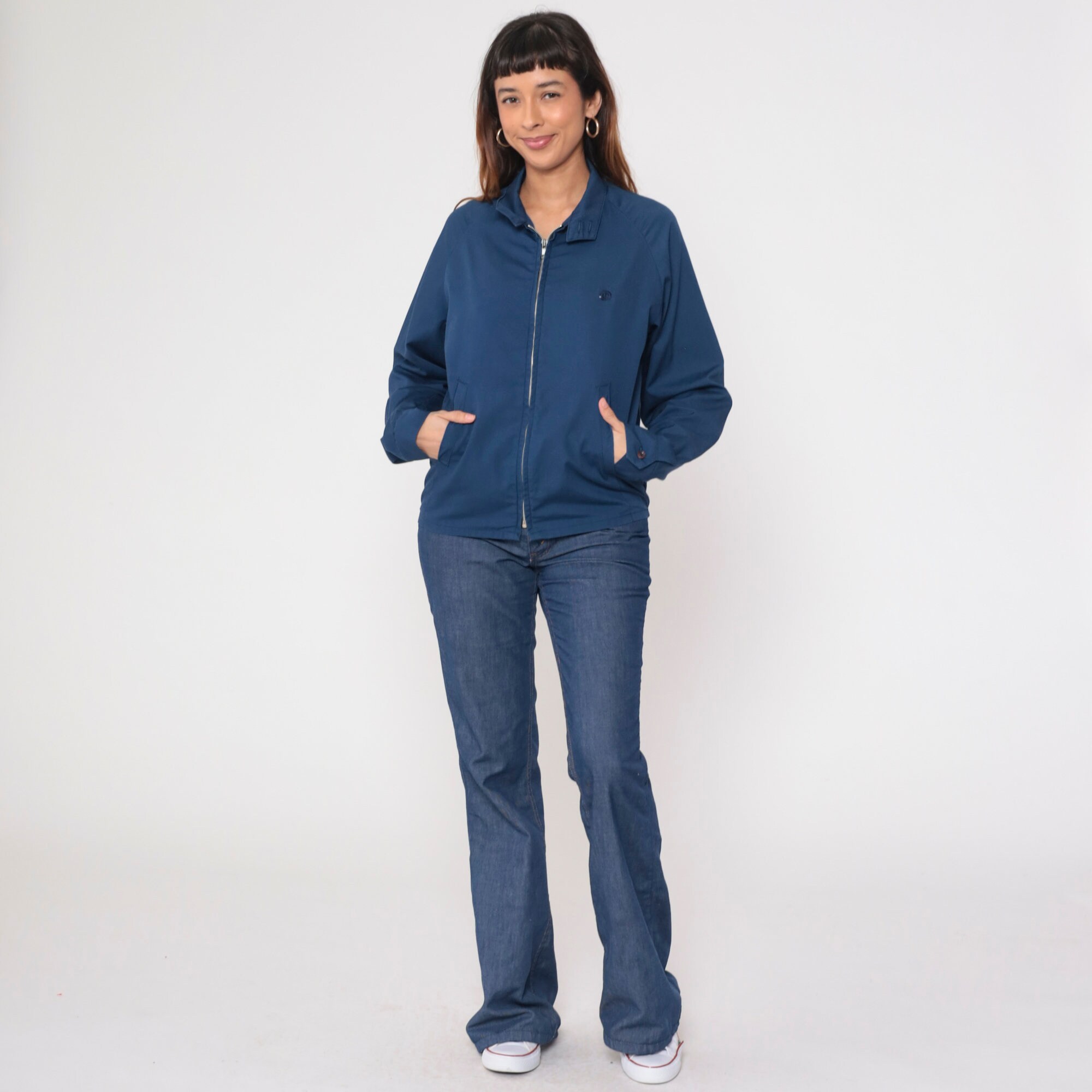 Vintage 80s jacket in navy blue with an embroidered crest and a metal zipper closure.