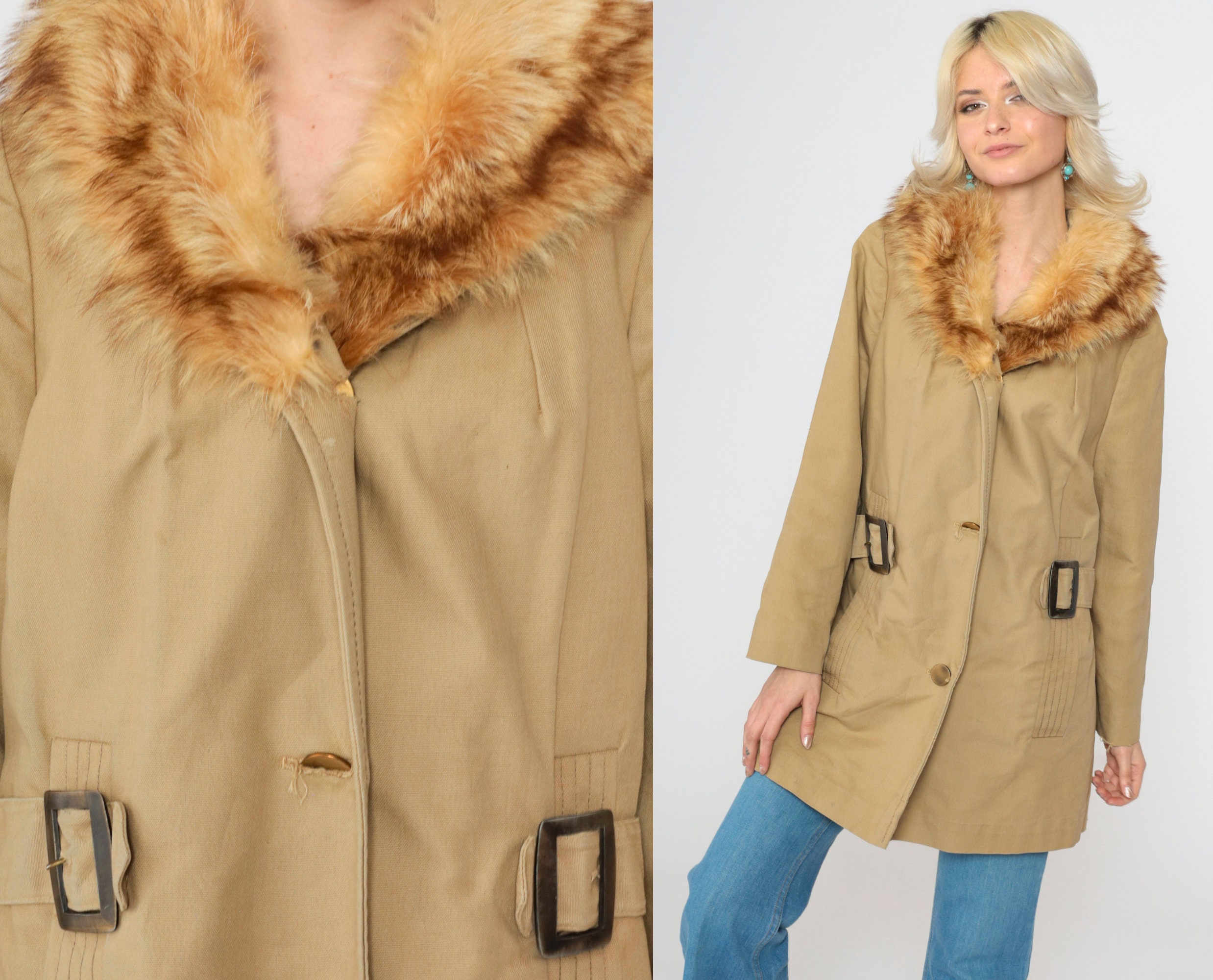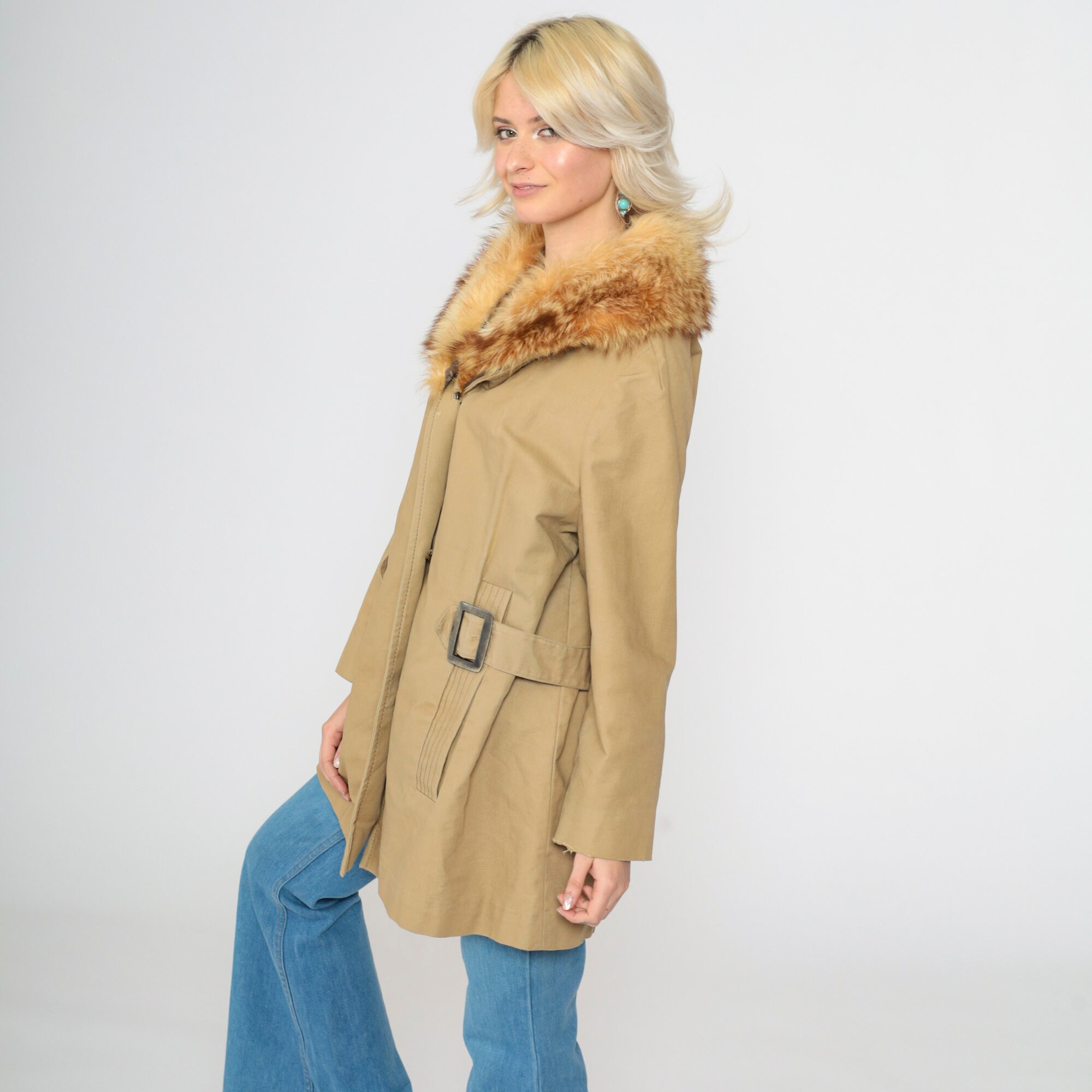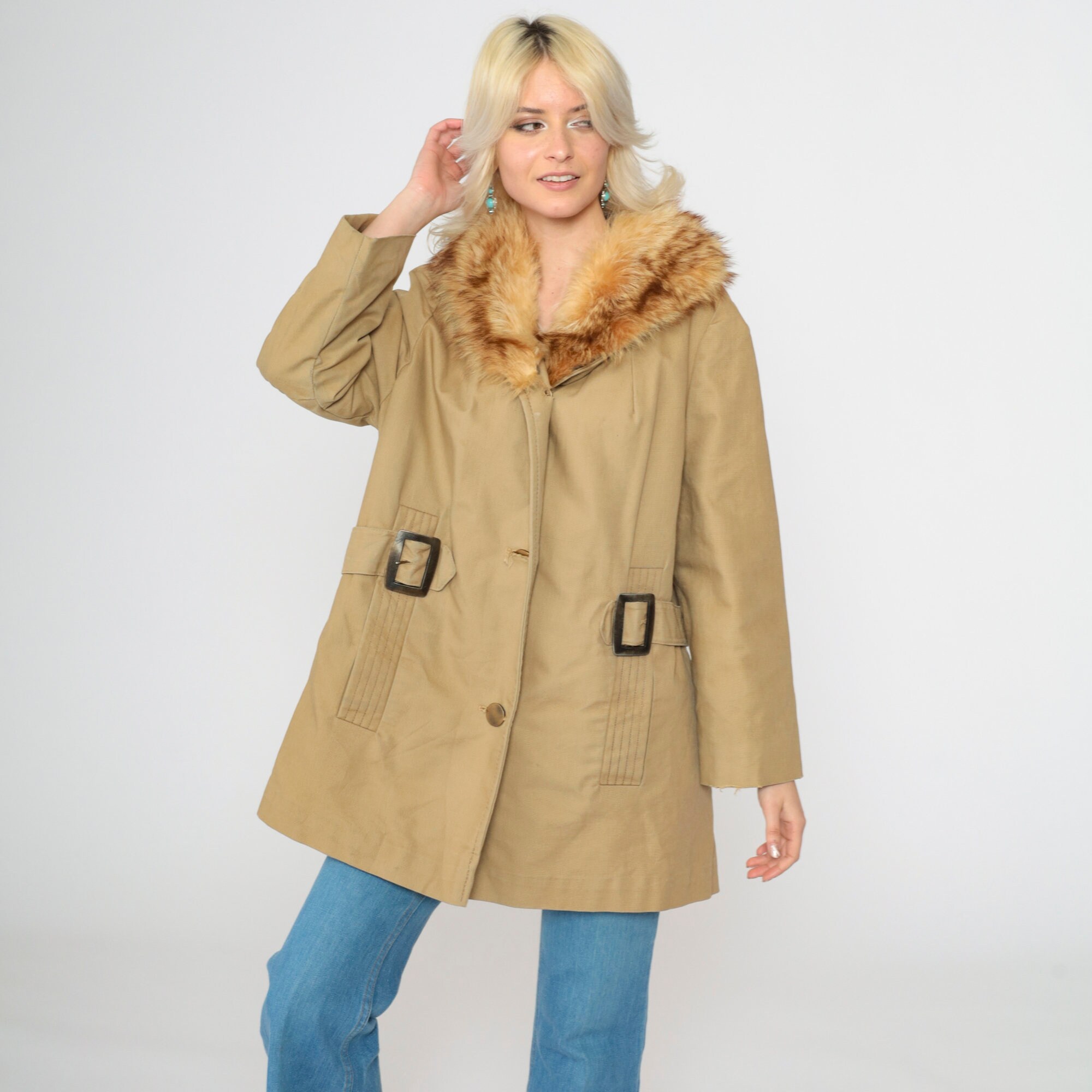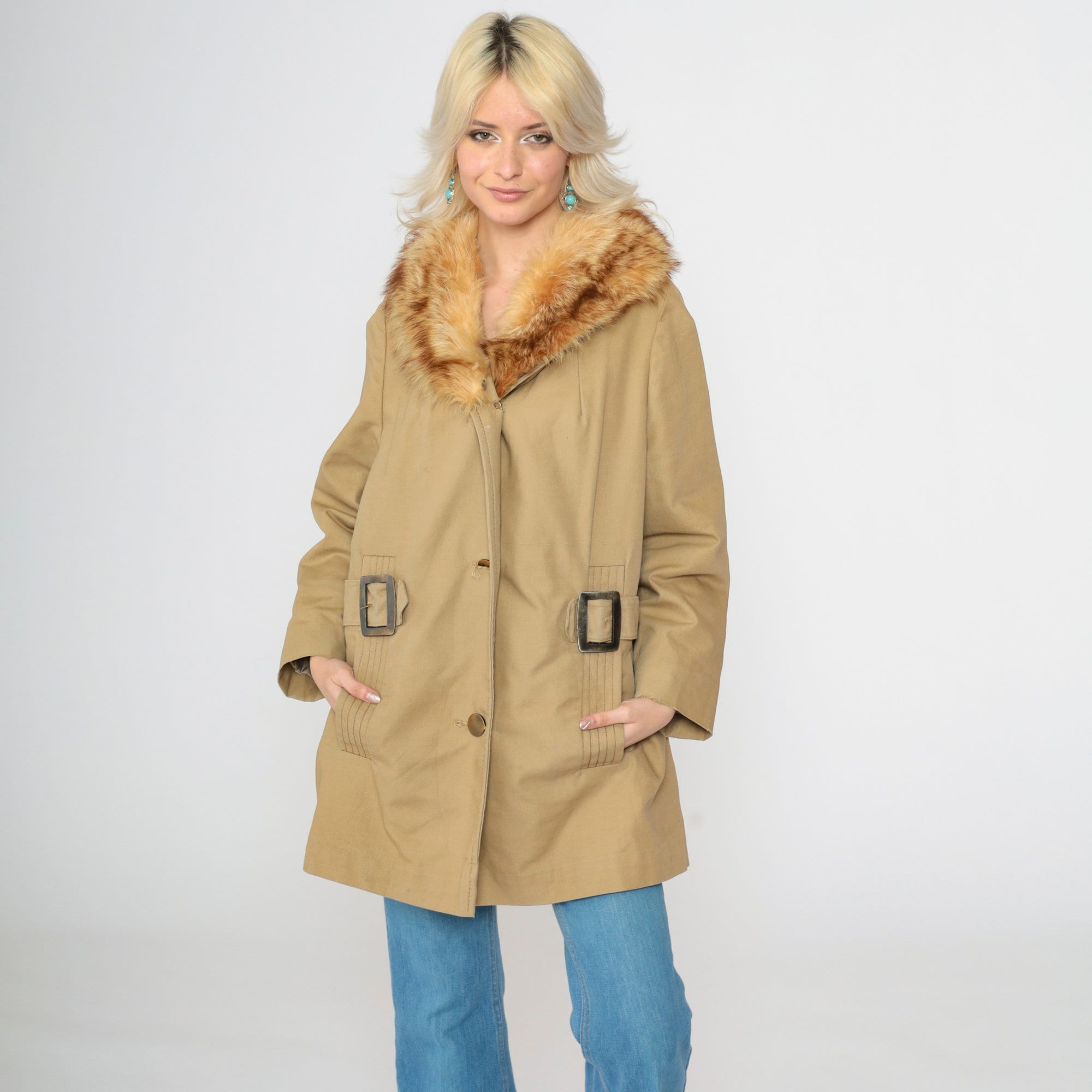 This vintage 1970s tan jacket features a luxurious fur trim and distinctive large buckle accents. It has a utilitarian design with a safari jacket style.