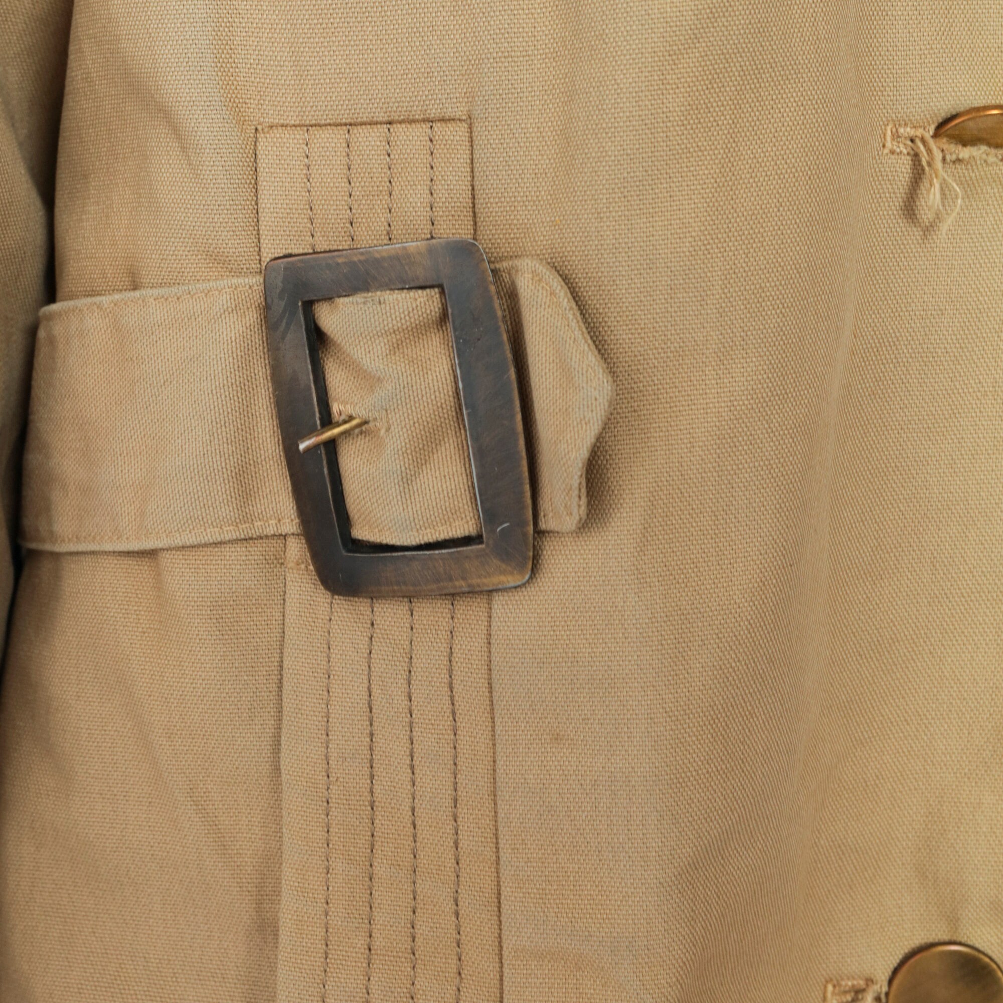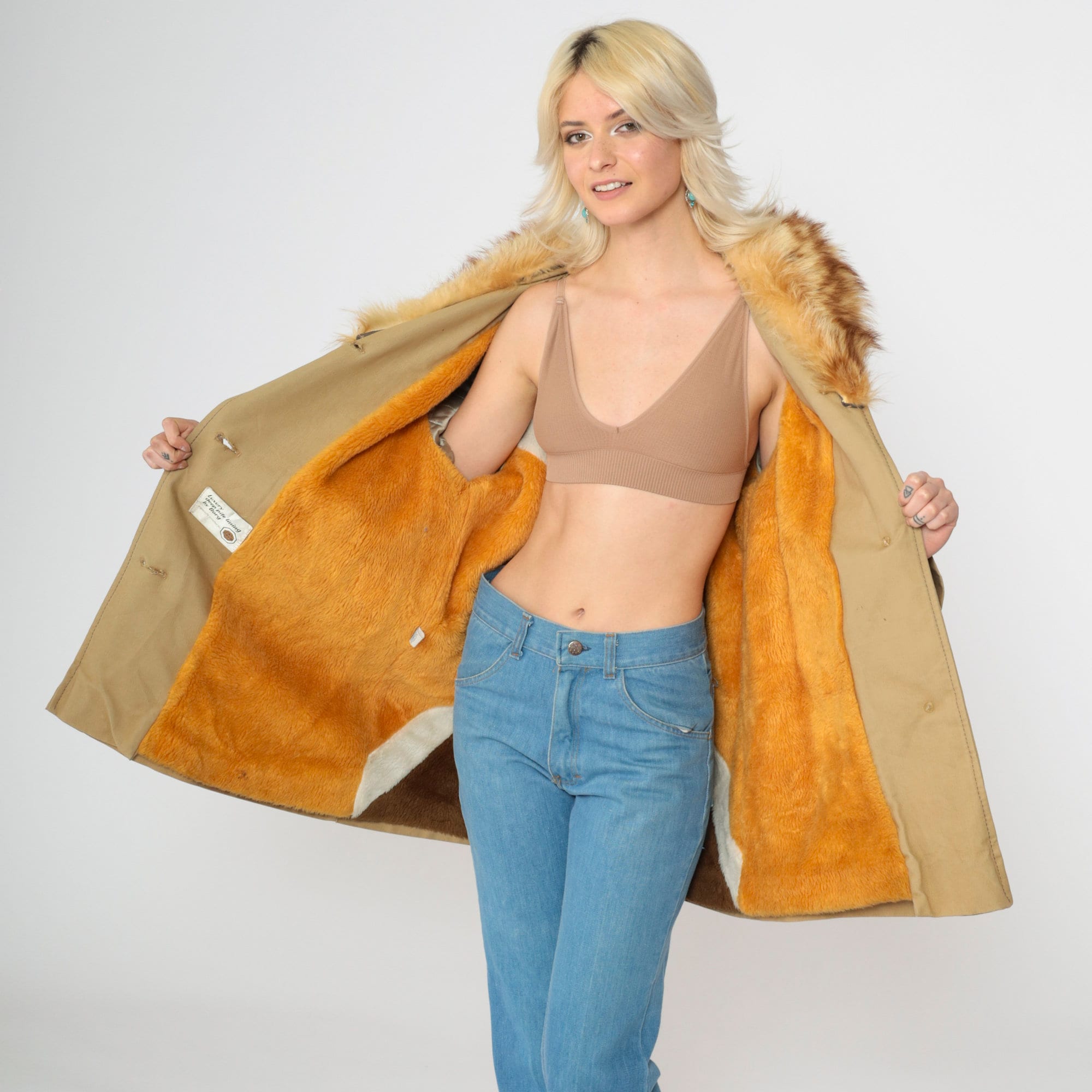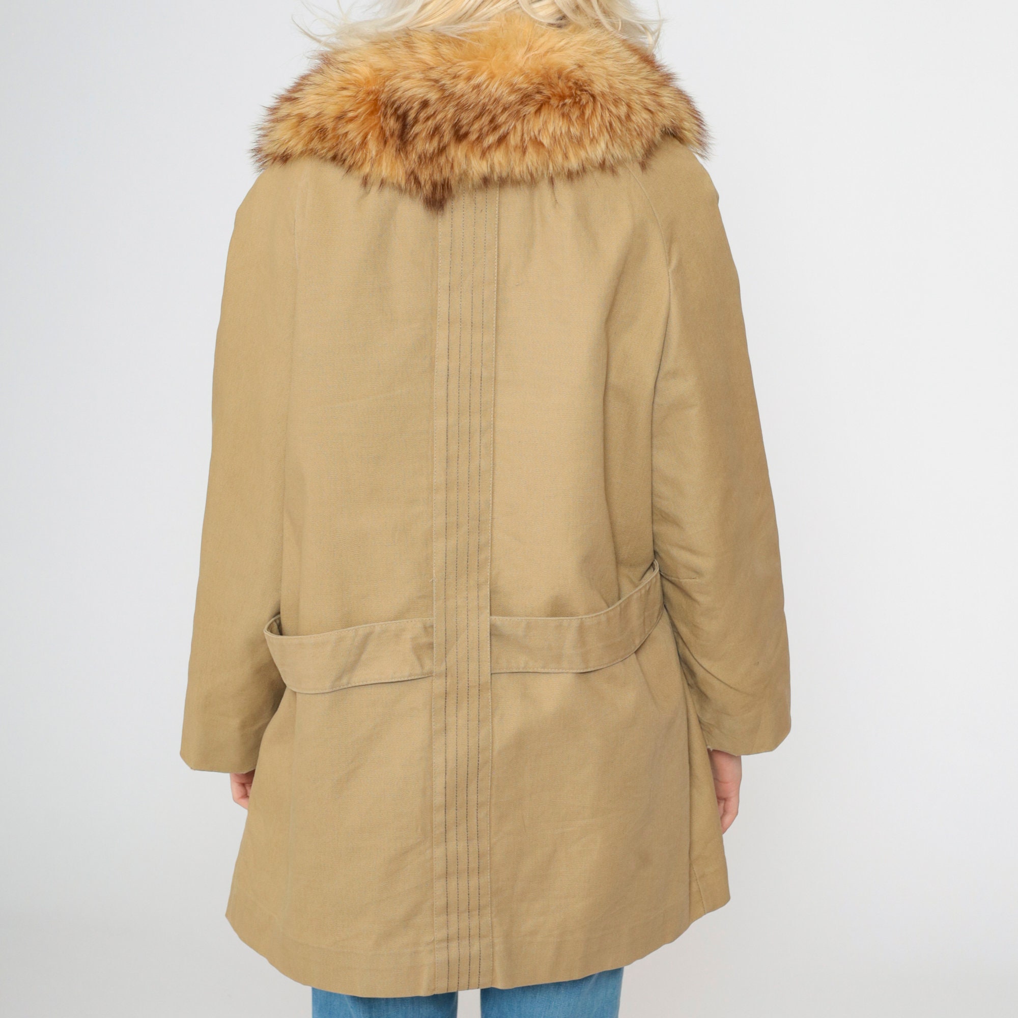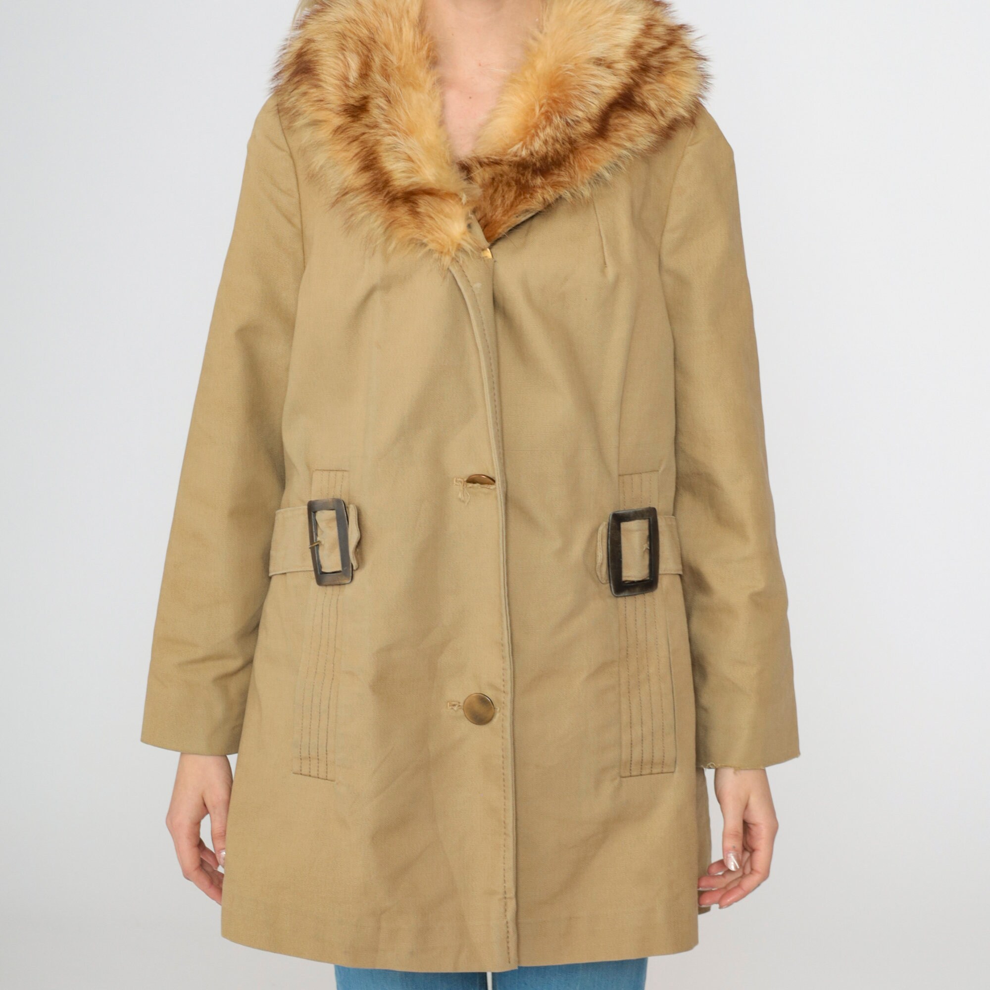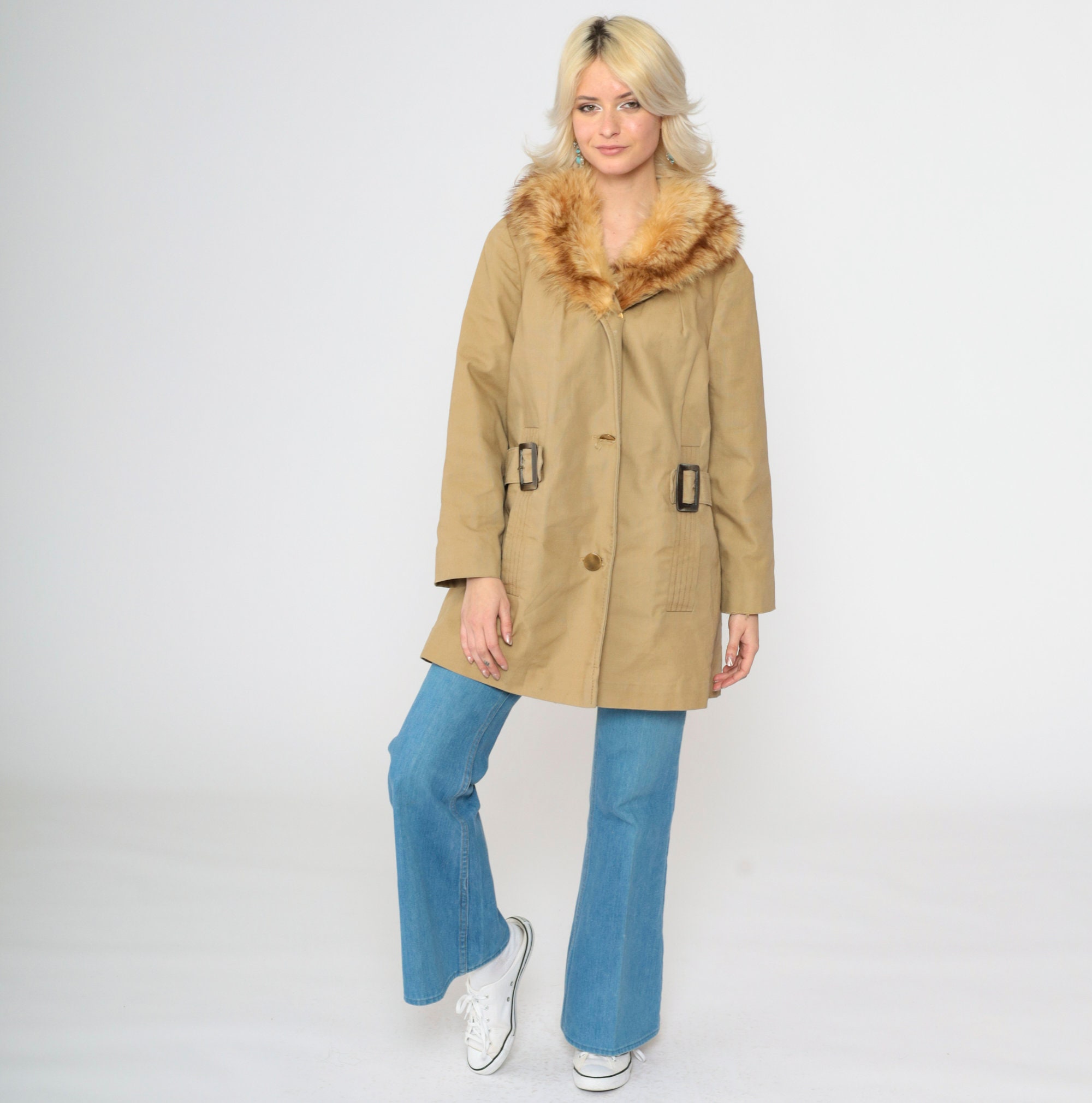 This vintage 1970s tan jacket features a luxurious fur trim and distinctive large buckle accents. It has a utilitarian design with a safari jacket style.