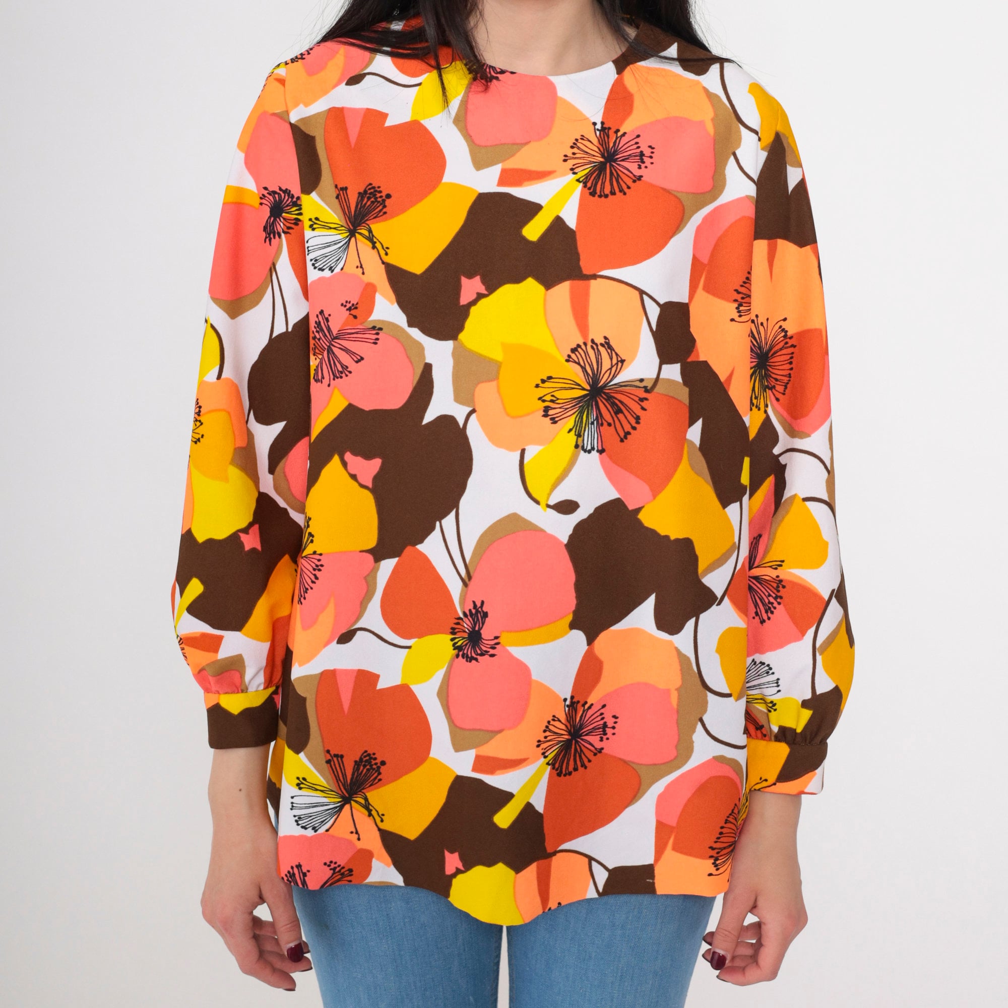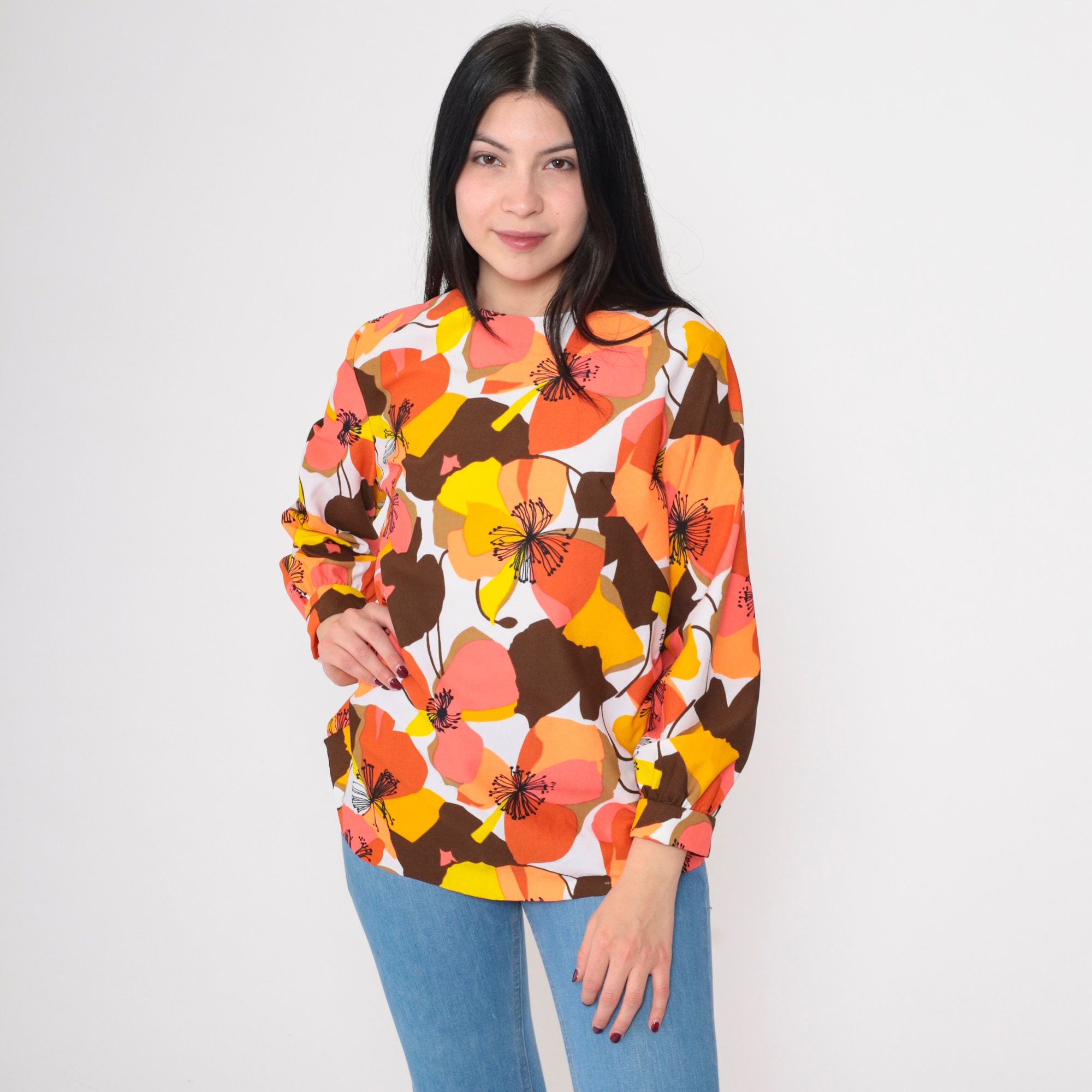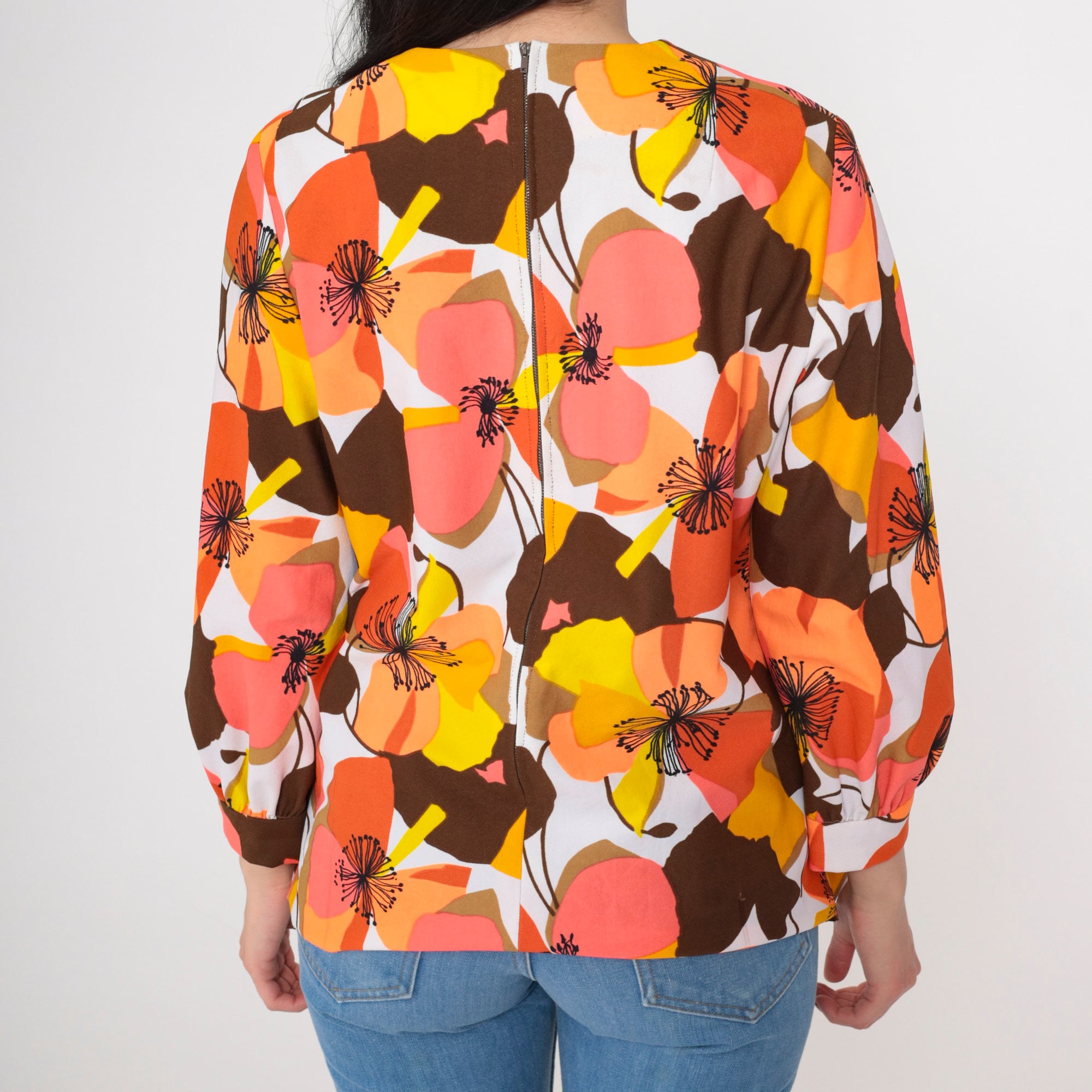 Vintage 70s shirt in a bright floral print. It features a round neckline, long sleeves, and a rear zipper.
