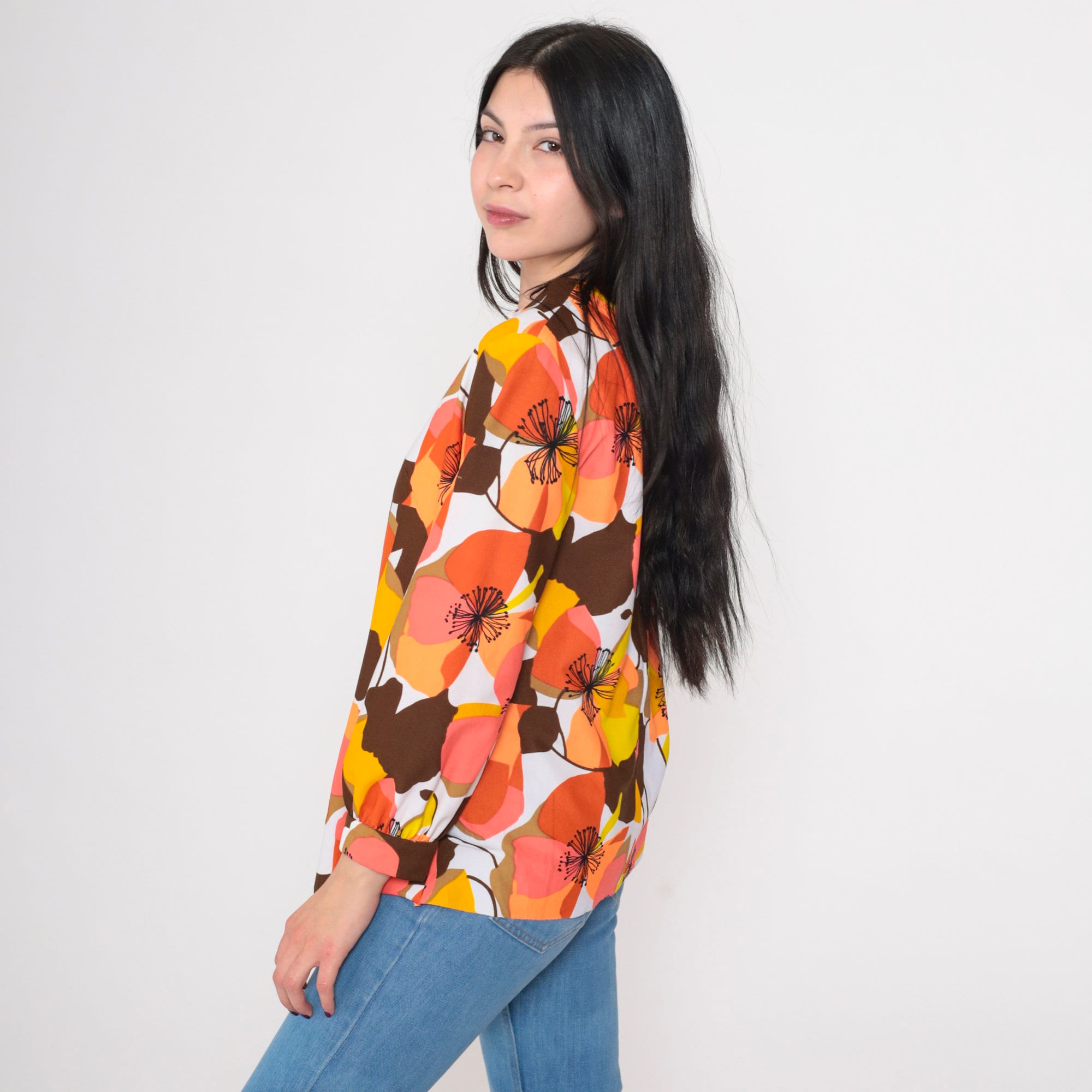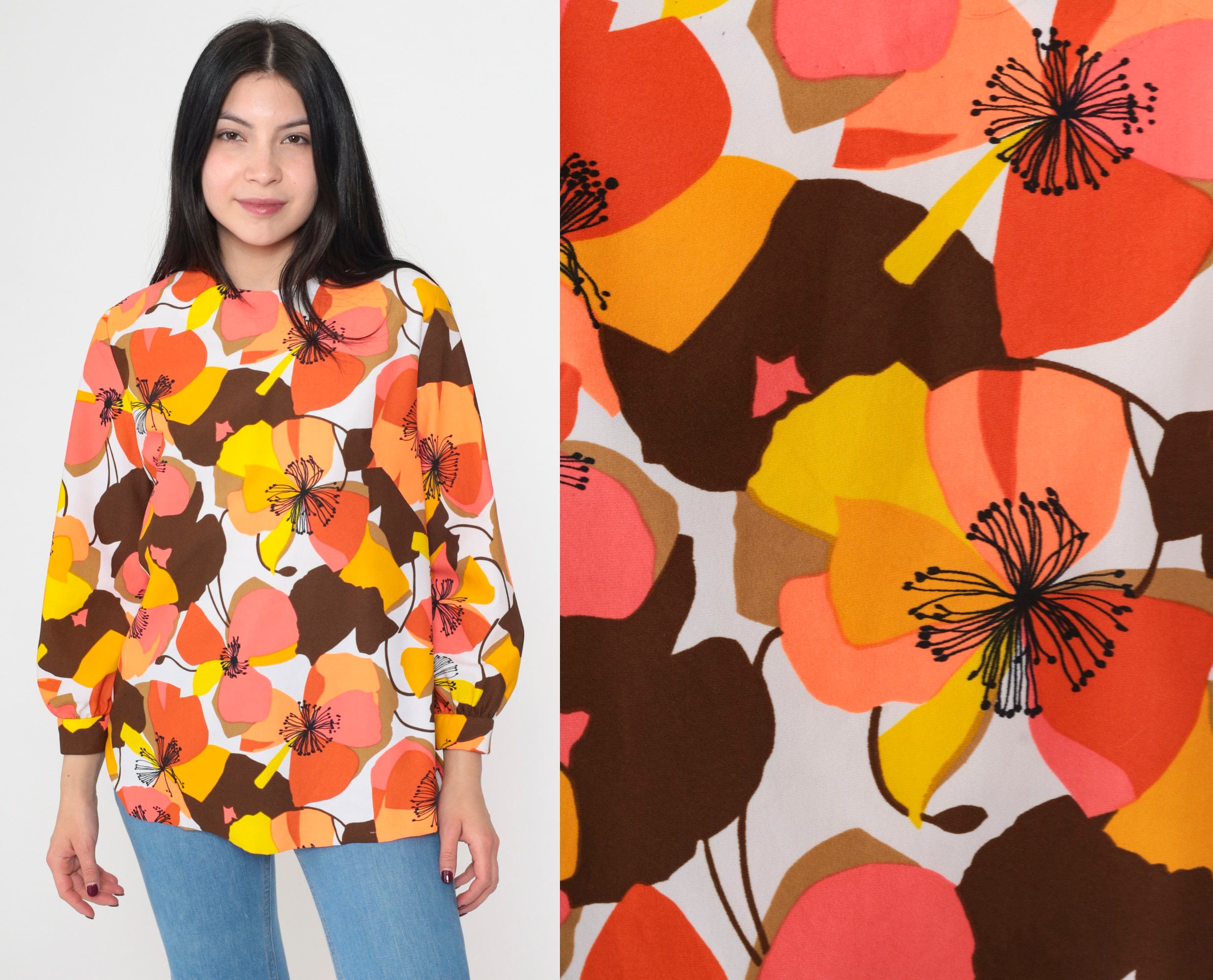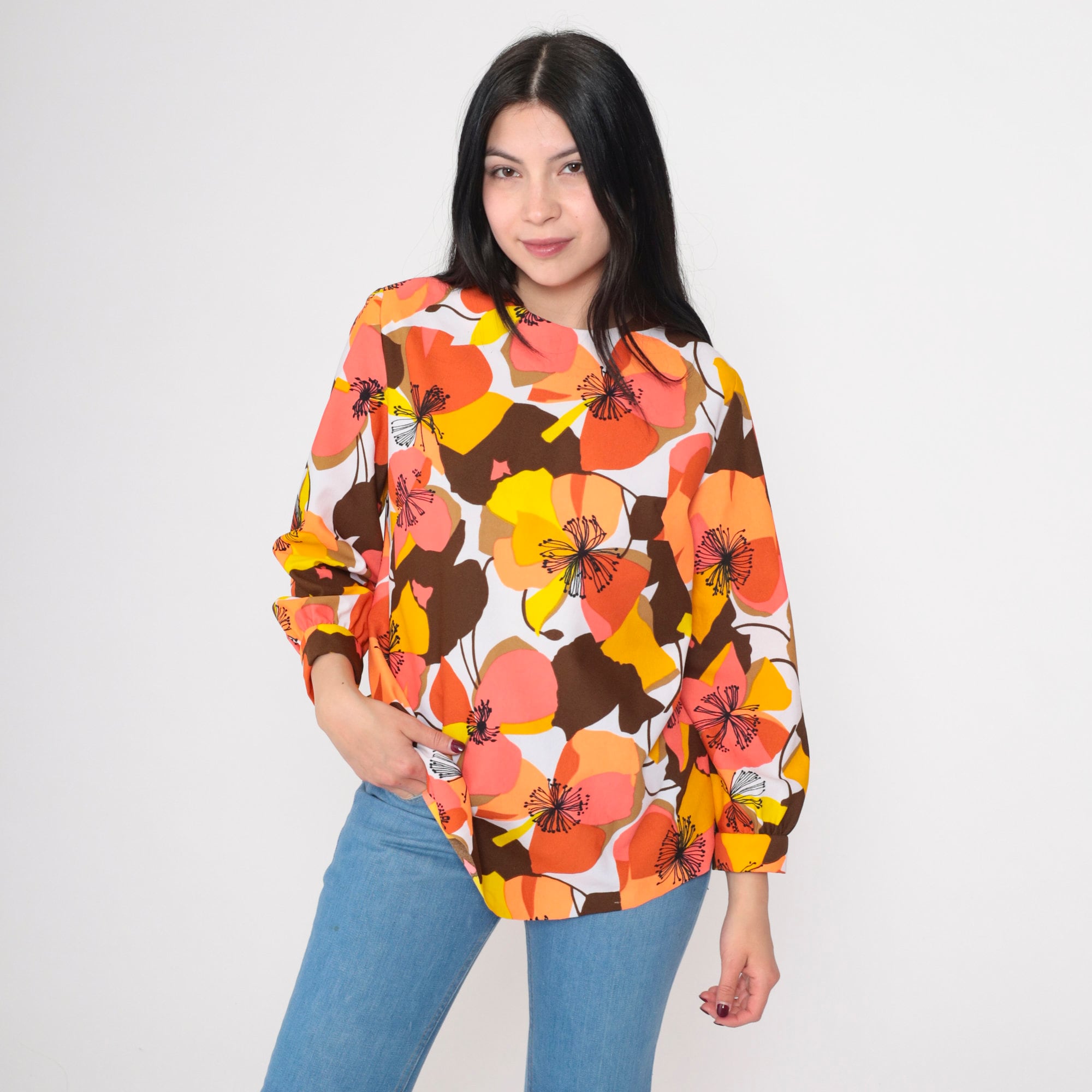 Vintage 70s shirt in a bright floral print. It features a round neckline, long sleeves, and a rear zipper.