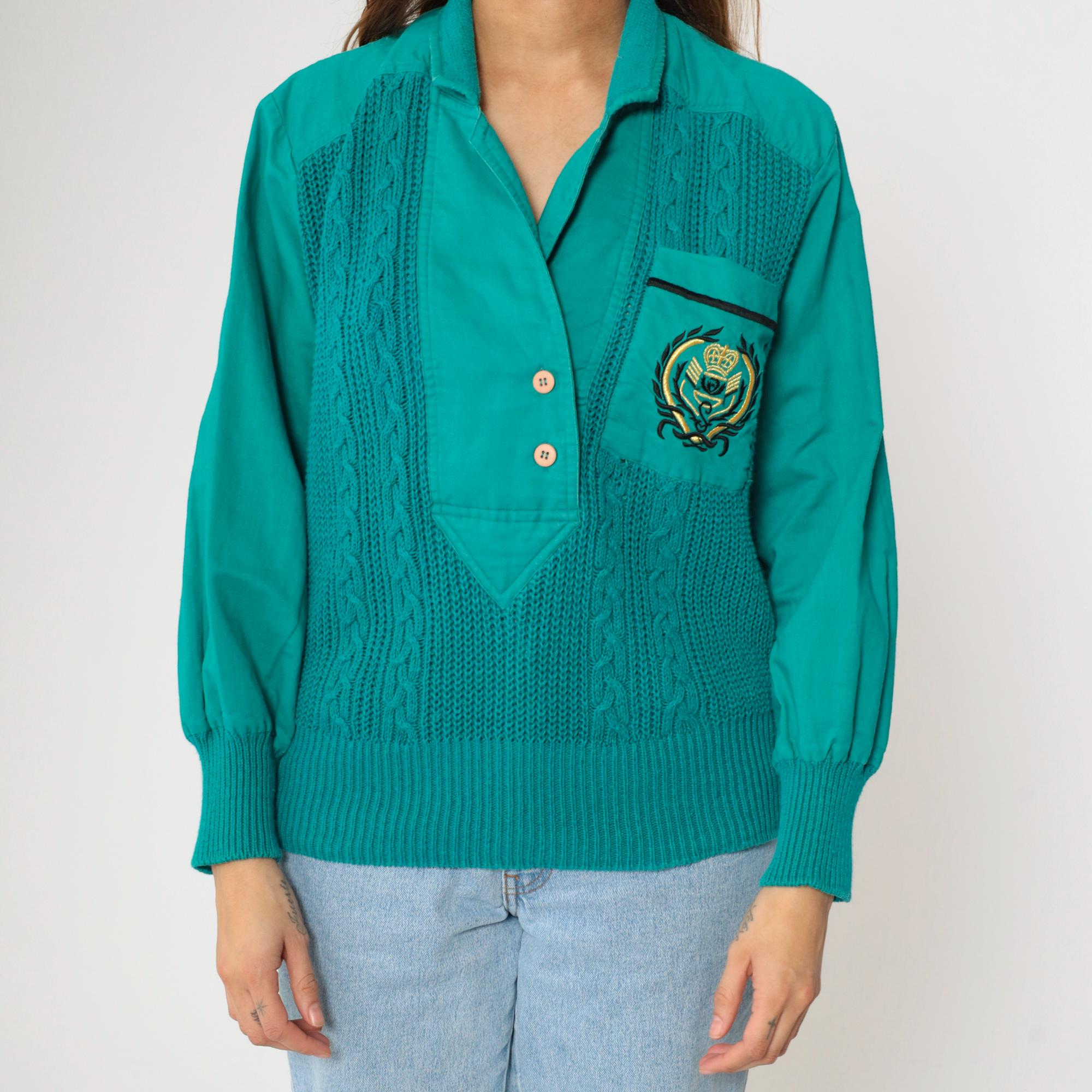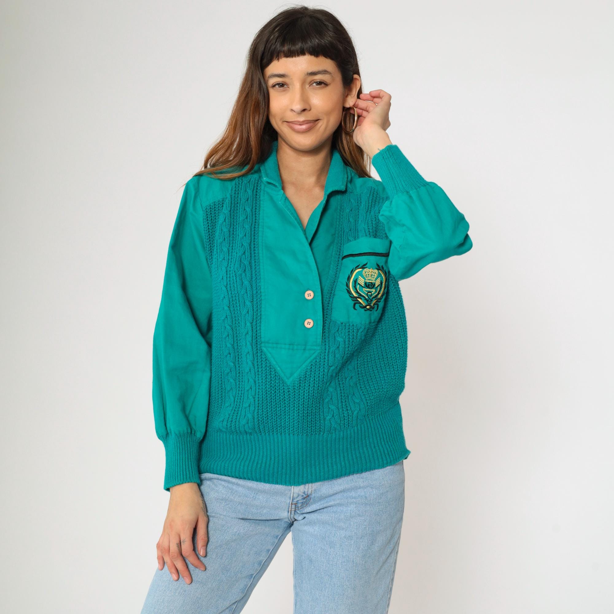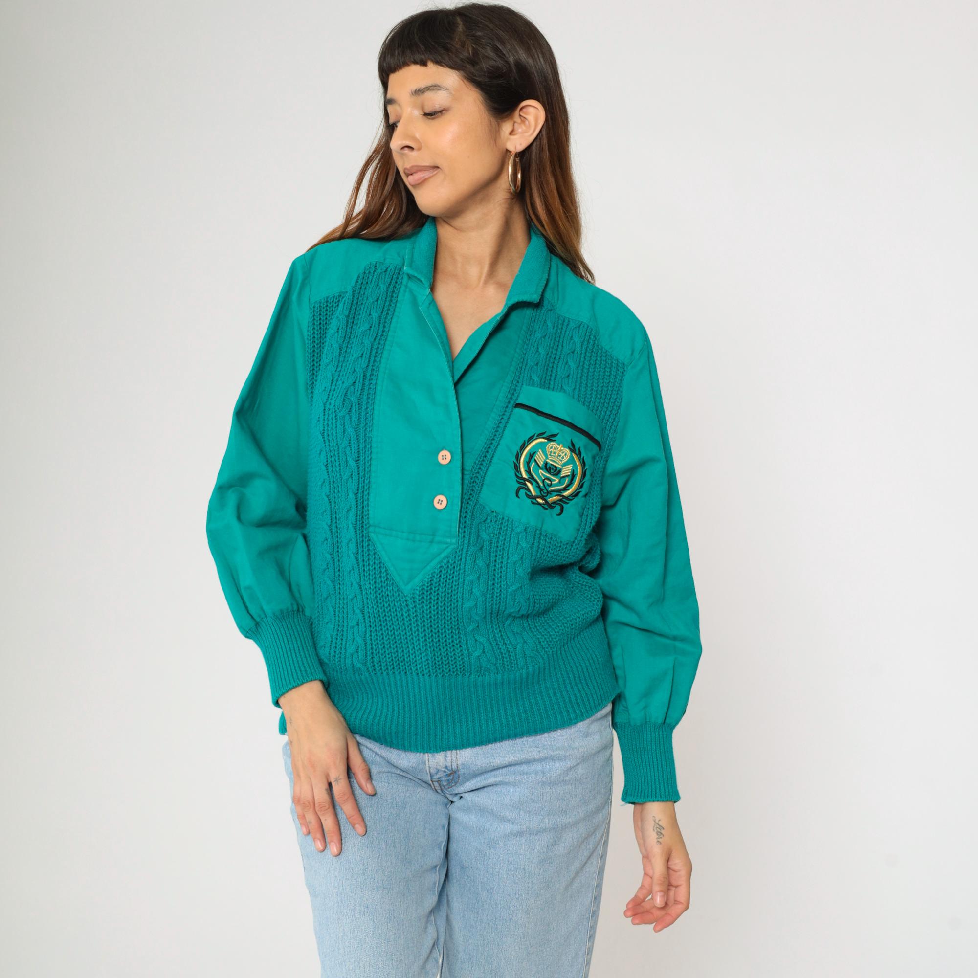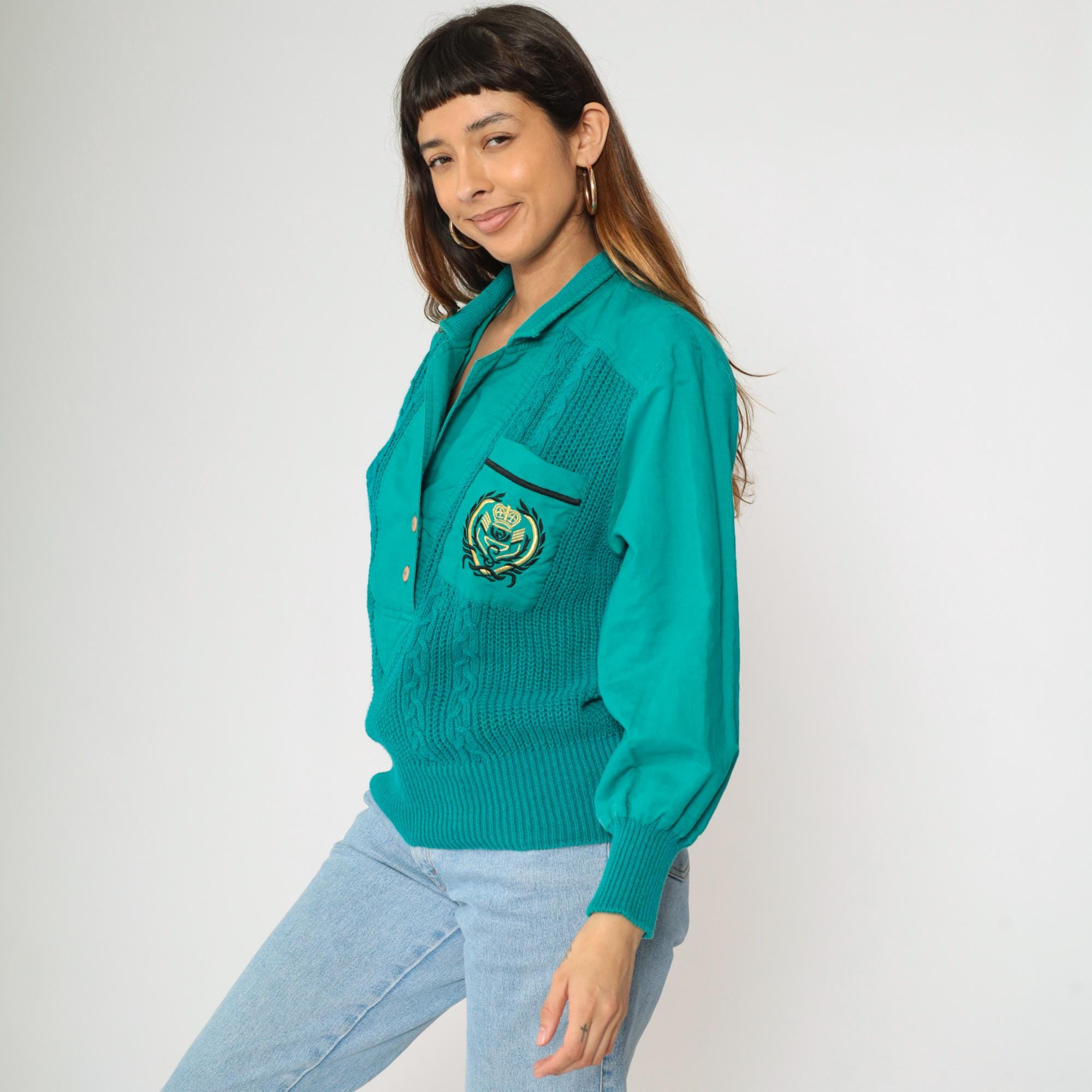 This vintage 80s 90s sweater blouse features a cable knit front in a teal color with an embroidered chest pocket. The back and sleeves are made from a lighter fabric whereas the front and cuffs are a sweater style knit.