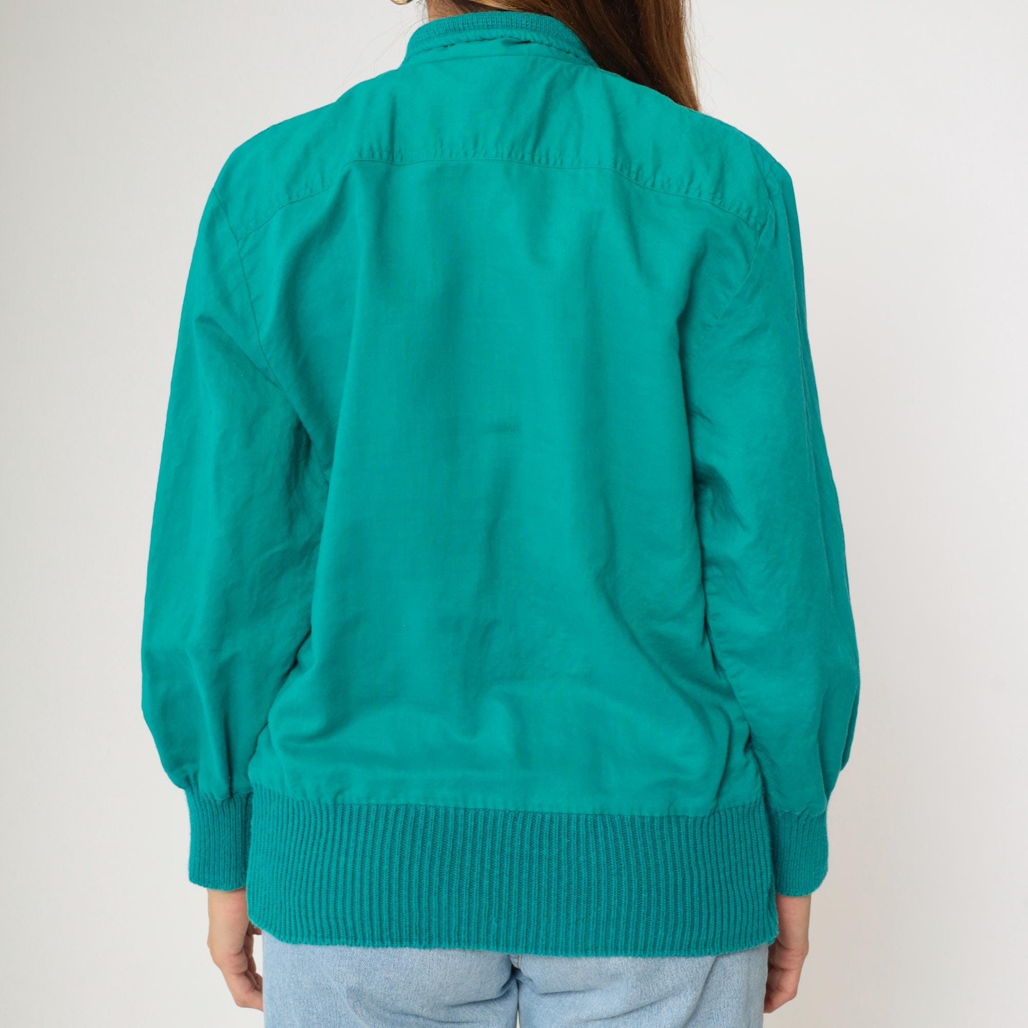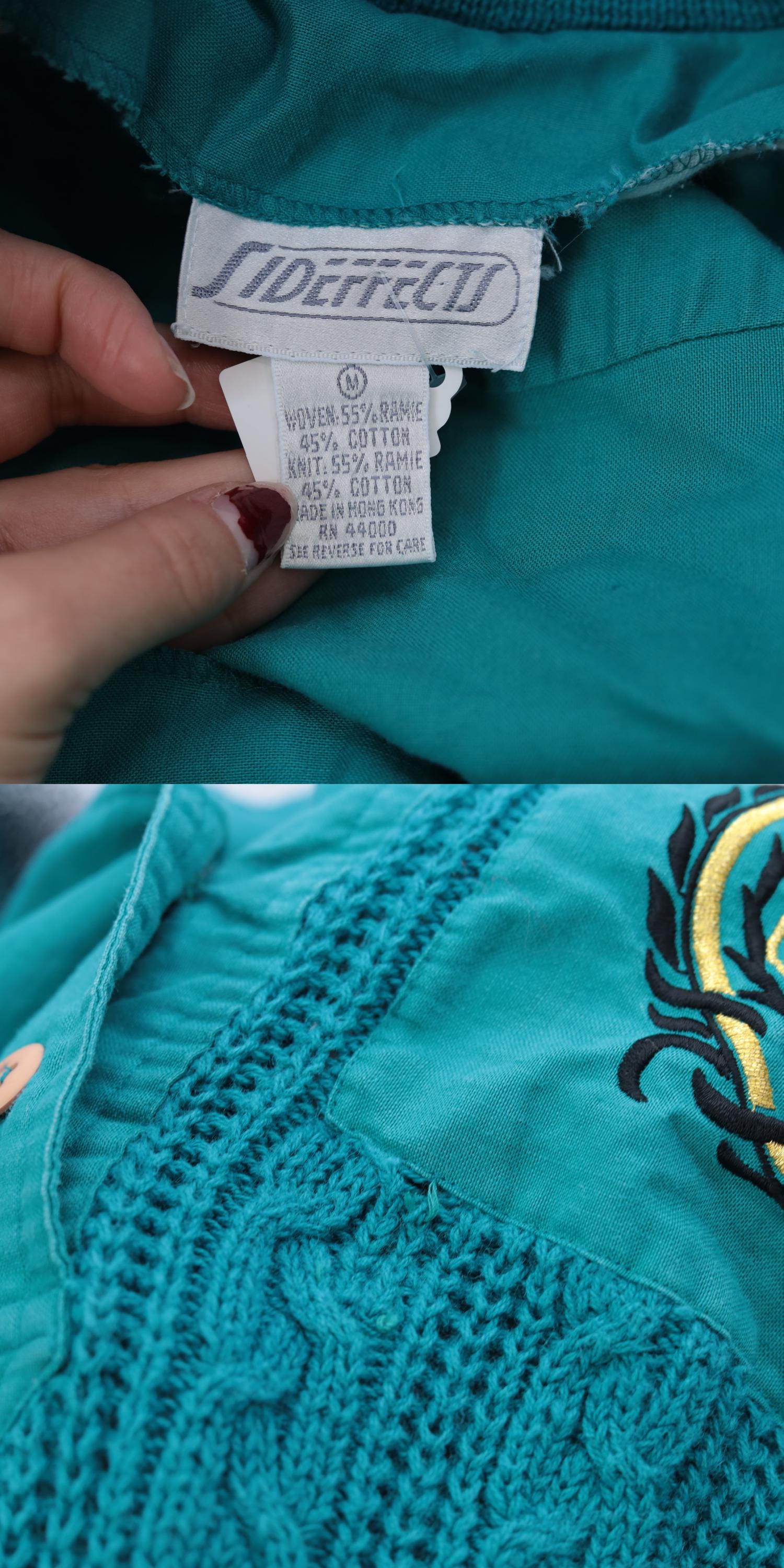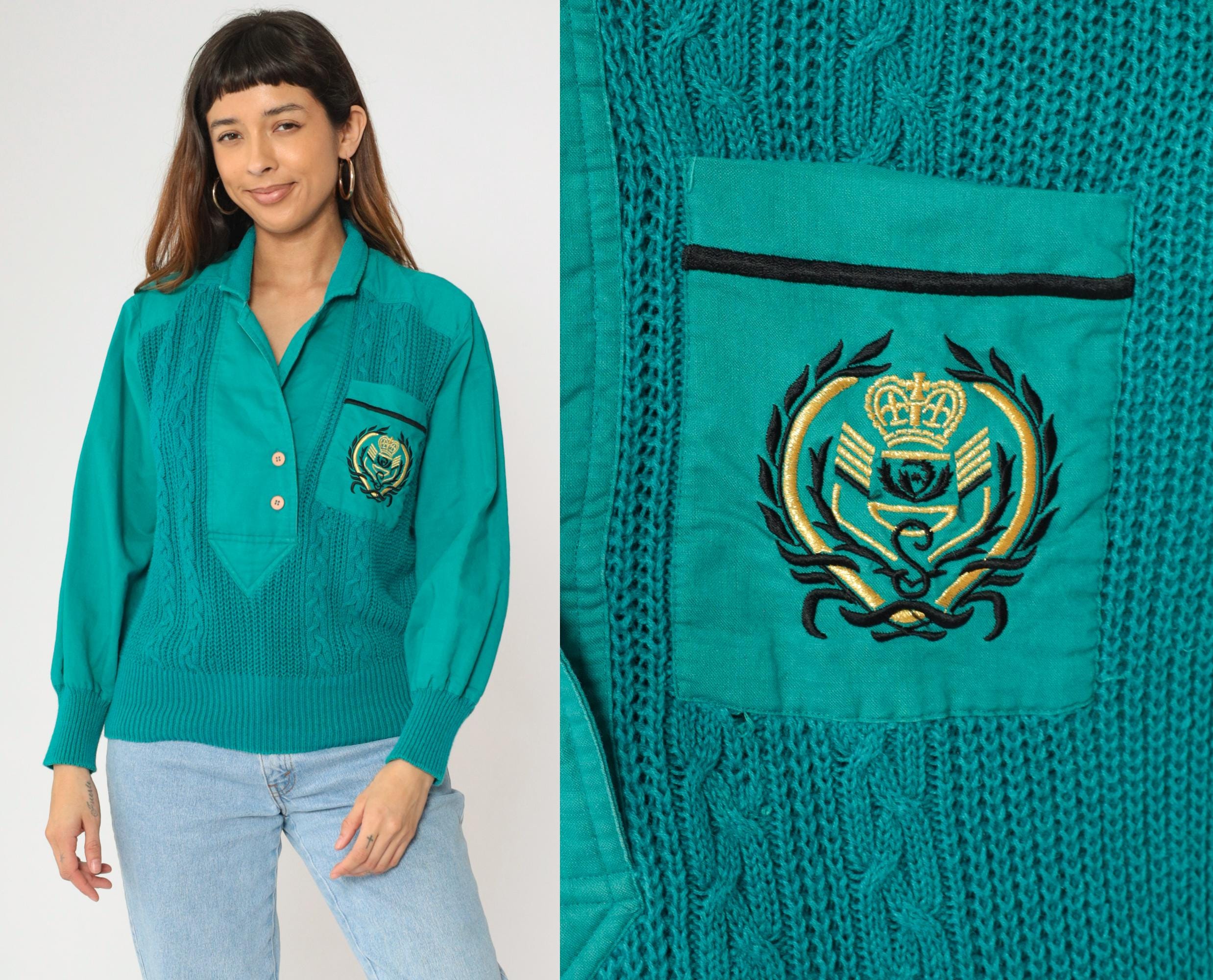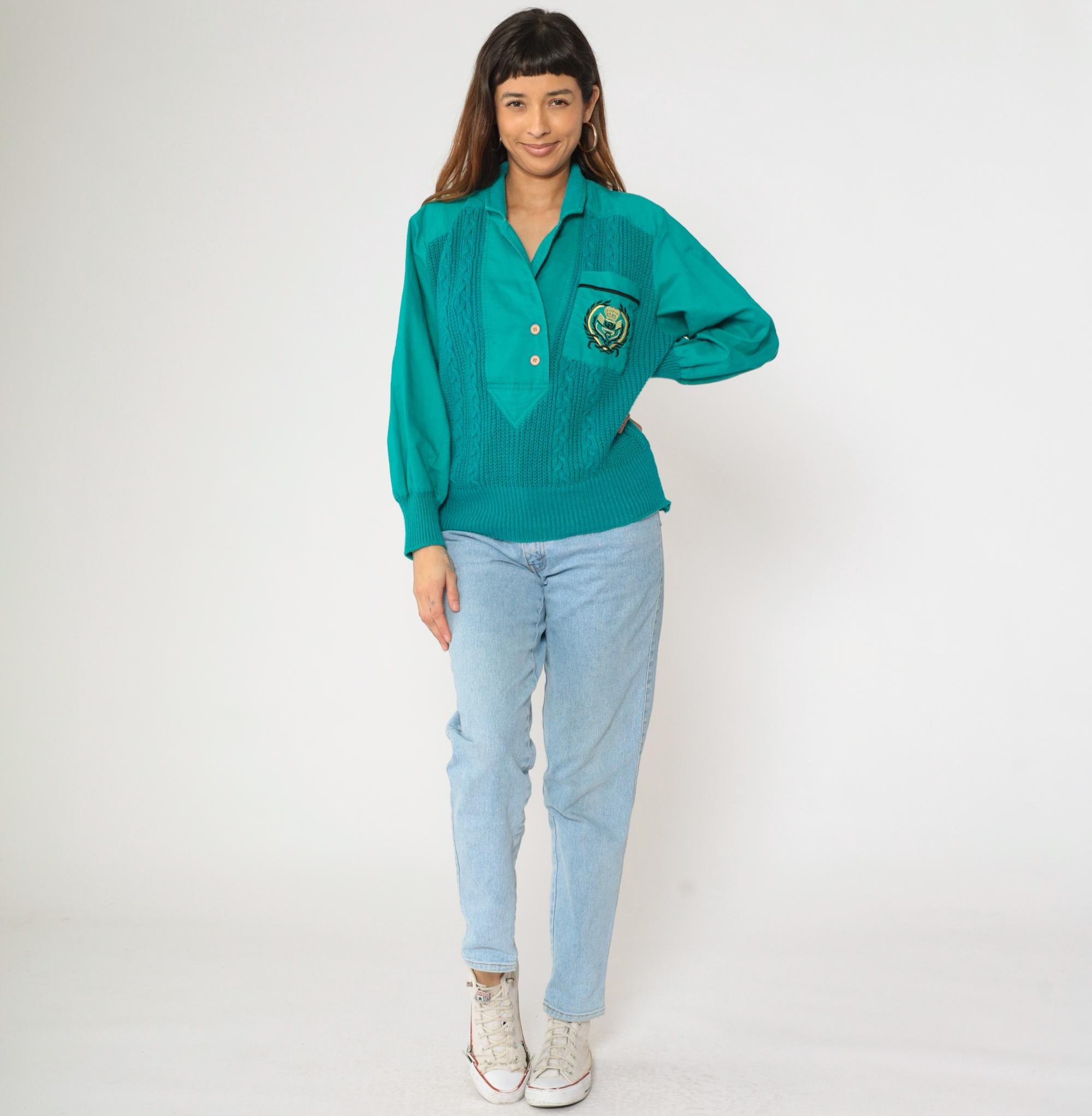 This vintage 80s 90s sweater blouse features a cable knit front in a teal color with an embroidered chest pocket. The back and sleeves are made from a lighter fabric whereas the front and cuffs are a sweater style knit.