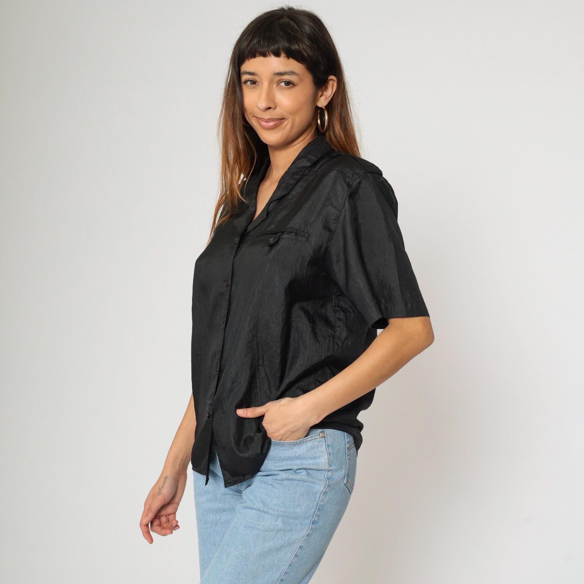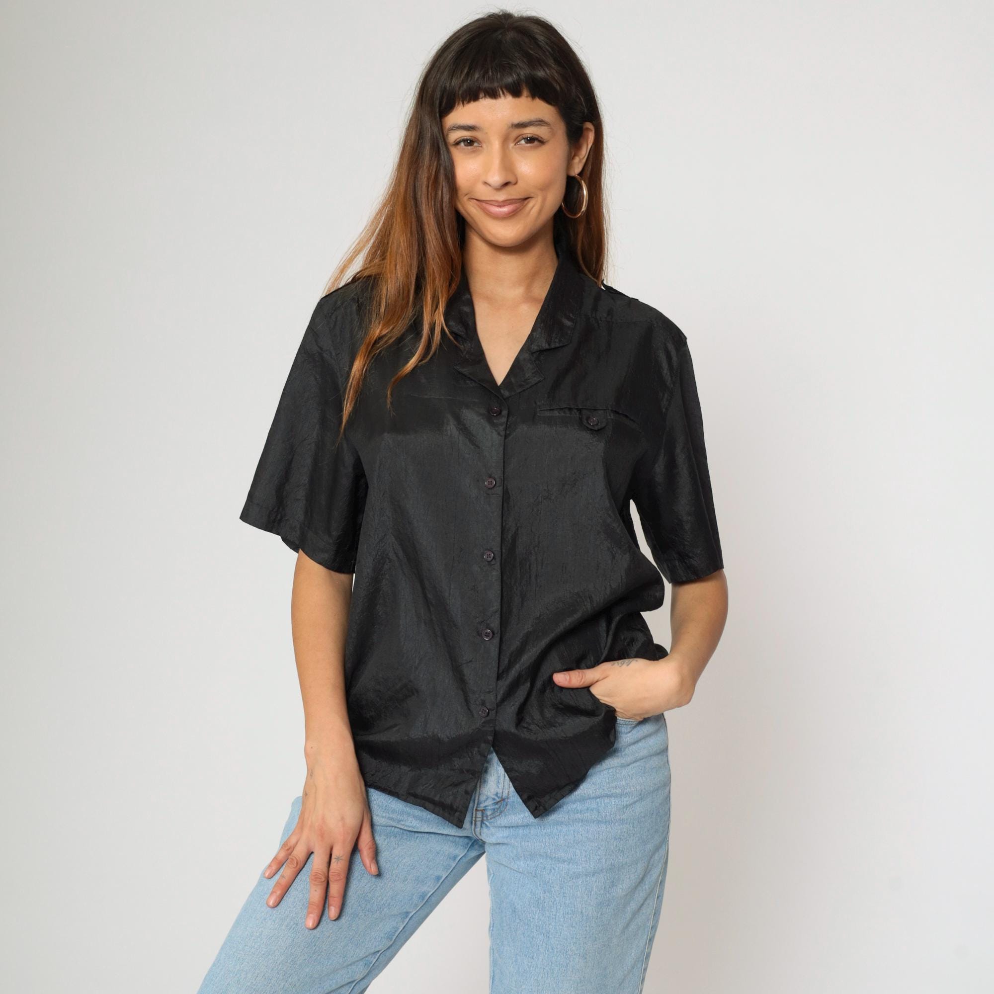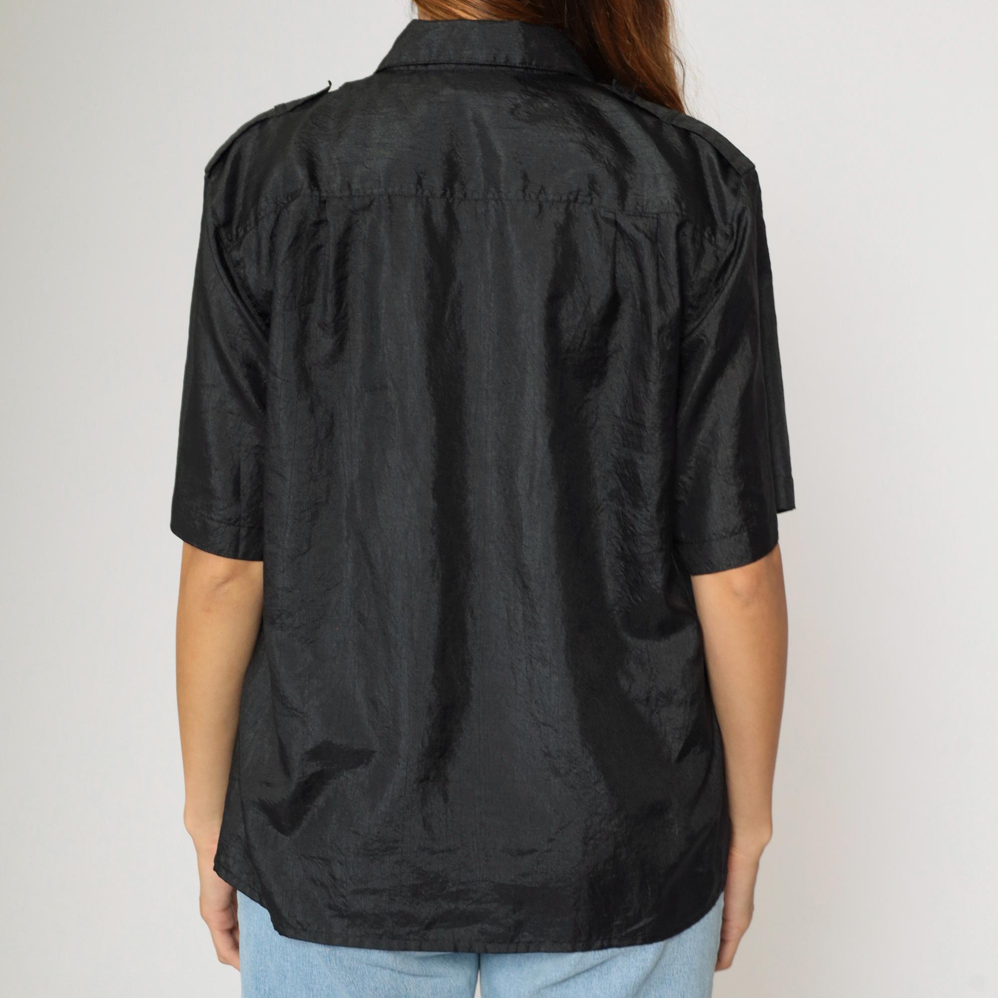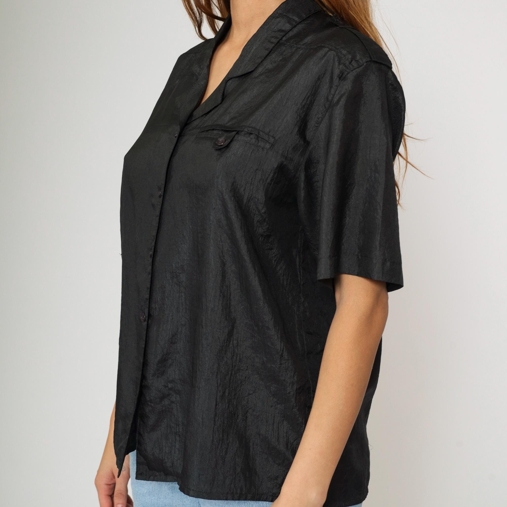 Vintage 90s shirt in shiny black polyester with a pocket on the chest.