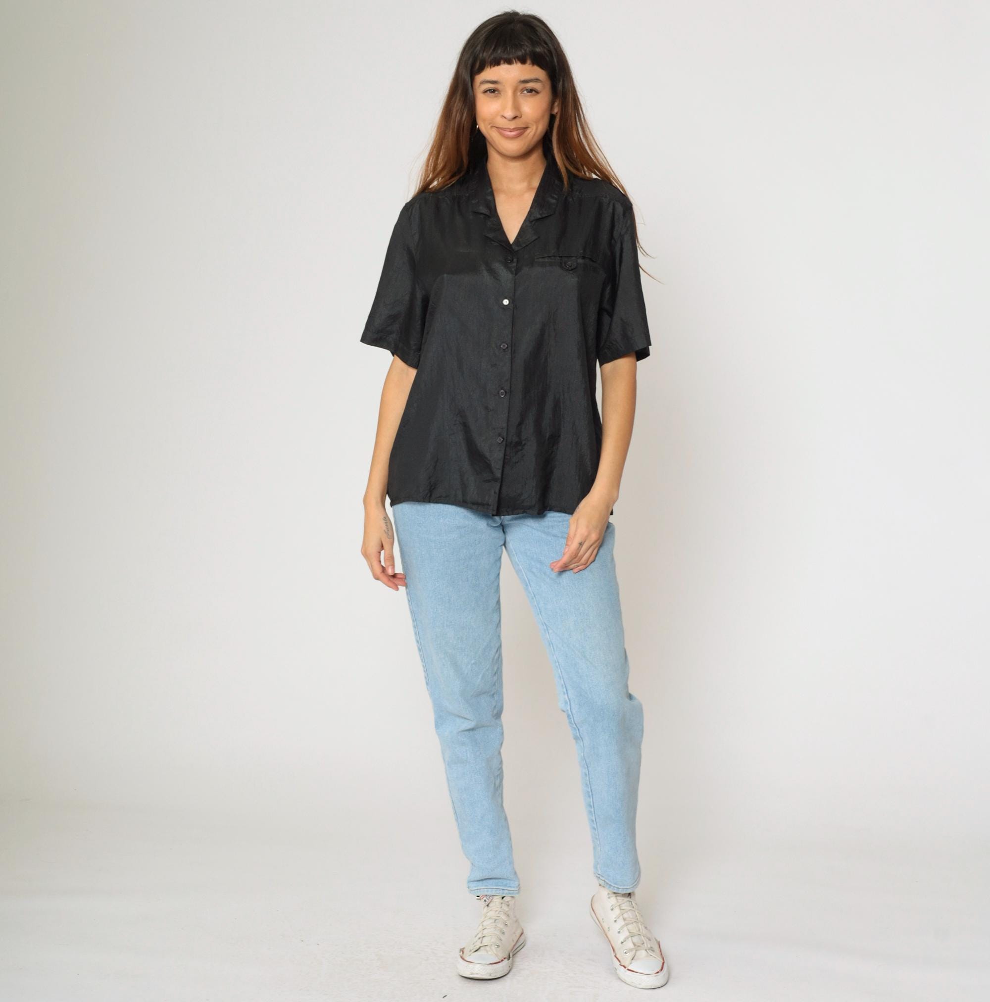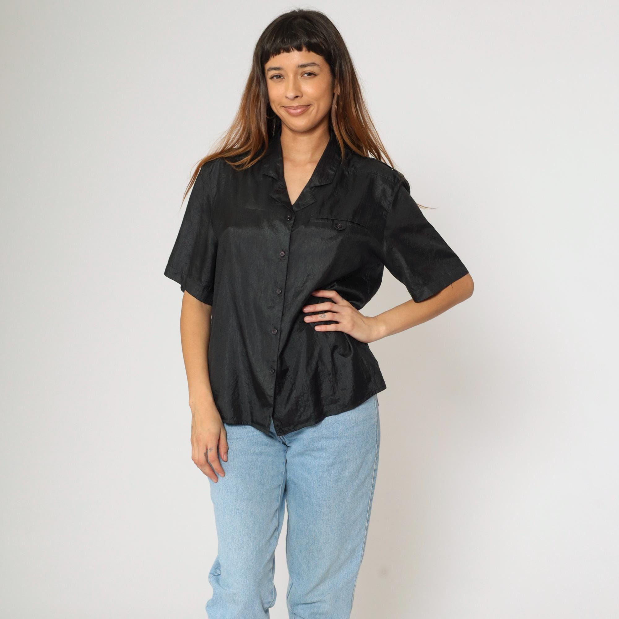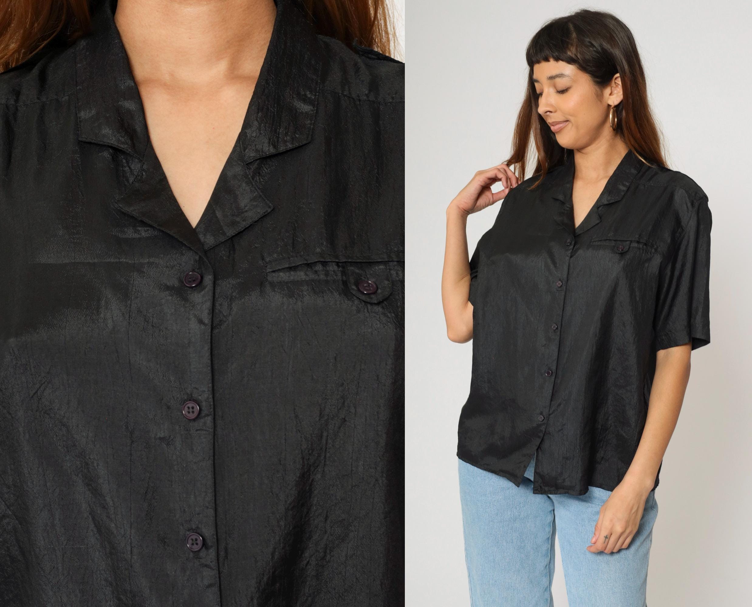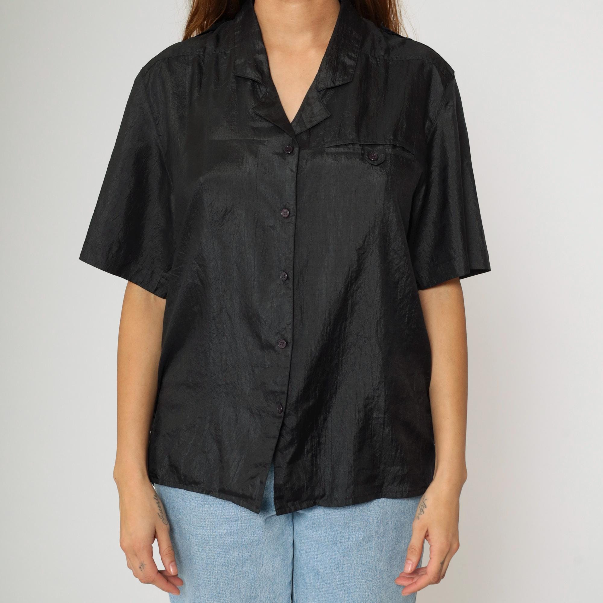 Vintage 90s shirt in shiny black polyester with a pocket on the chest.