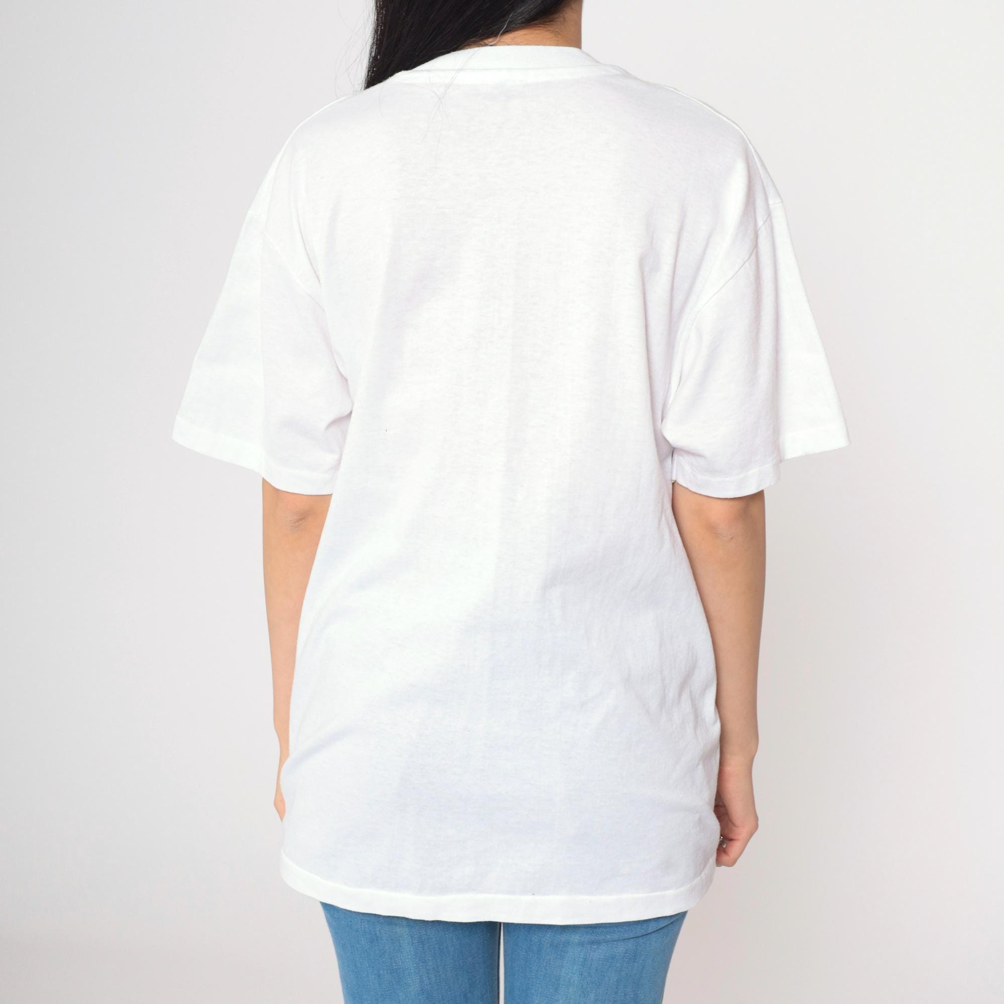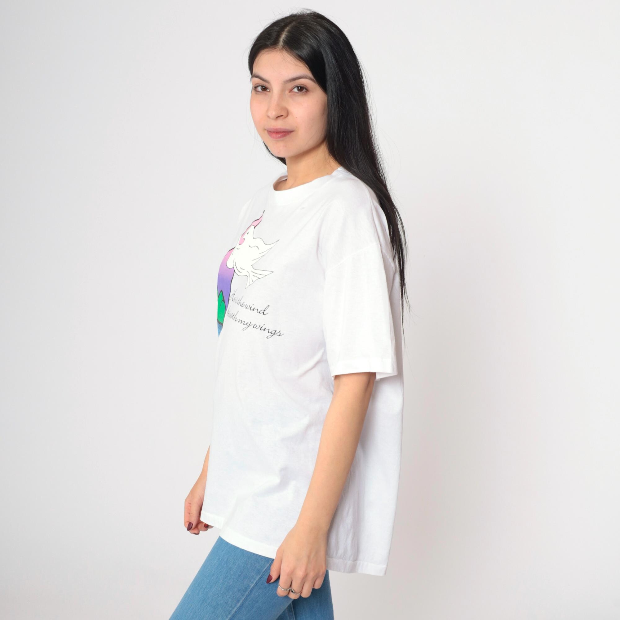 Vintage 90s T-shirt featuring a white dove graphic with the phrase "He is the wind beneath my wings." This white tee has short sleeves, a crew neckline, and a relaxed fit.
