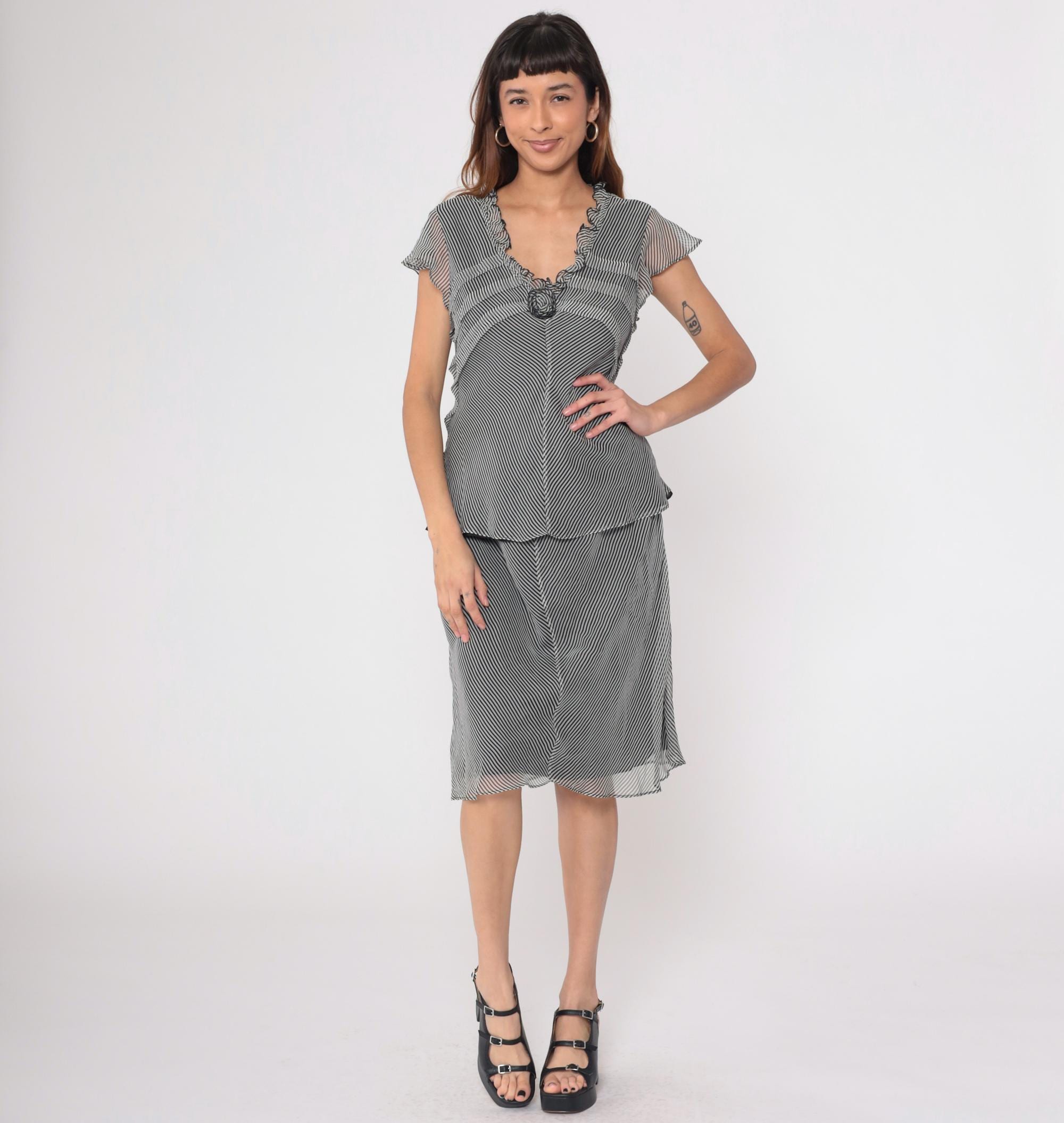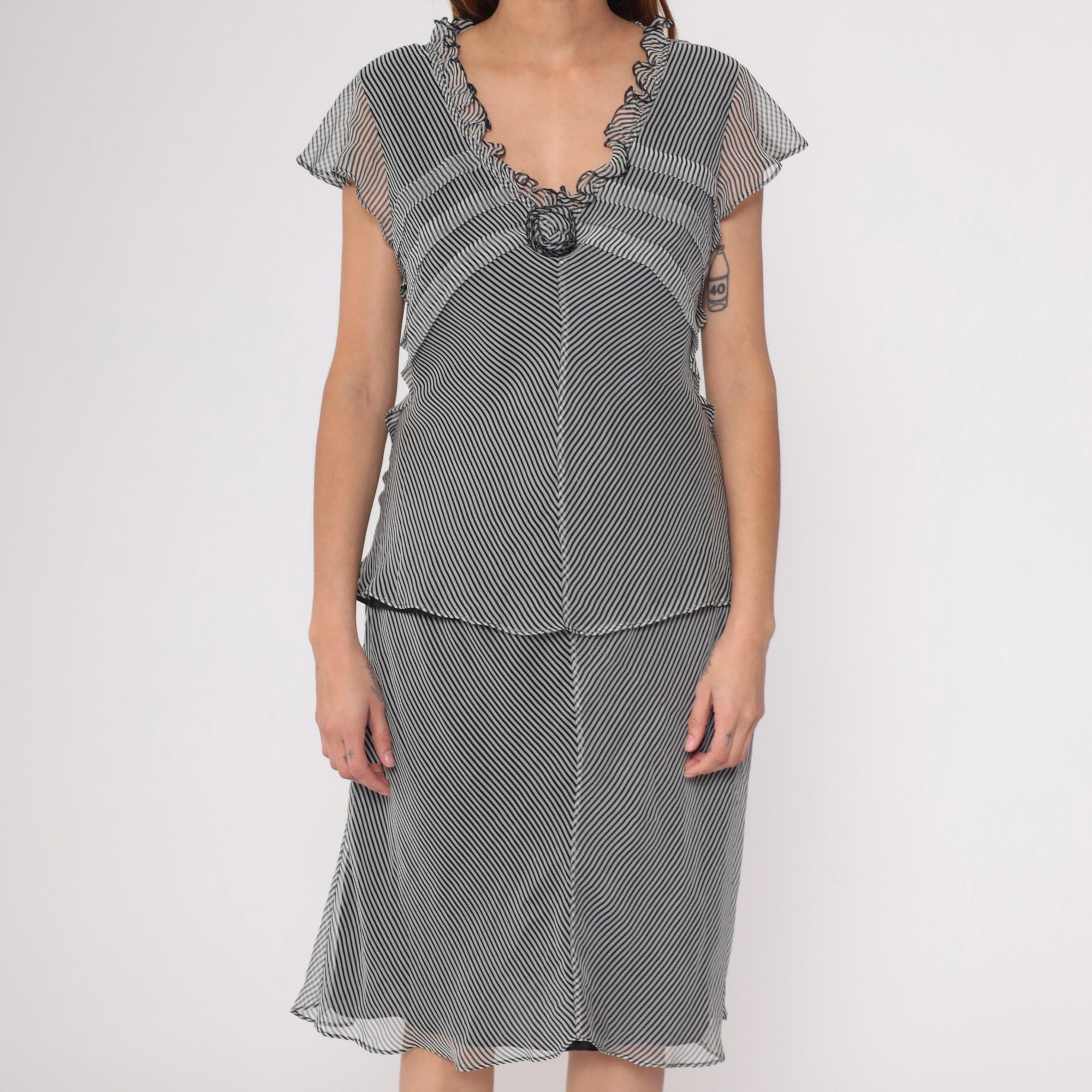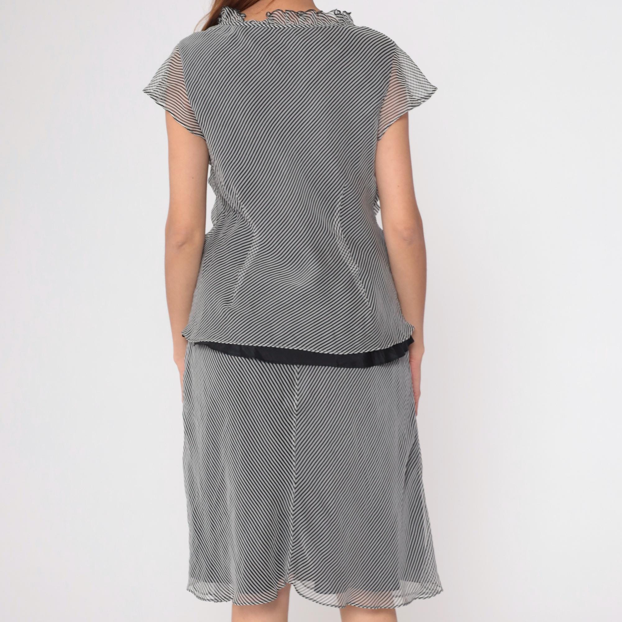 Vintage 90s two piece dress outfit in black and white chevron striped print. The blouse features sheer flutter sleeves, a ruffle trim v neck and a rosette. The skirt has a high elastic waist and is midi length.
