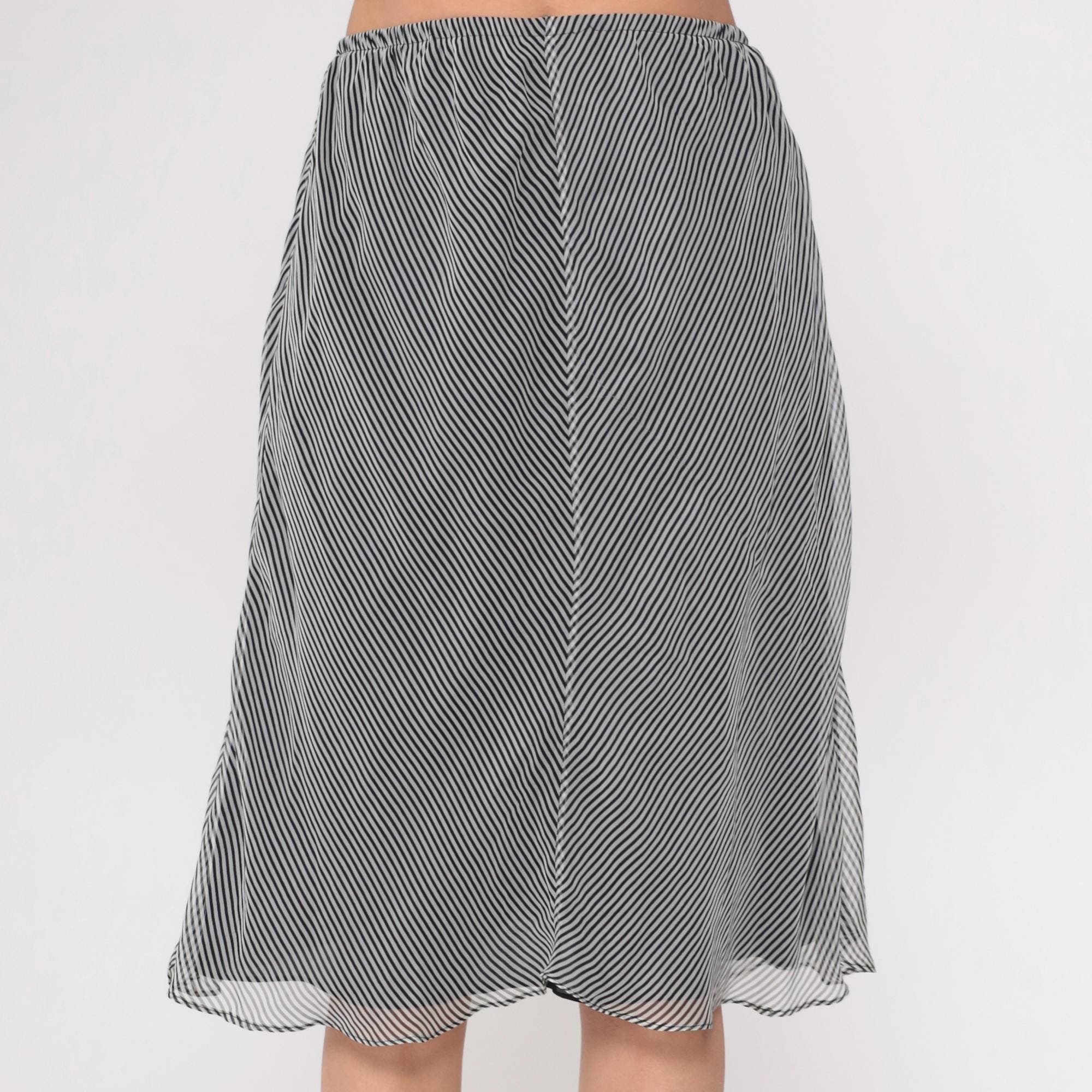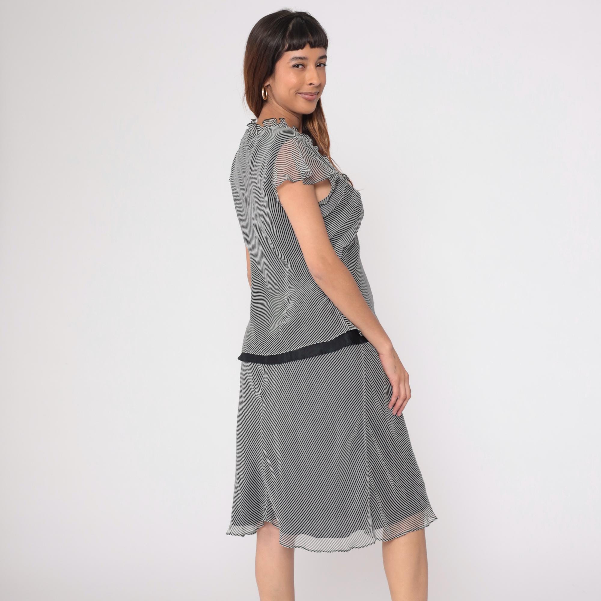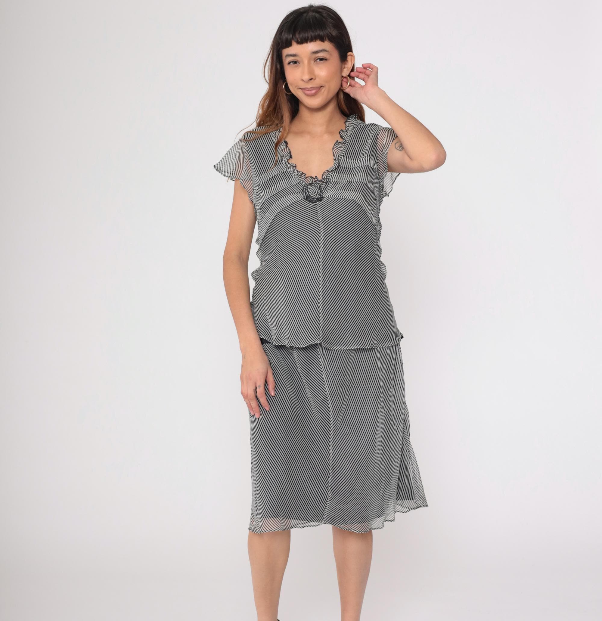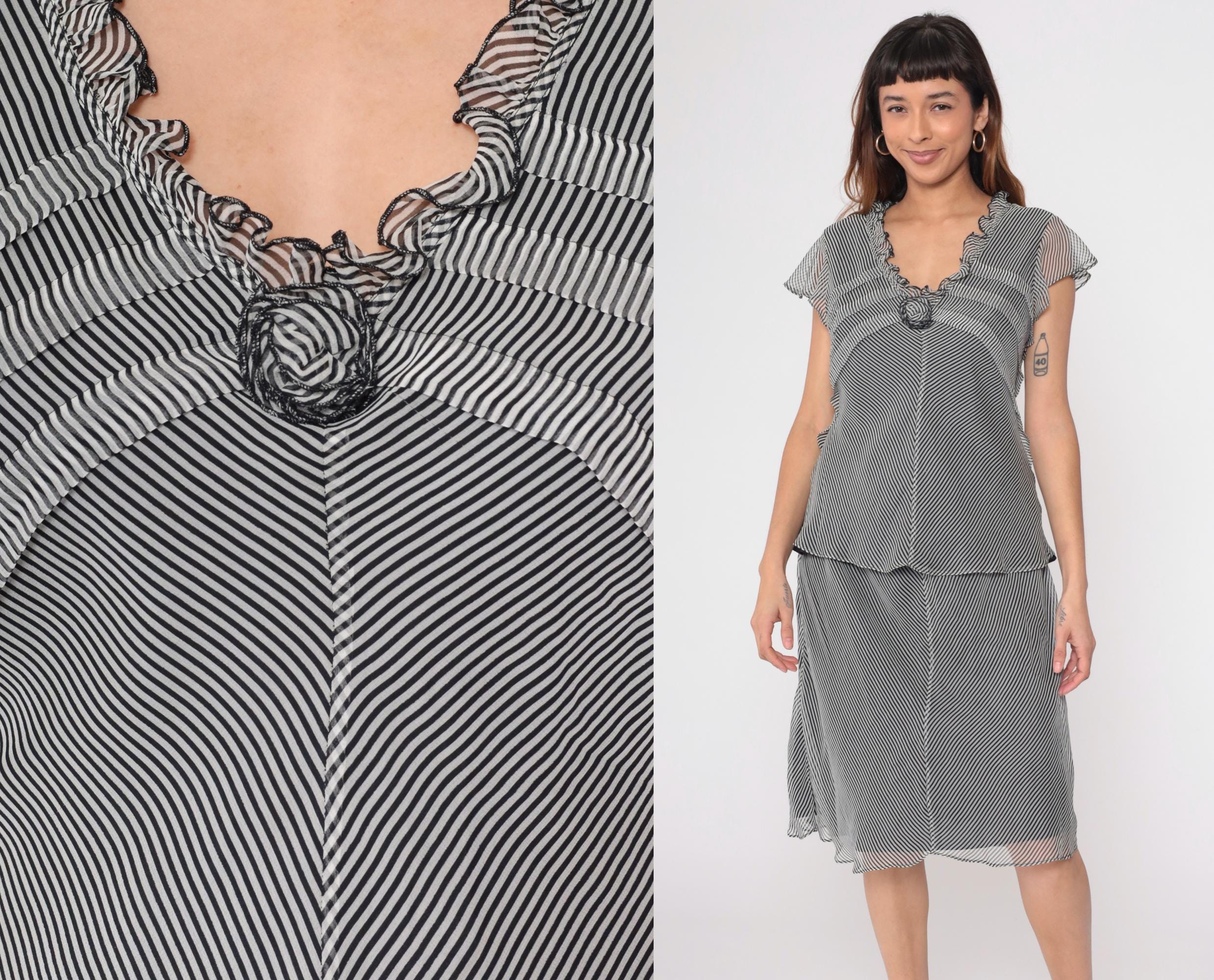 Vintage 90s two piece dress outfit in black and white chevron striped print. The blouse features sheer flutter sleeves, a ruffle trim v neck and a rosette. The skirt has a high elastic waist and is midi length.