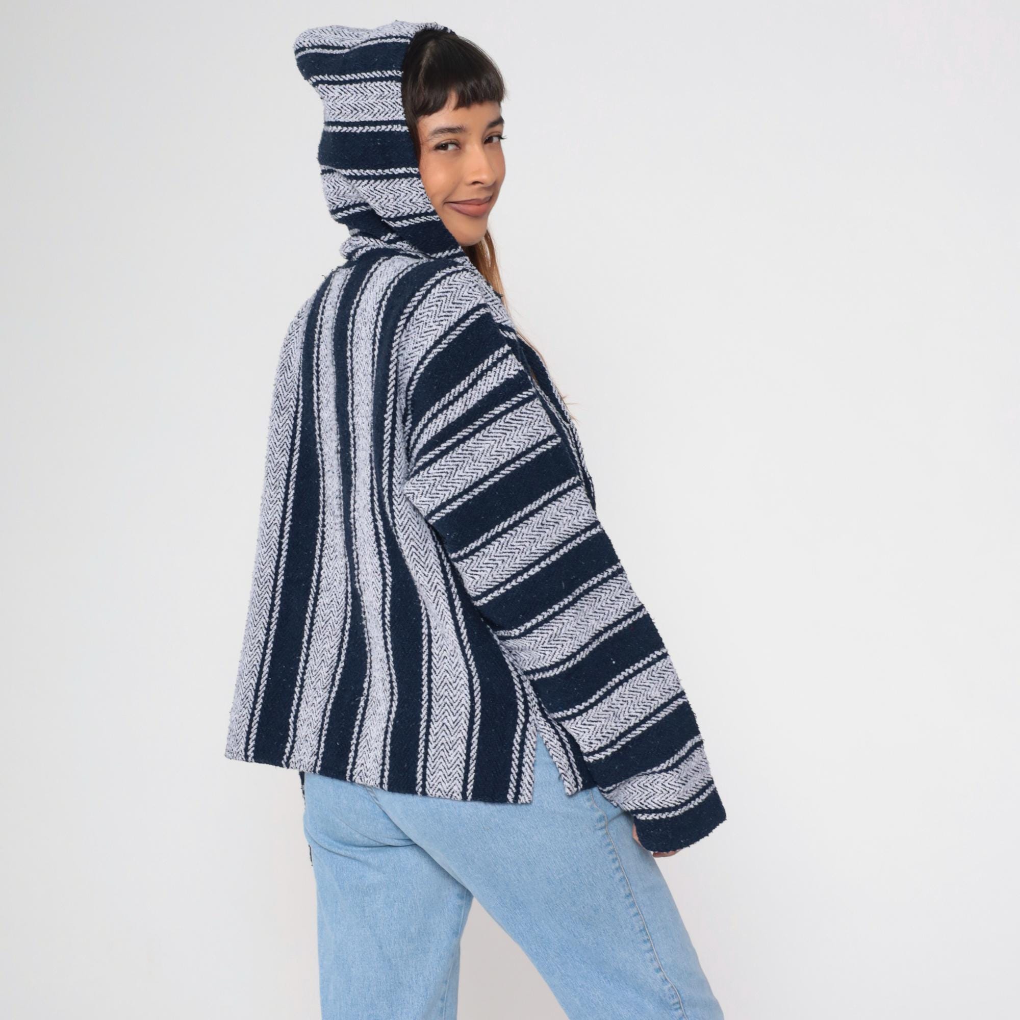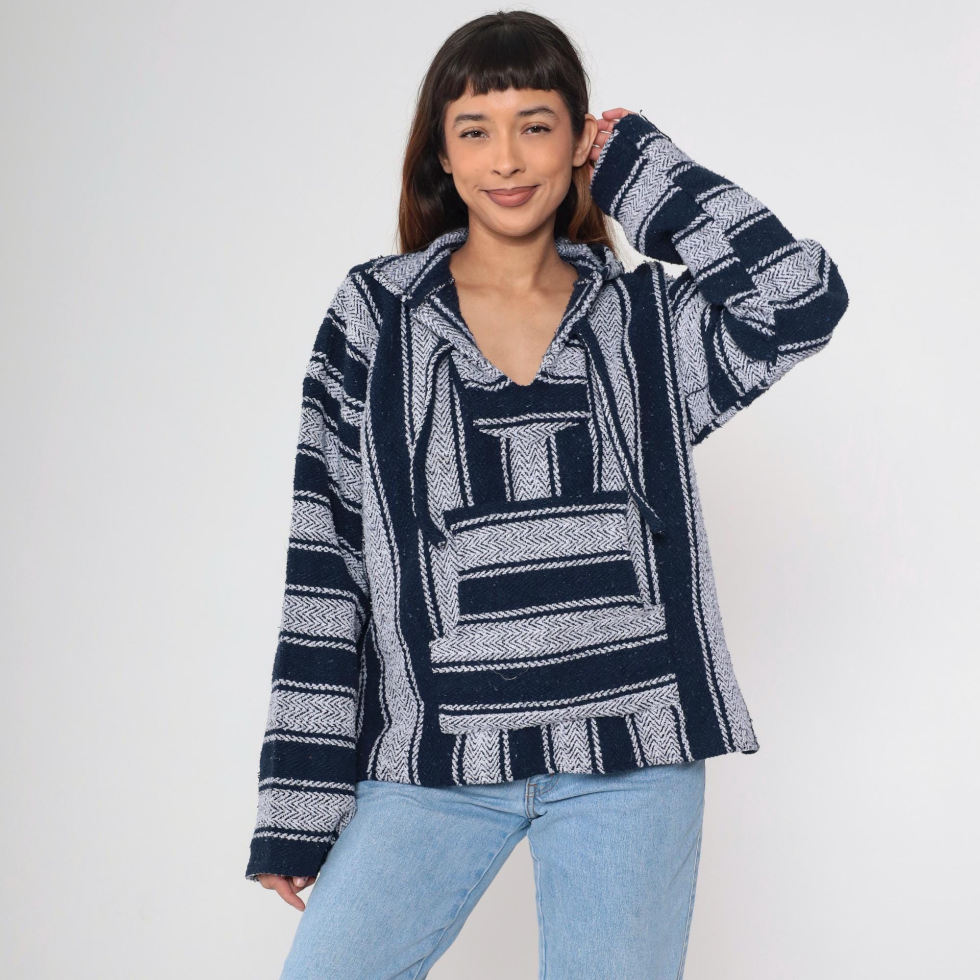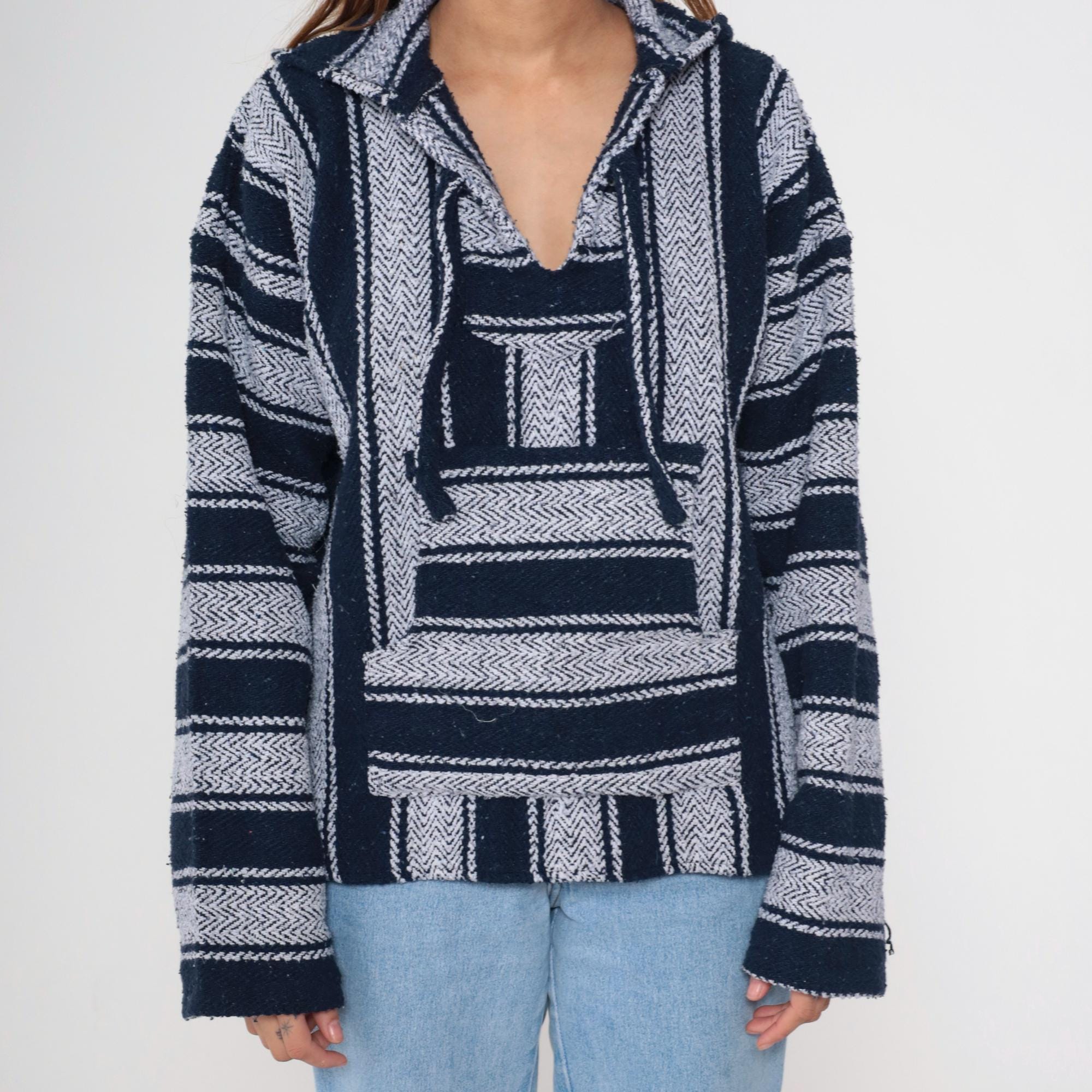 Vintage 00s Mexican drug rug hoodie sweatshirt in navy blue and white stripes with a kangaroo pocket.