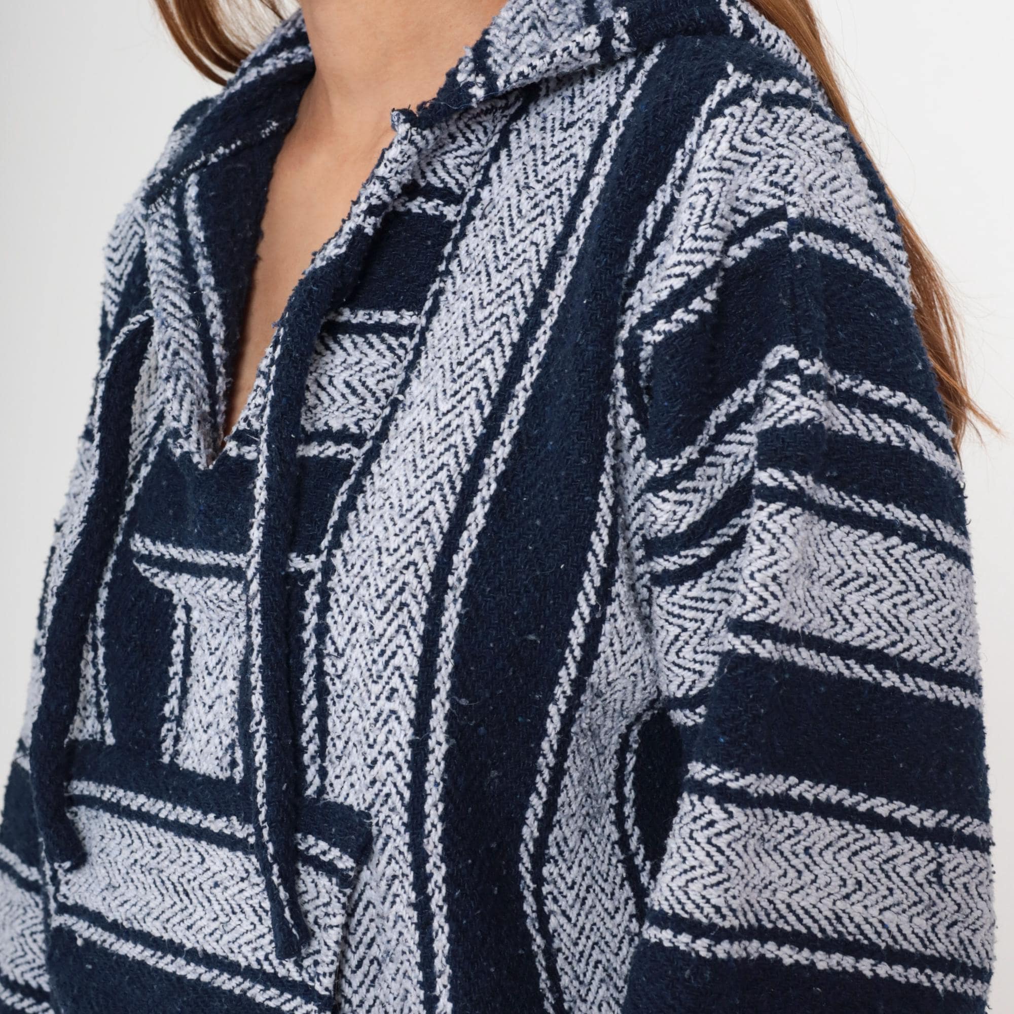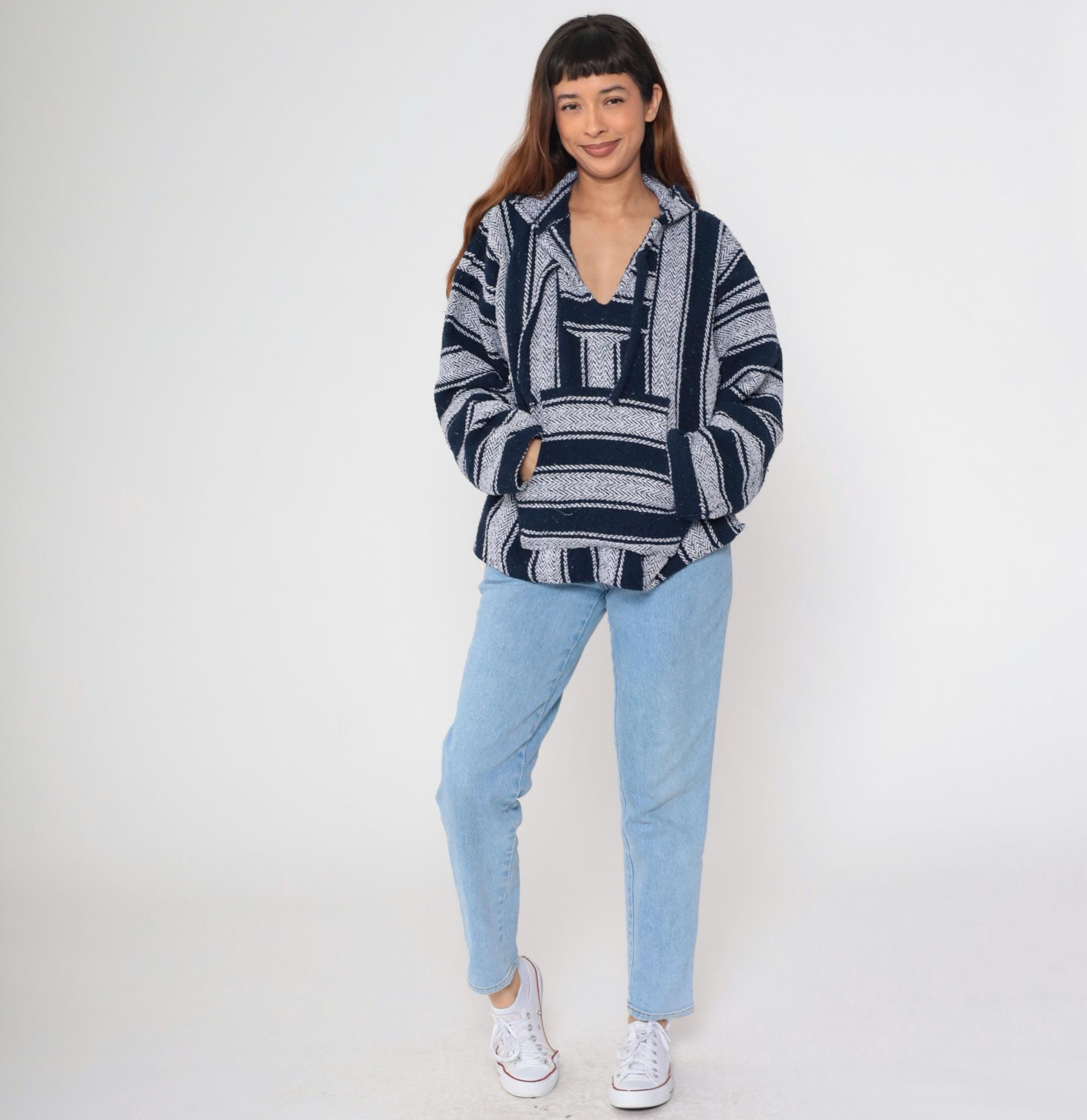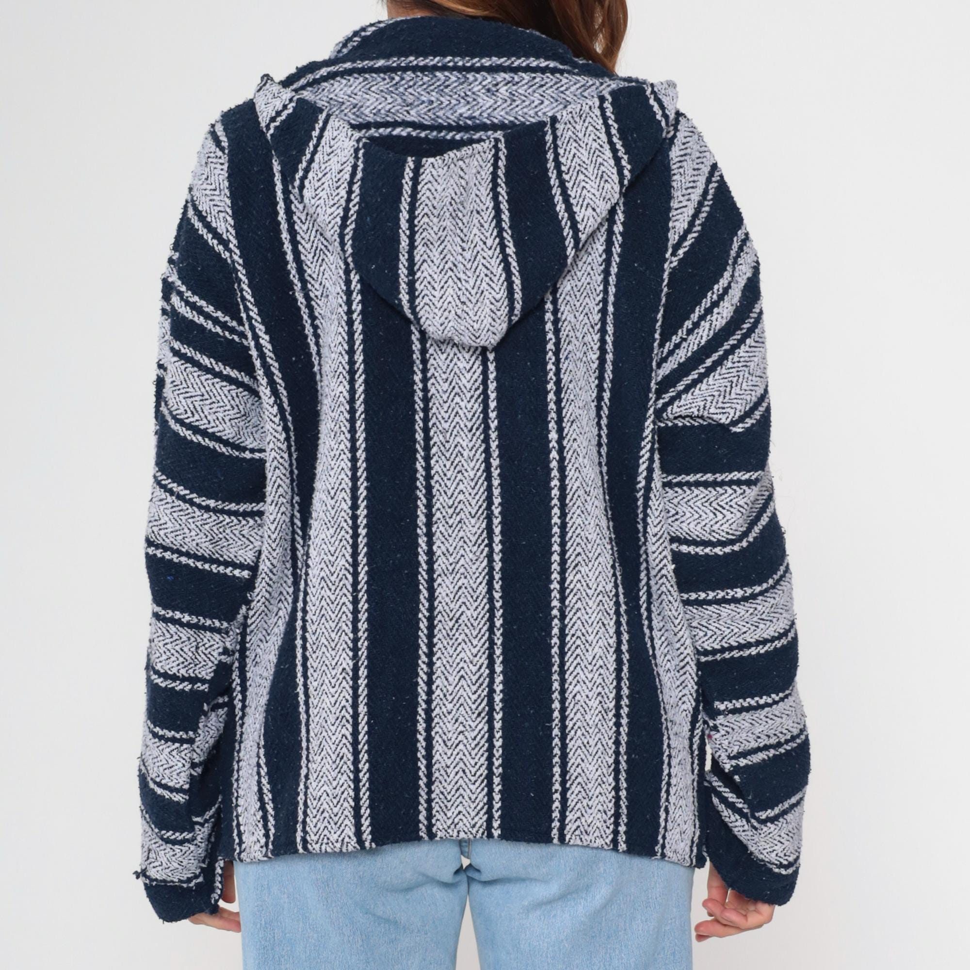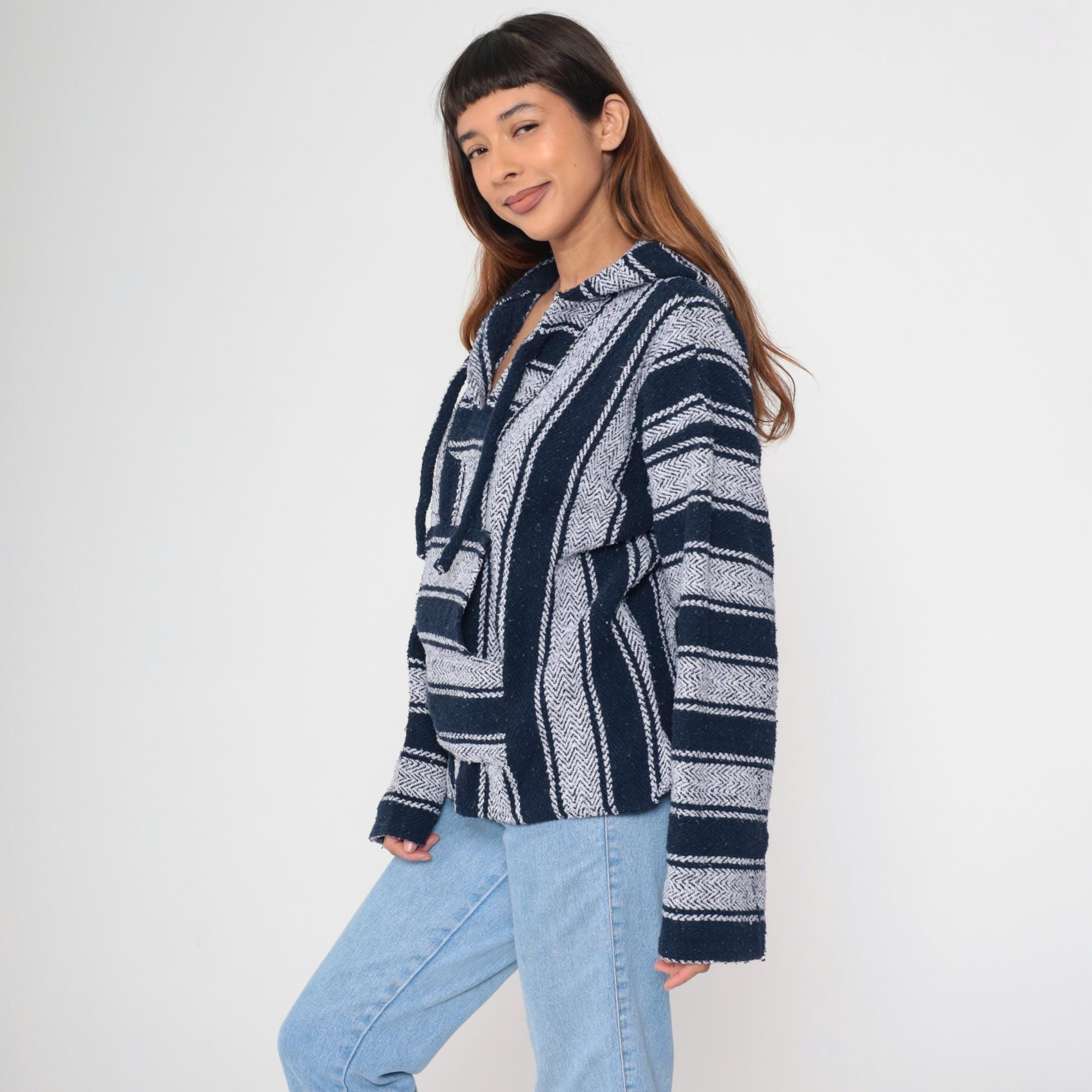 Vintage 00s Mexican drug rug hoodie sweatshirt in navy blue and white stripes with a kangaroo pocket.