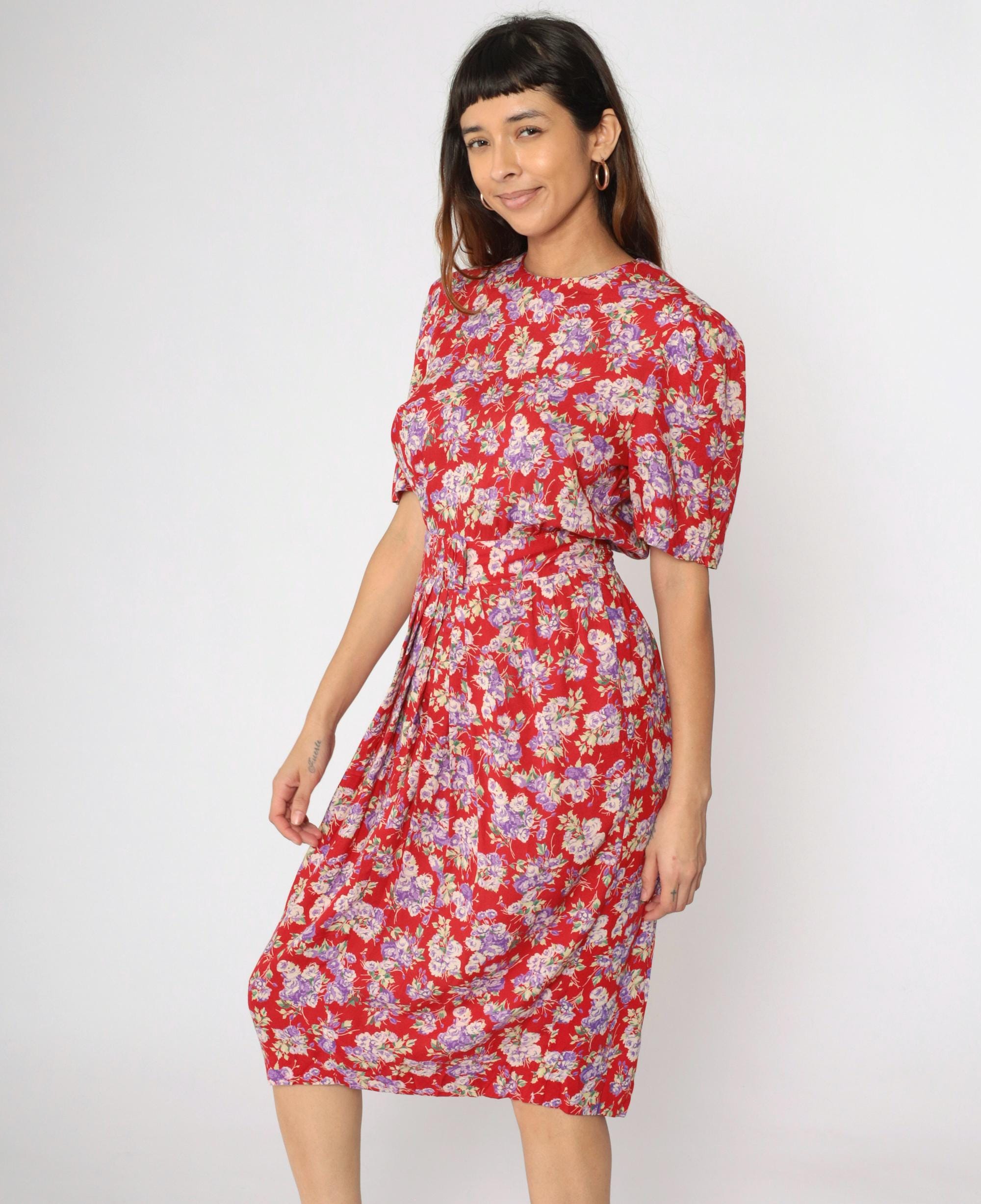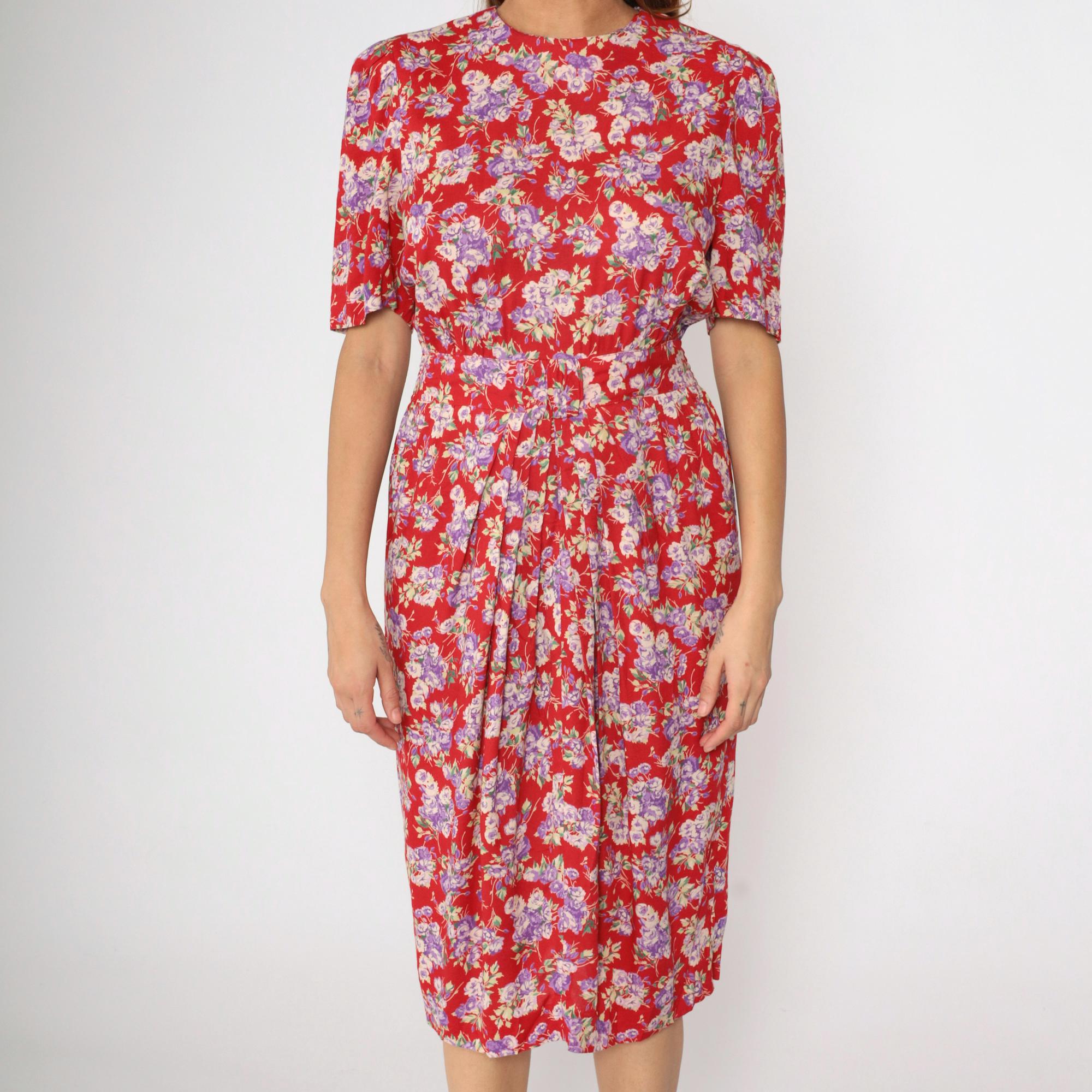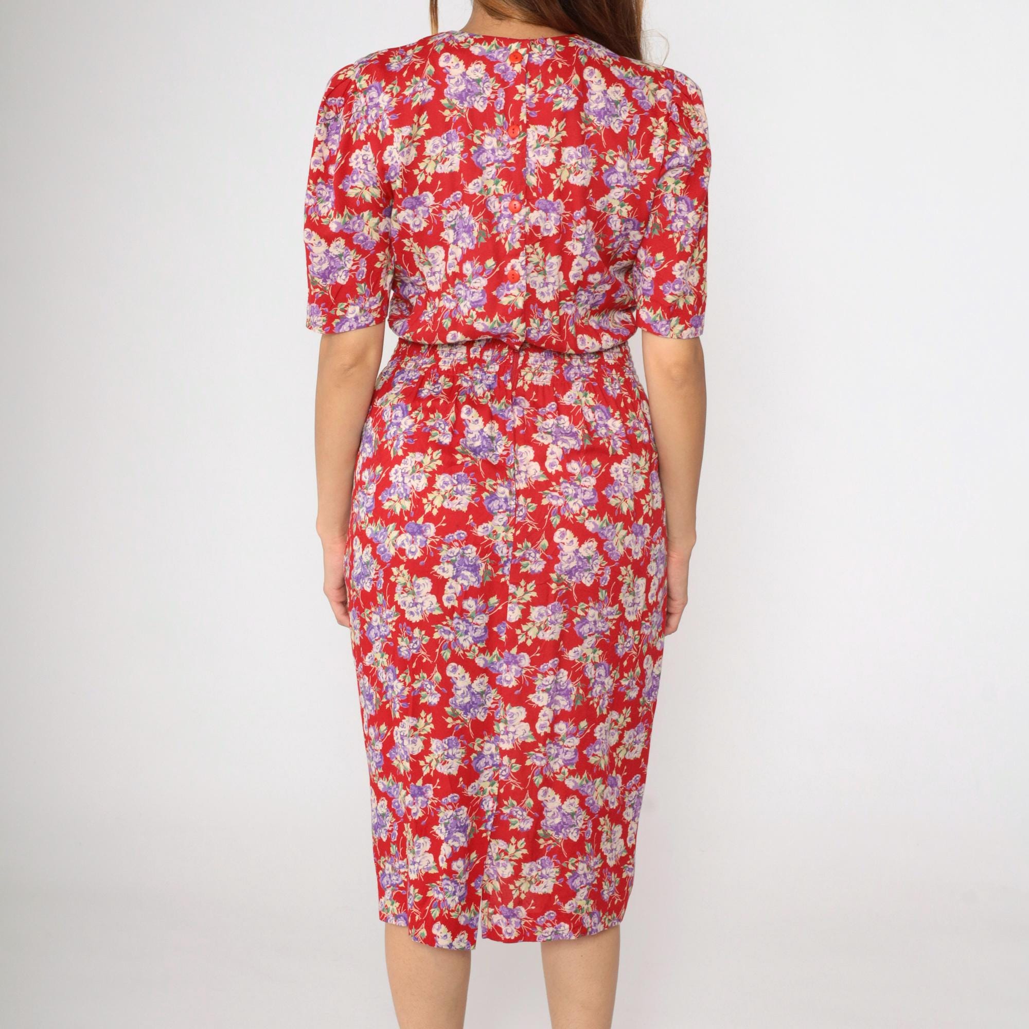 Vintage 90s dress in red with a purple floral print. It features a high smocked elastic waist and short puff sleeves. Midi length, zips up the back.