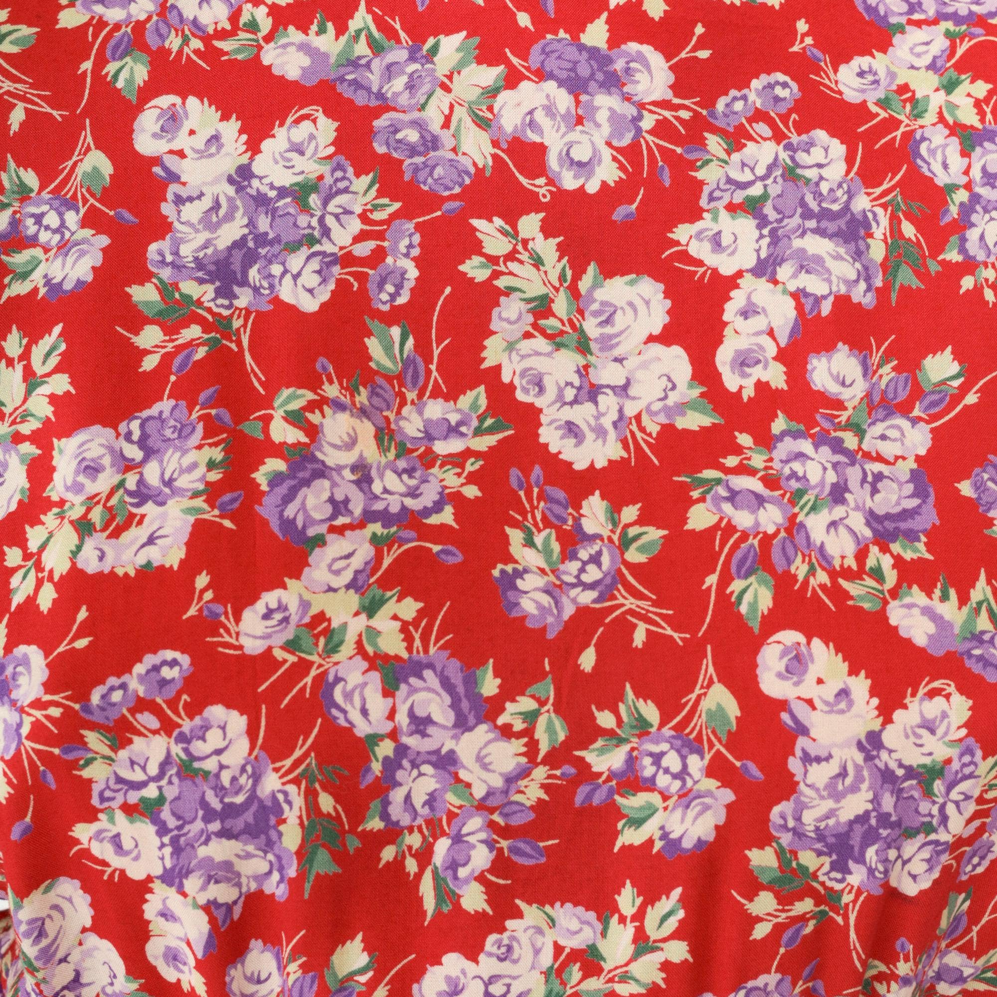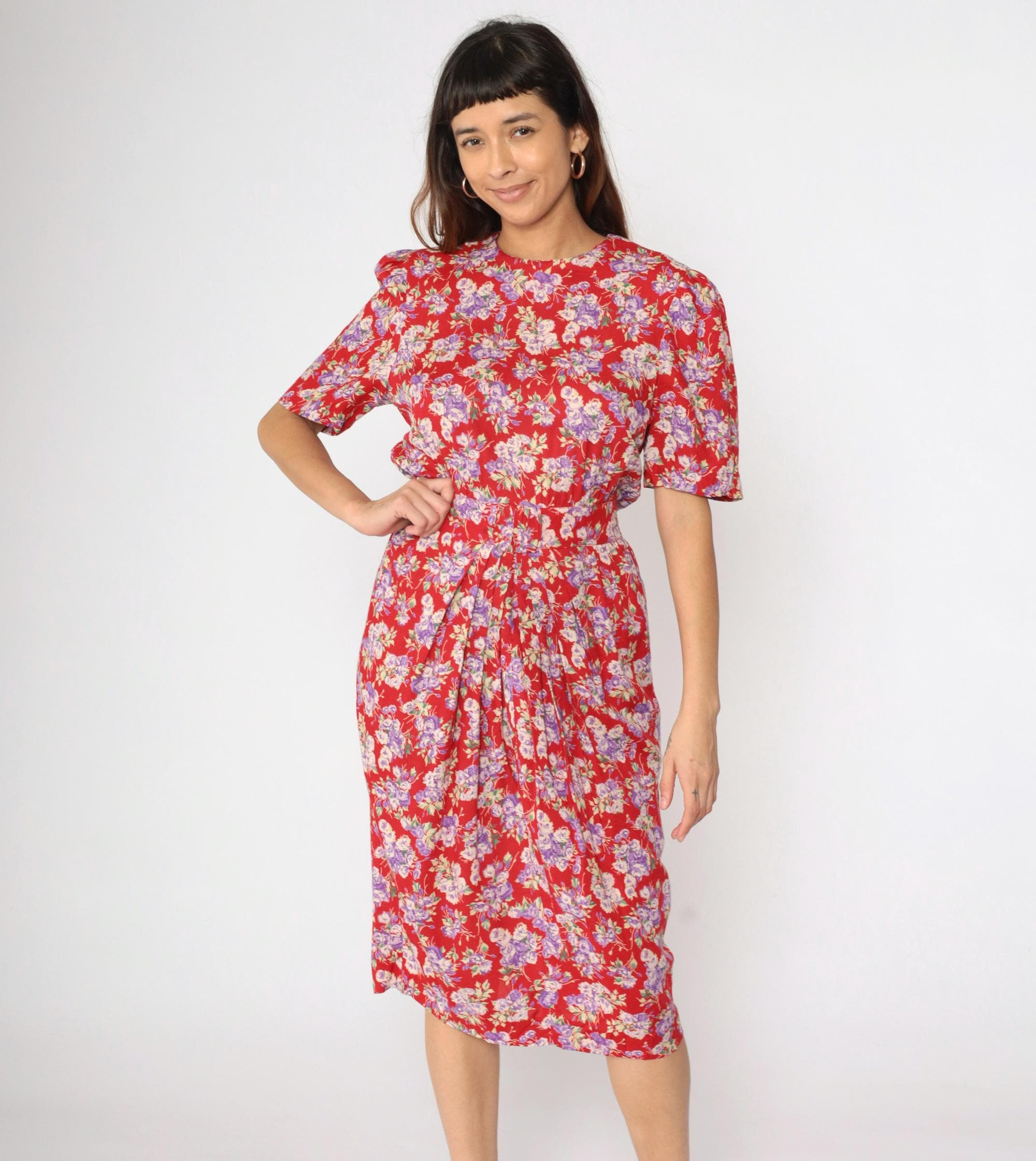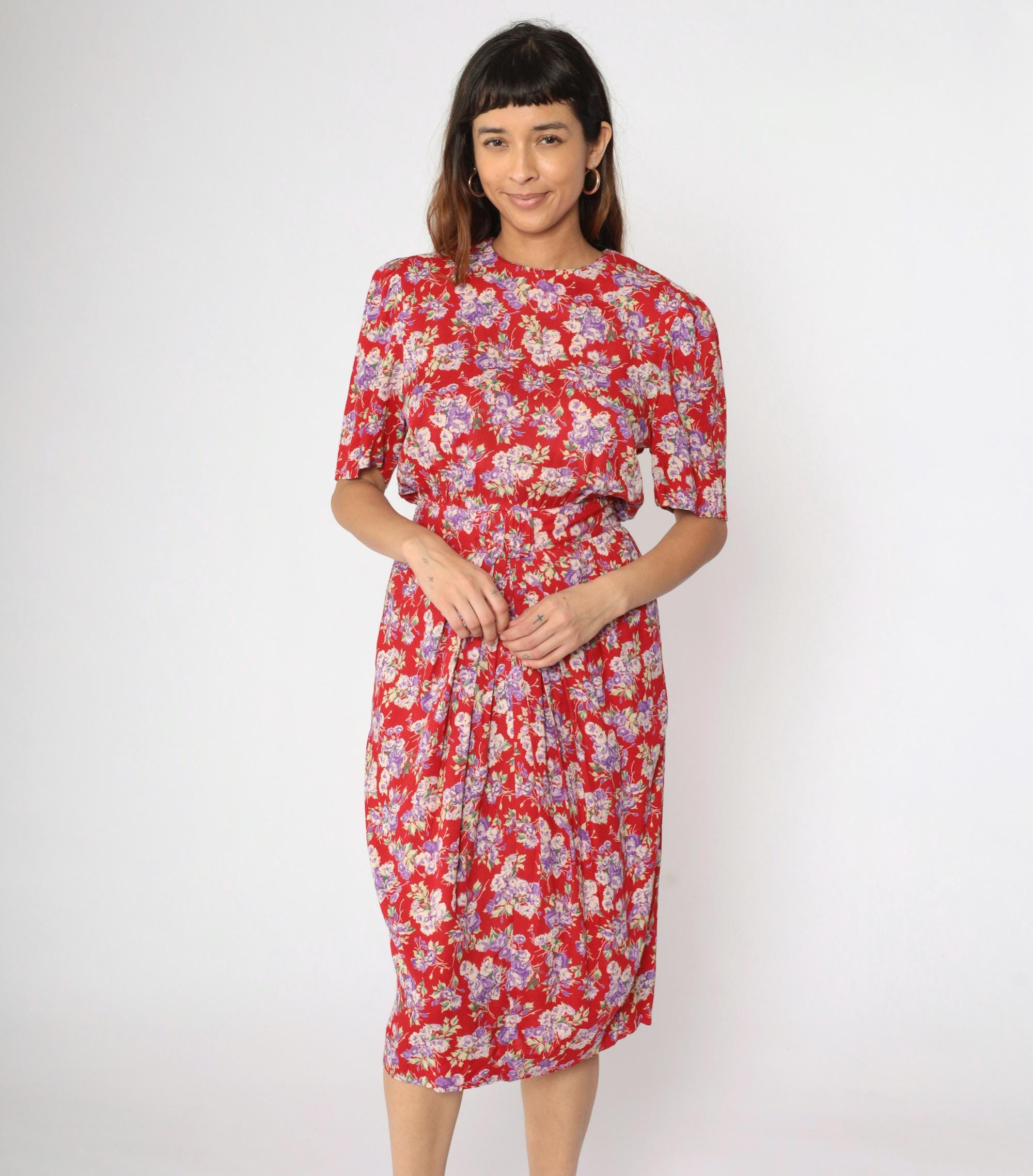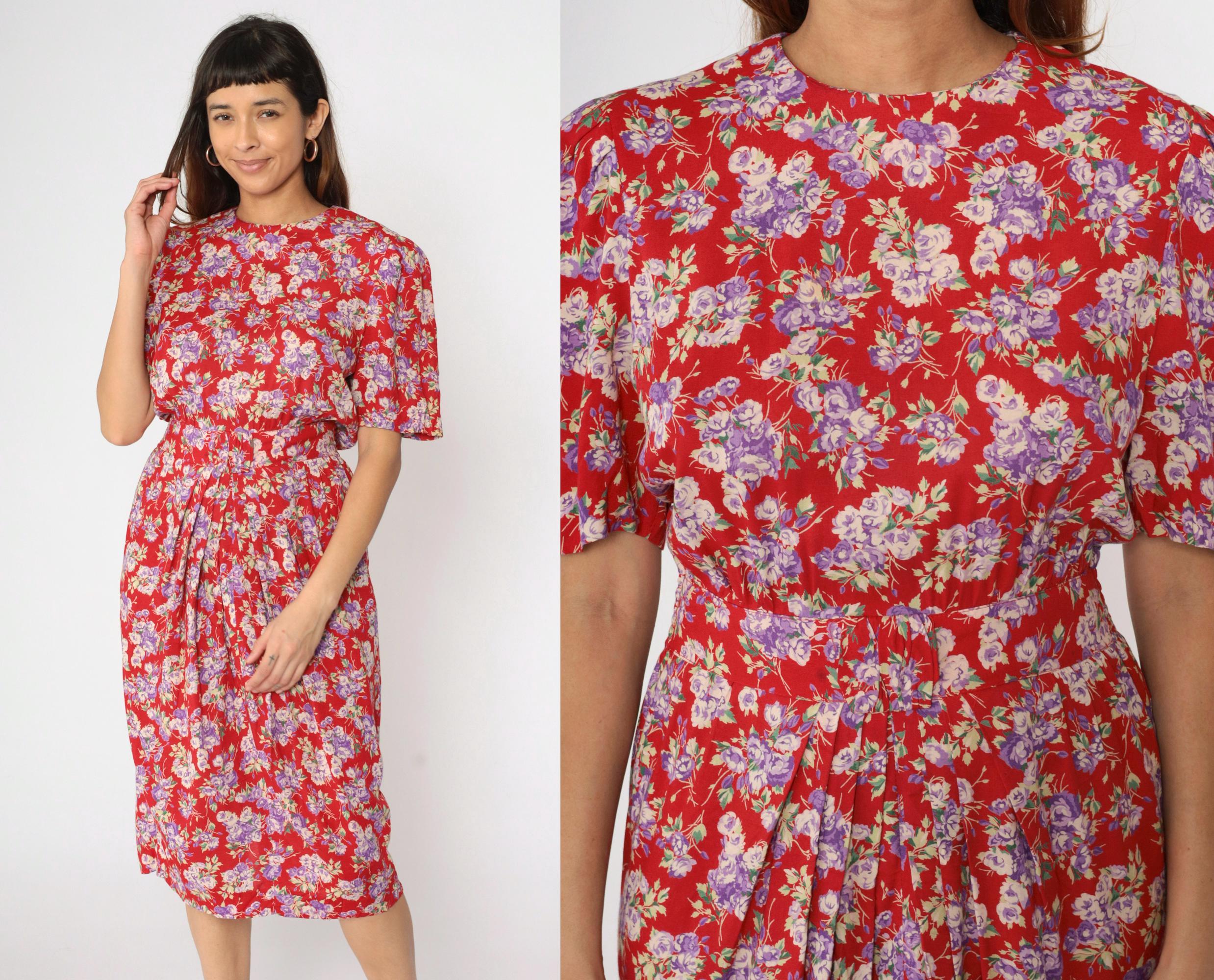 Vintage 90s dress in red with a purple floral print. It features a high smocked elastic waist and short puff sleeves. Midi length, zips up the back.