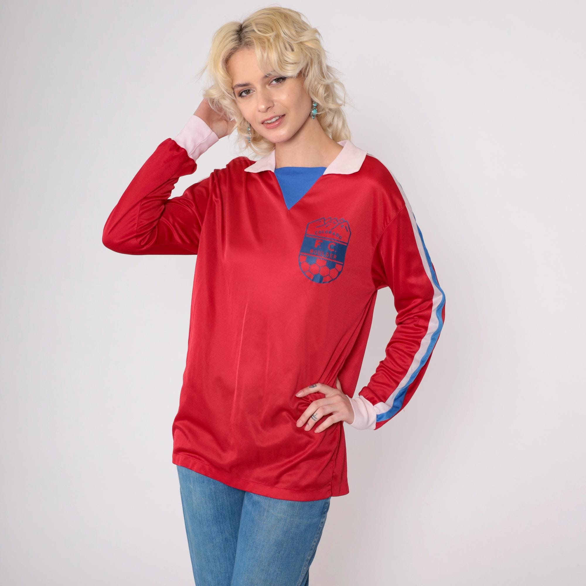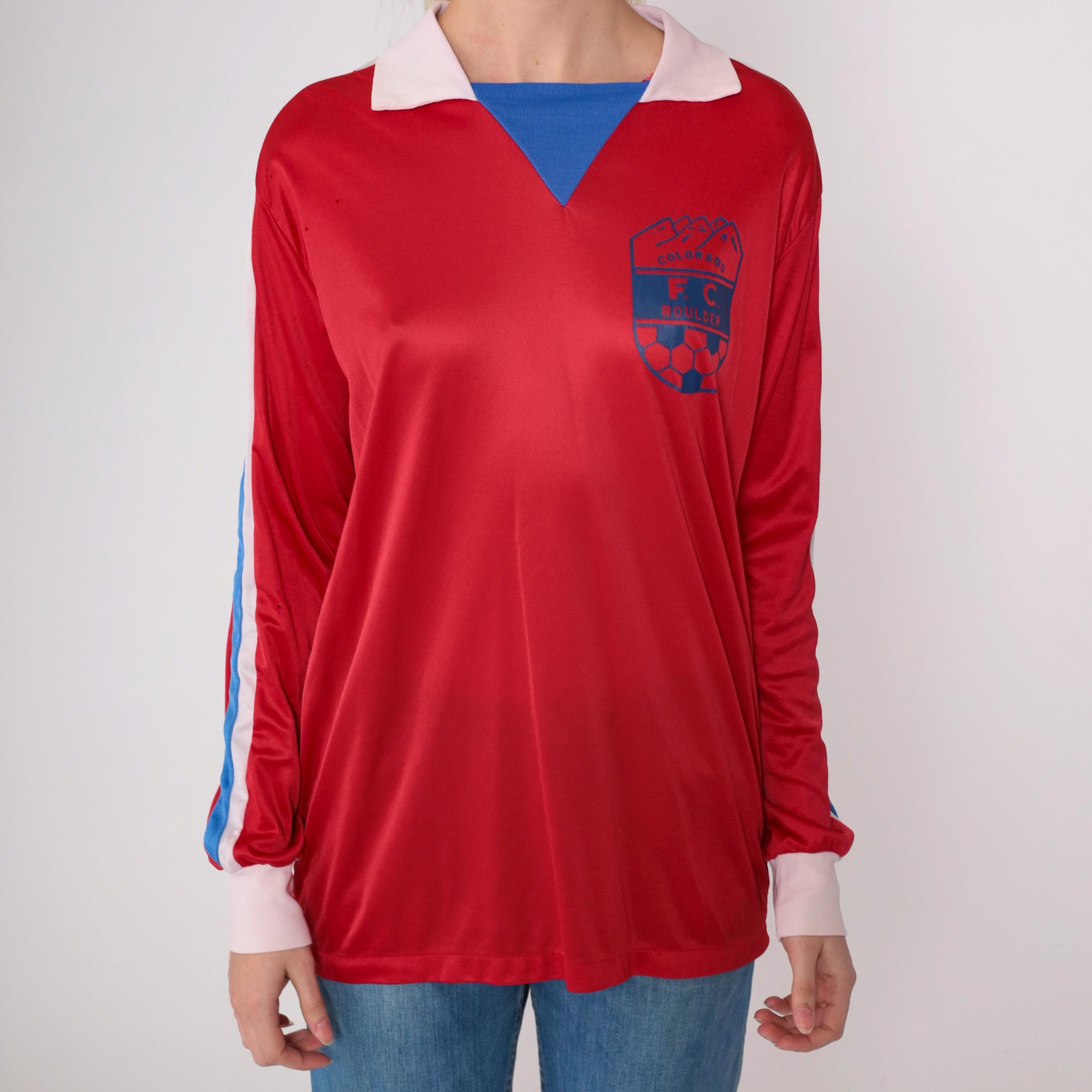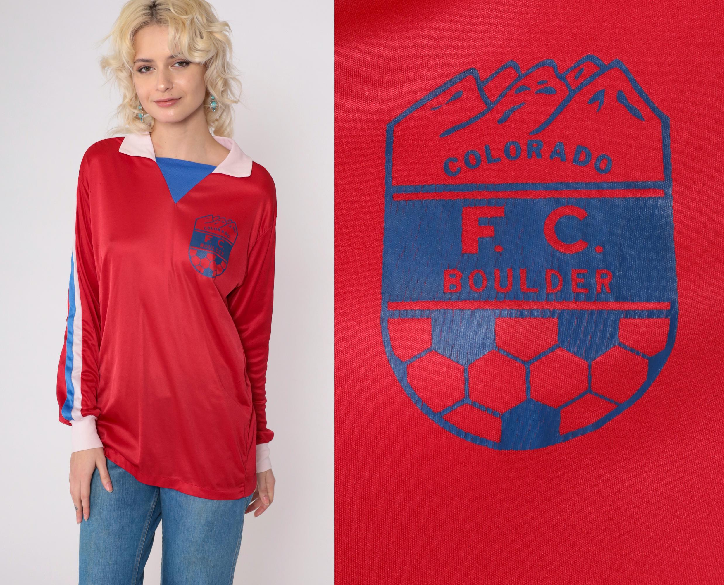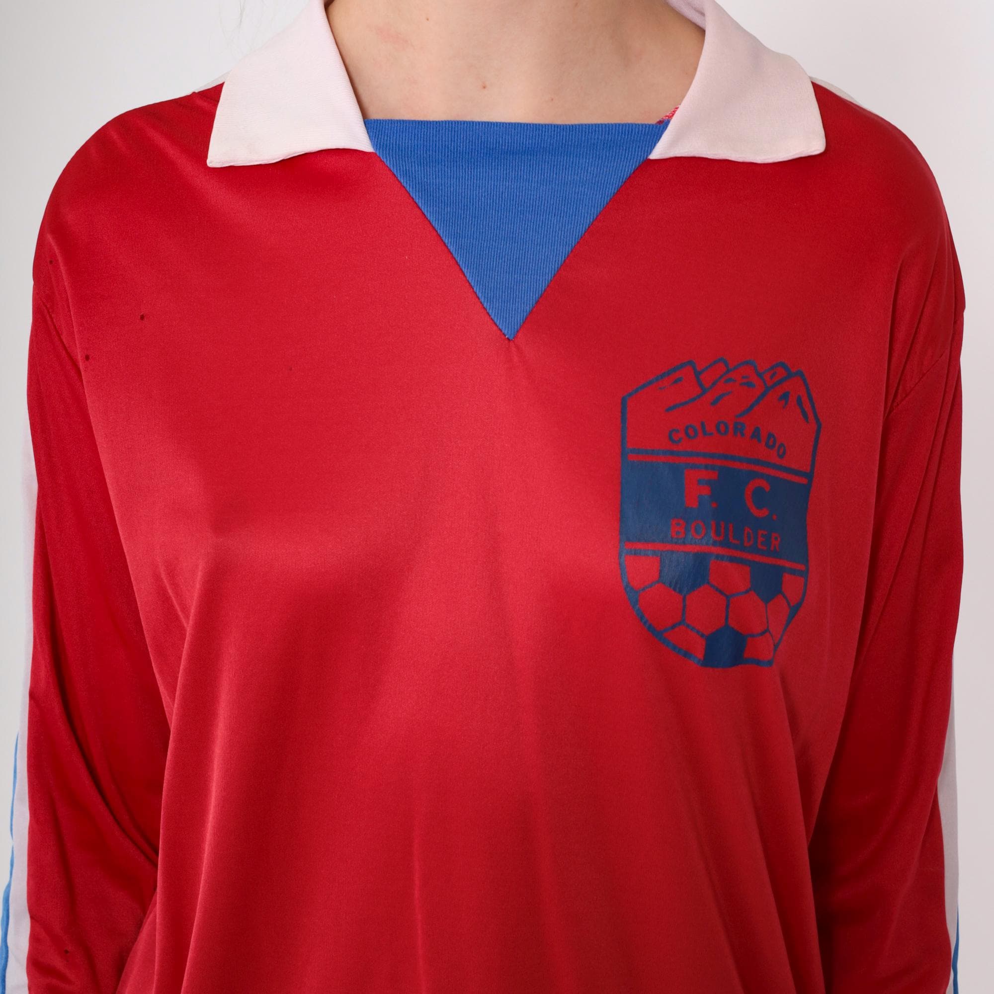 Vintage long sleeve soccer jersey from Colorado FC Boulder, featuring a red base with contrasting blue and white stripe details on the sleeves. The jersey has a classic v-neck with a white collar and the team's emblem printed on the chest.