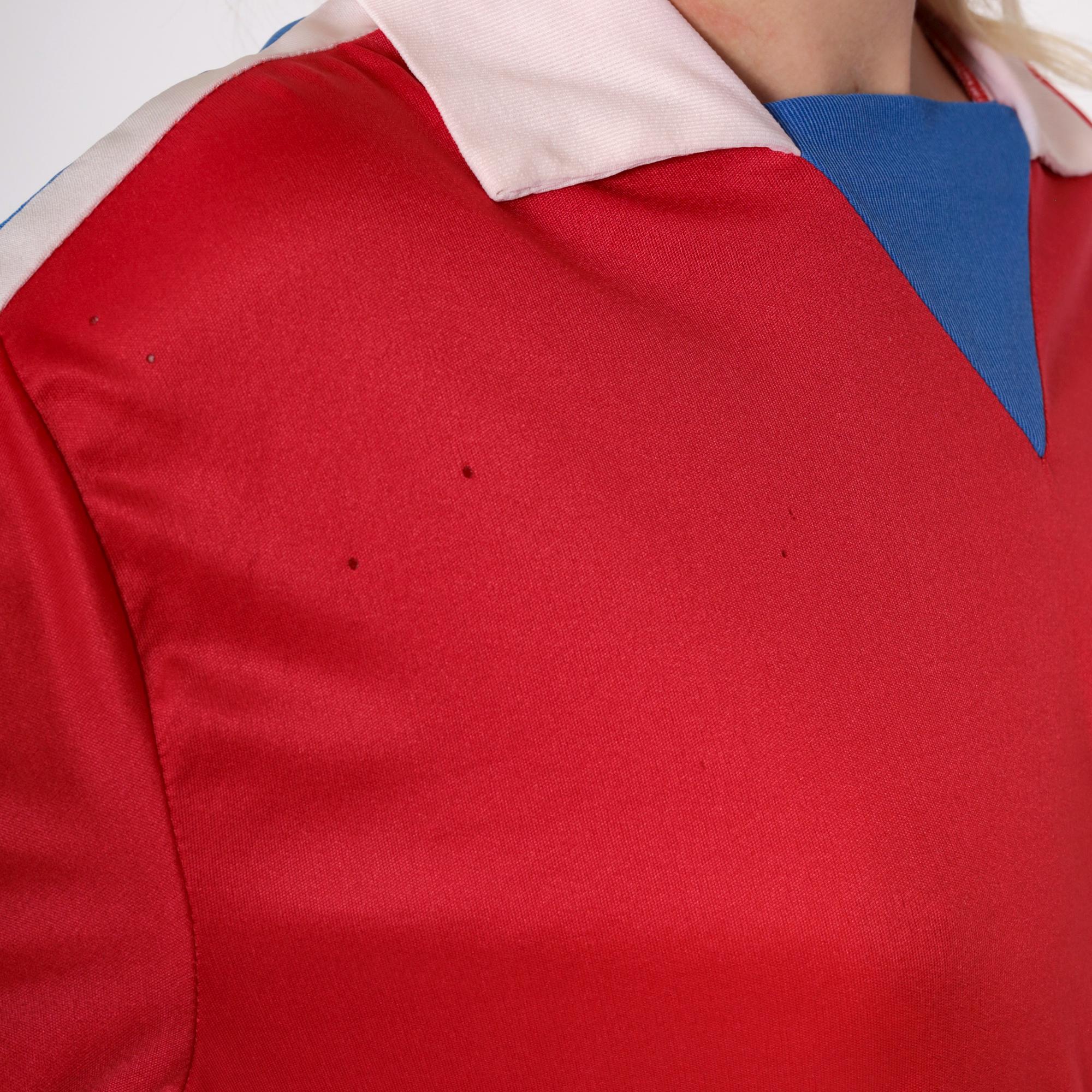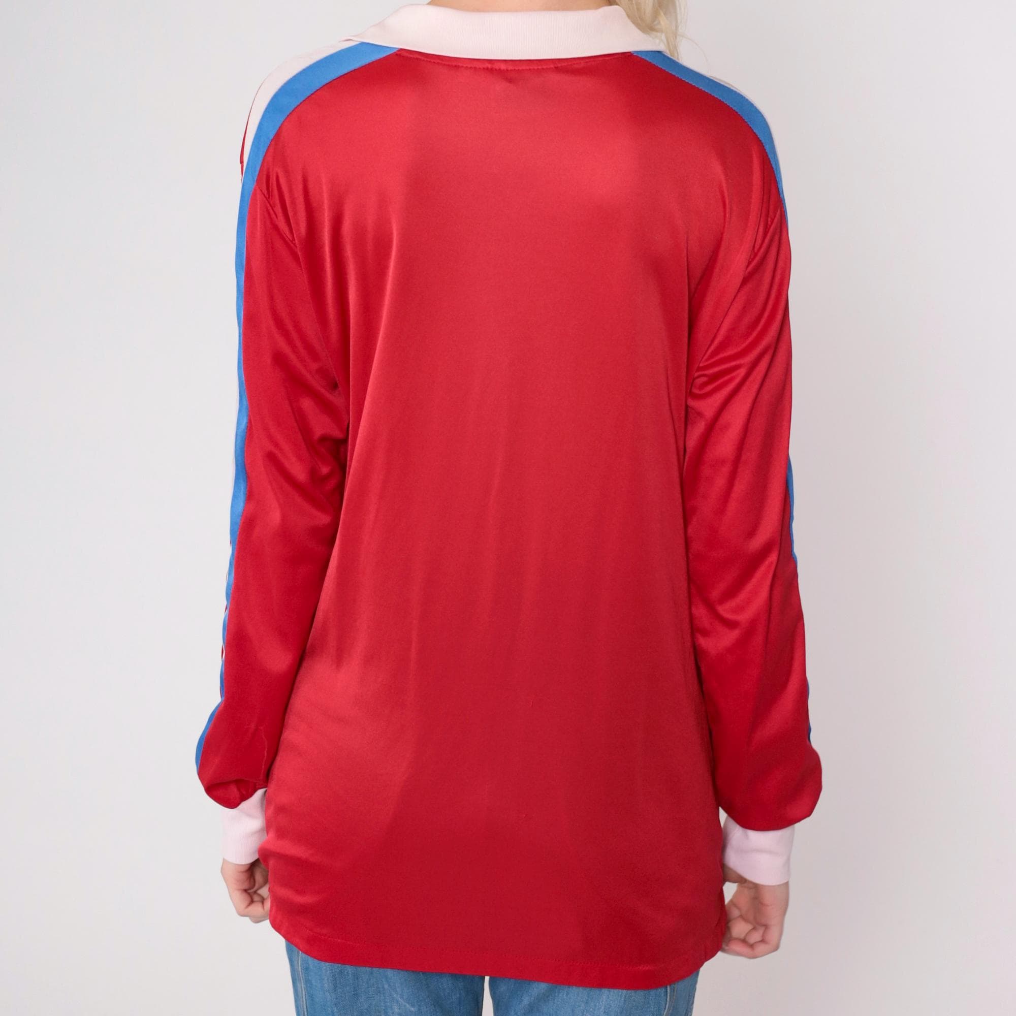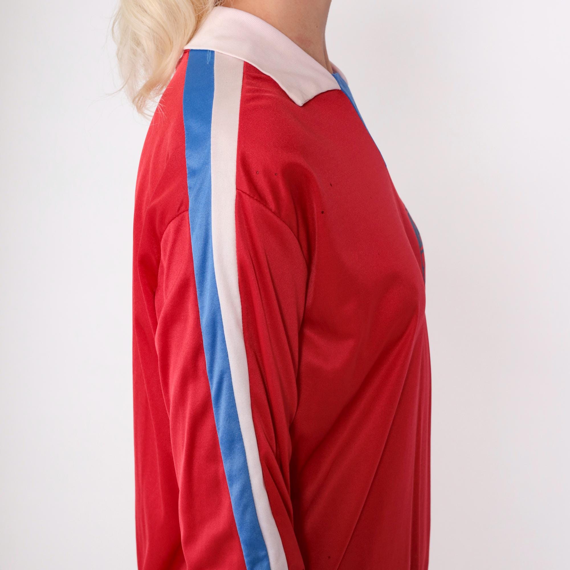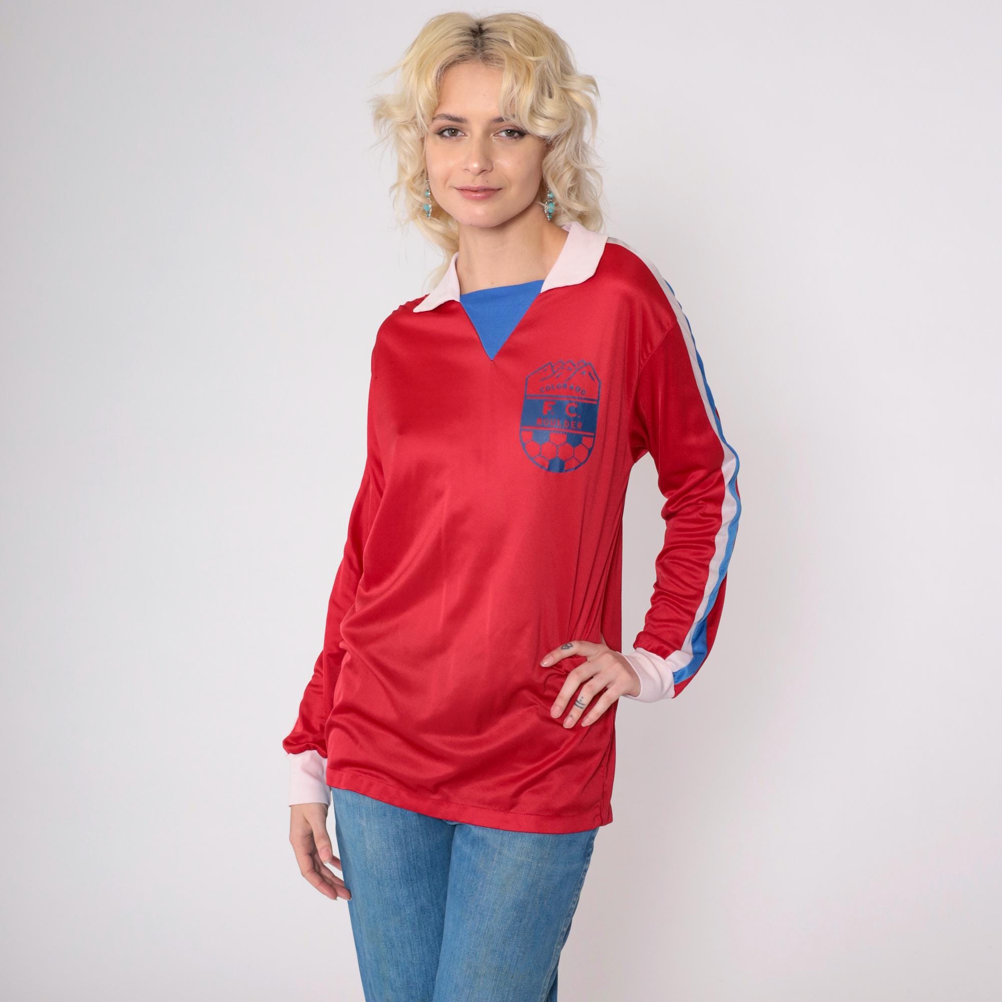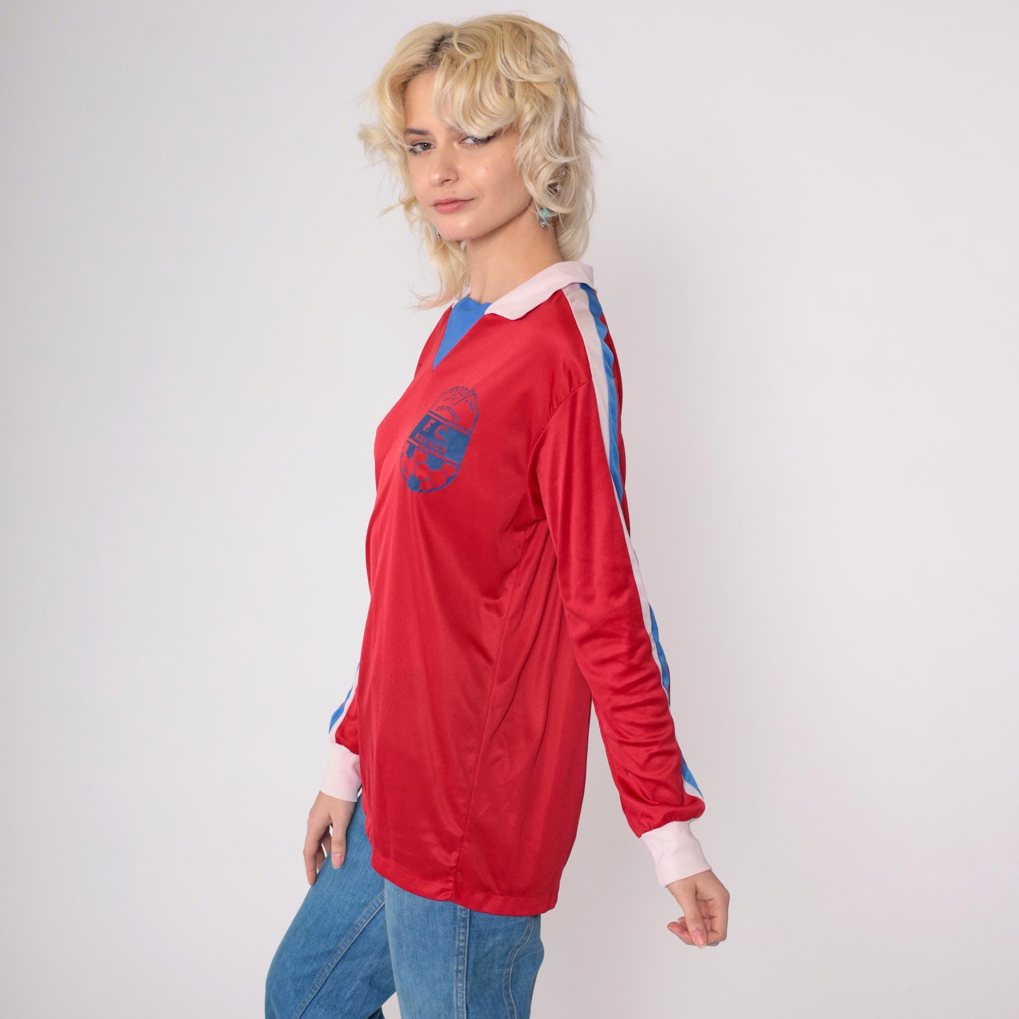 Vintage long sleeve soccer jersey from Colorado FC Boulder, featuring a red base with contrasting blue and white stripe details on the sleeves. The jersey has a classic v-neck with a white collar and the team's emblem printed on the chest.