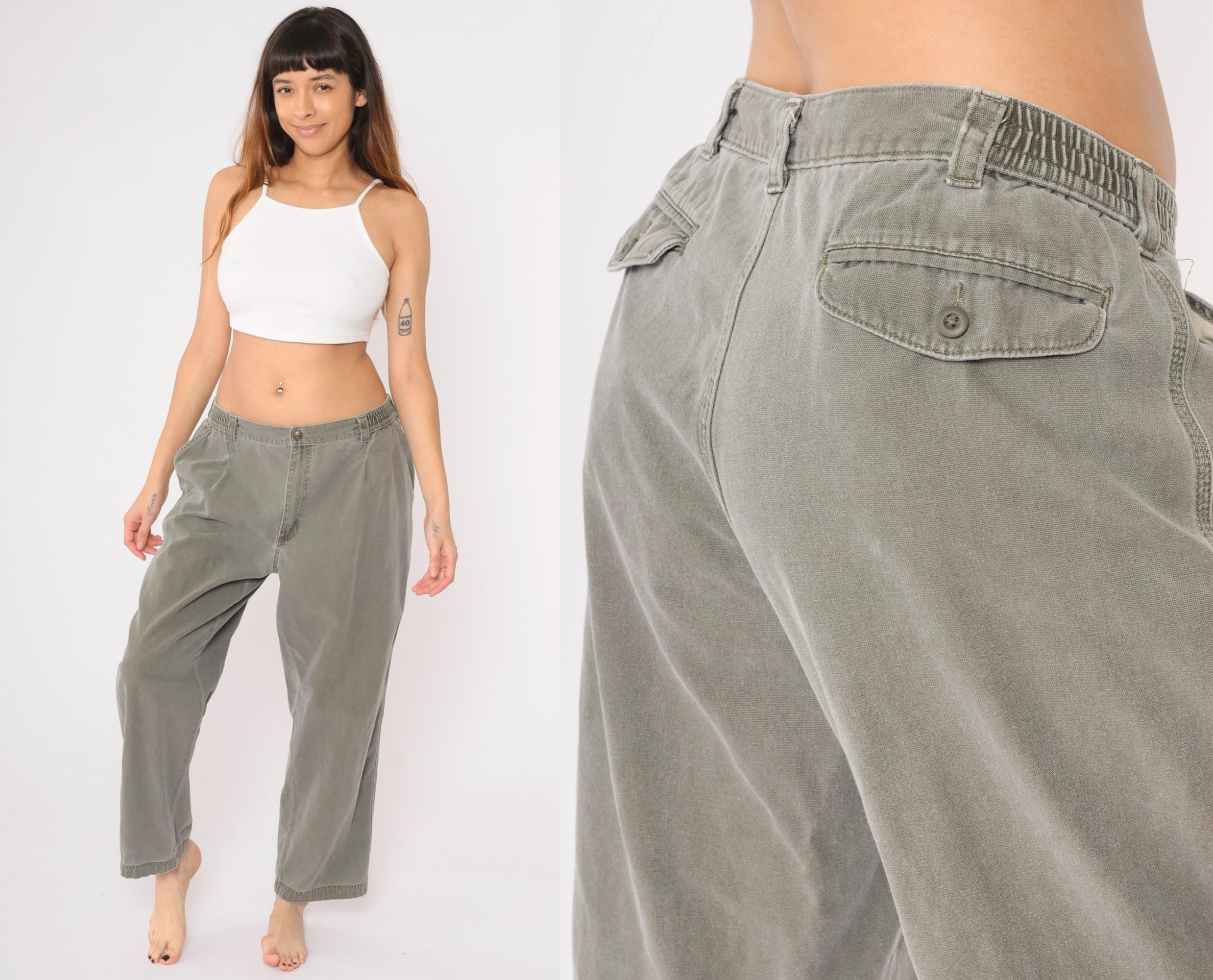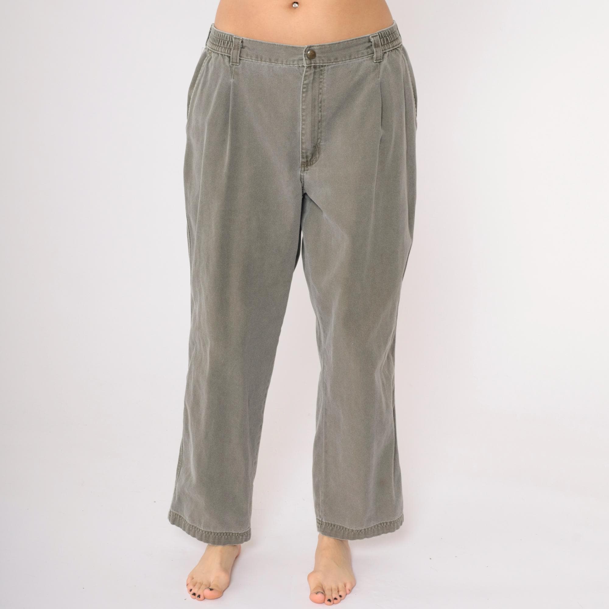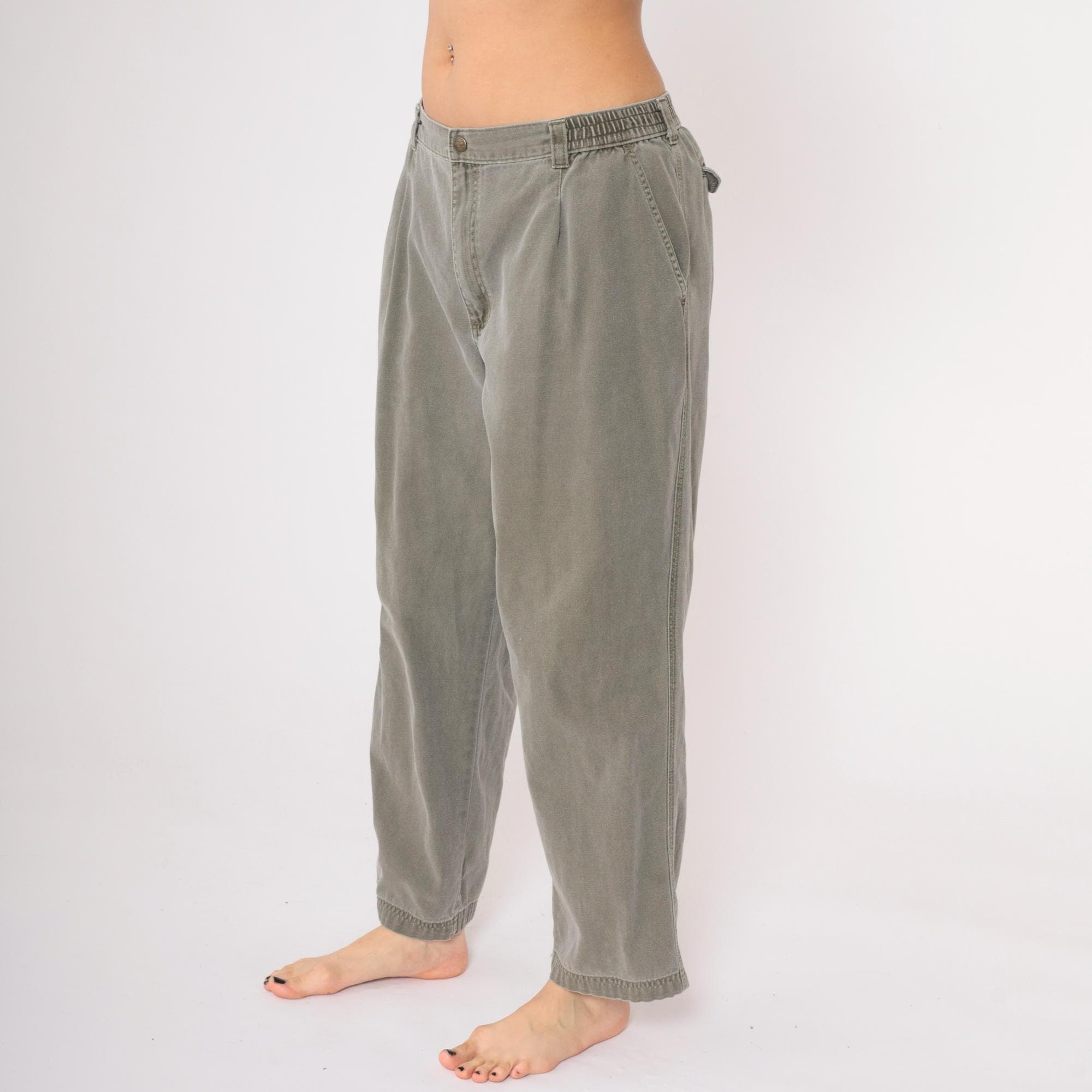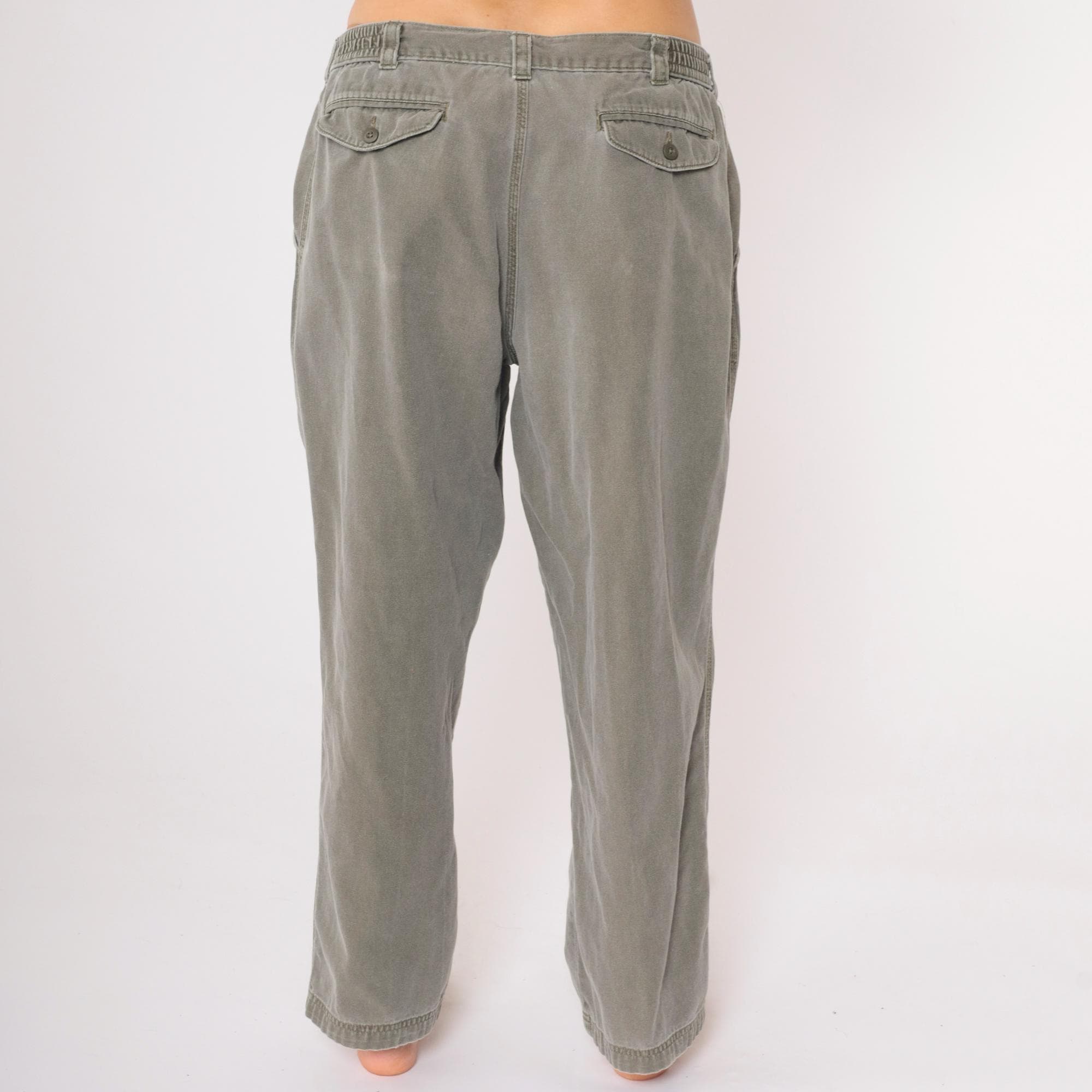Vintage 90s LL Bean pants in olive with a high waist and pleats. They have a relaxed fit with elastic at the sides of the waist.