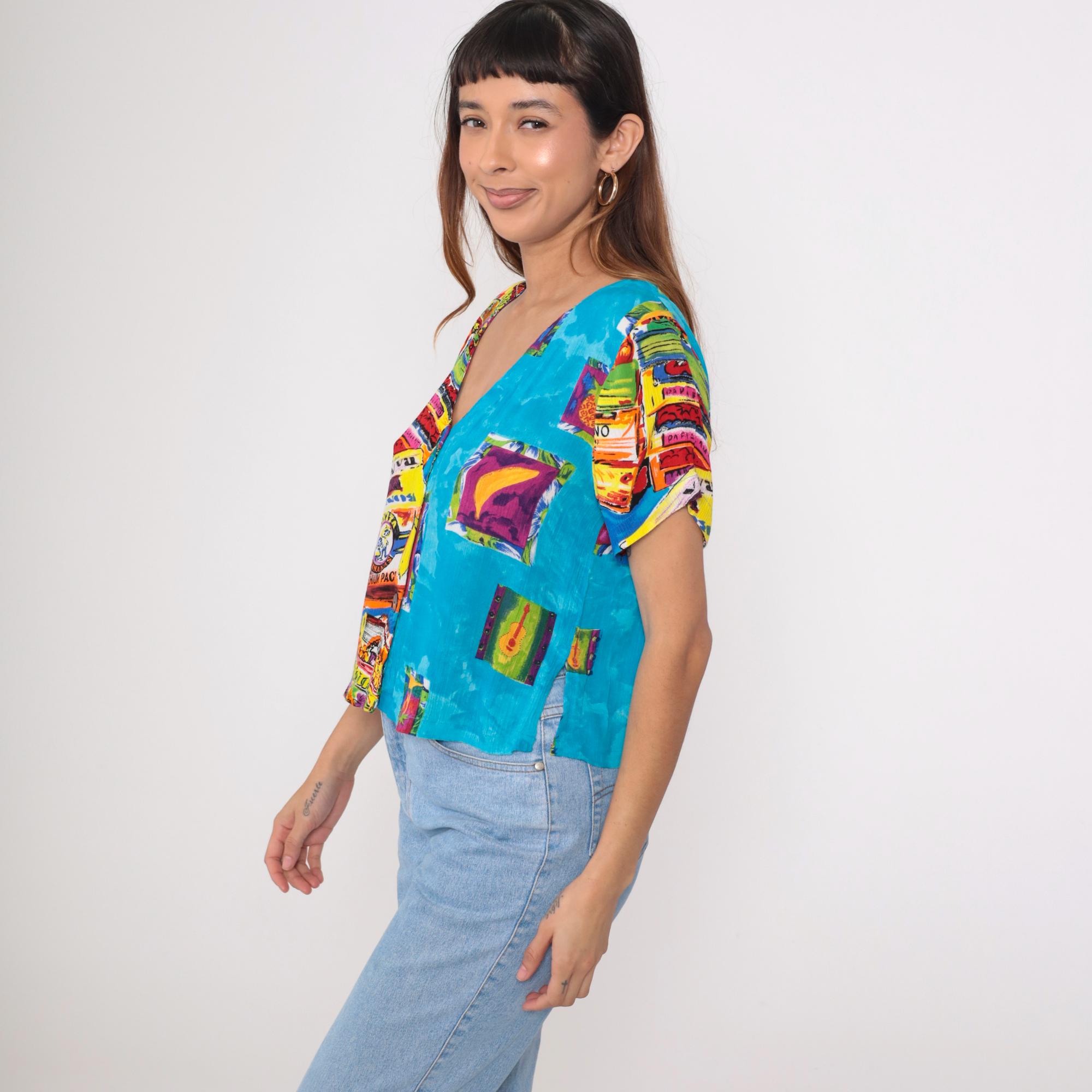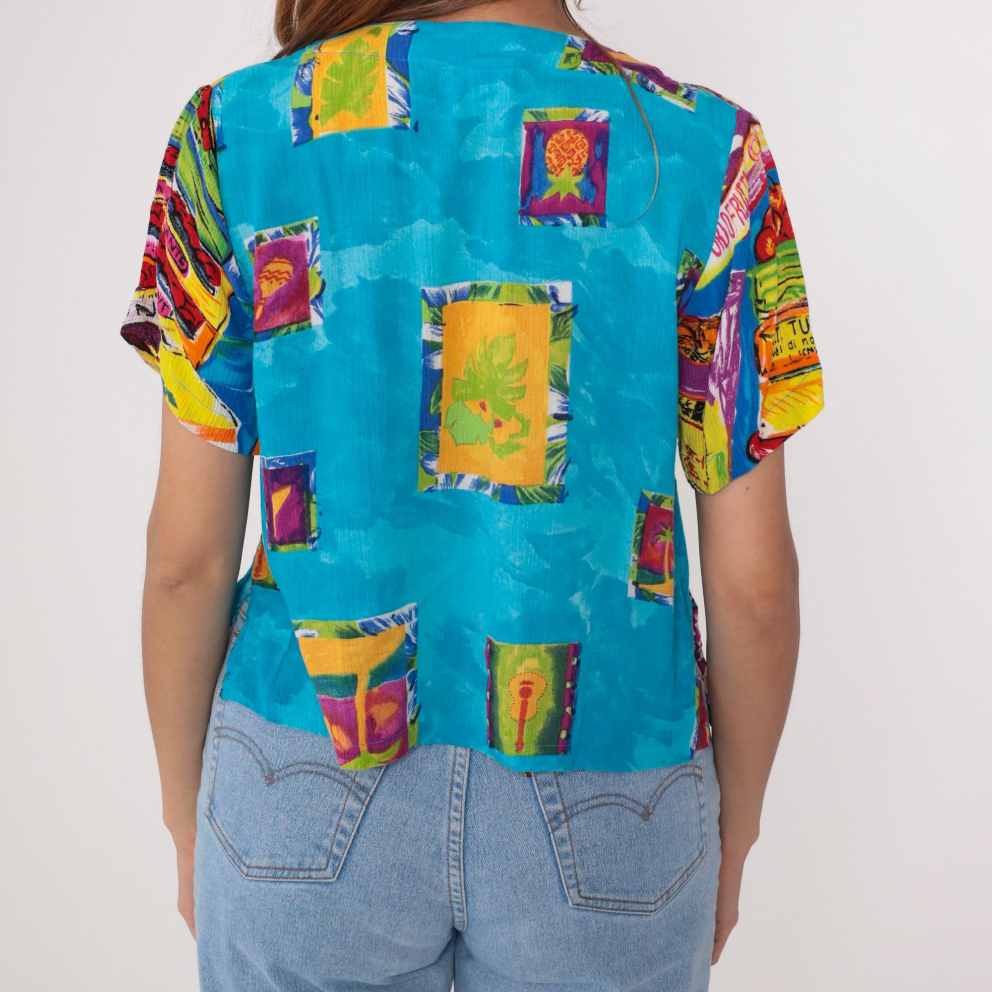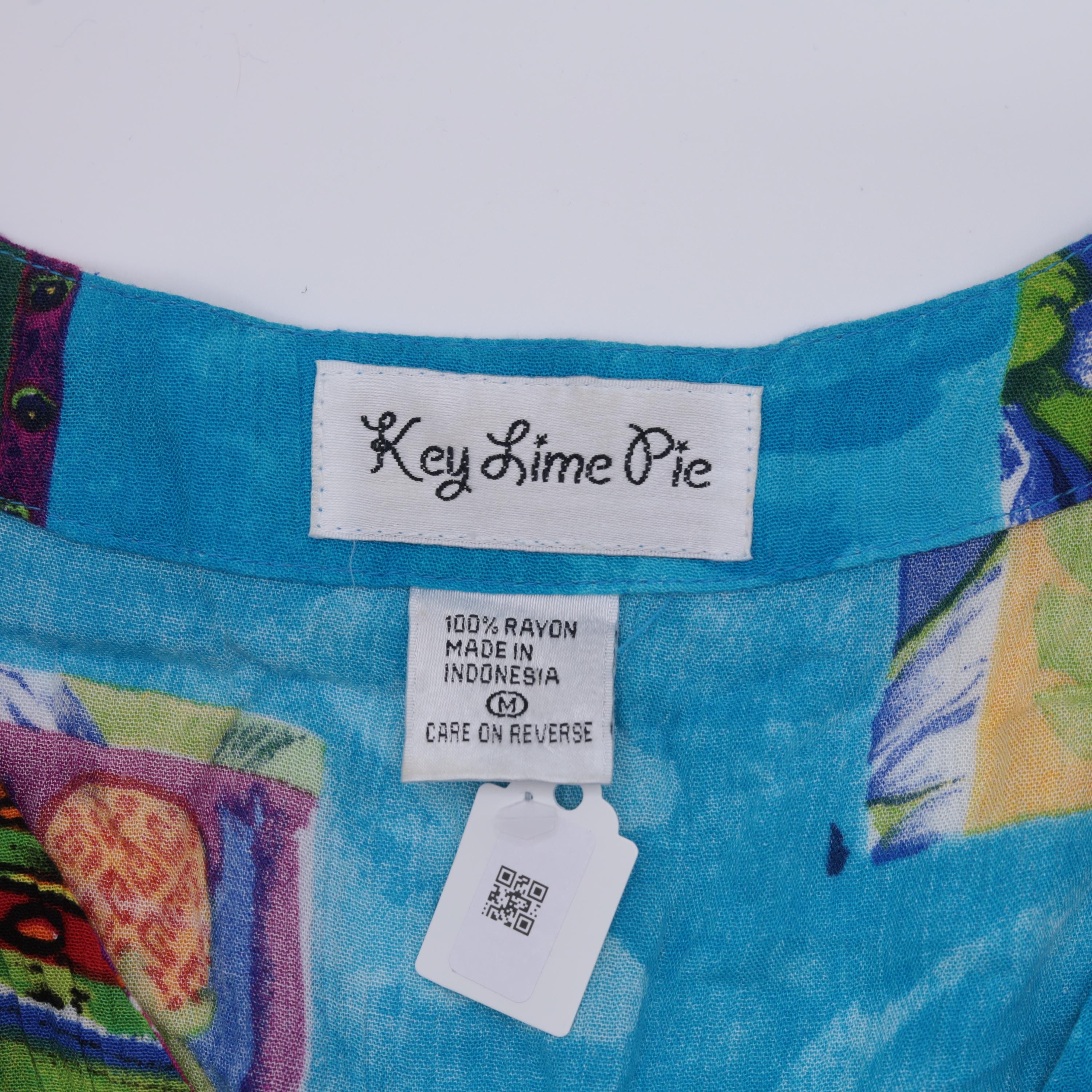 This vintage 90s Key Lime Pie shirt features a vibrant and playful tropical print, including pineapples, bananas, palm trees, and guitars. Made from lightweight rayon, it has a relaxed fit, V-neckline, and button-up front.
