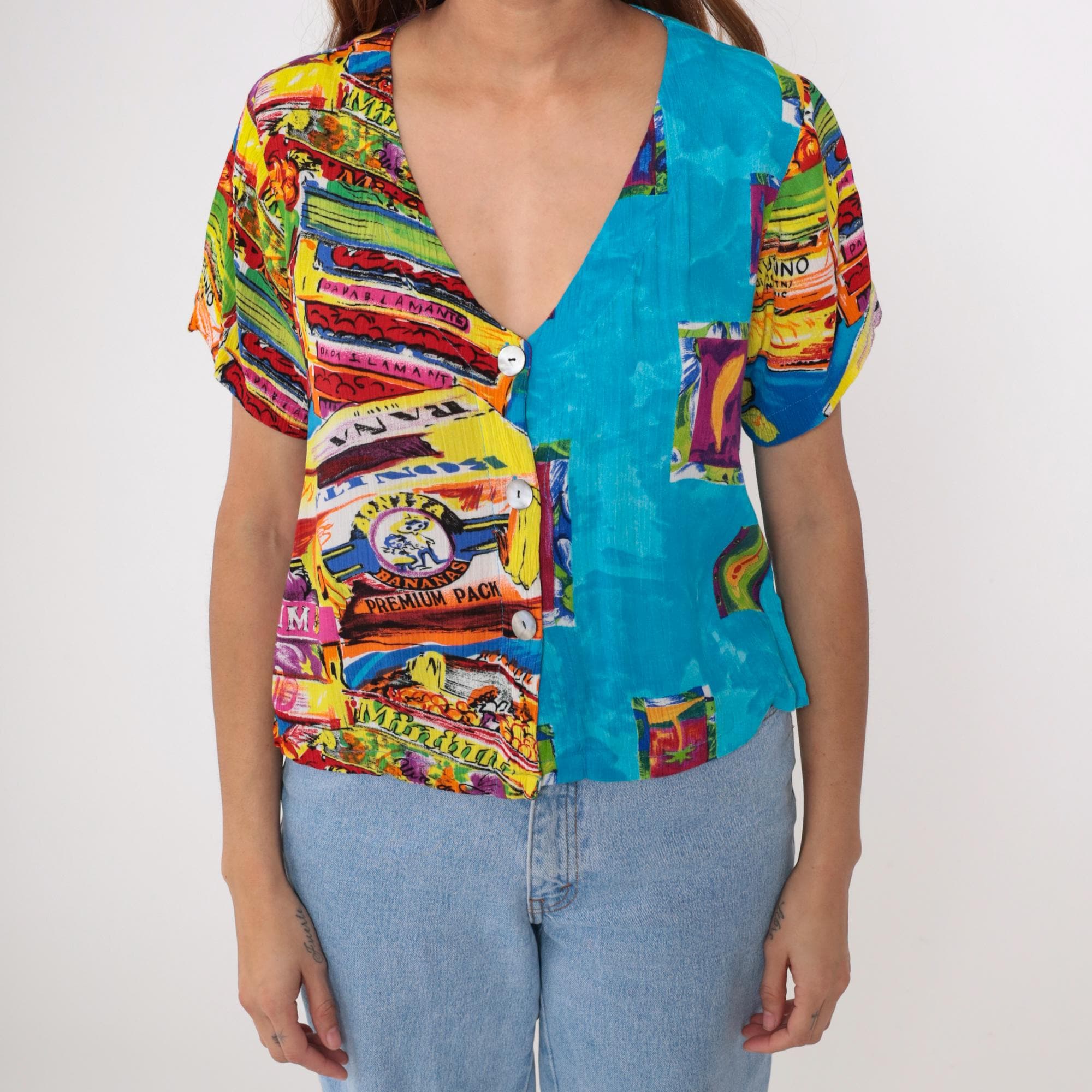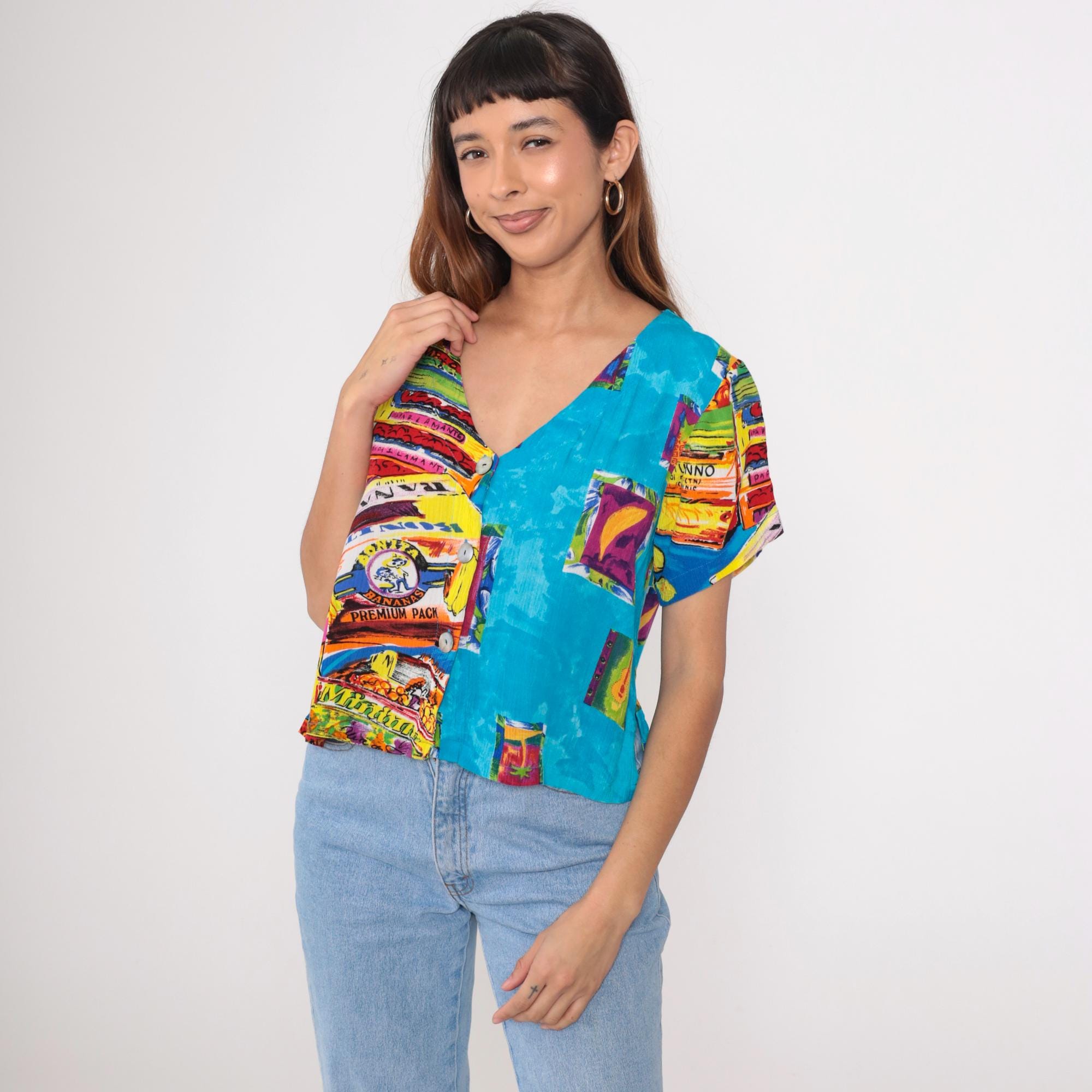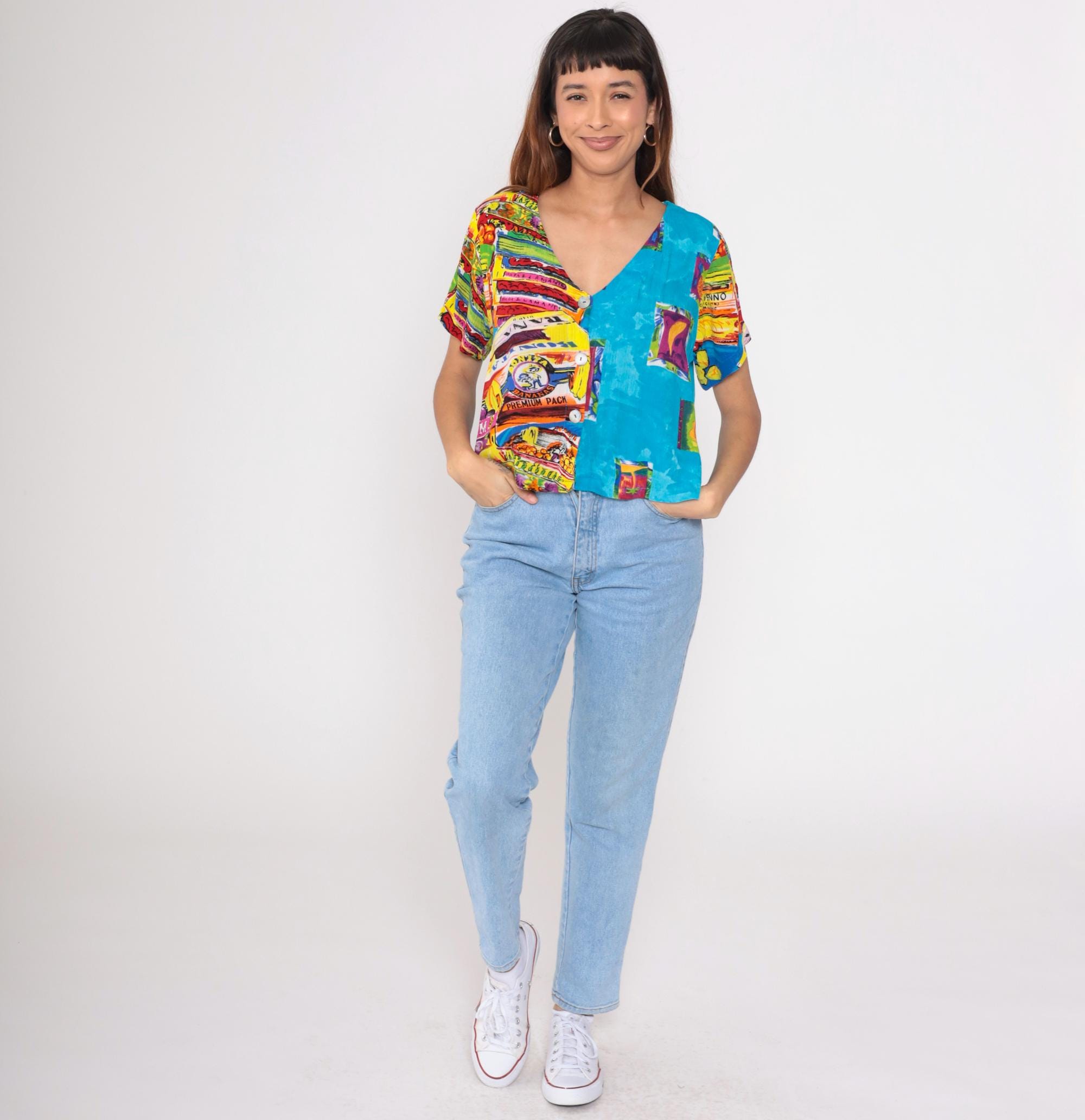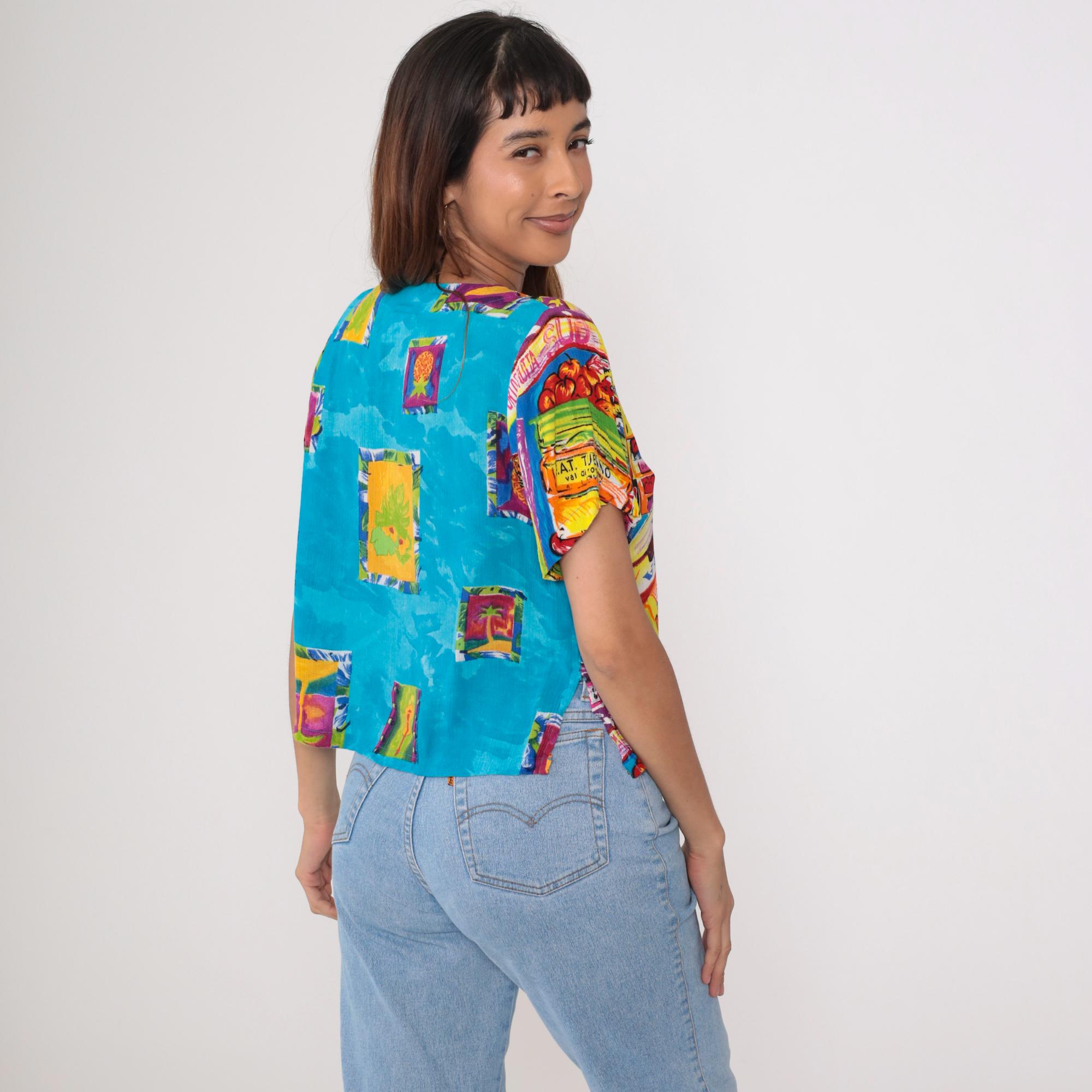 This vintage 90s Key Lime Pie shirt features a vibrant and playful tropical print, including pineapples, bananas, palm trees, and guitars. Made from lightweight rayon, it has a relaxed fit, V-neckline, and button-up front.