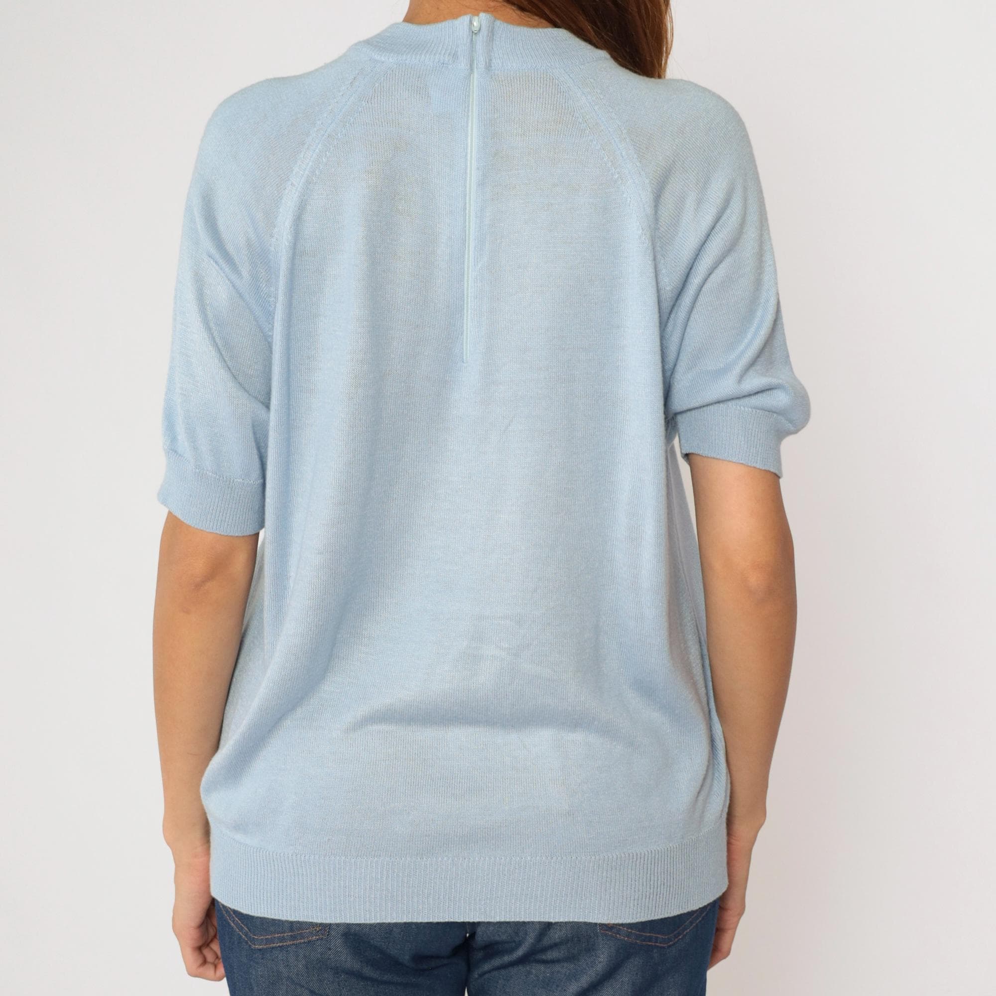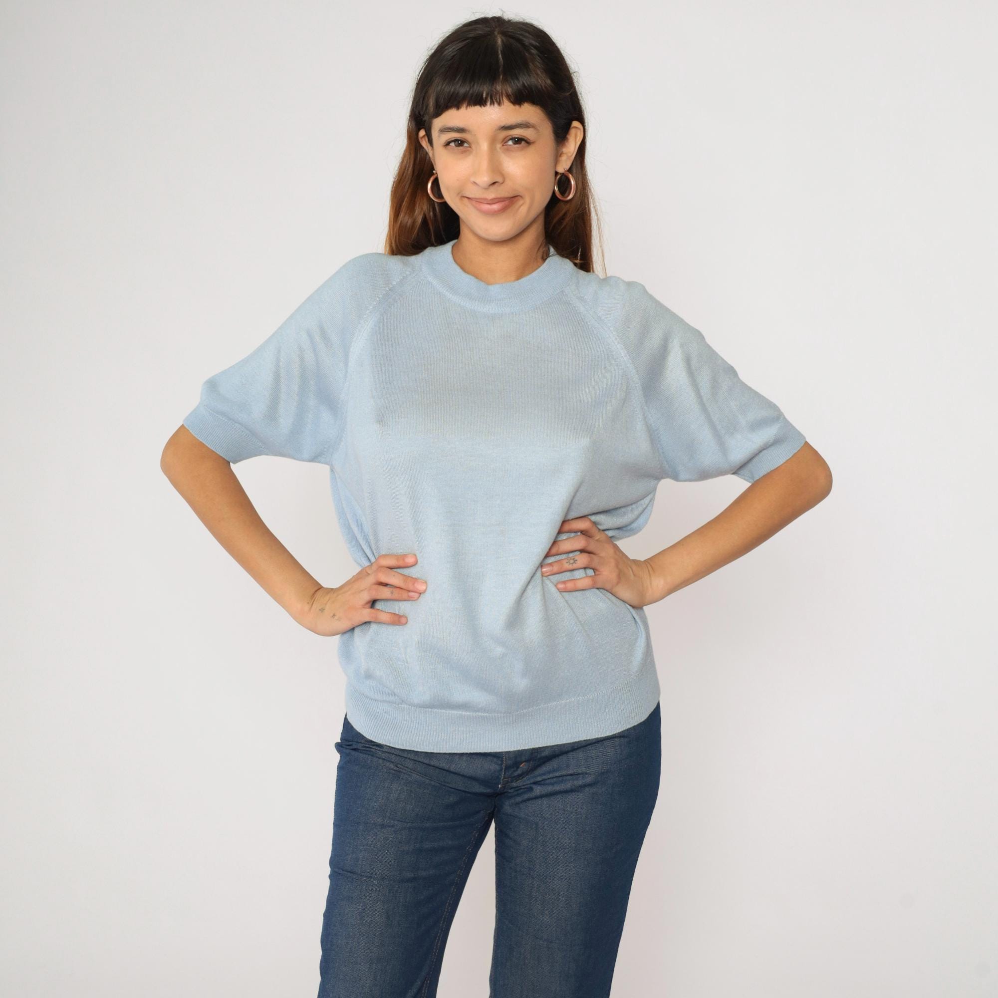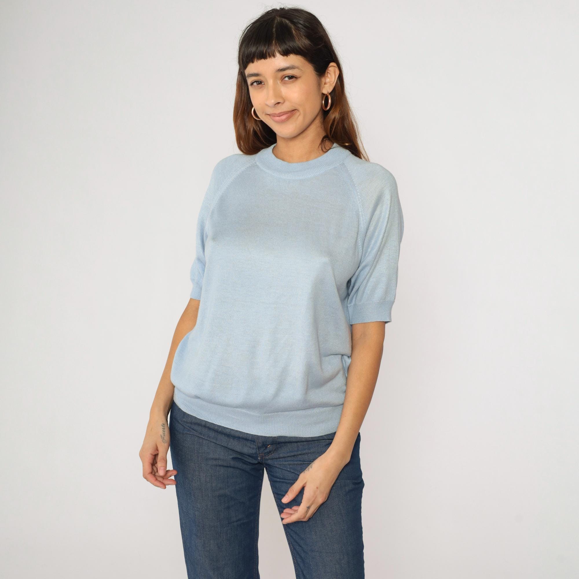 Vintage 80s 90s knit top in blue with short raglan sleeves and a rear zipper.