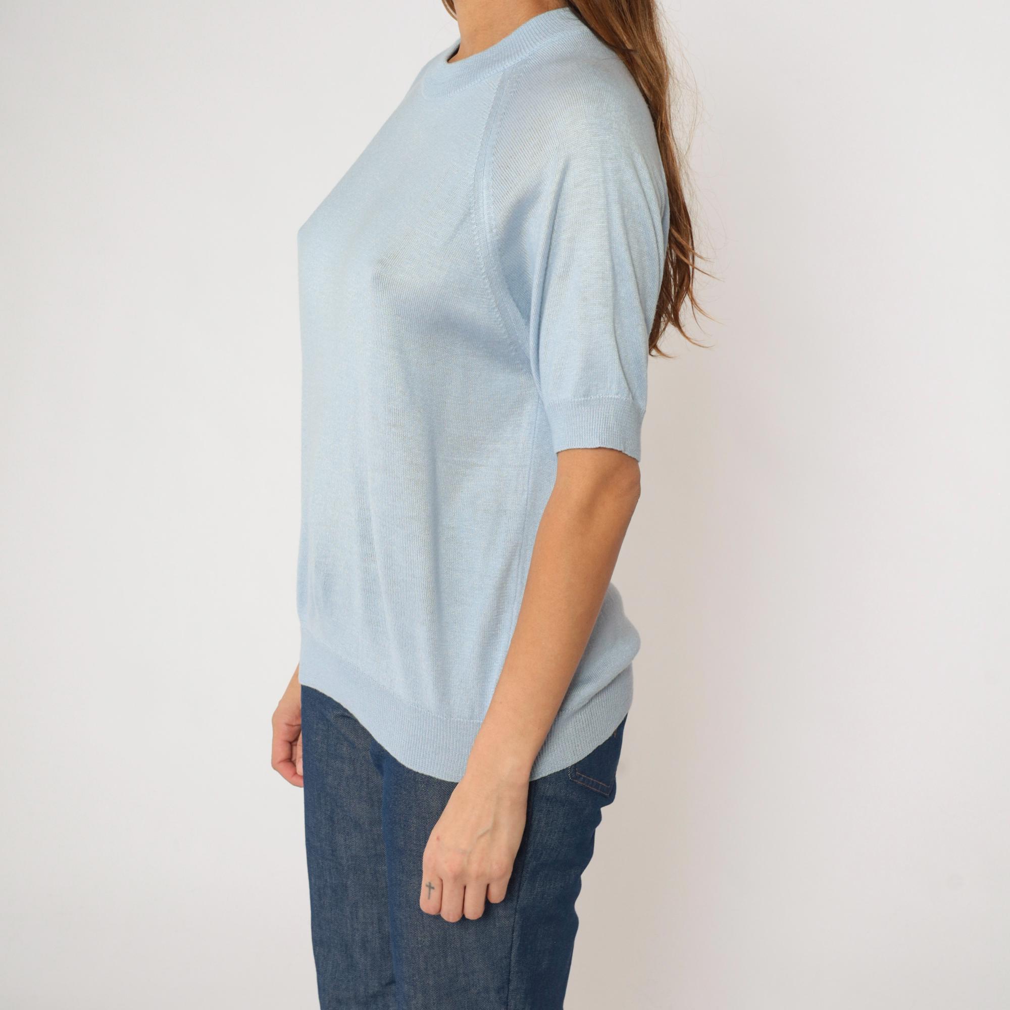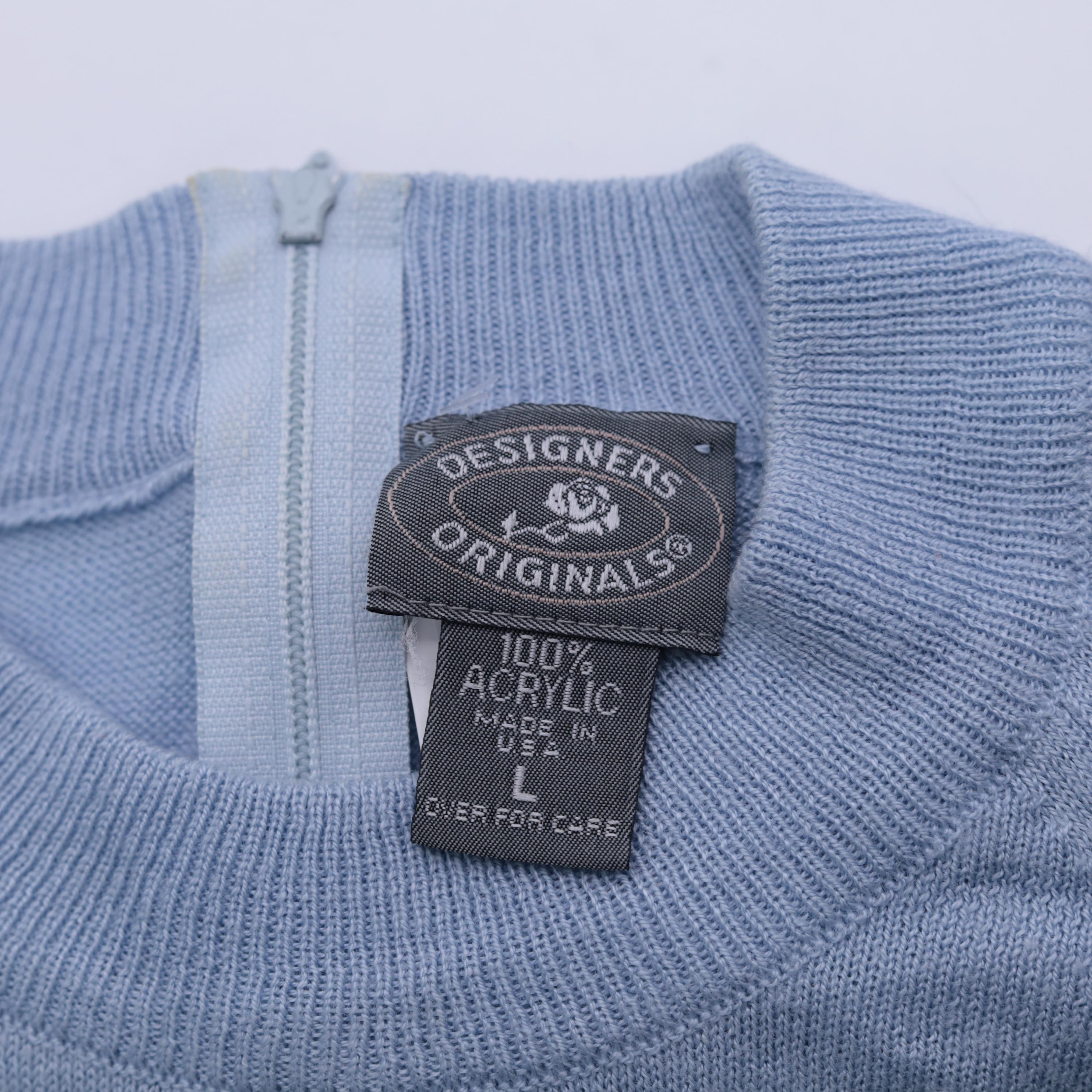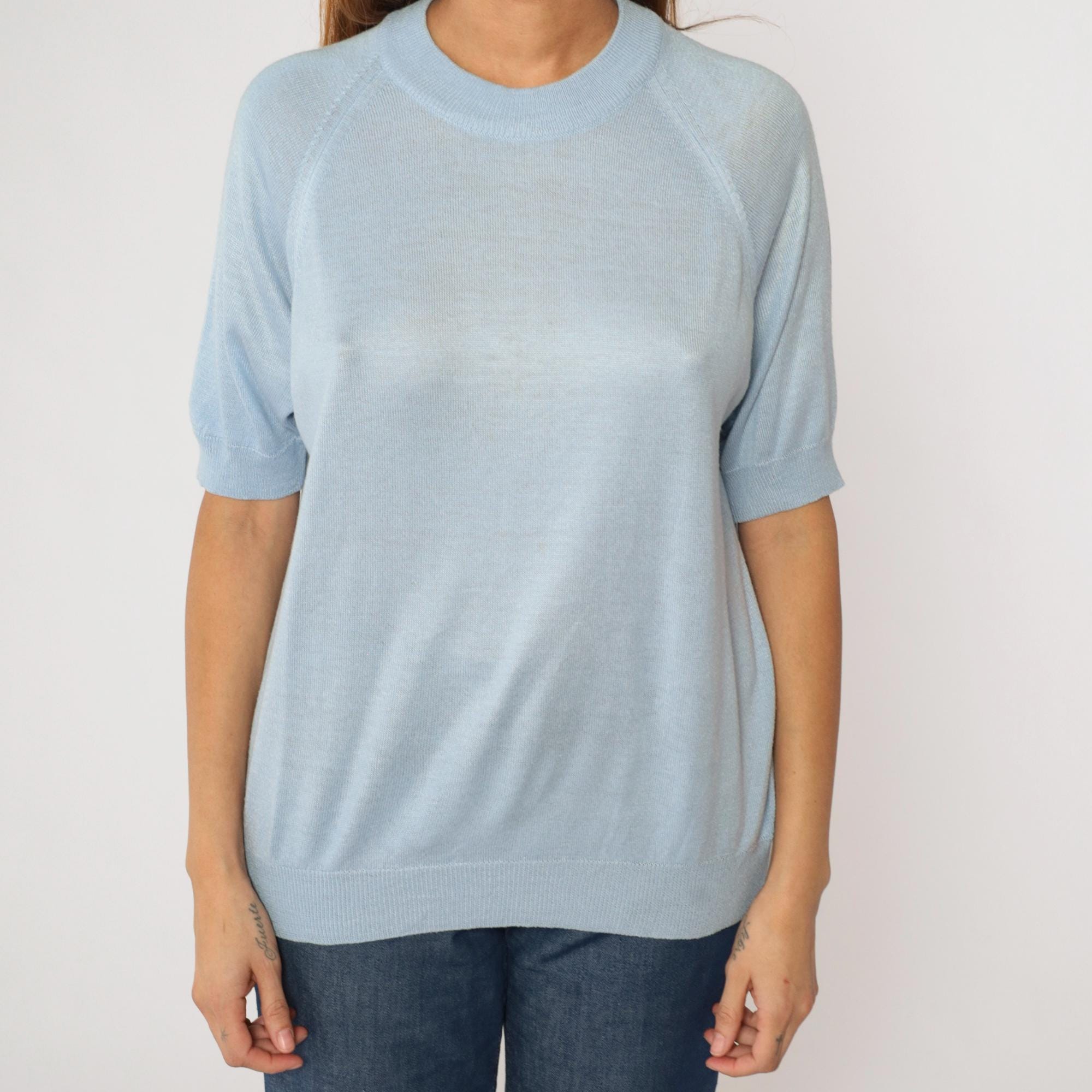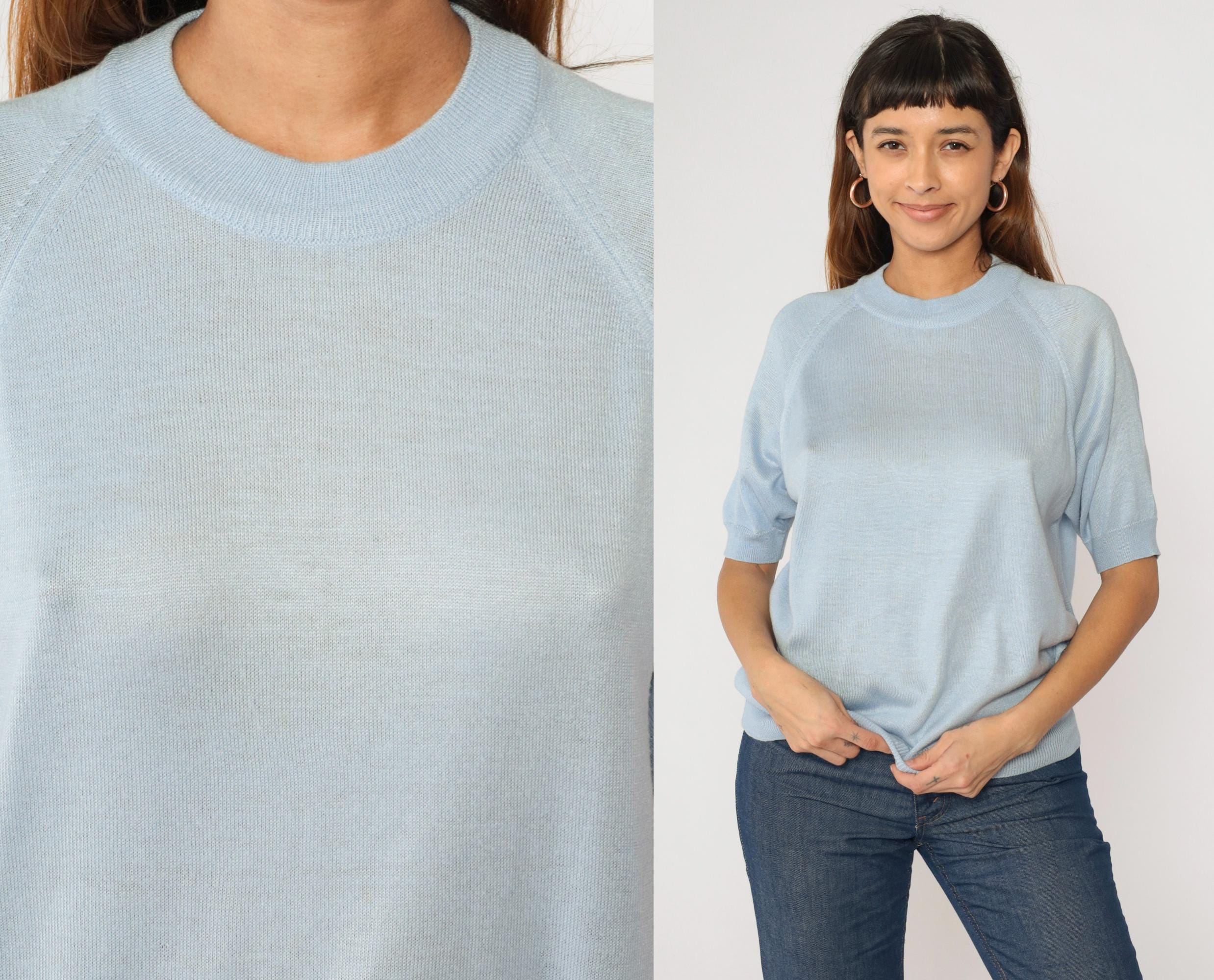 Vintage 80s 90s knit top in blue with short raglan sleeves and a rear zipper.