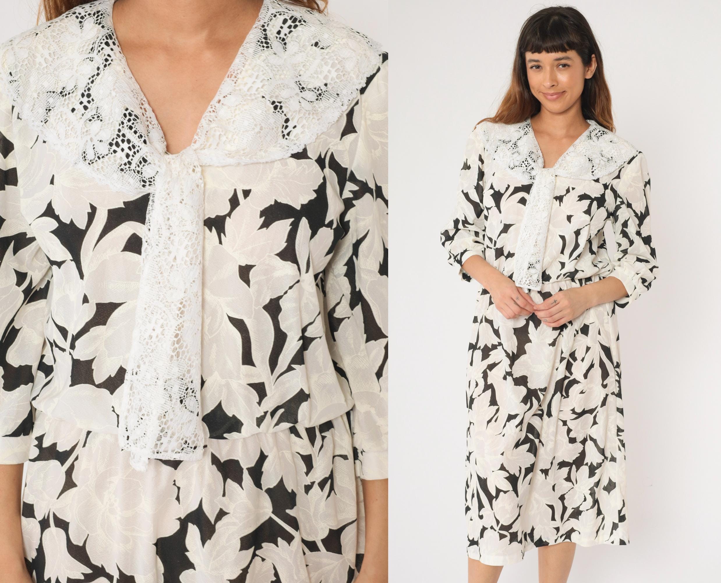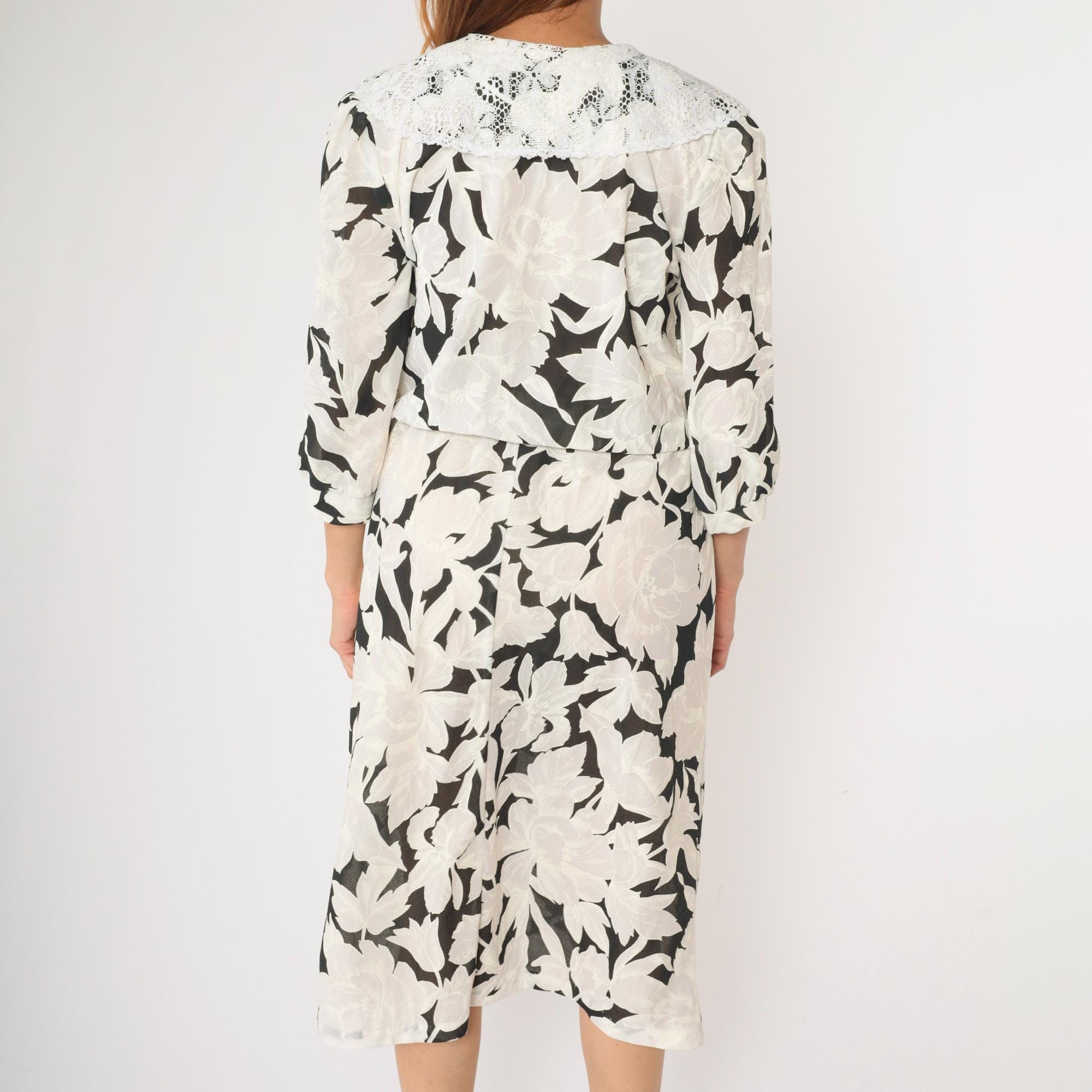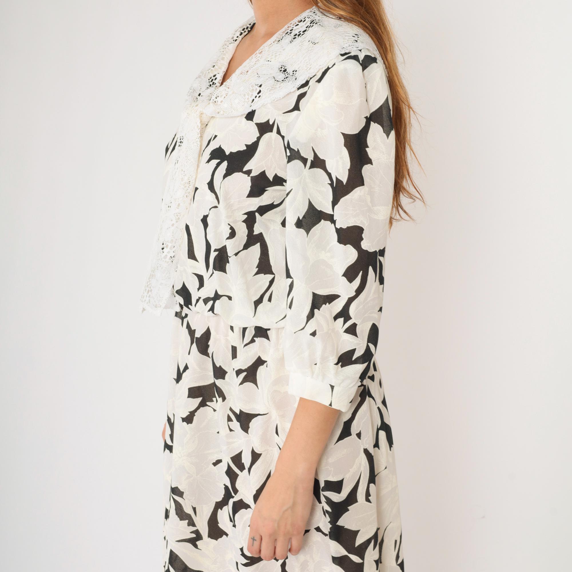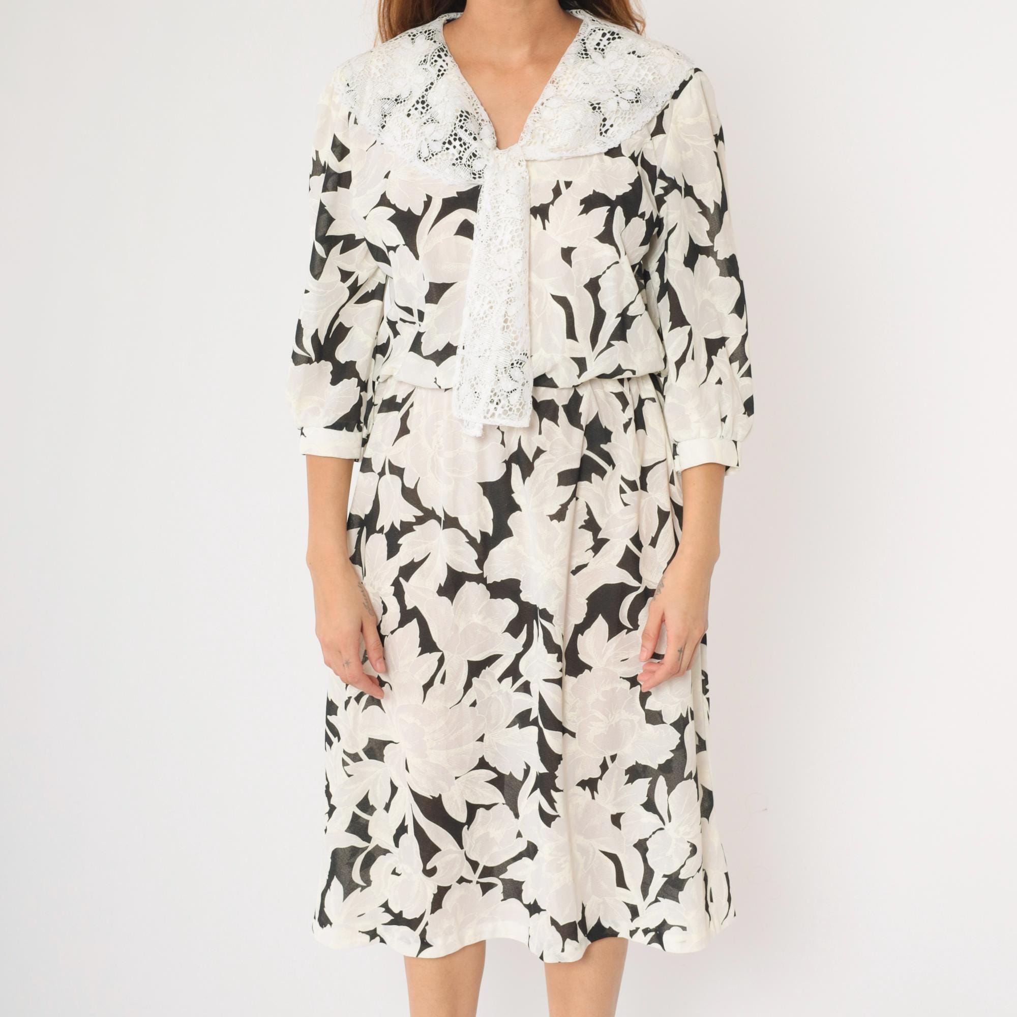 Vintage 80s dress in a black and white floral print with a lace collar and puff sleeves. It features an elastic waist with a midi length skirt.