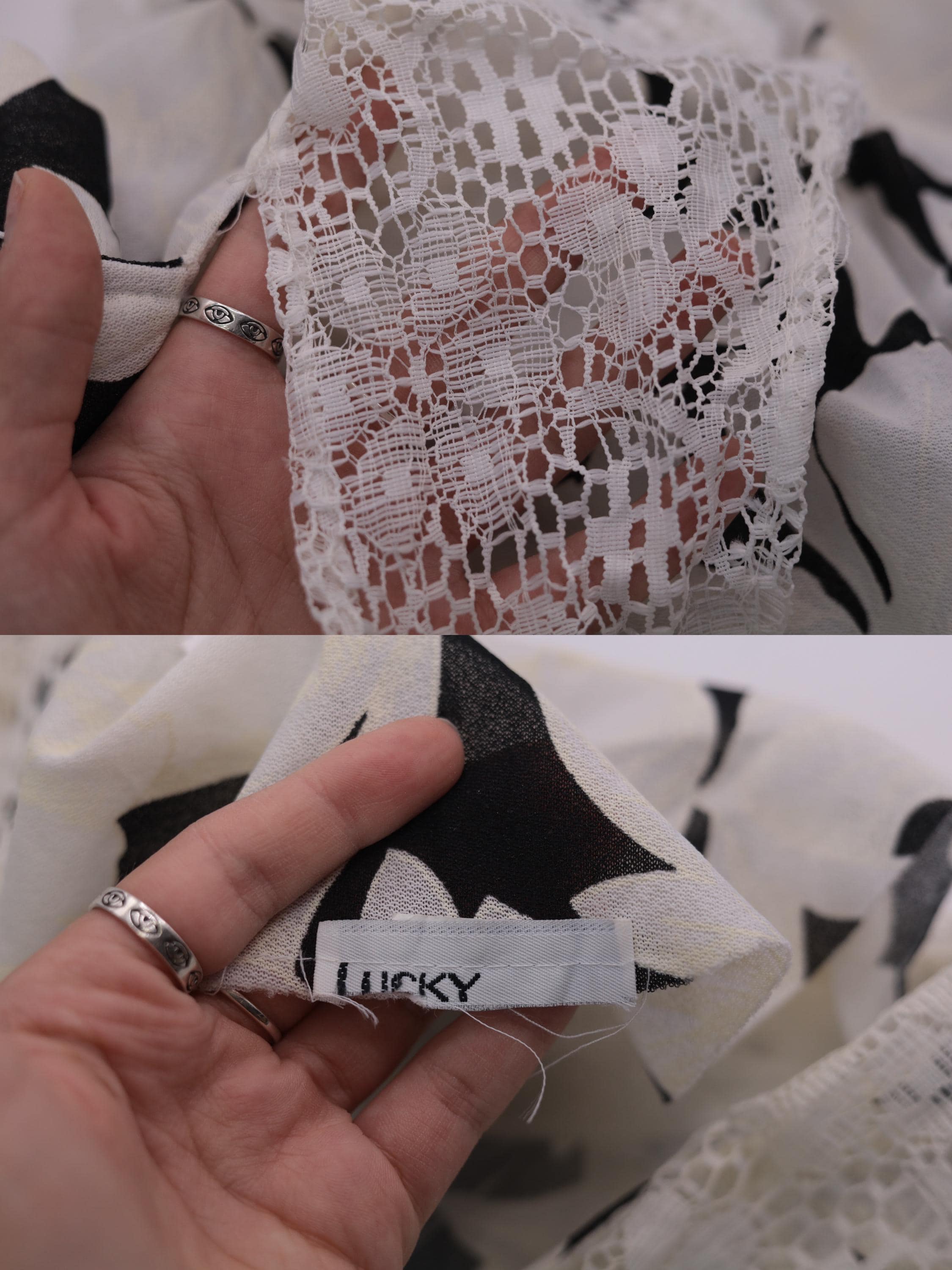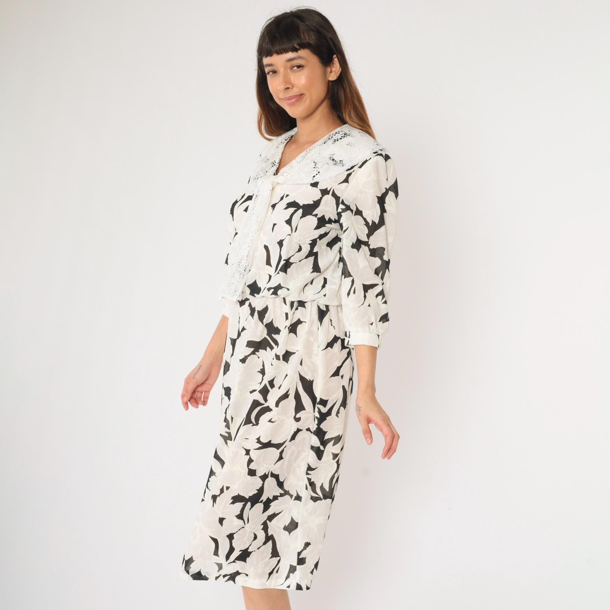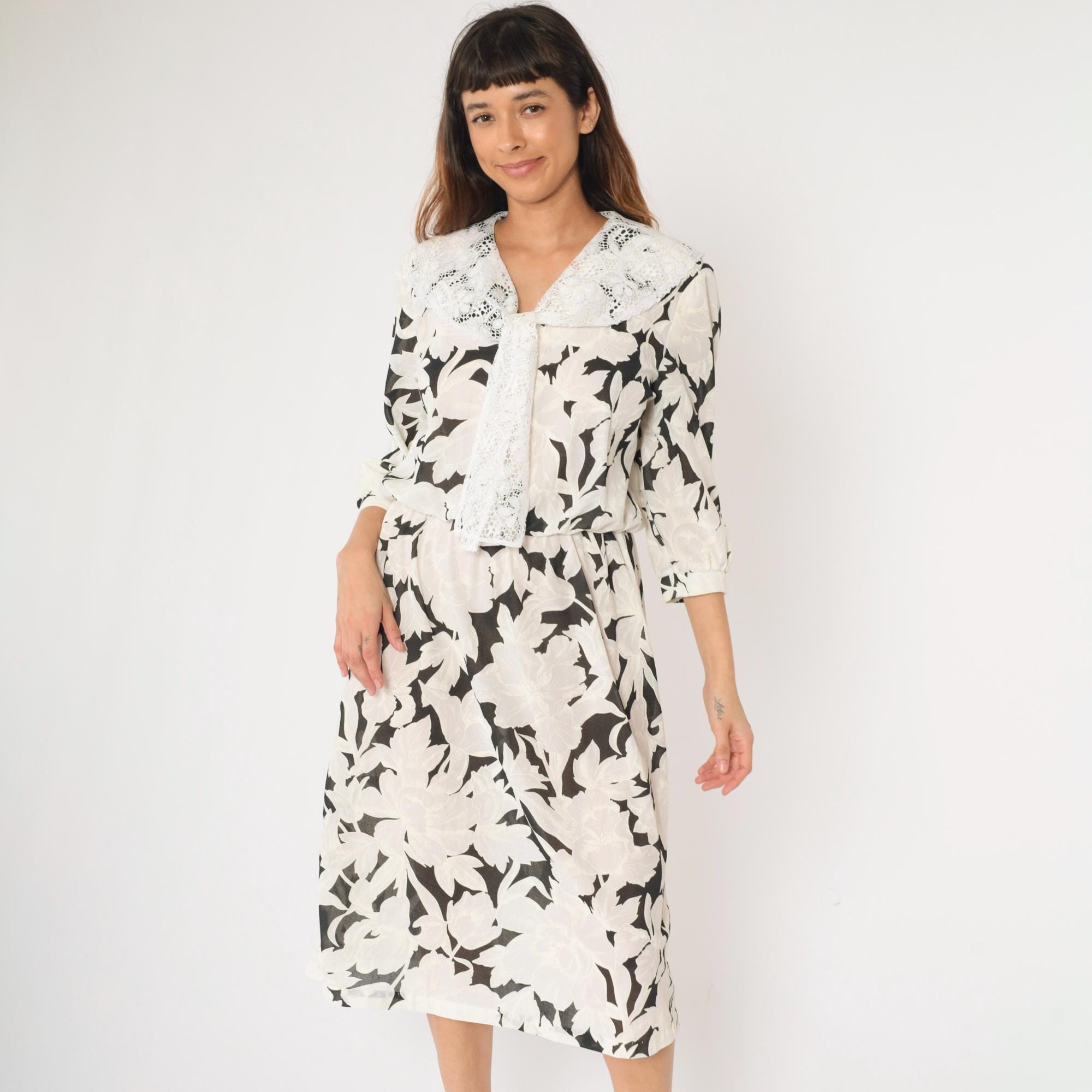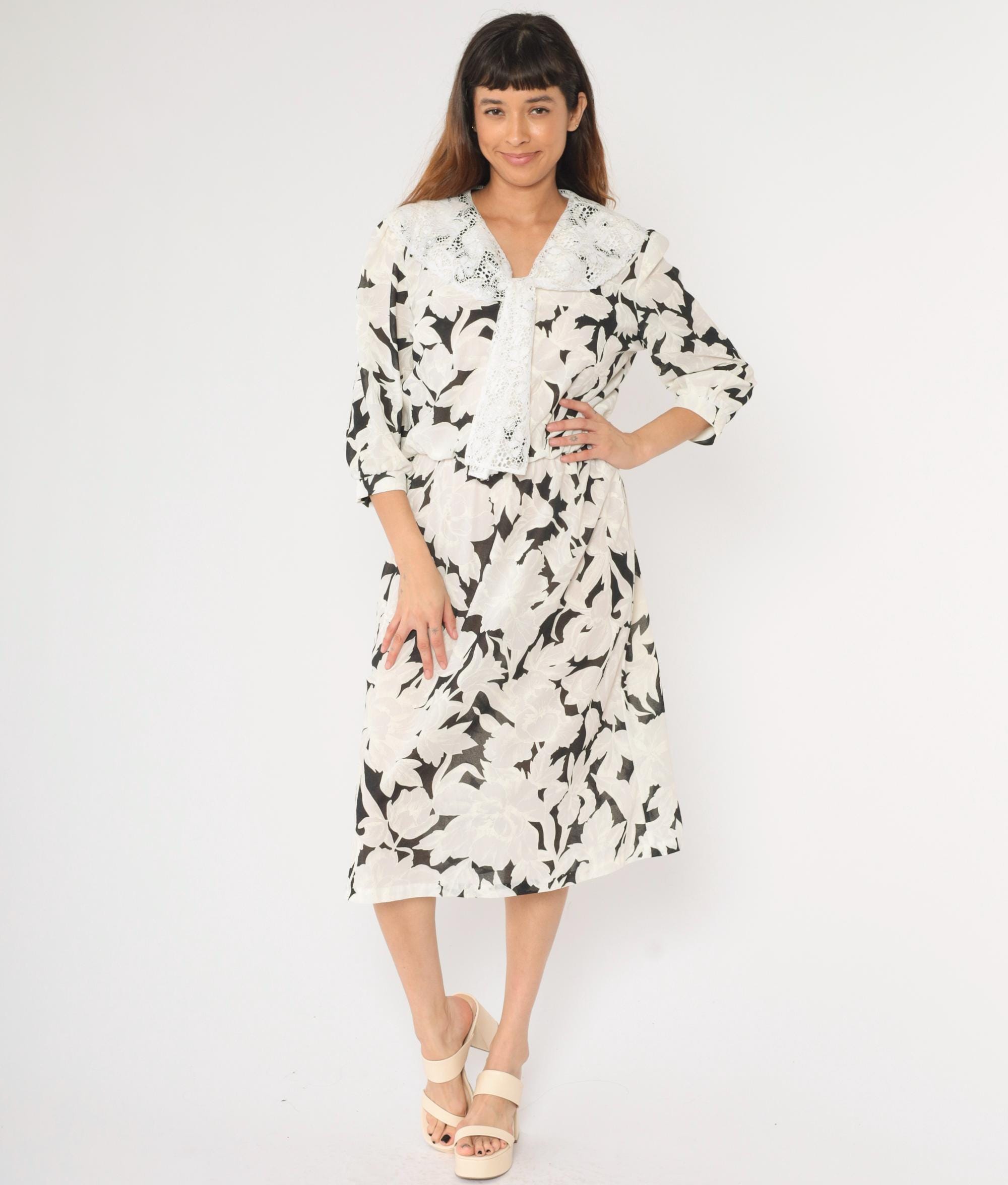 Vintage 80s dress in a black and white floral print with a lace collar and puff sleeves. It features an elastic waist with a midi length skirt.