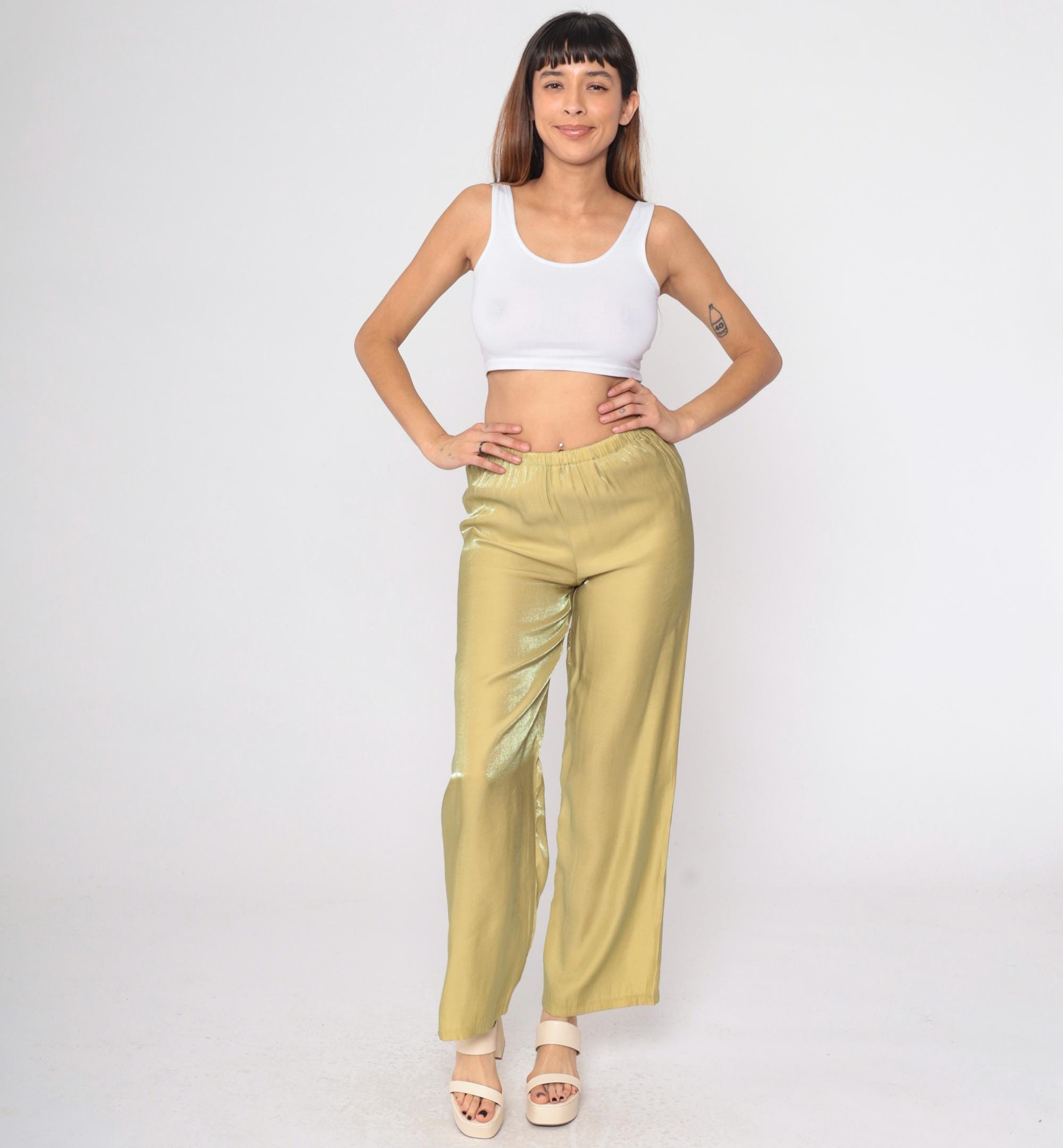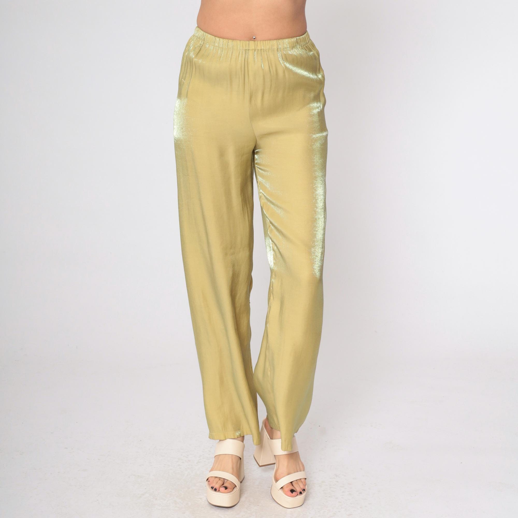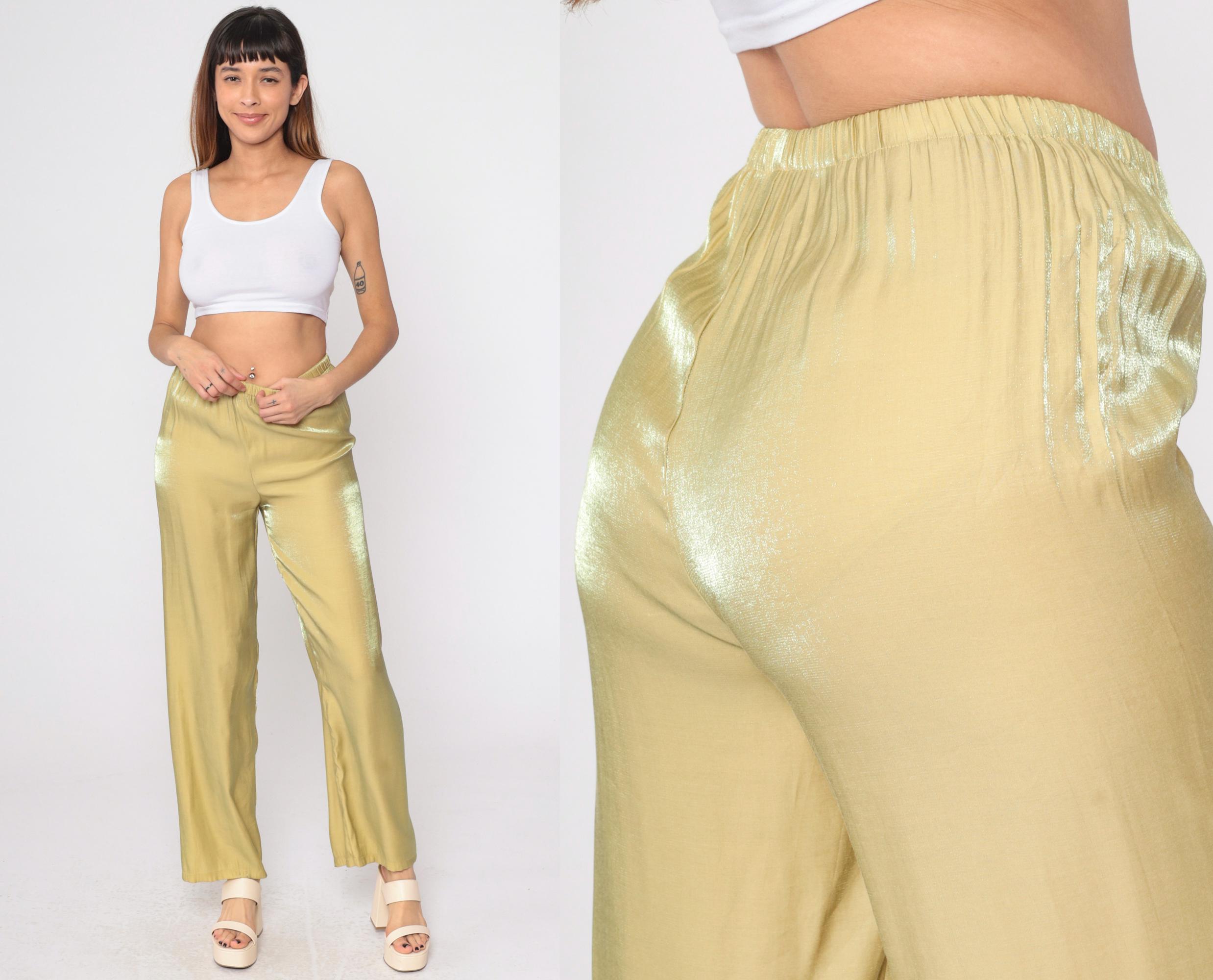 Vintage 90s pants in iridescent gold with a straight leg and an elastic waist.