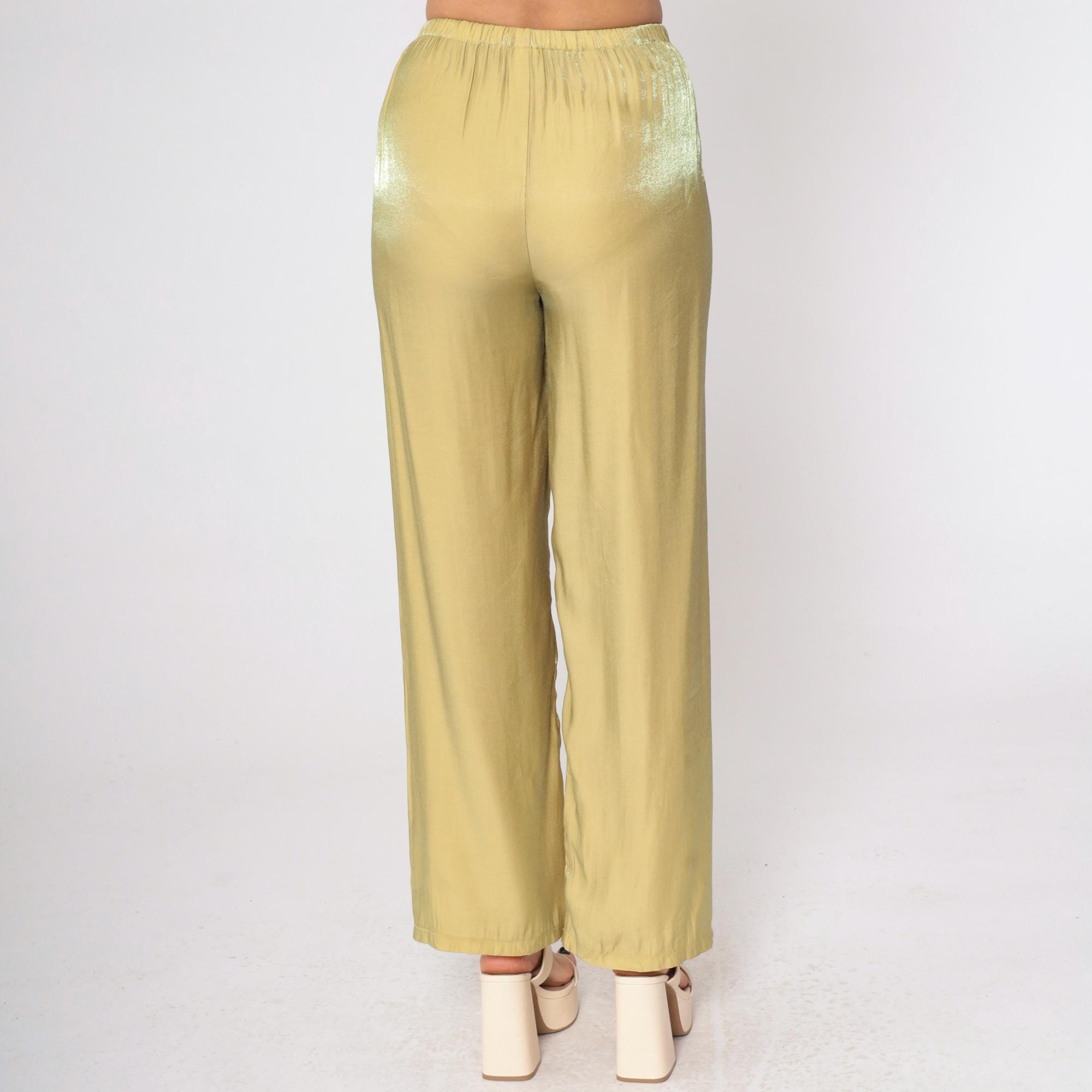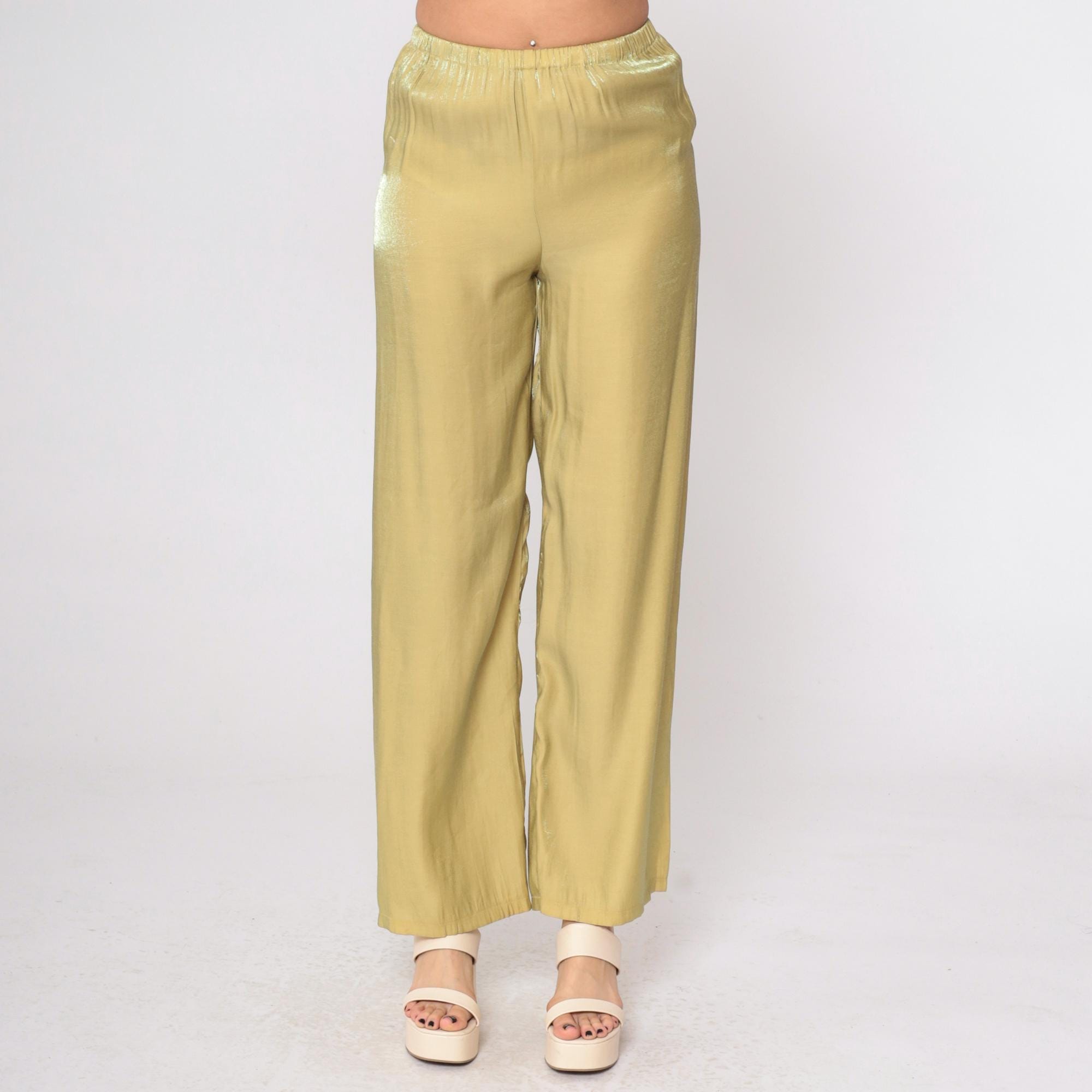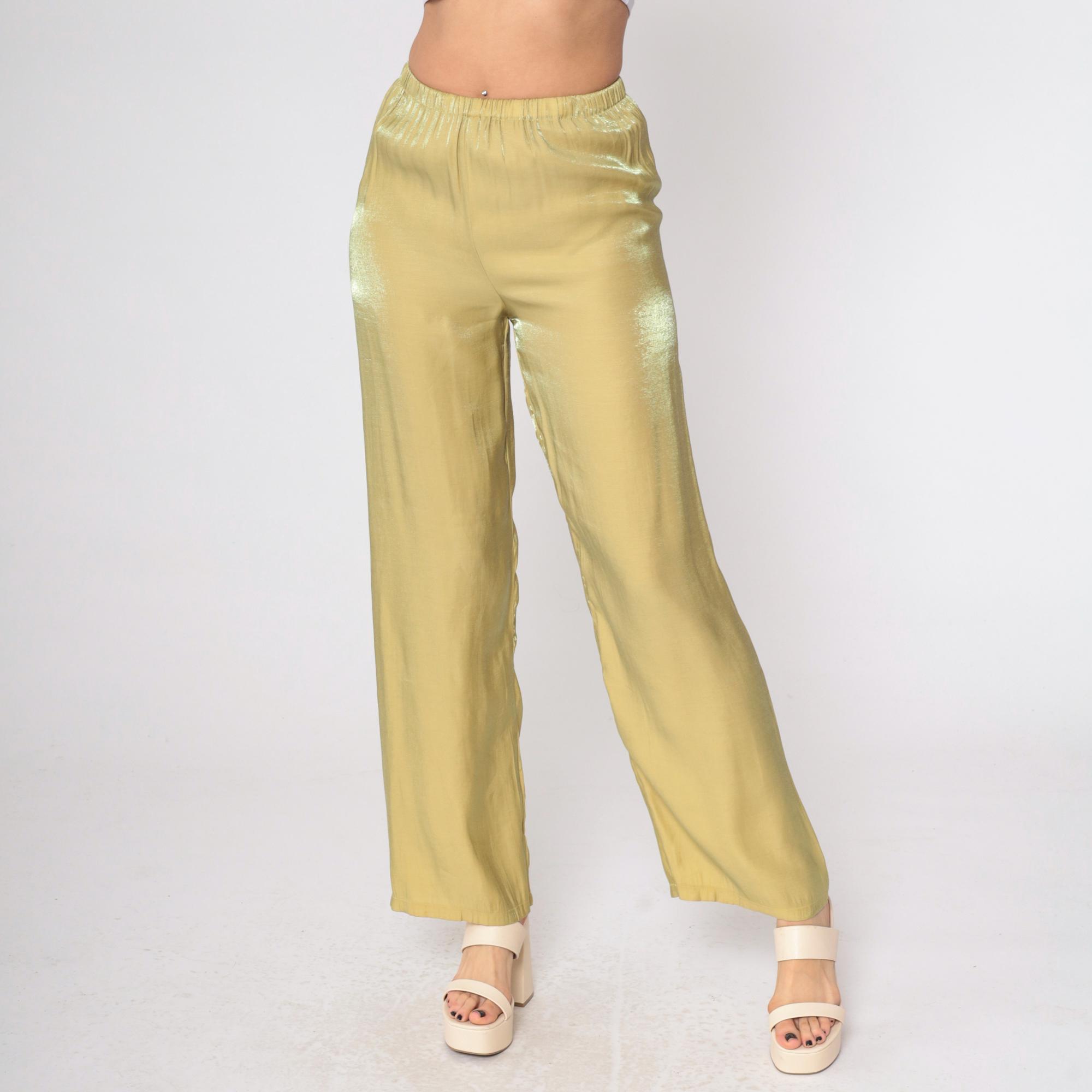 Vintage 90s pants in iridescent gold with a straight leg and an elastic waist.