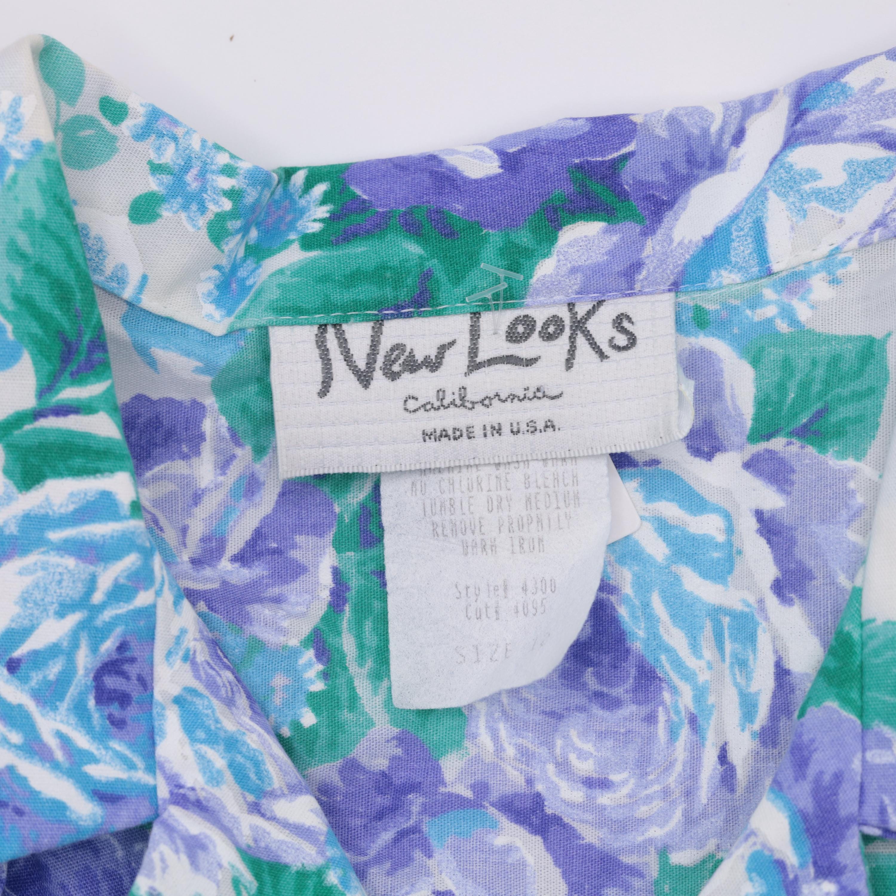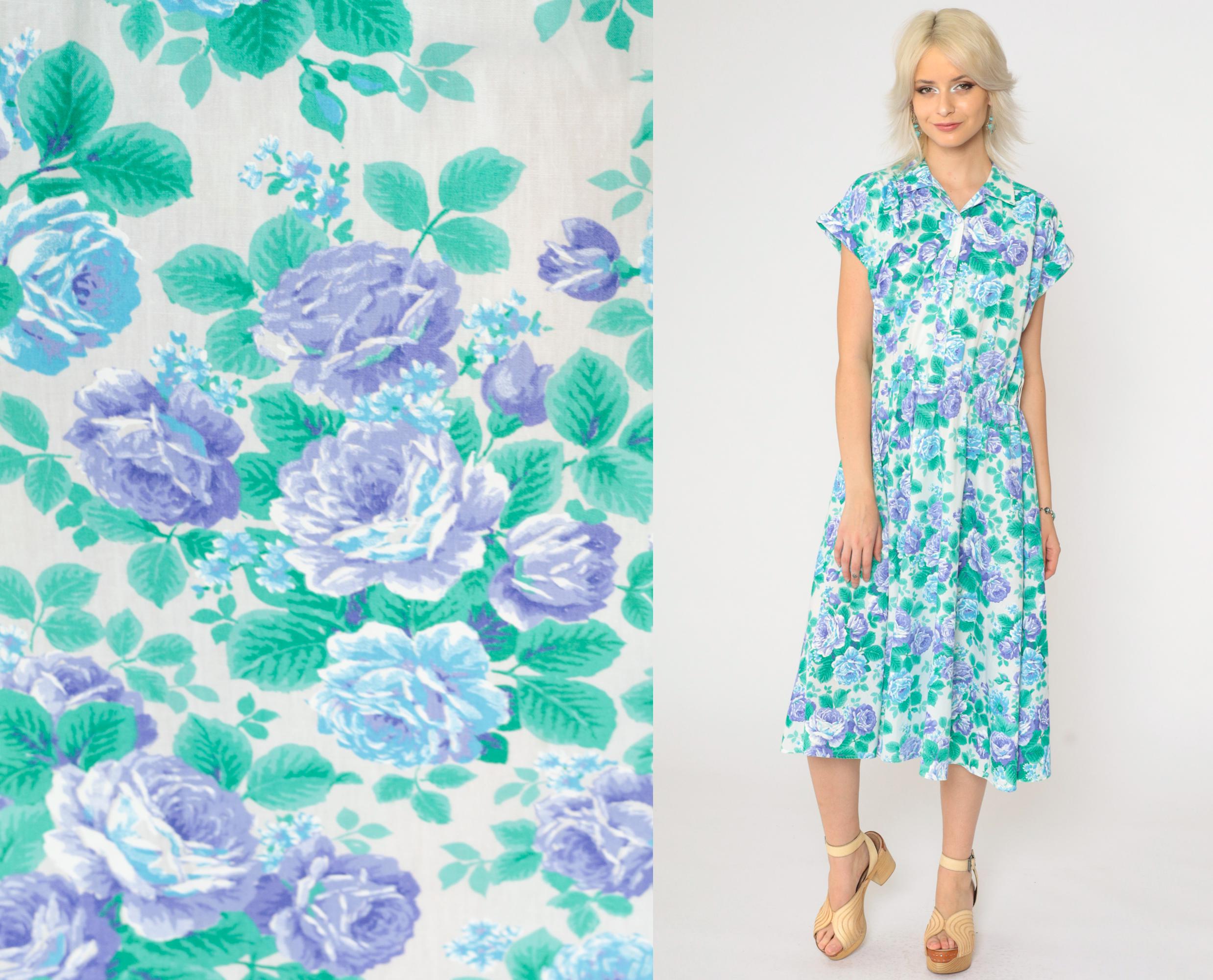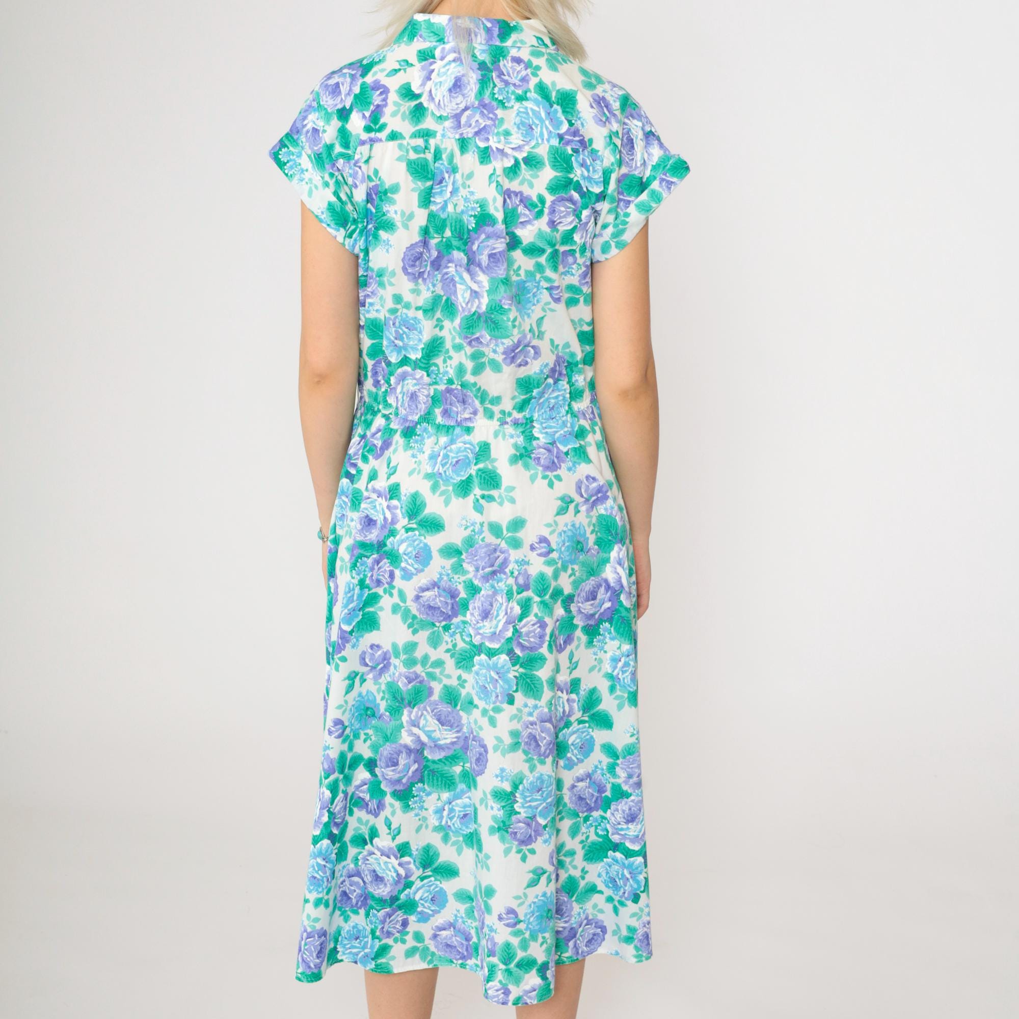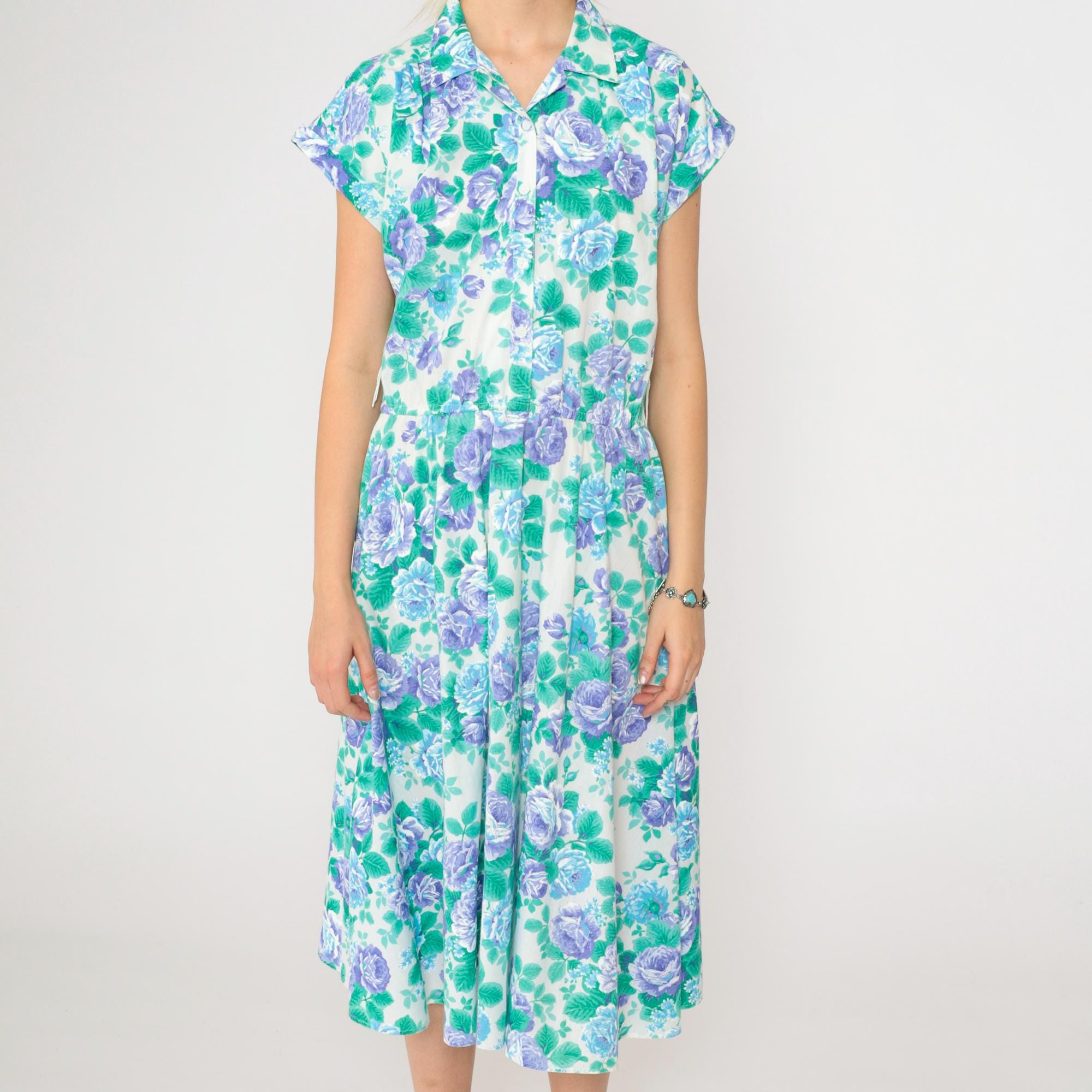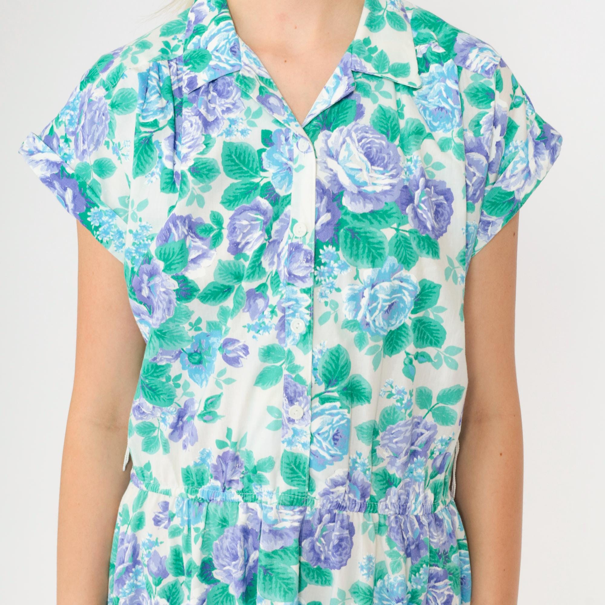 Vintage 80s dress with a green, blue and purple floral print. High waisted with buttons up the front and cap sleeves.