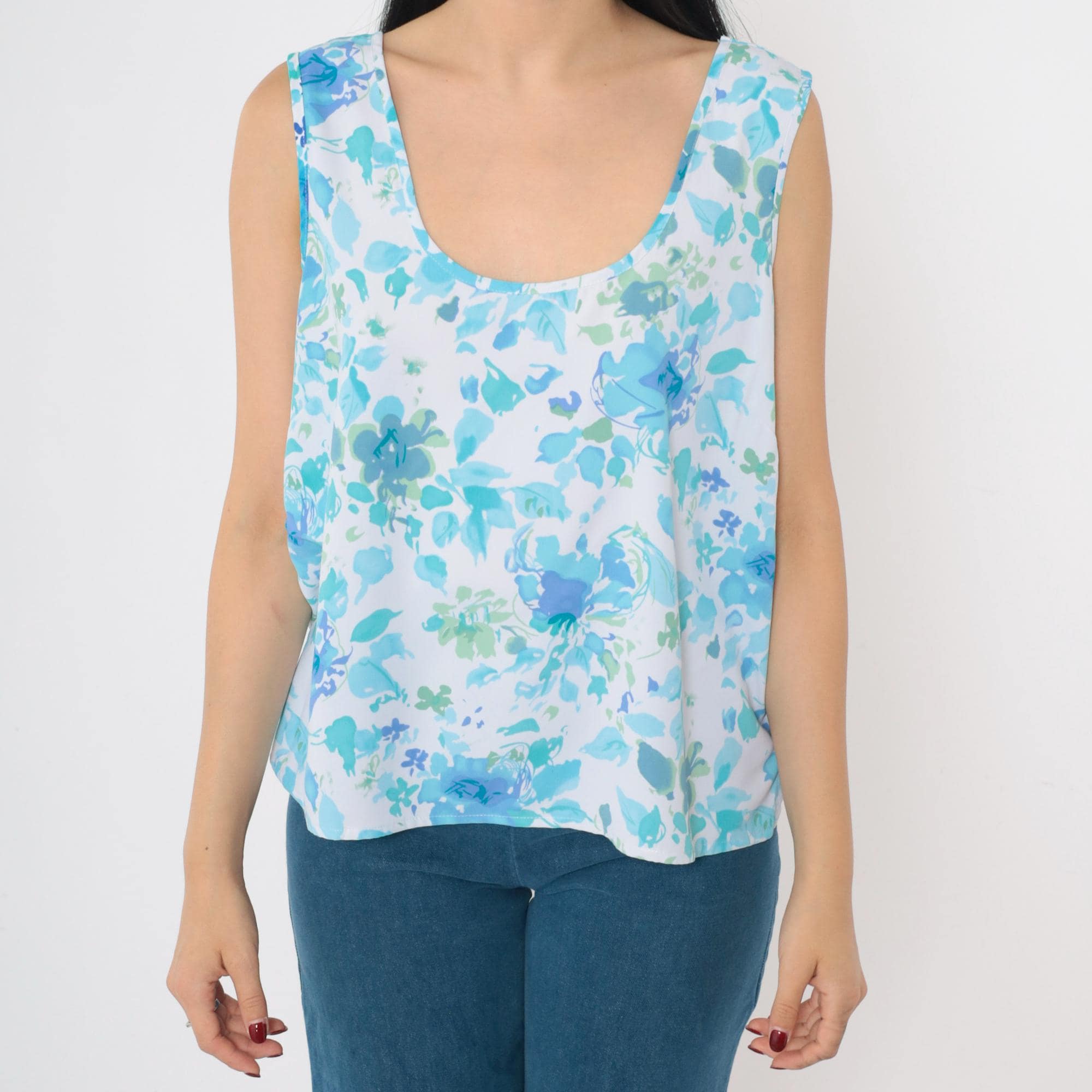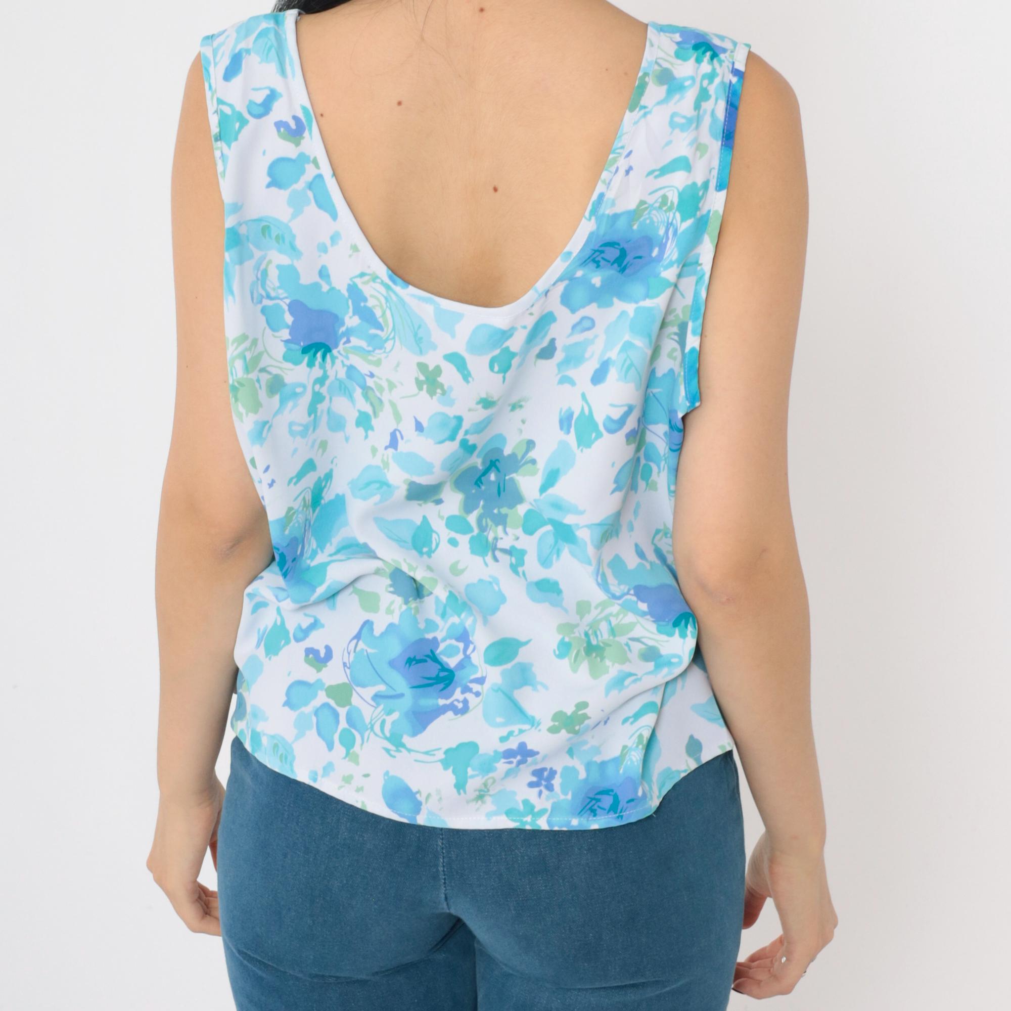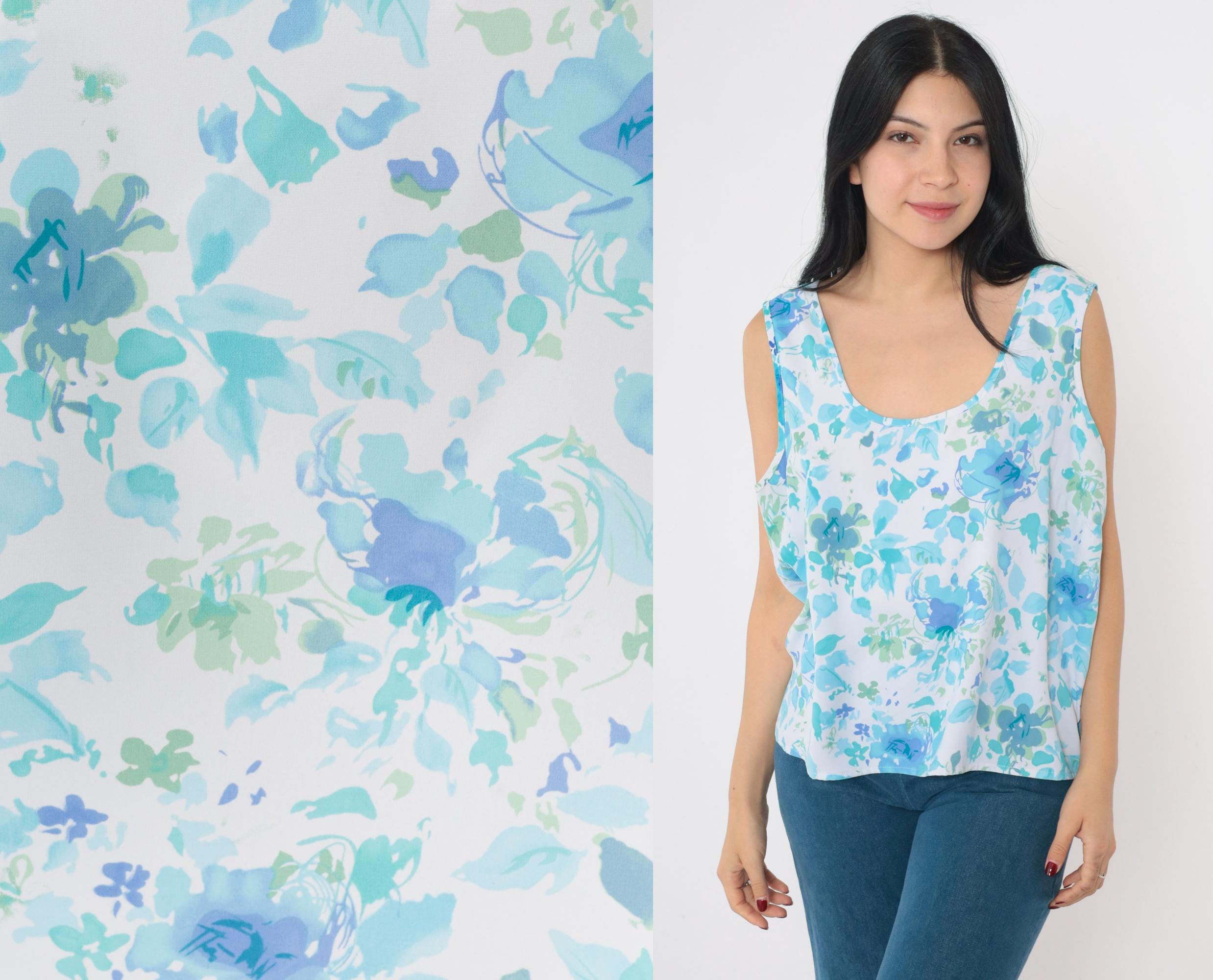 Vintage 90s tank top in blue with an abstract floral print. Sleeveless with a scoop neck.