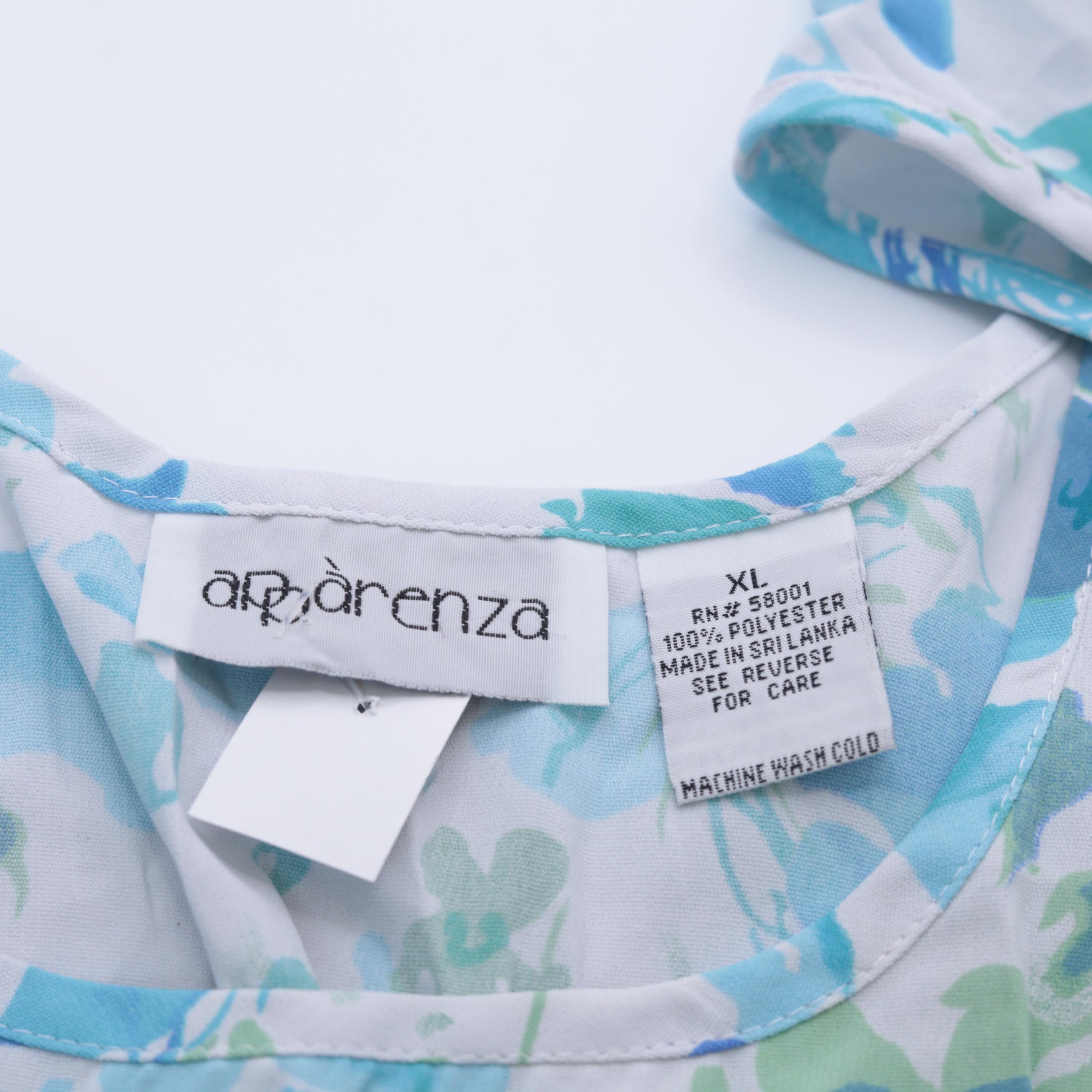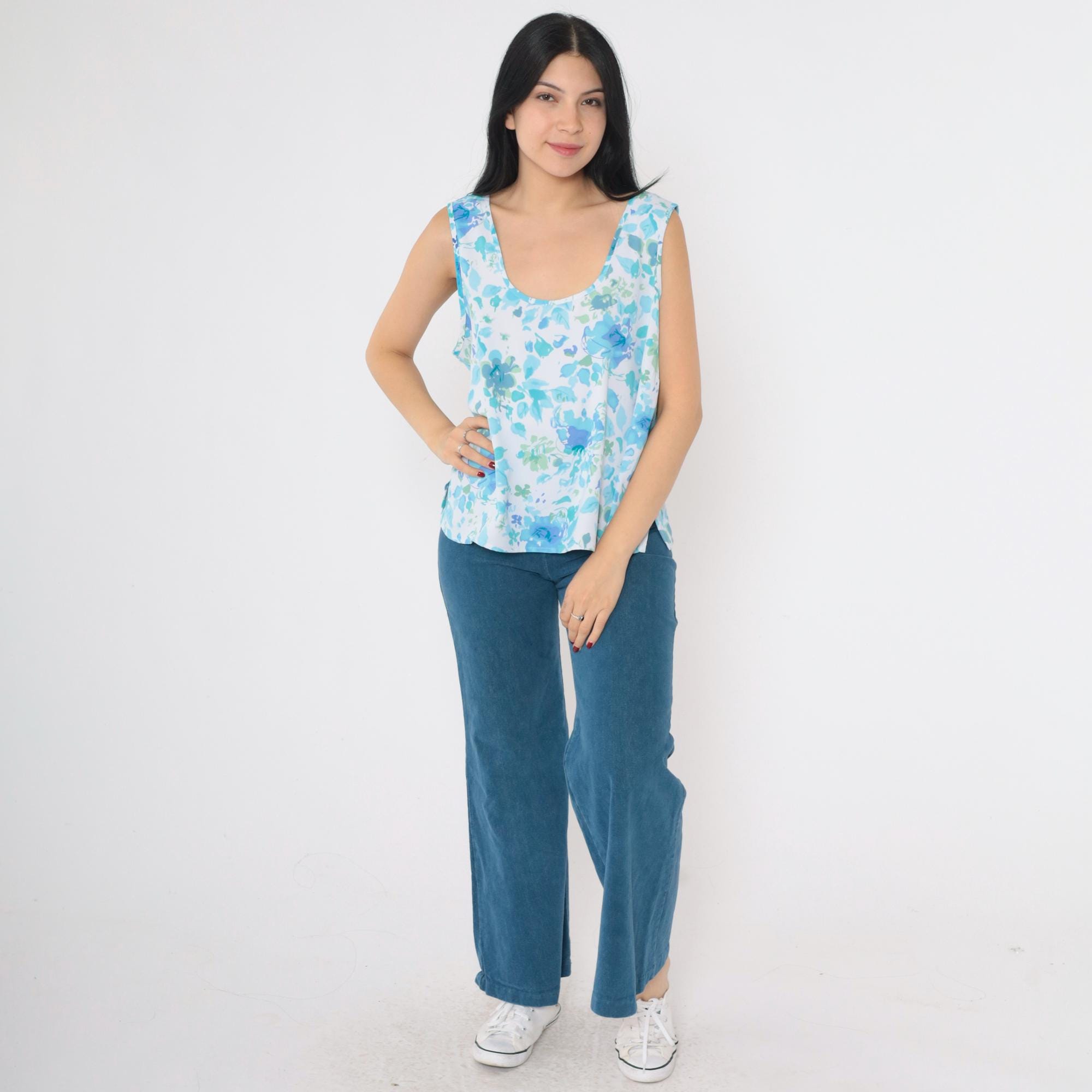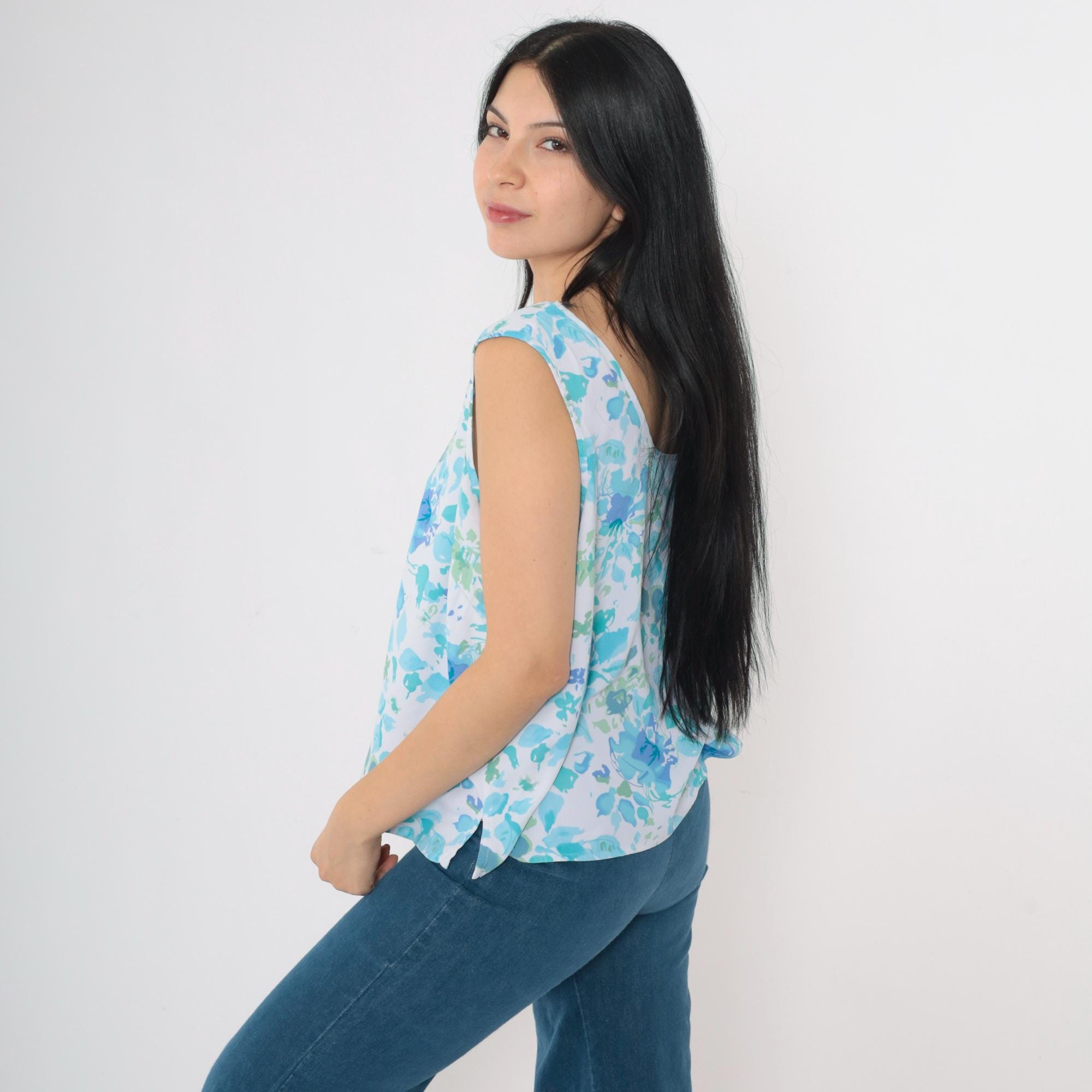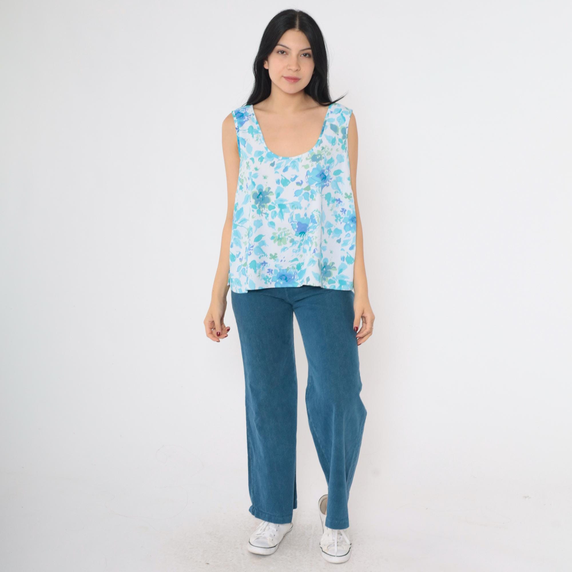 Vintage 90s tank top in blue with an abstract floral print. Sleeveless with a scoop neck.