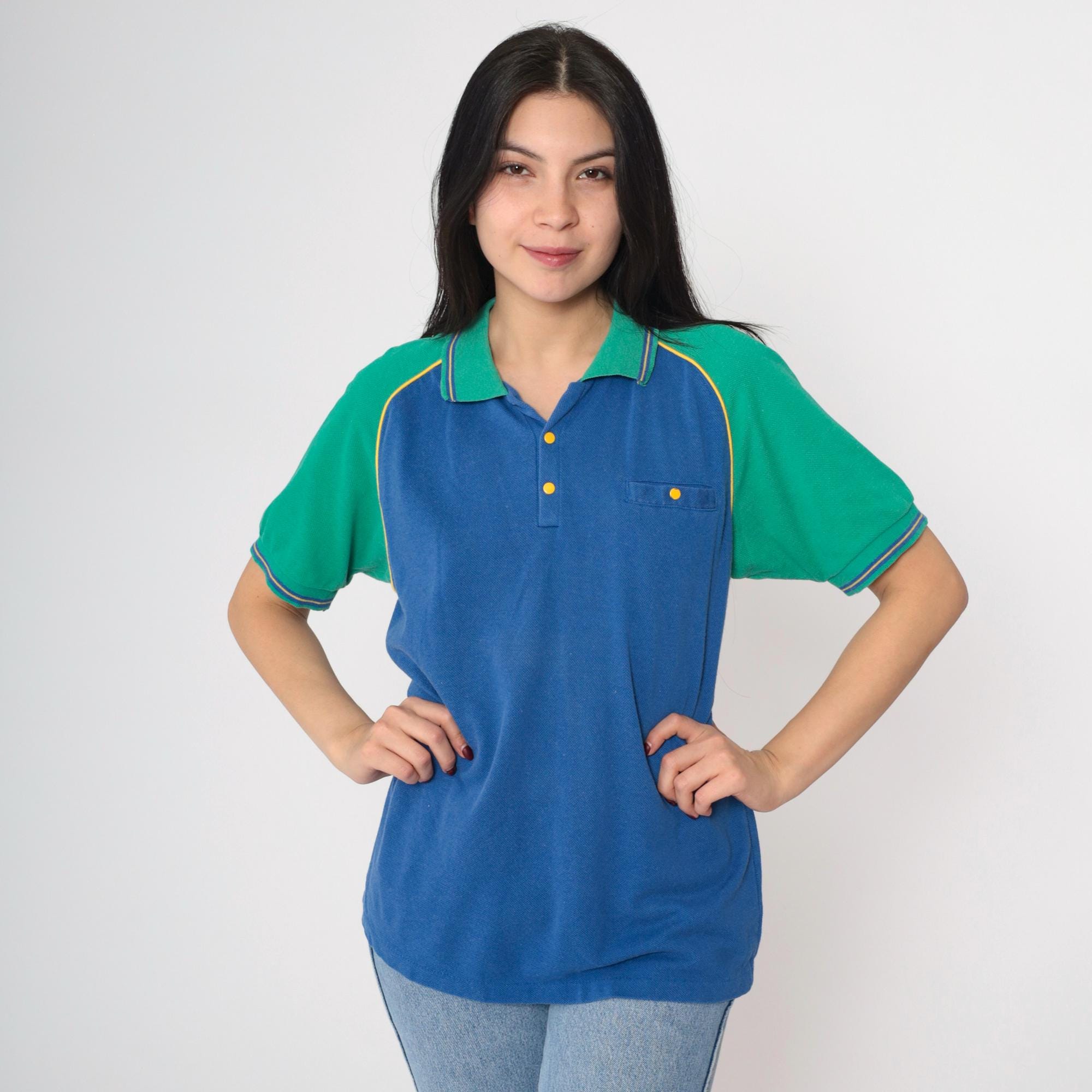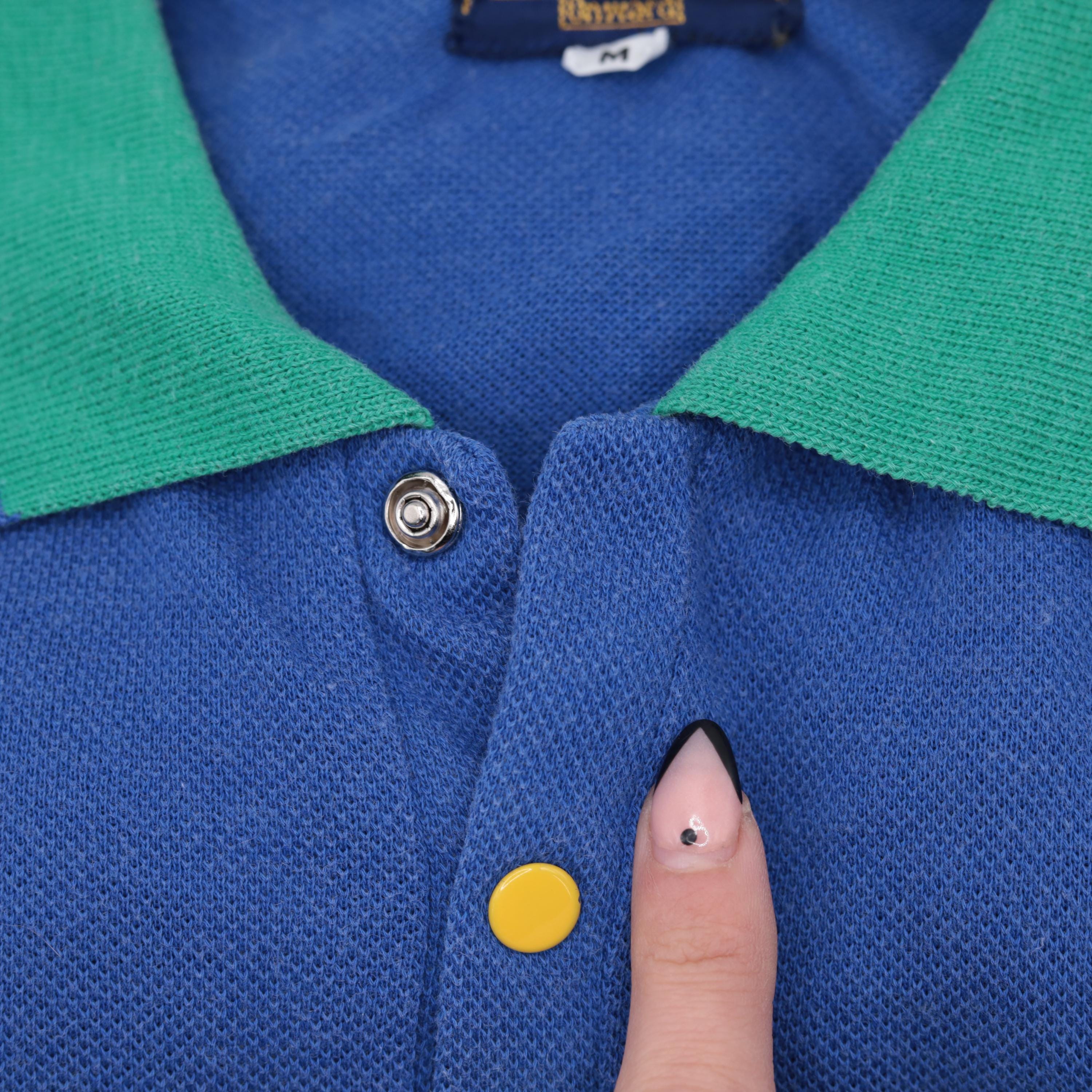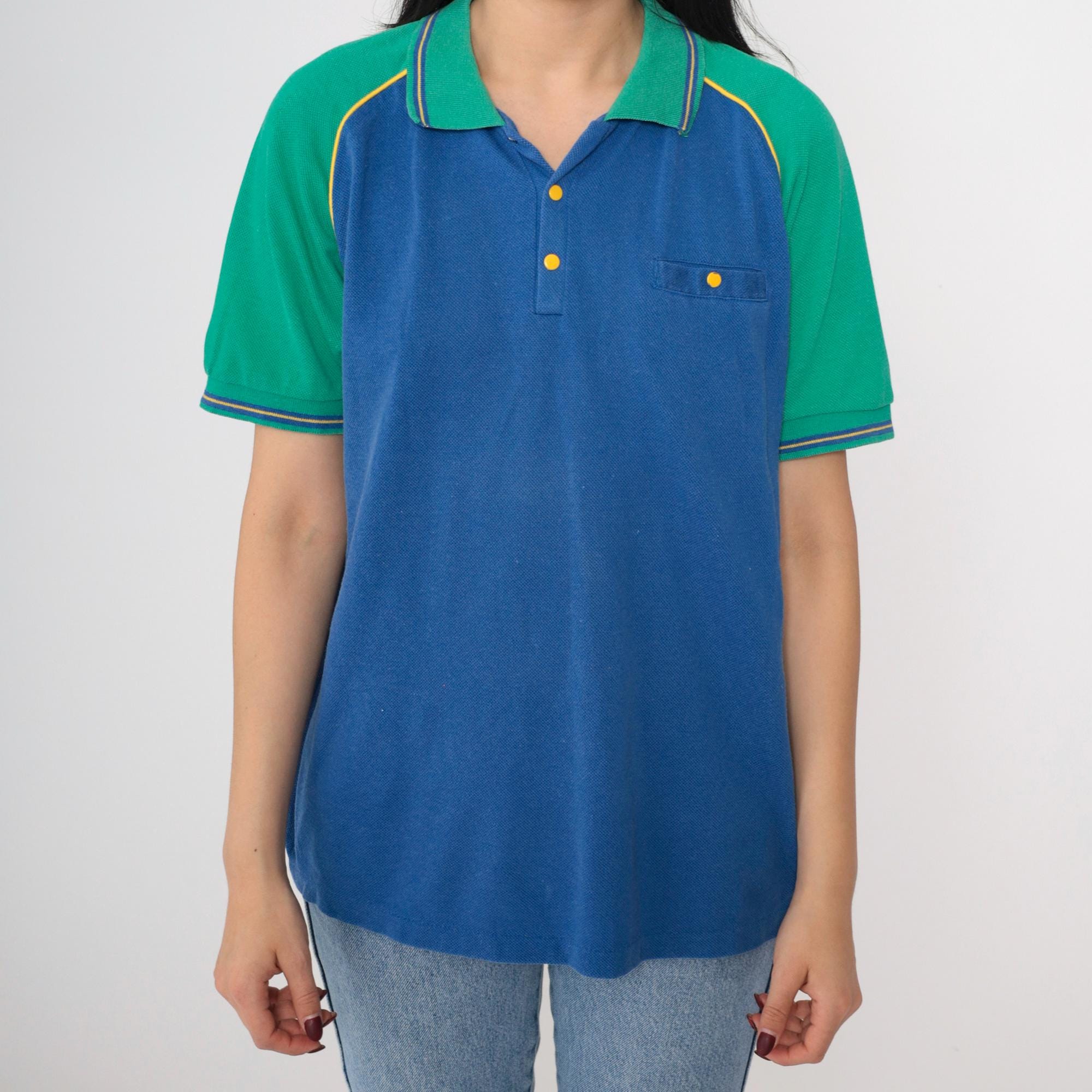 Vintage 80s 90s polo shirt by Bugle Boy in blue with green raglan sleeves. It features buttons up the chest with a collar.