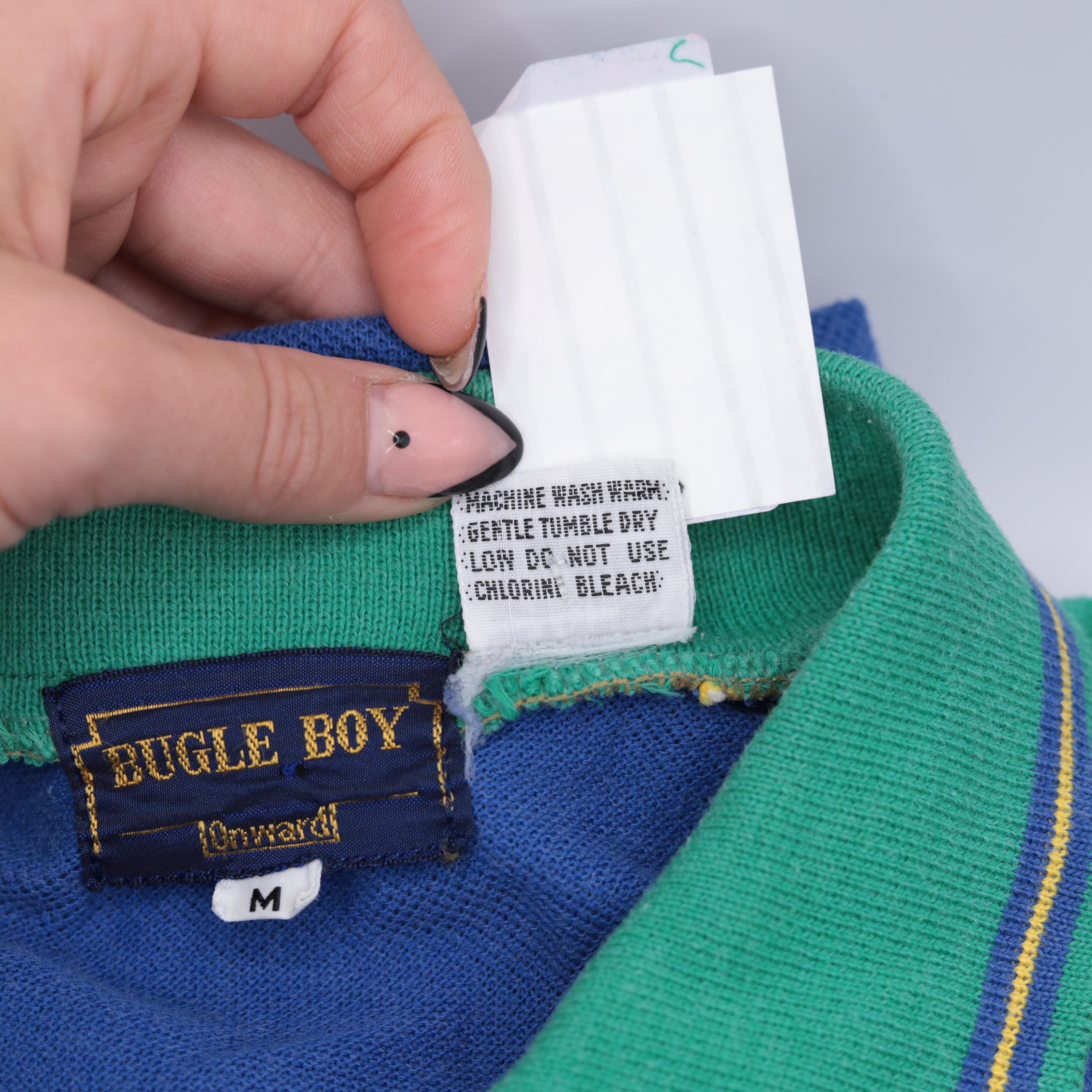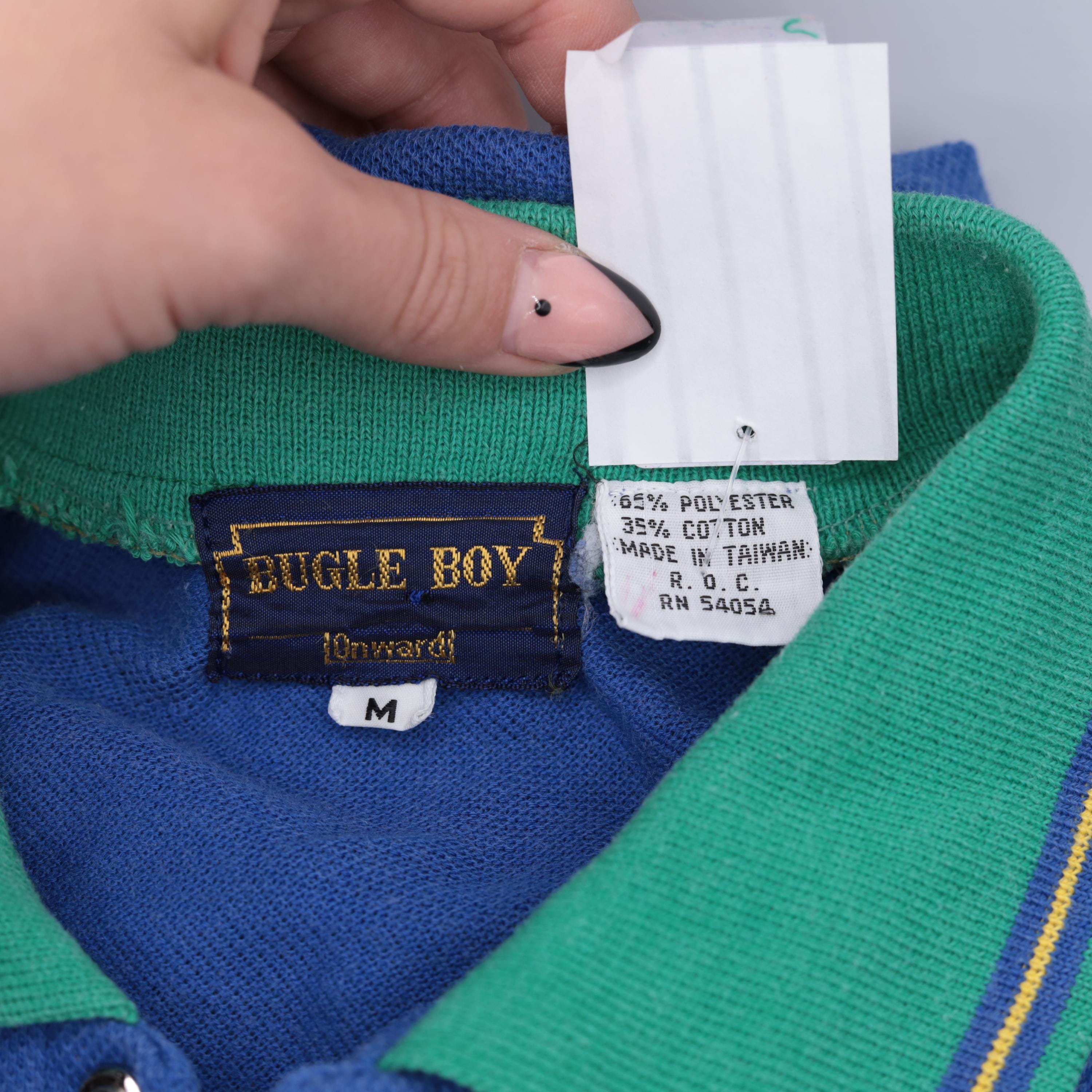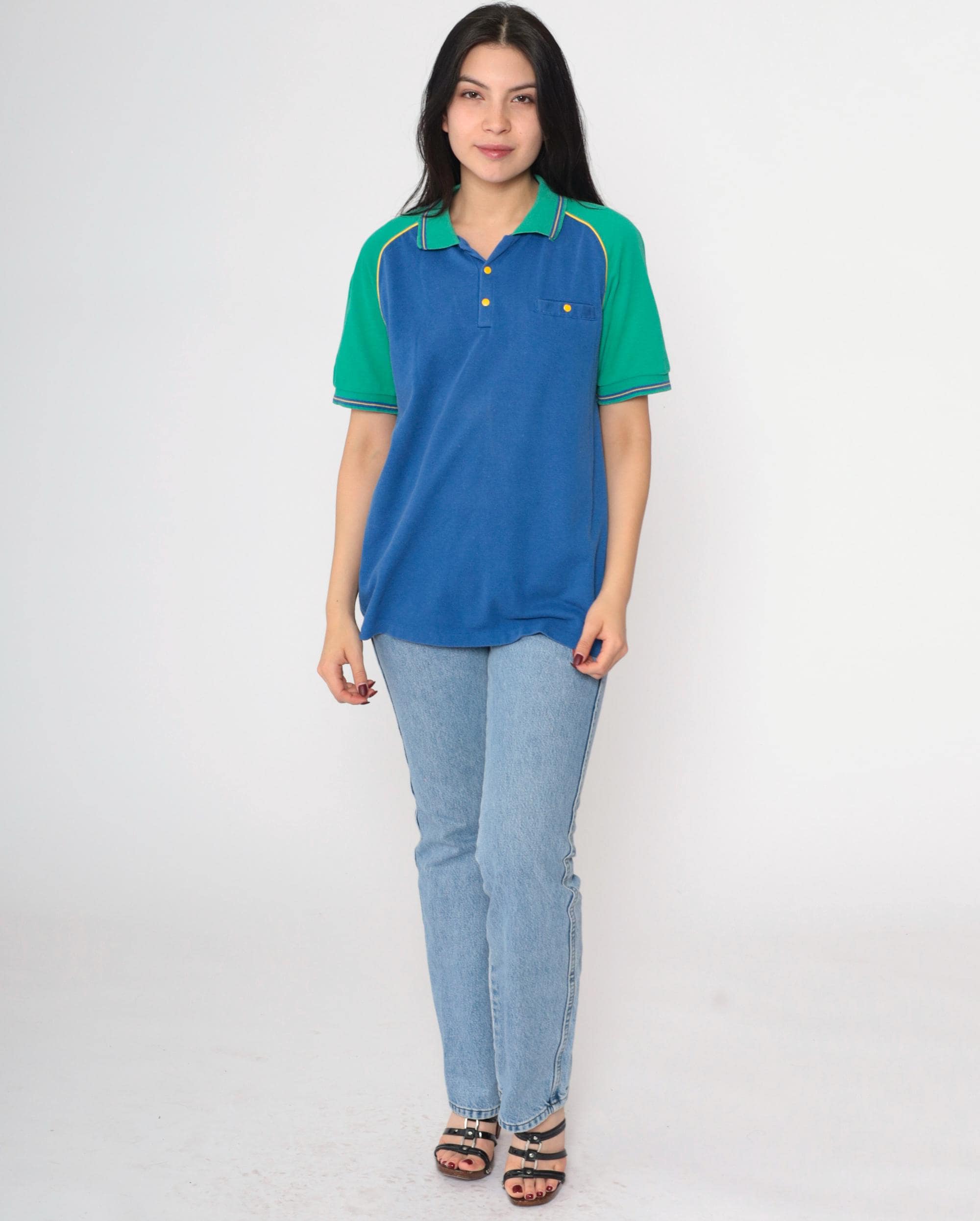 Vintage 80s 90s polo shirt by Bugle Boy in blue with green raglan sleeves. It features buttons up the chest with a collar.