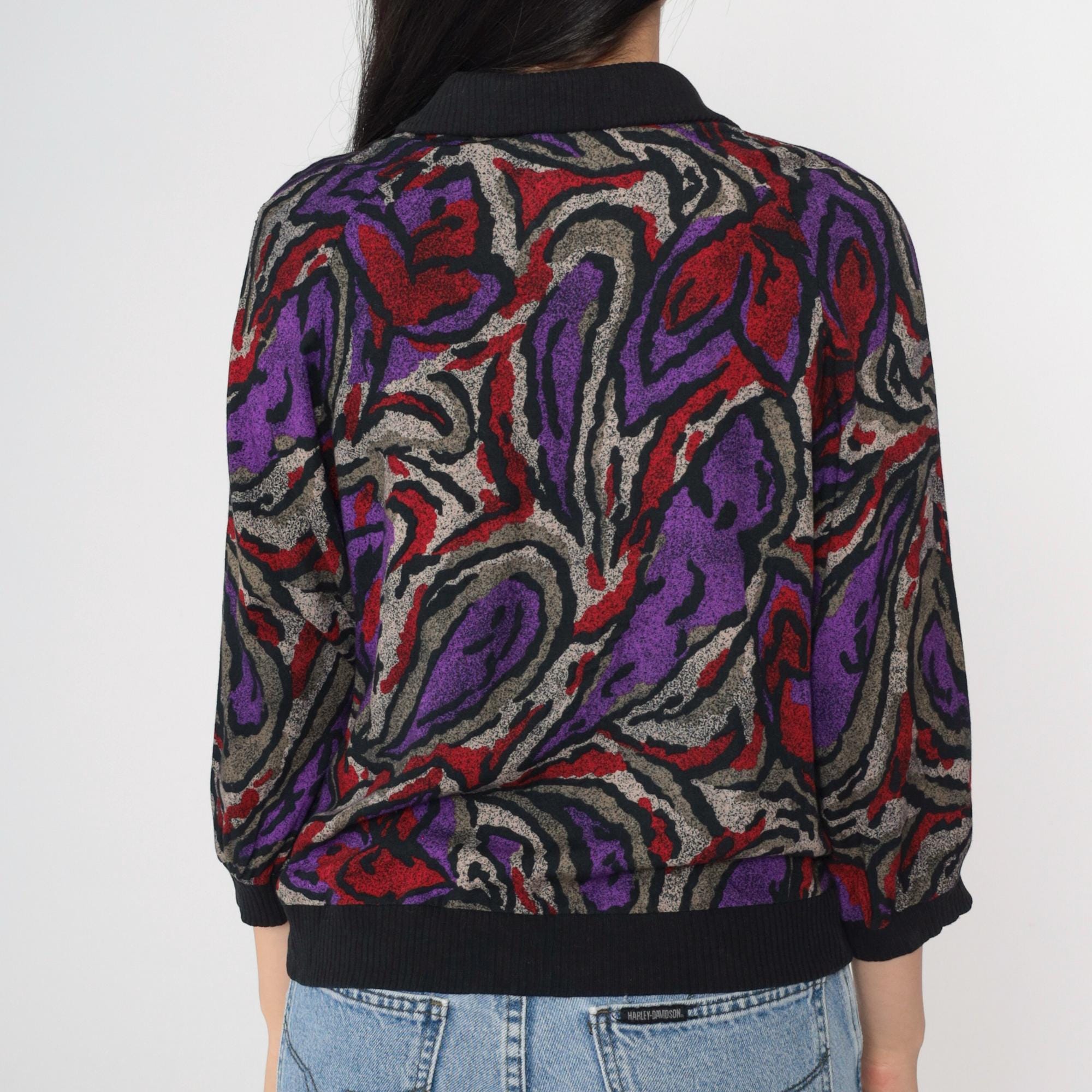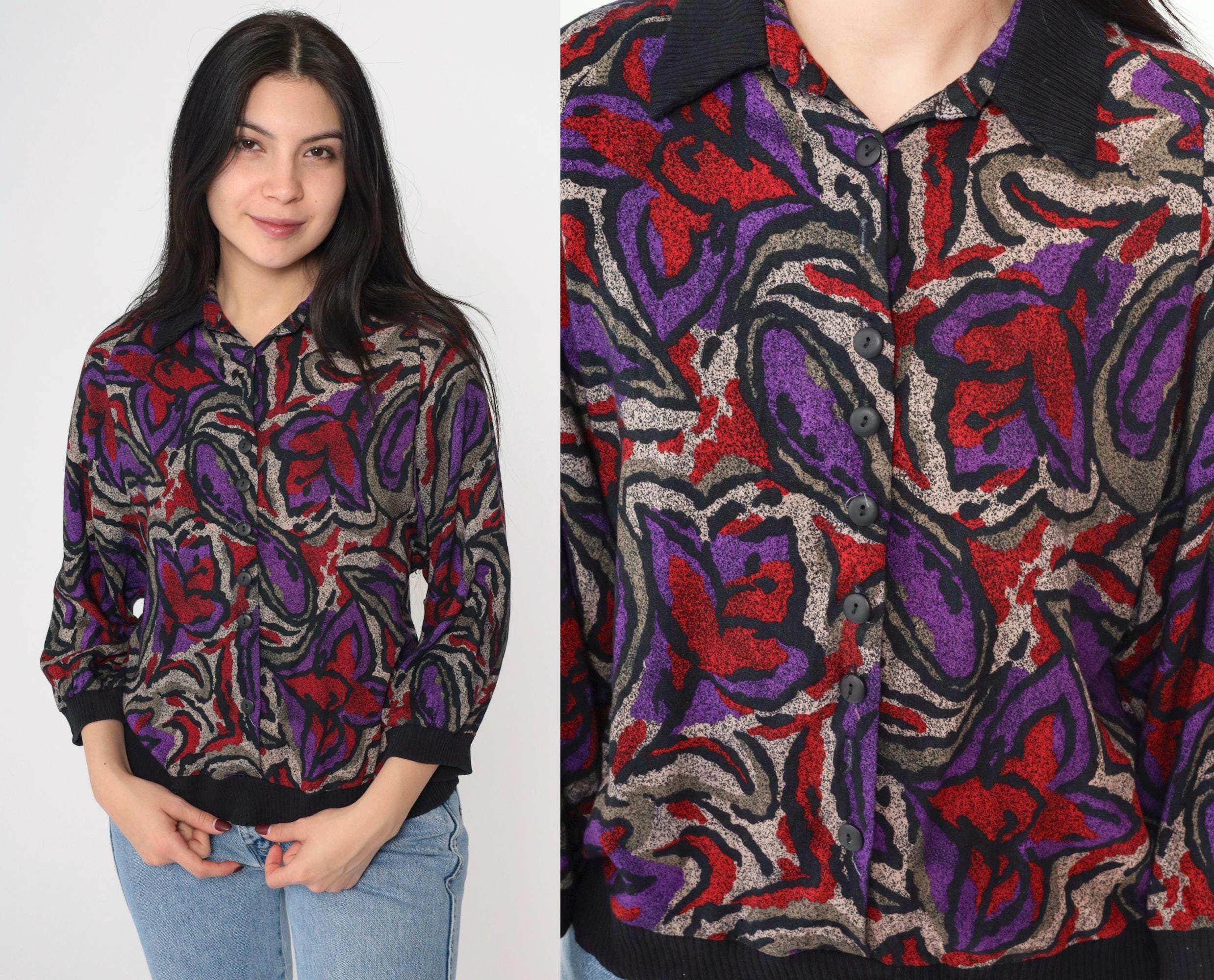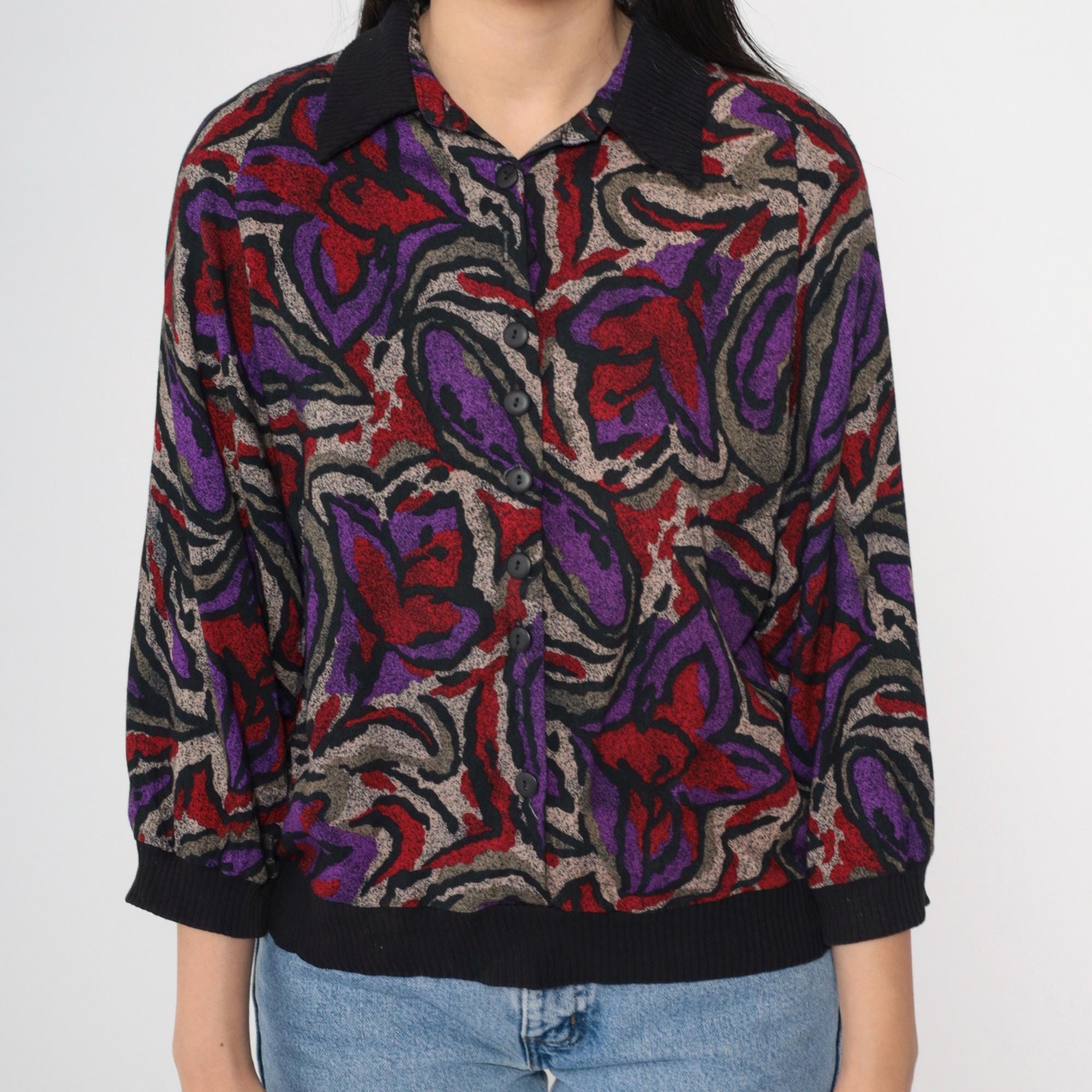 Vintage 90s shirt in an abstract floral print. It has 3/4 long sleeves, a banded hem, and buttons up the front.