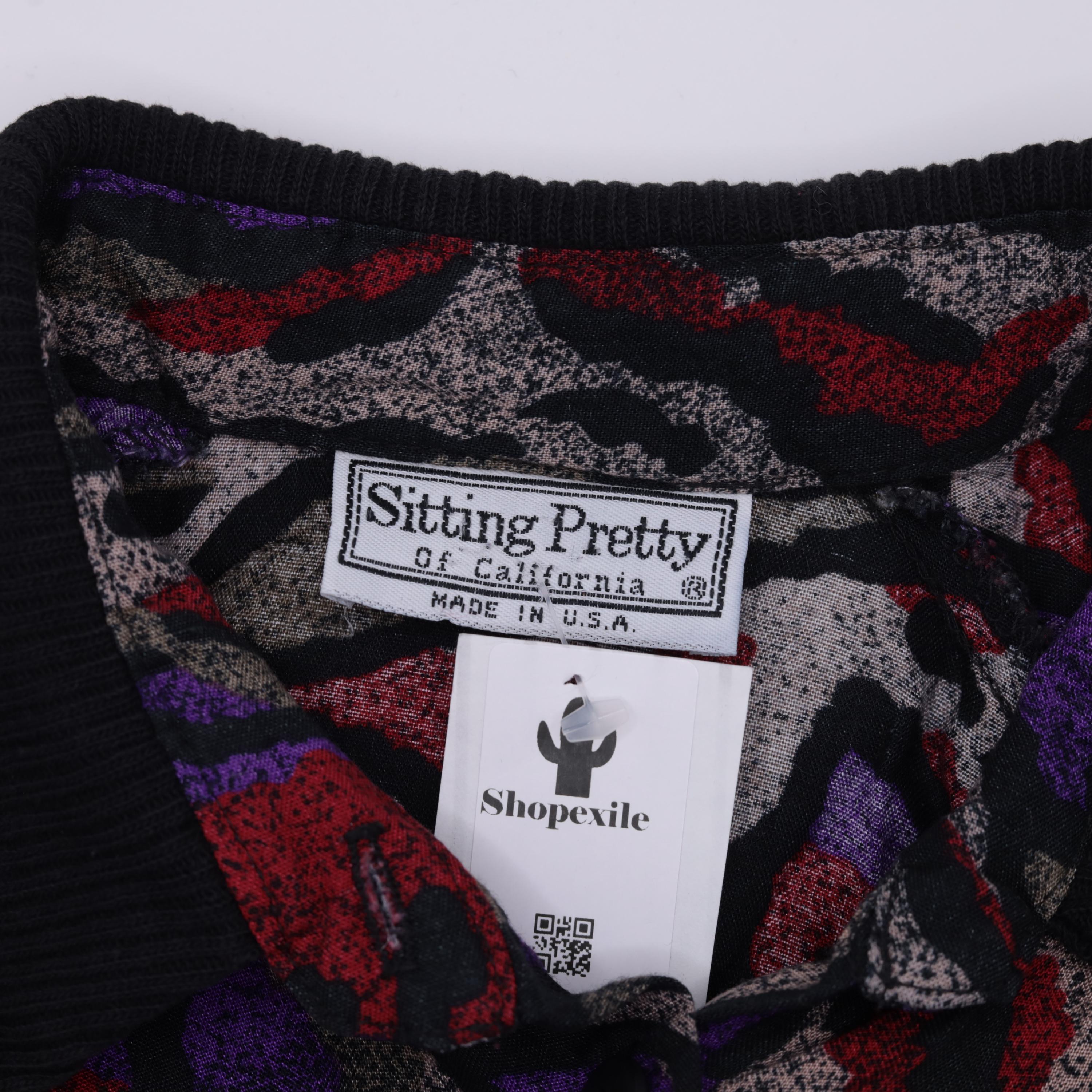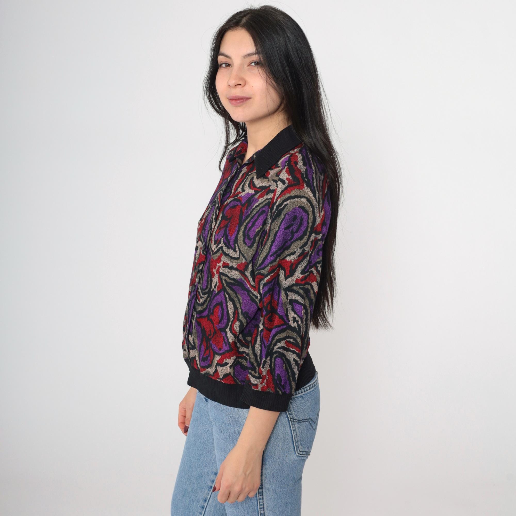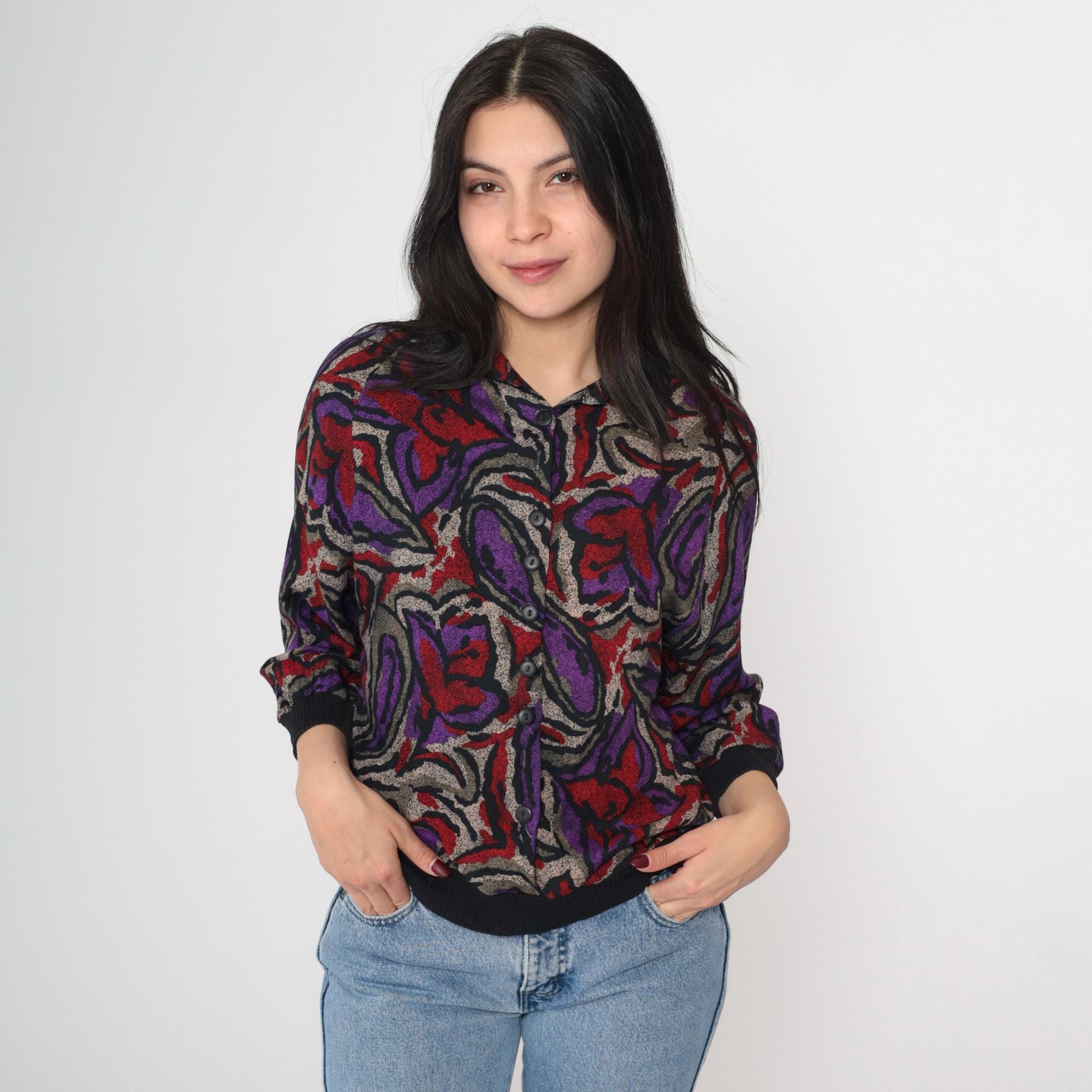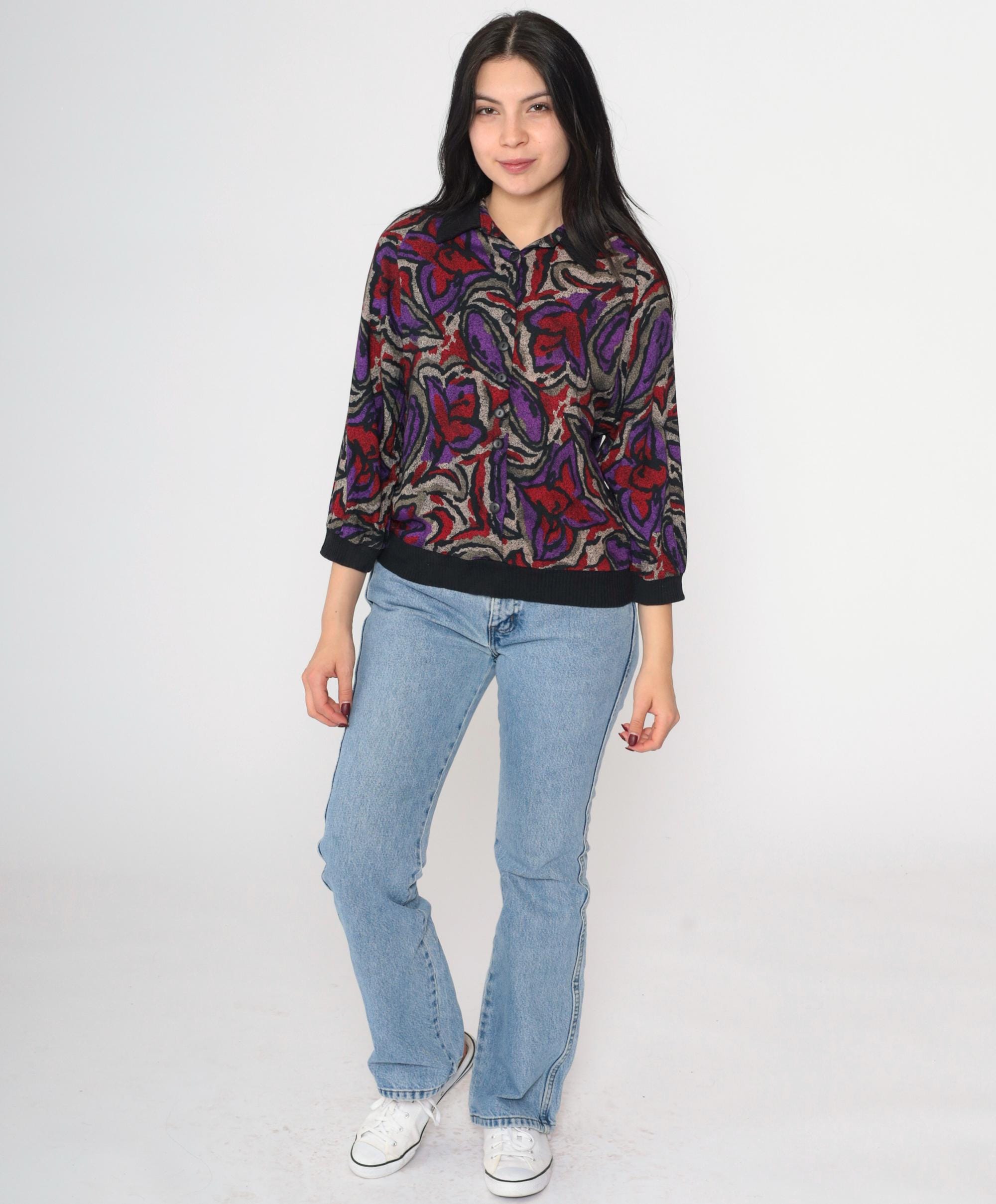 Vintage 90s shirt in an abstract floral print. It has 3/4 long sleeves, a banded hem, and buttons up the front.