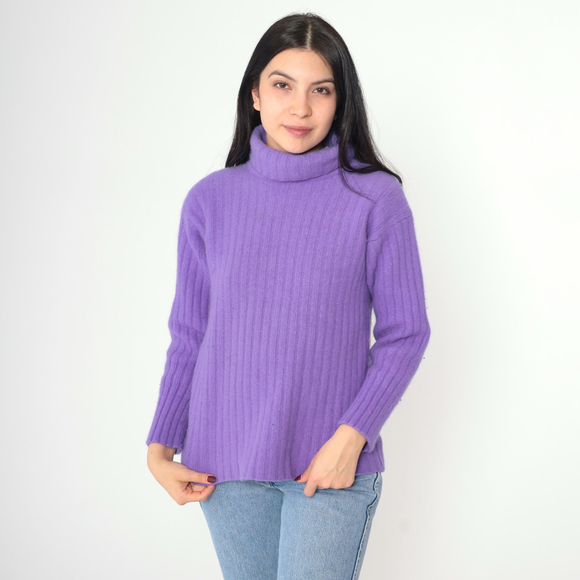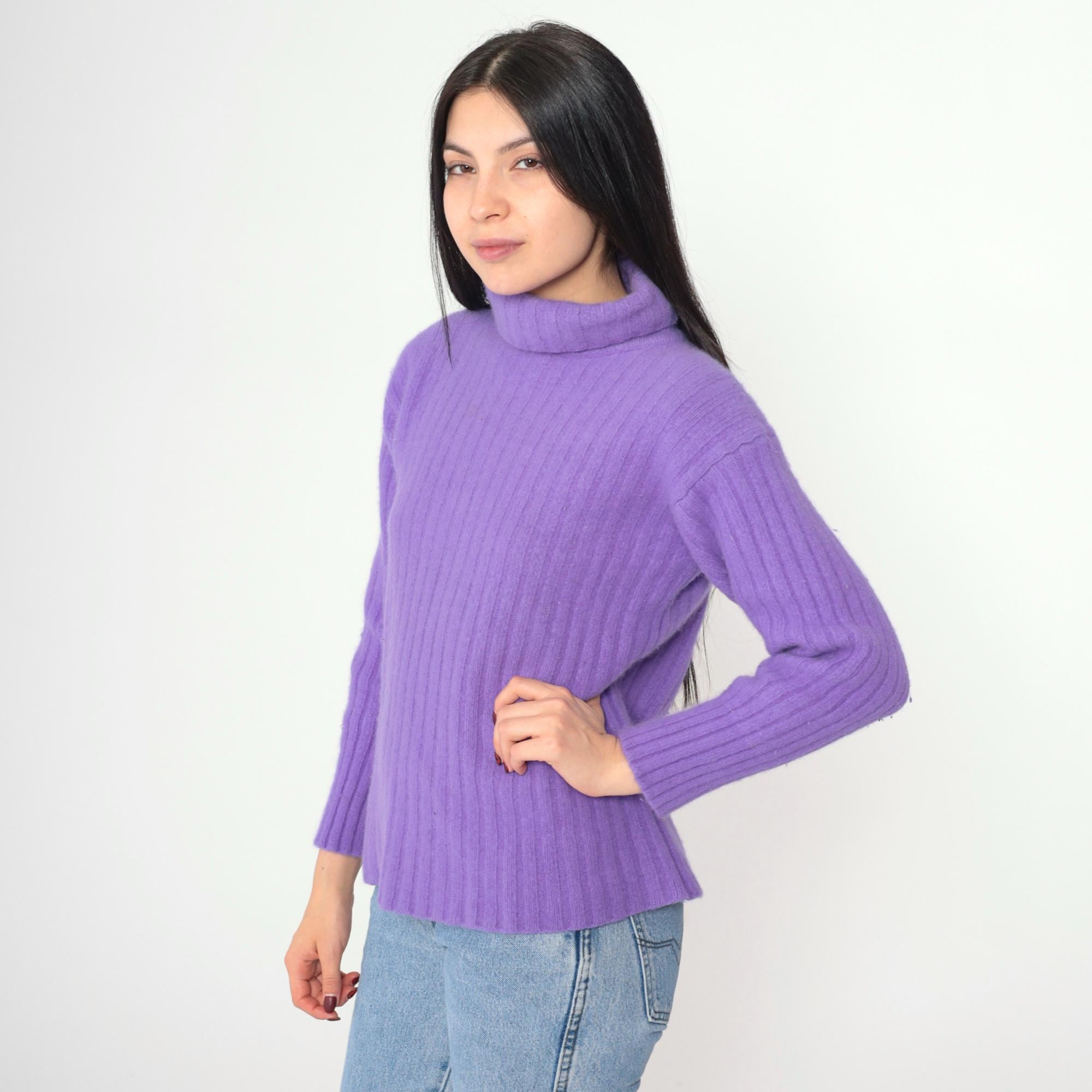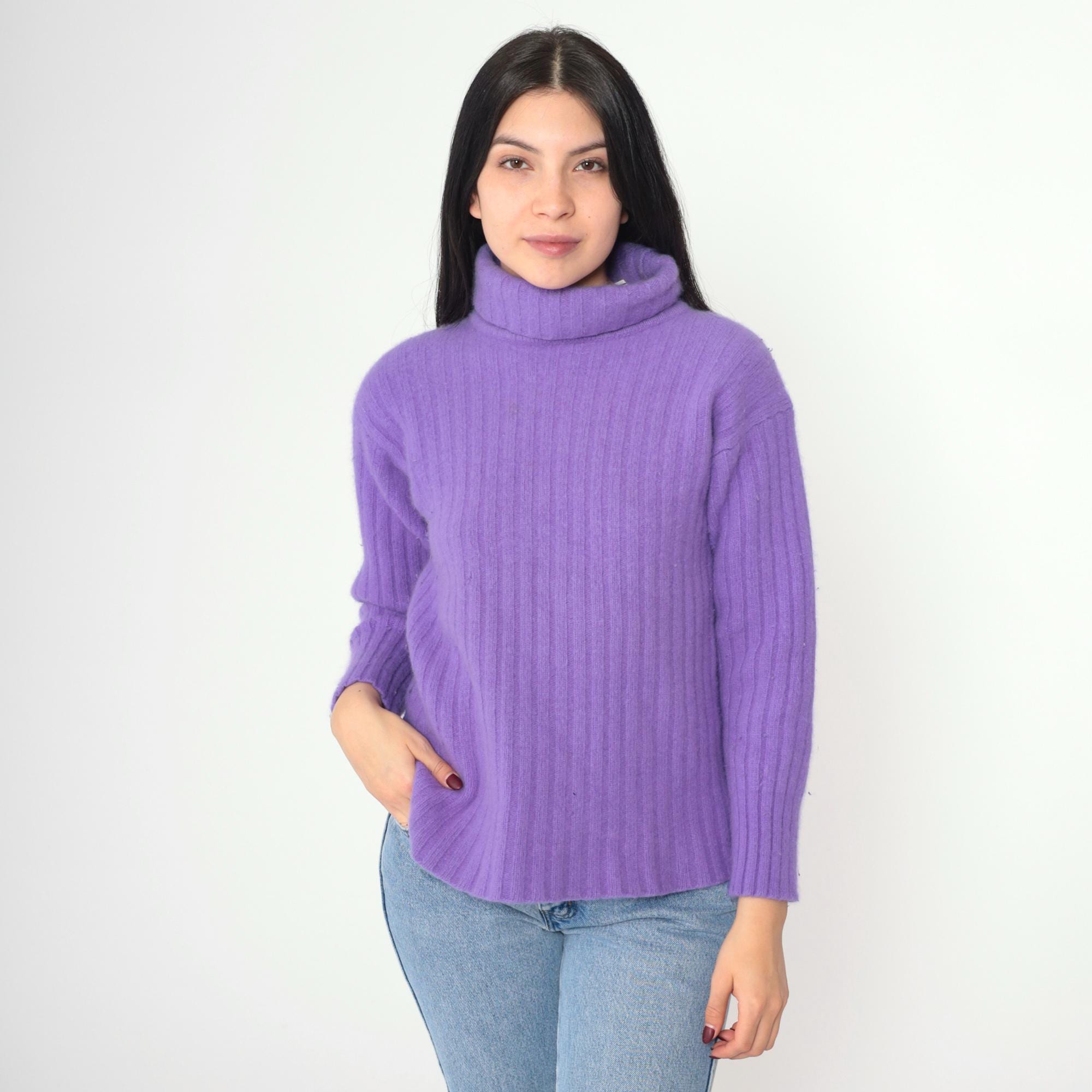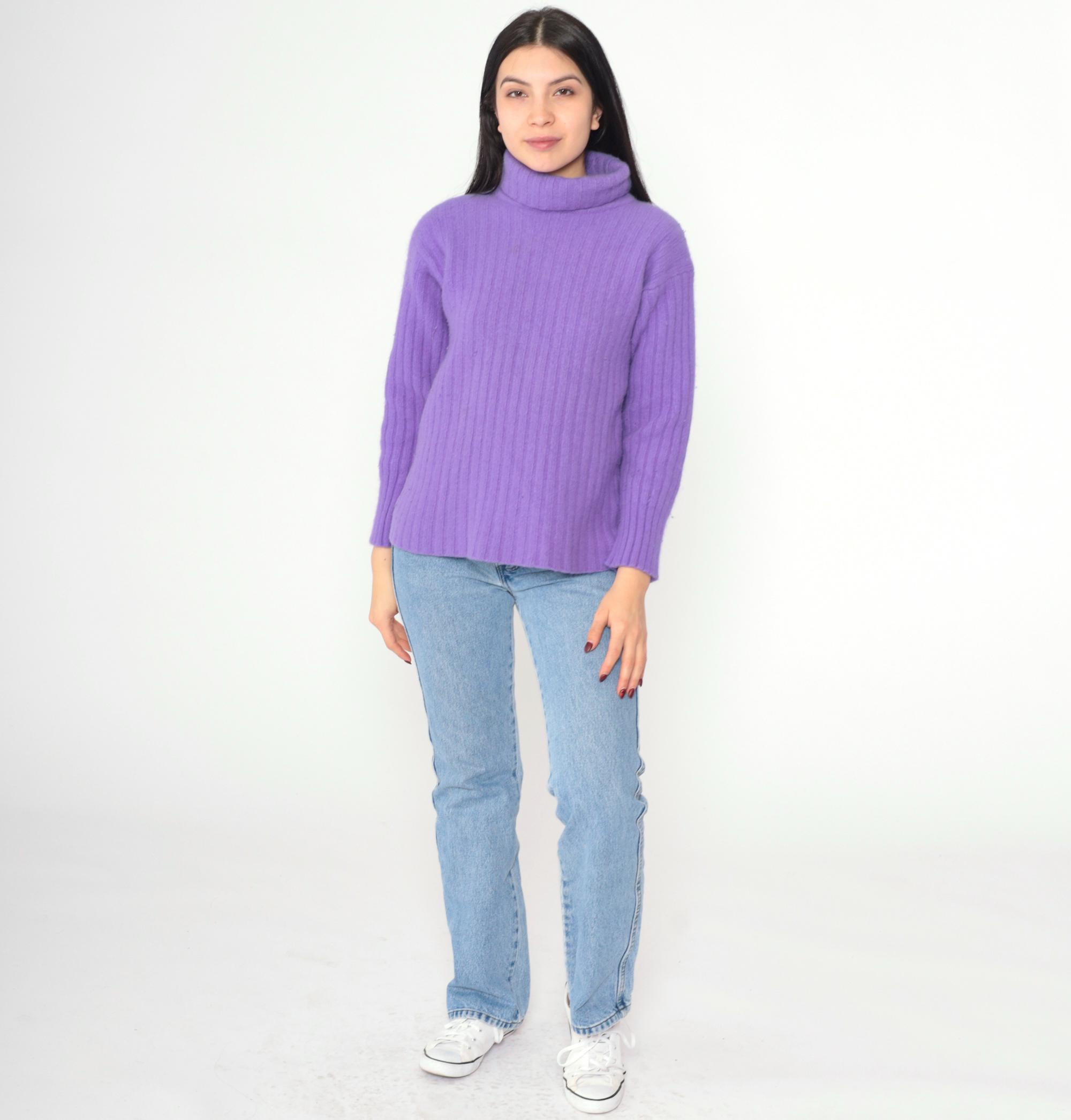 Vintage 90s turtleneck sweater in a lavender purple angora/wool blend. It features a turtleneck, a ribbed texture and long sleeves.