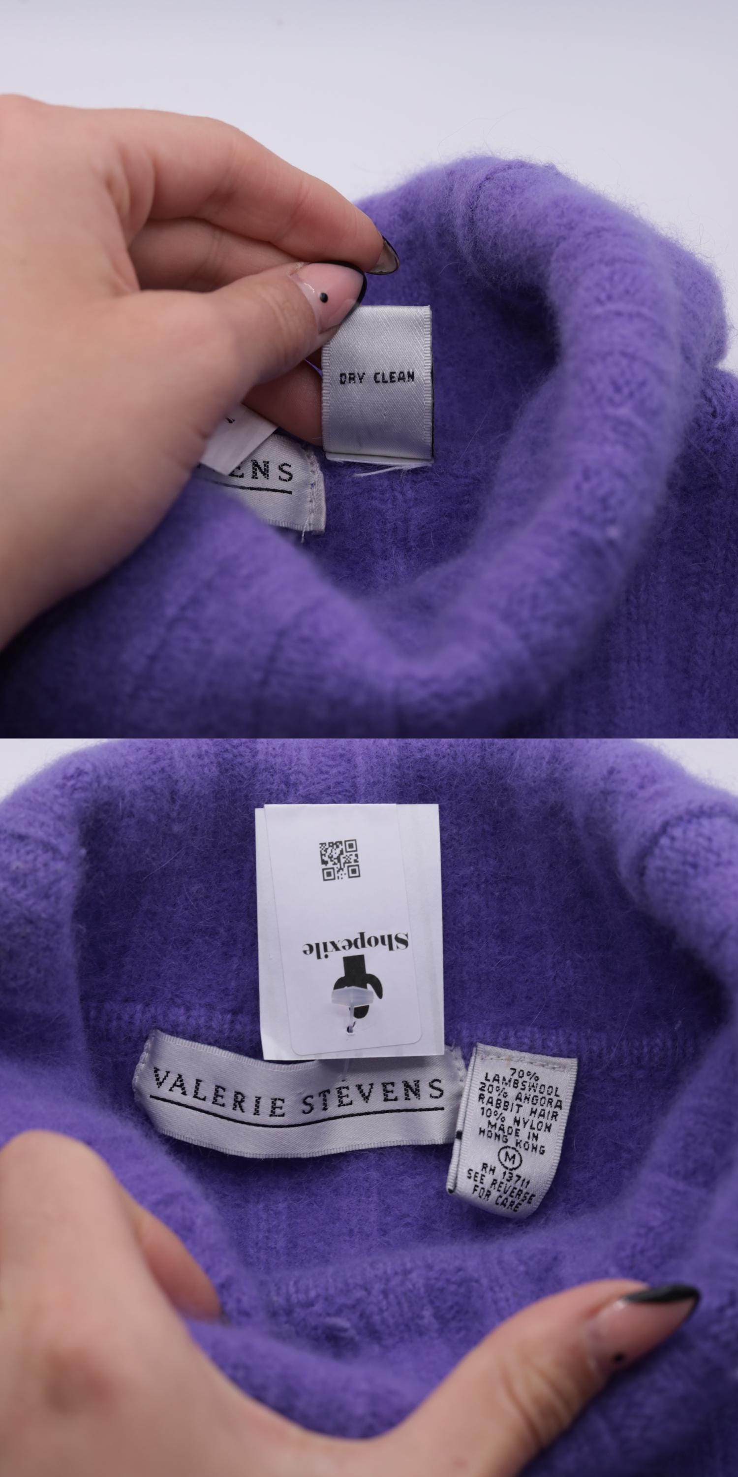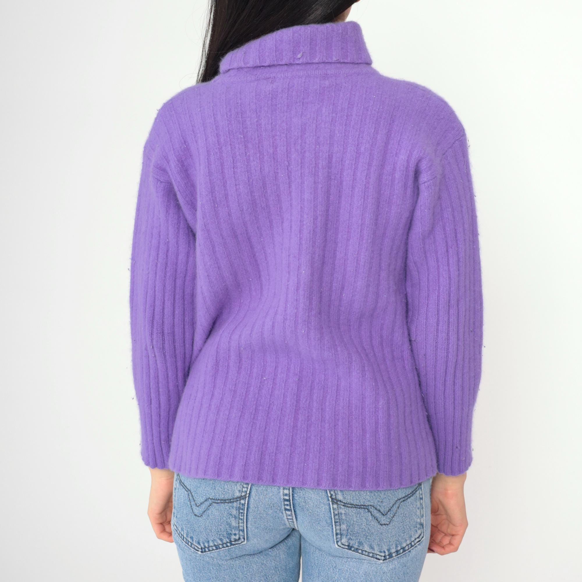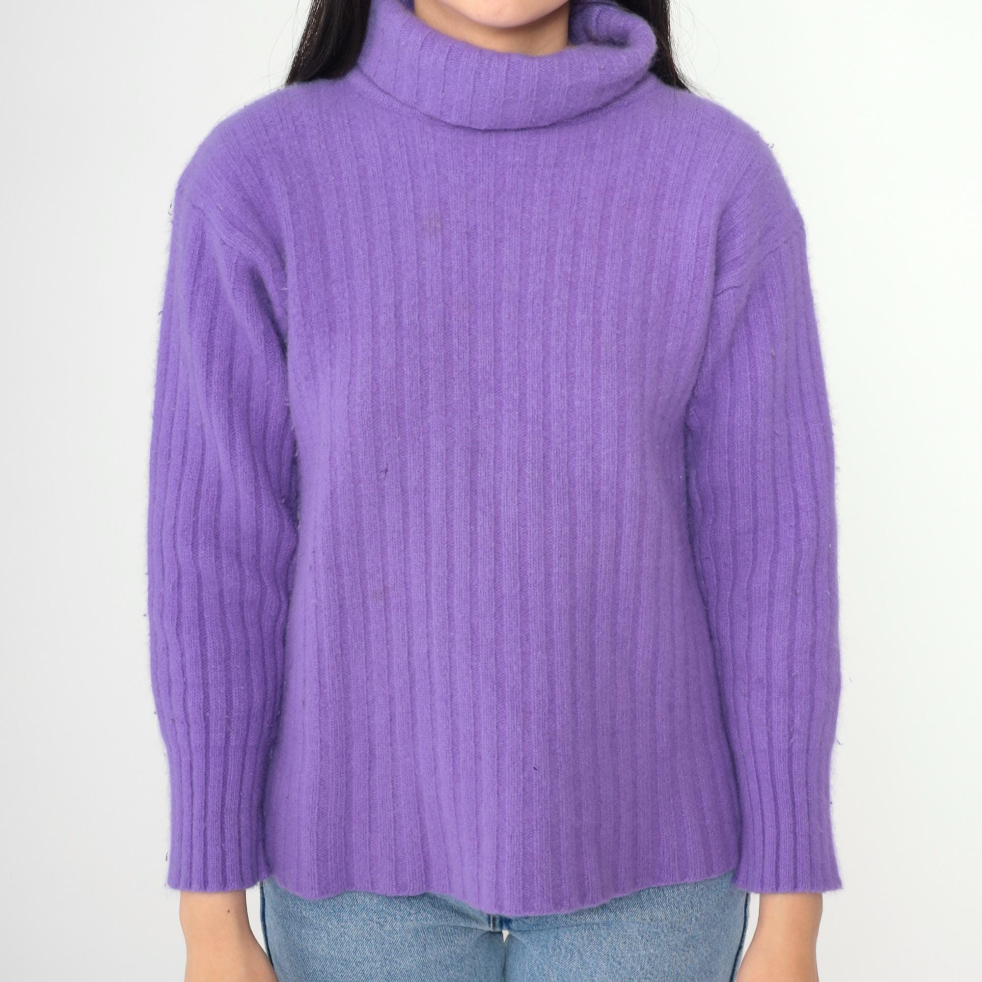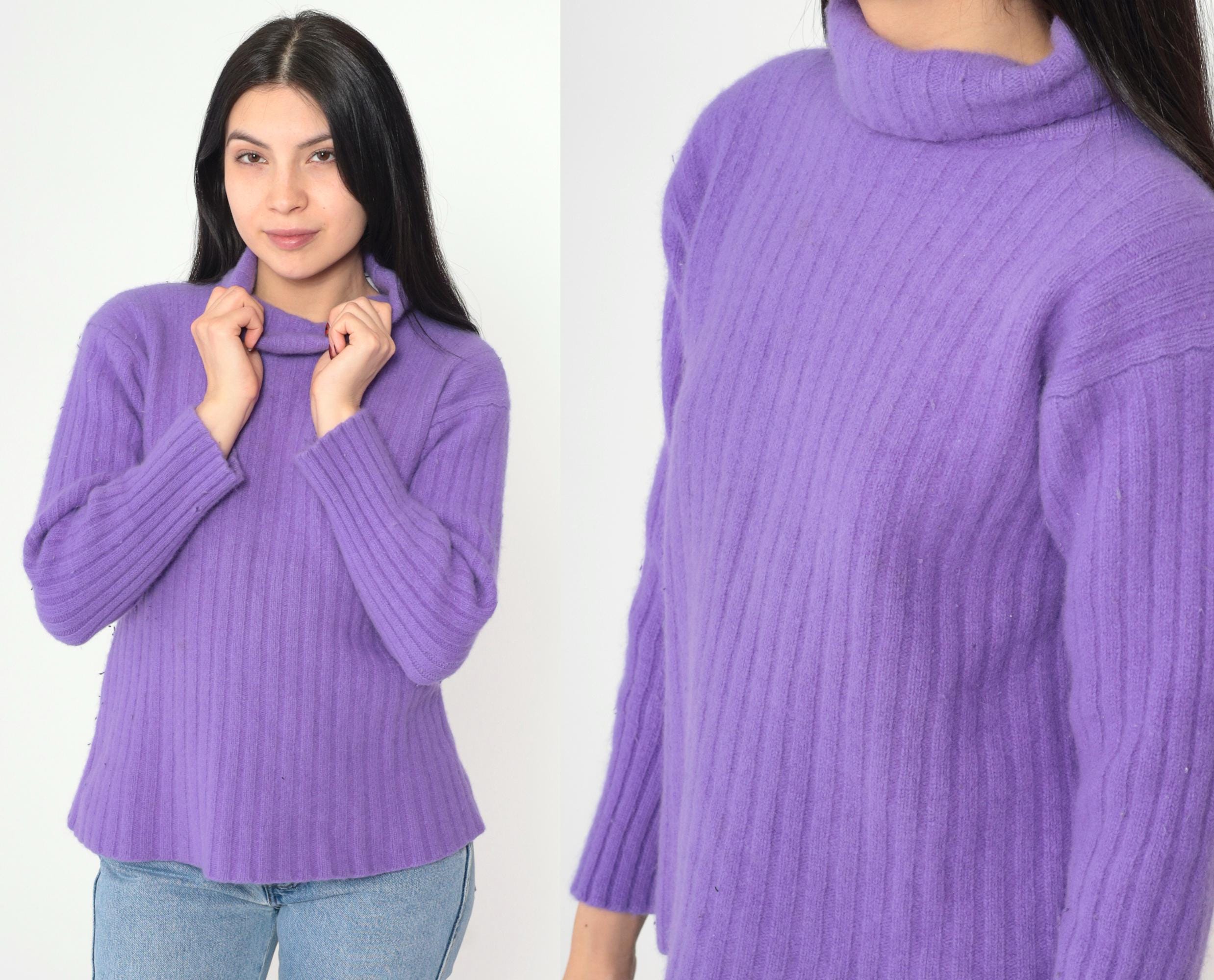 Vintage 90s turtleneck sweater in a lavender purple angora/wool blend. It features a turtleneck, a ribbed texture and long sleeves.