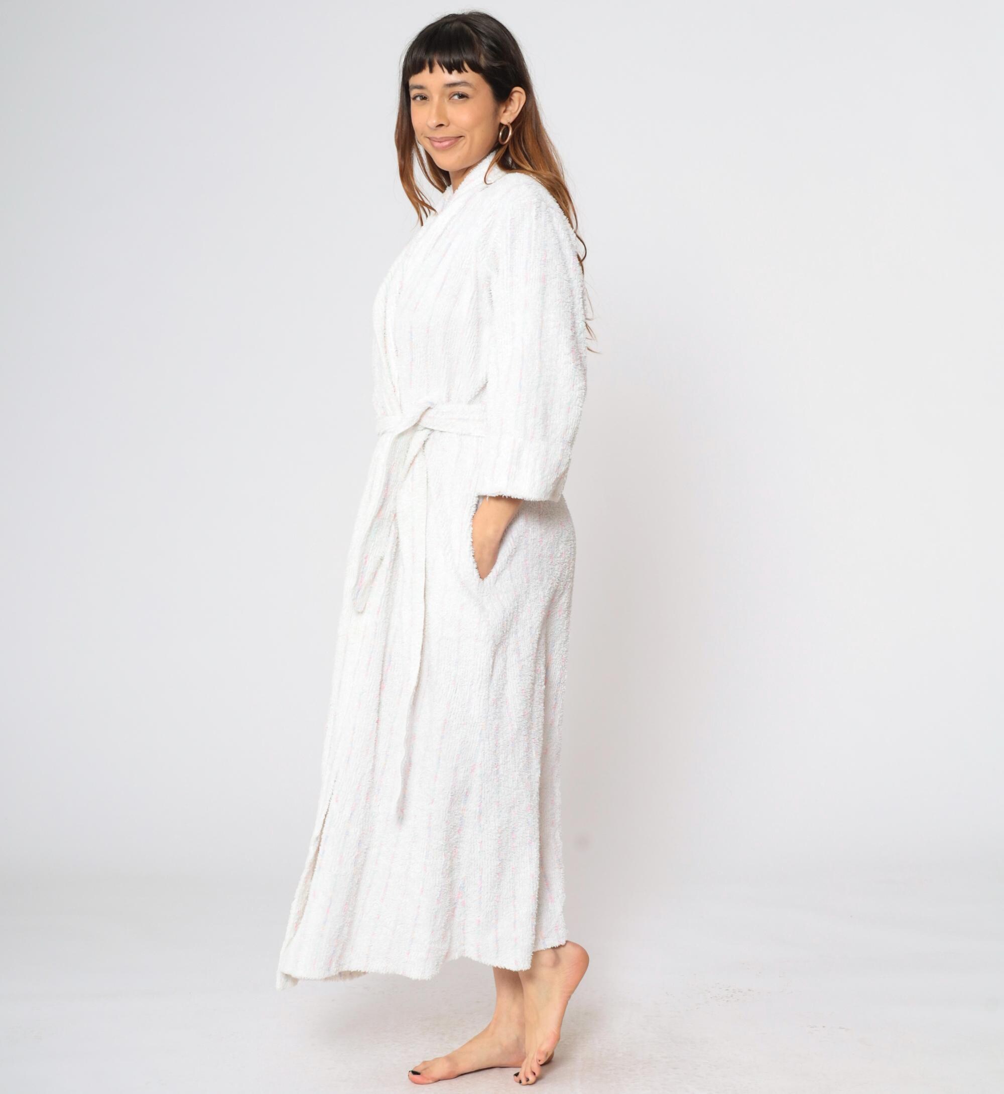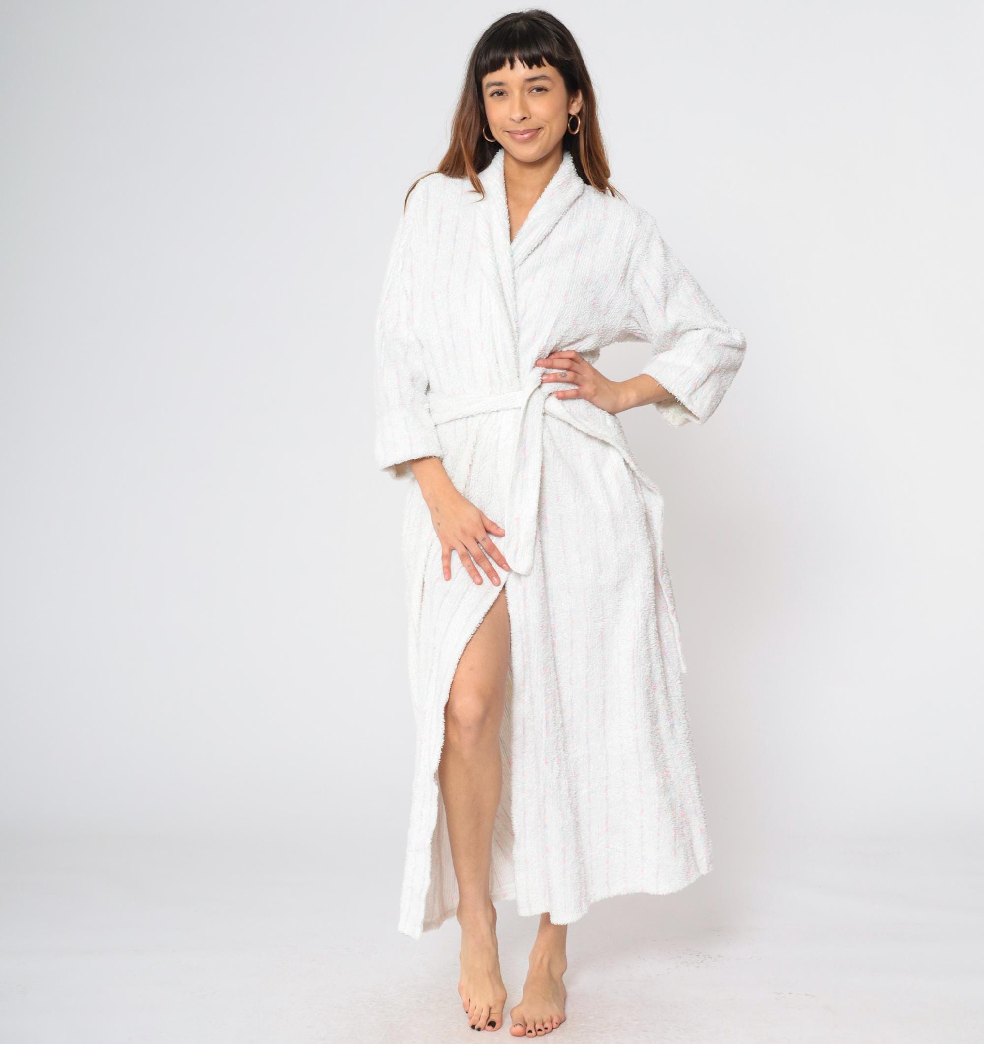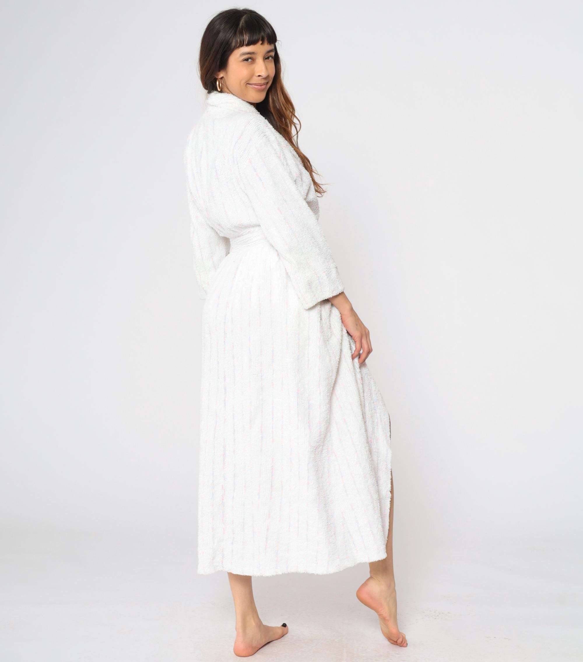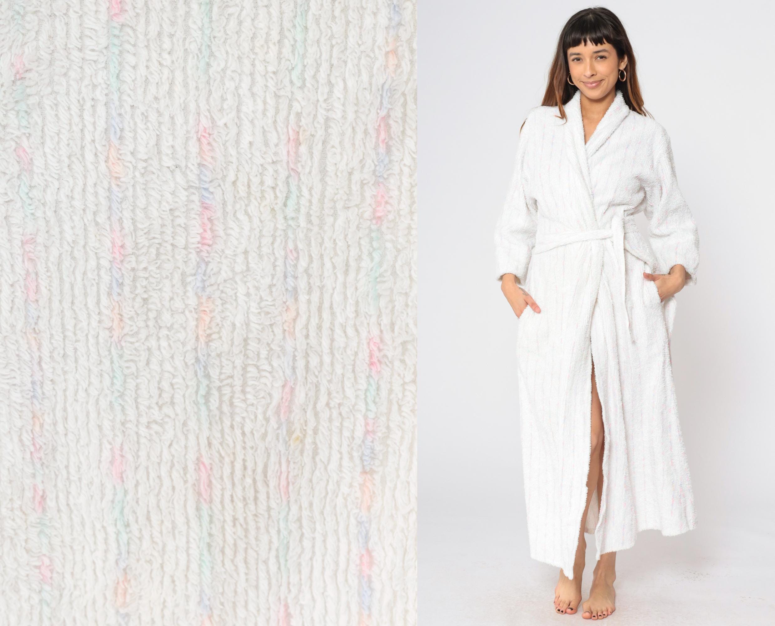 Vintage 80s robe in white terry cloth with a pink, blue and turquoise dotted line print. Wrap cut with long sleeves and a belt.