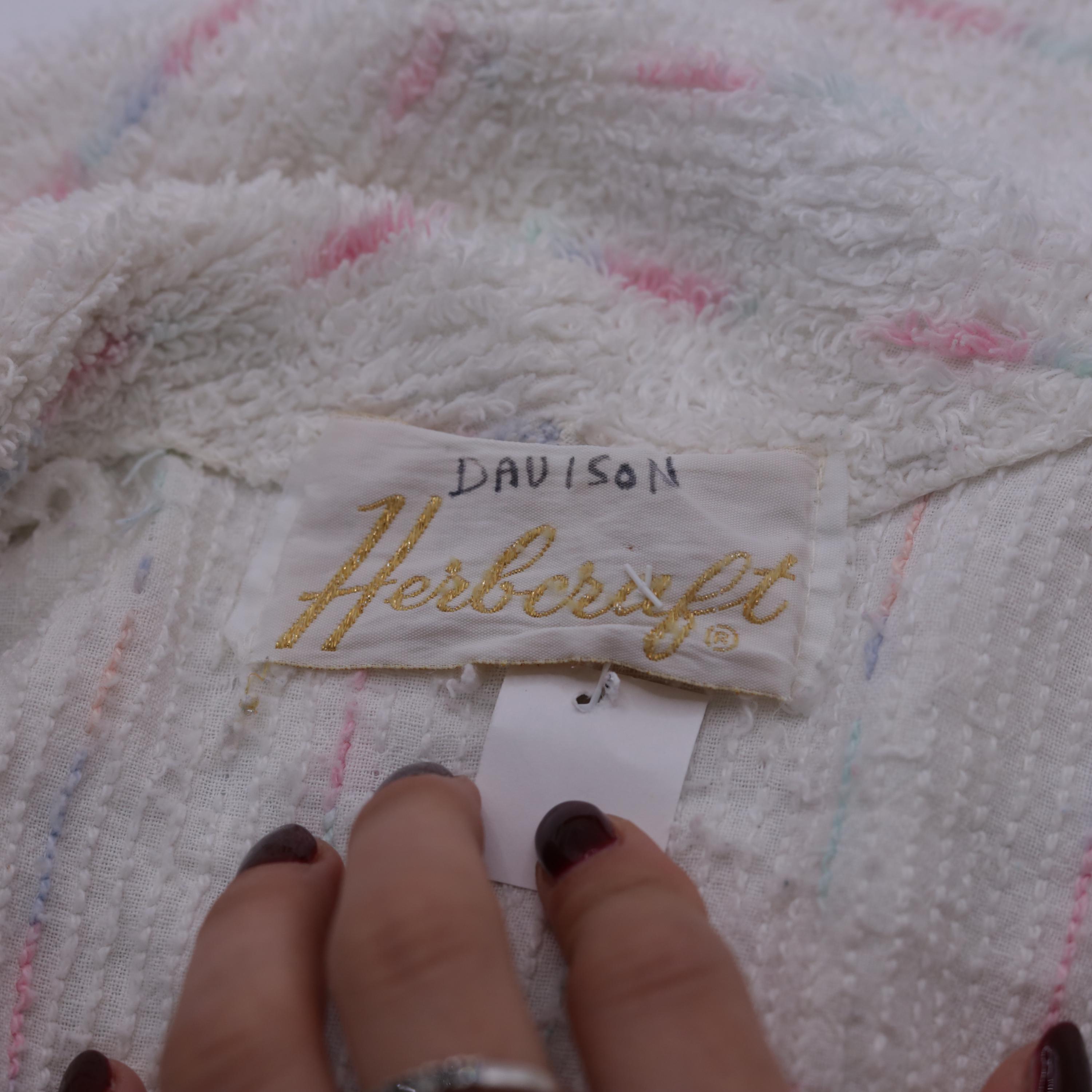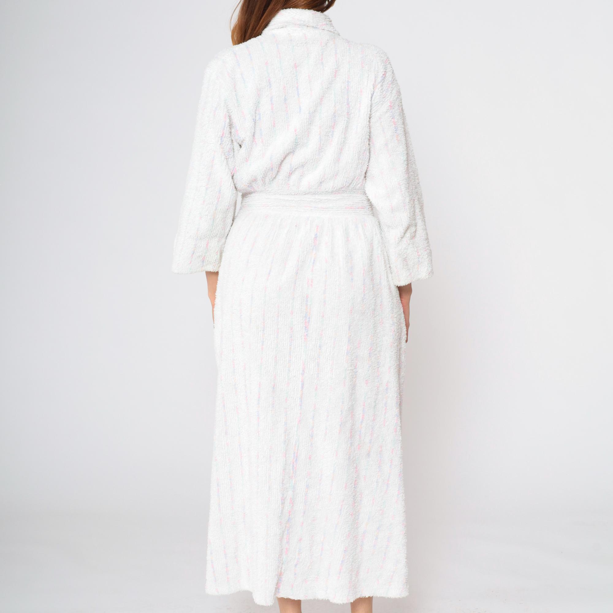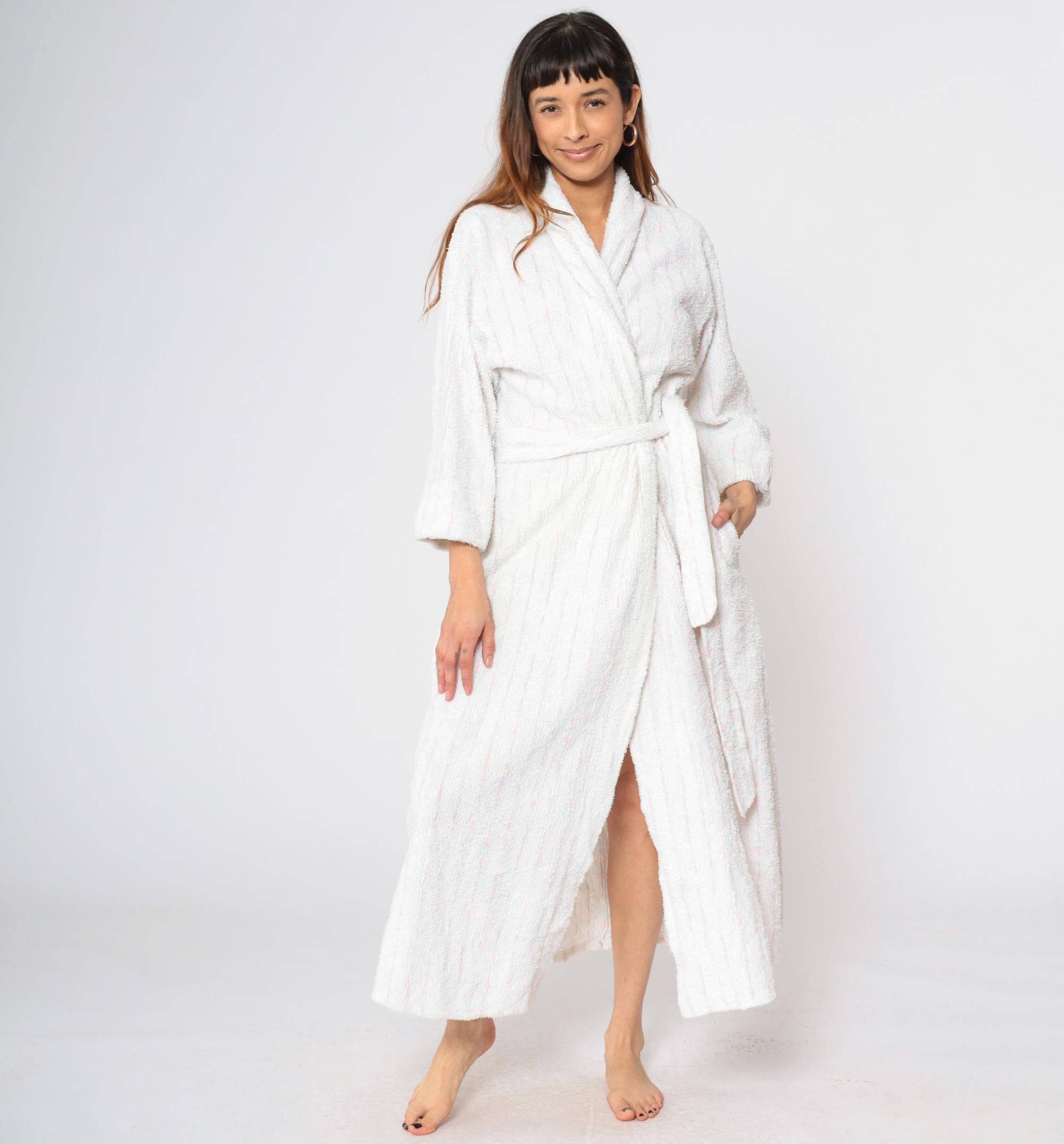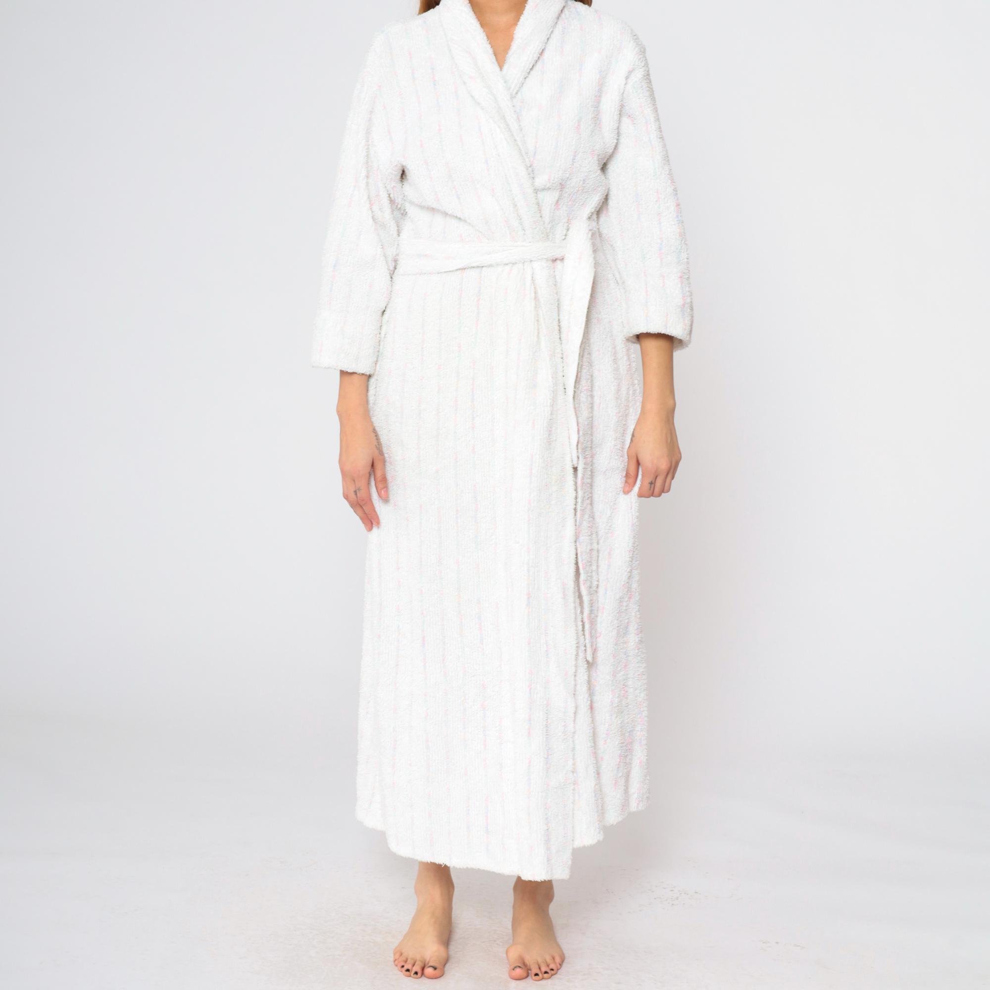 Vintage 80s robe in white terry cloth with a pink, blue and turquoise dotted line print. Wrap cut with long sleeves and a belt.