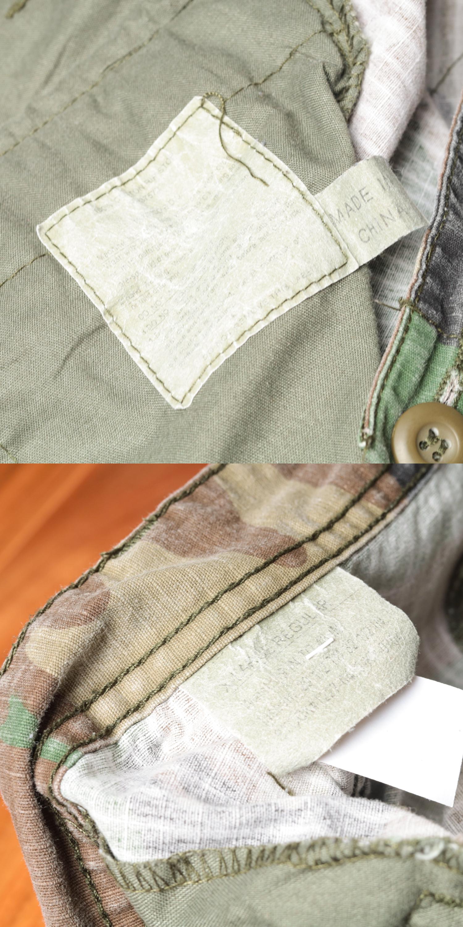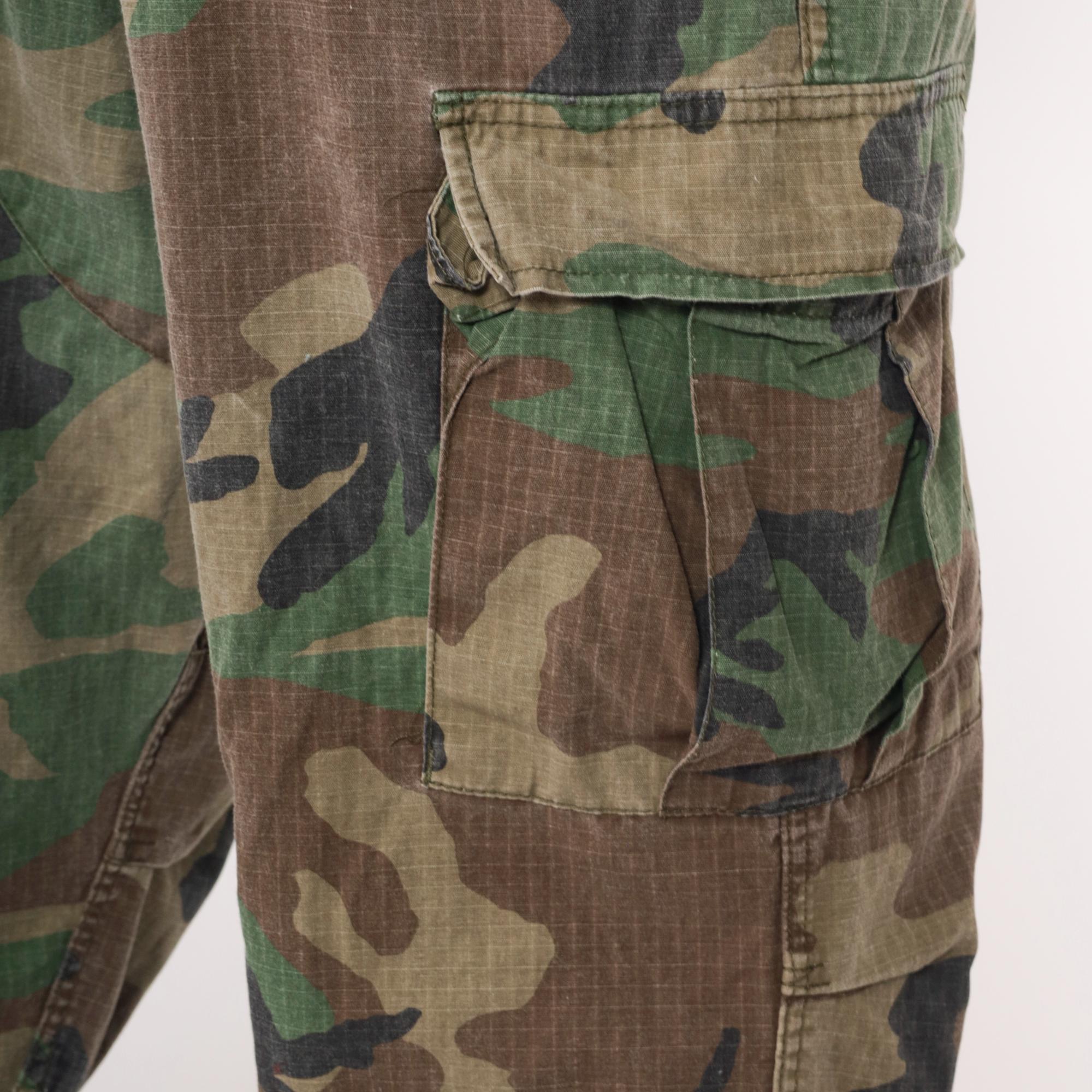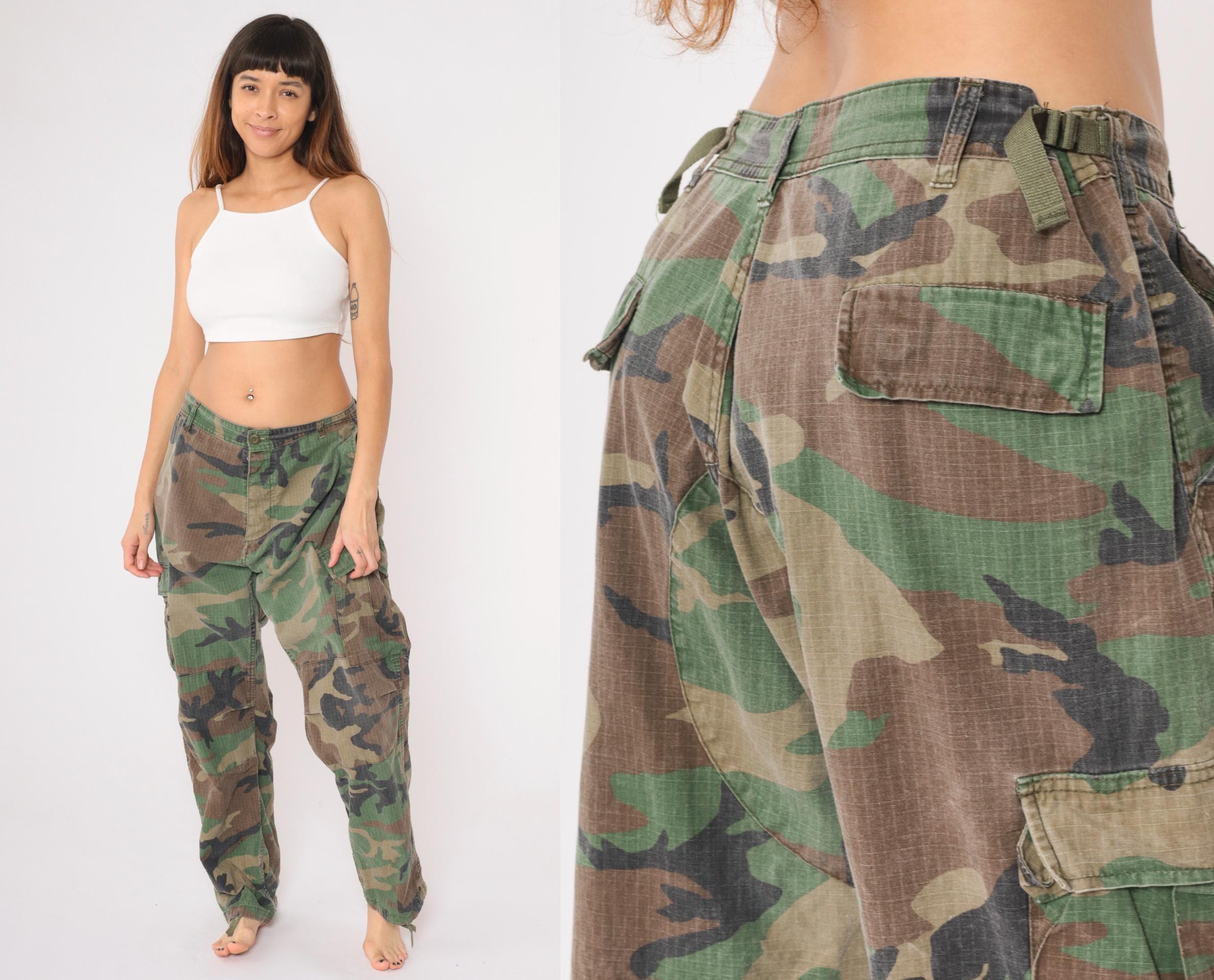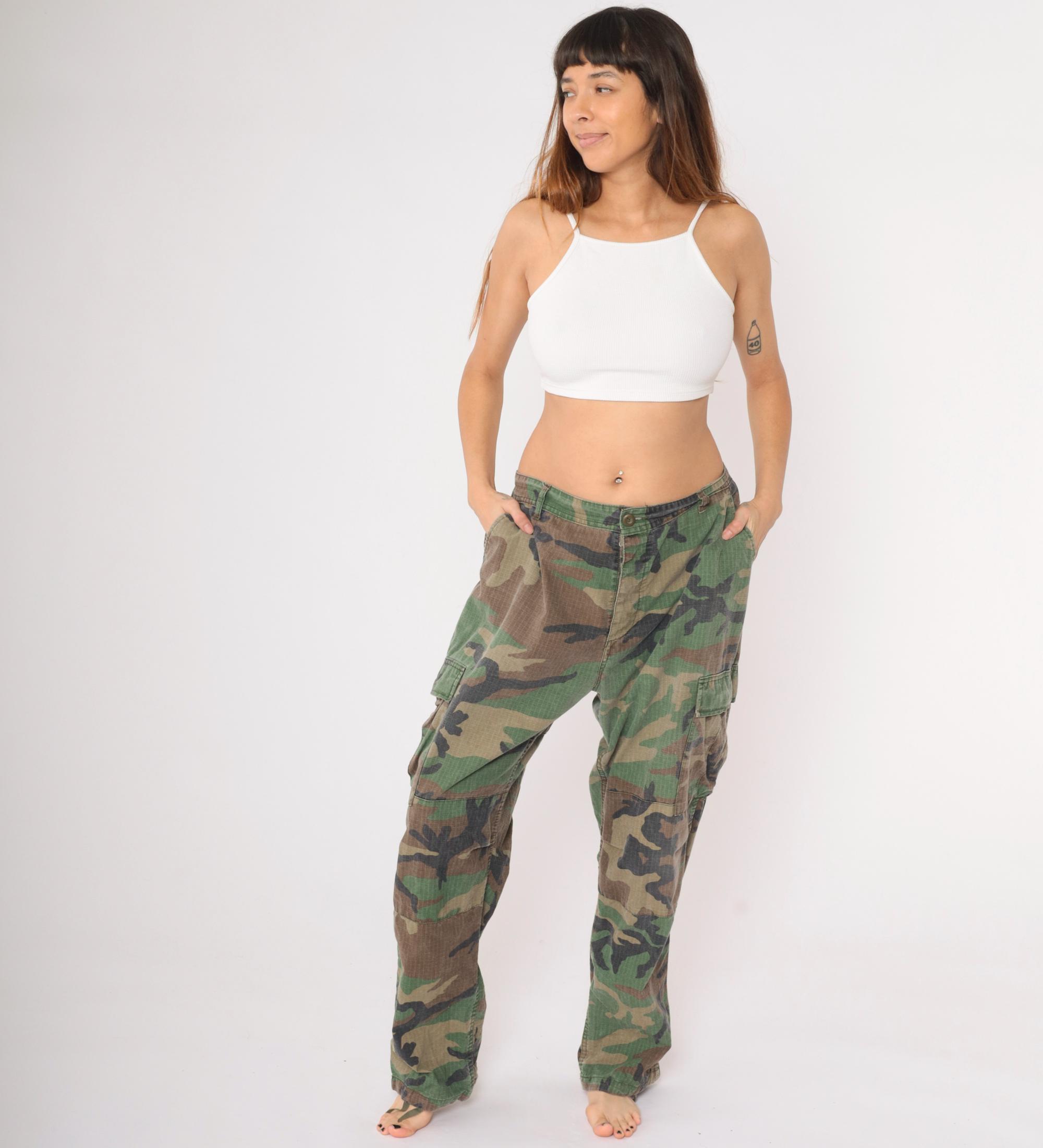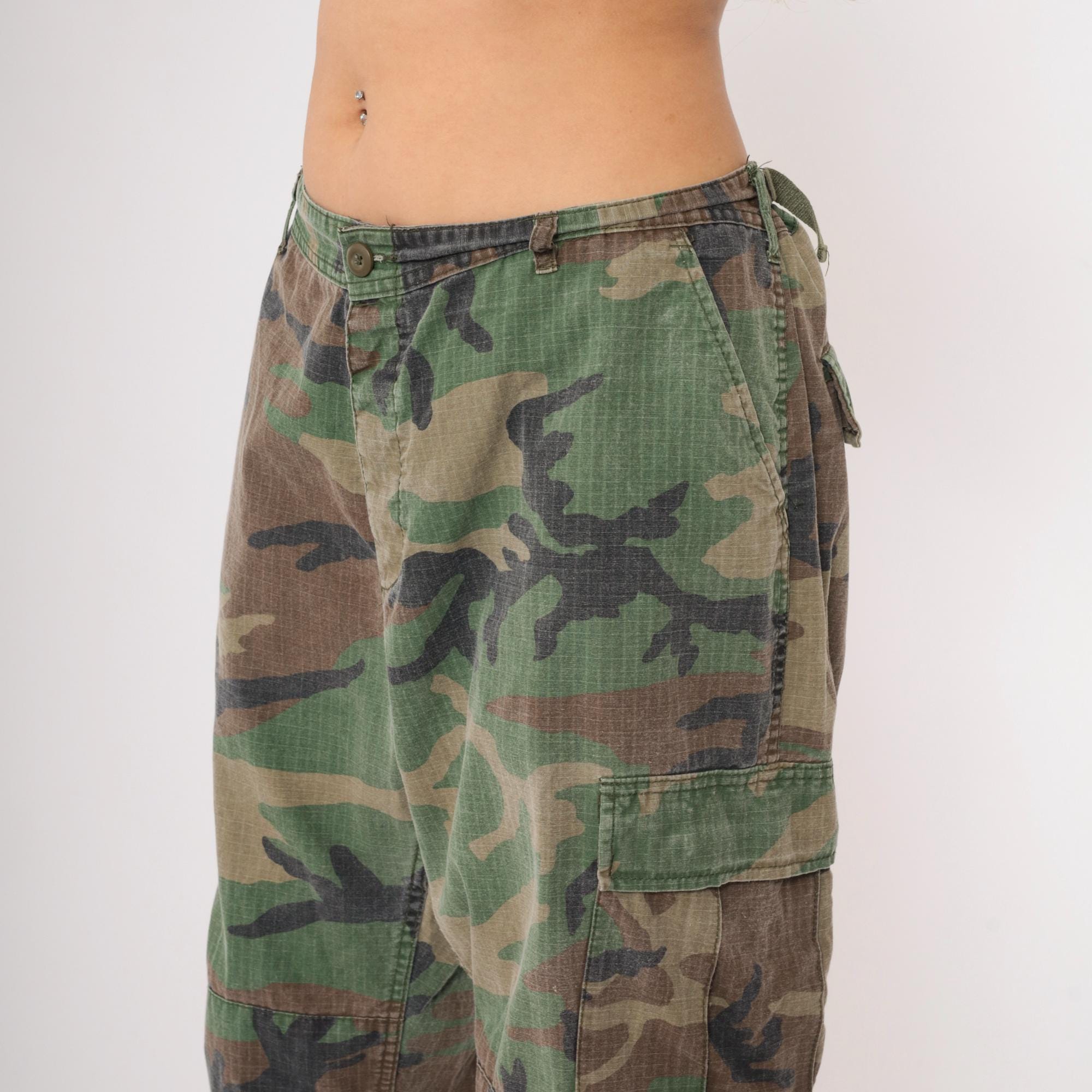 Vintage 90s cargo pants in an army green camo print with cargo pockets, adjustable buckles at the waist, and drawstring ankles.