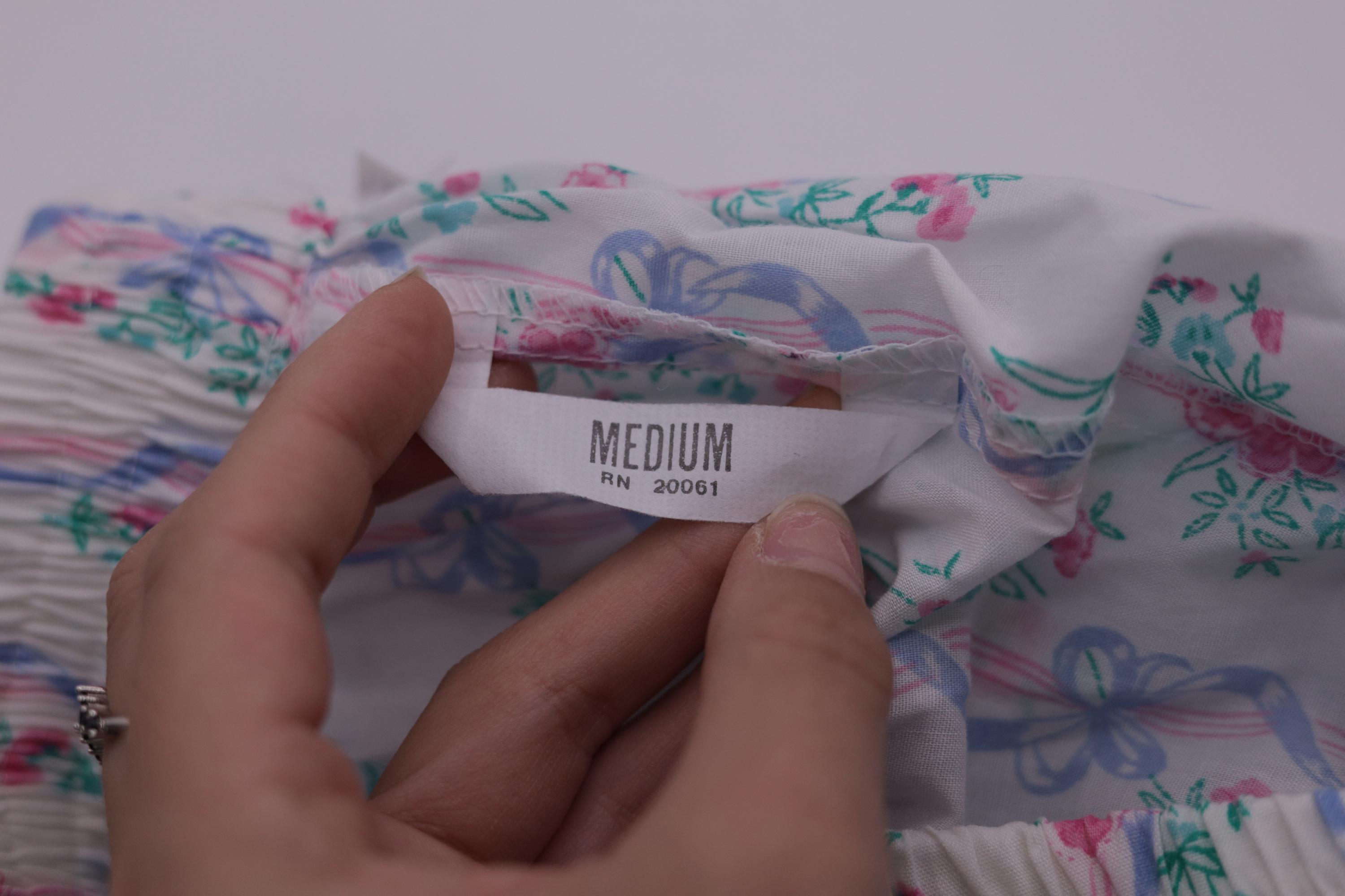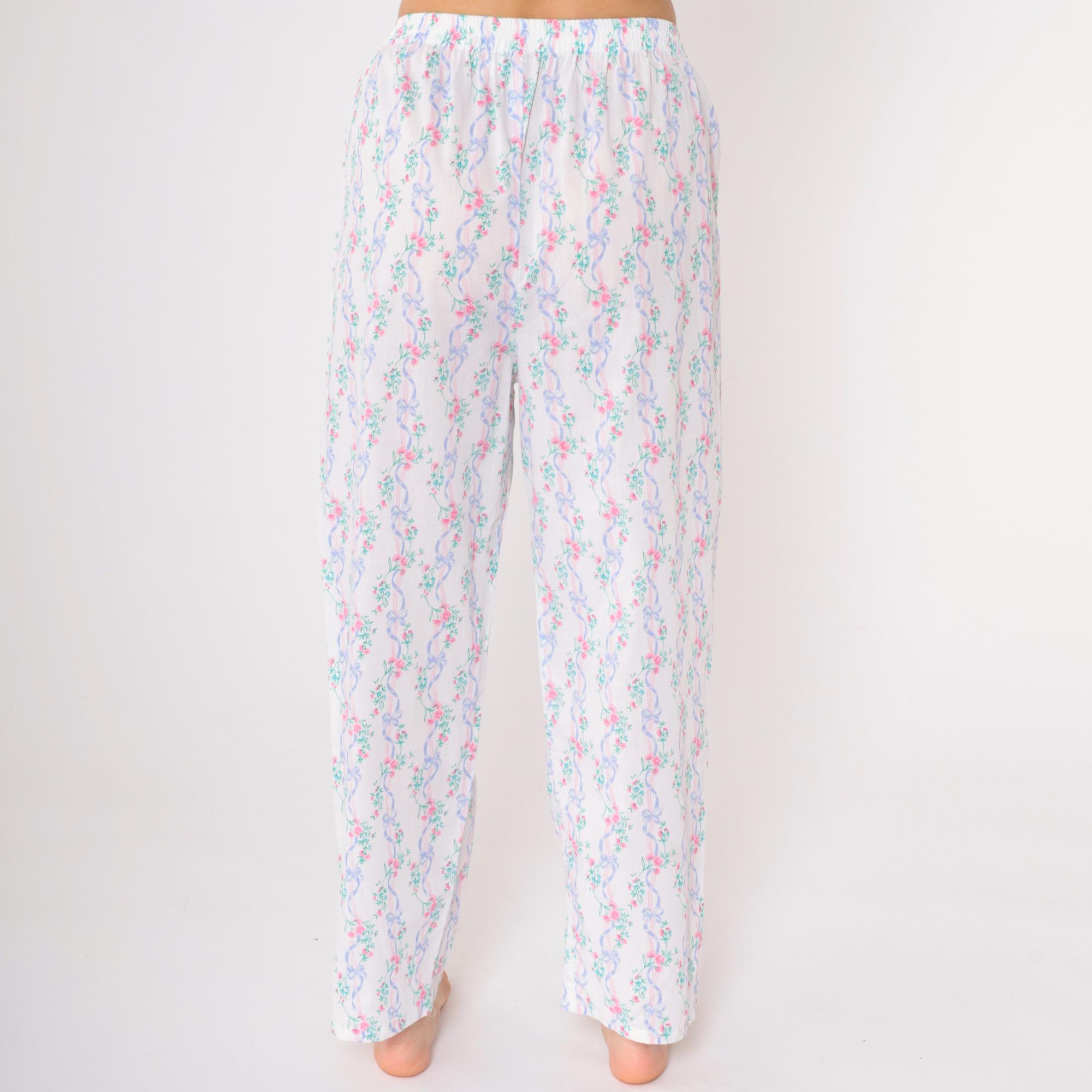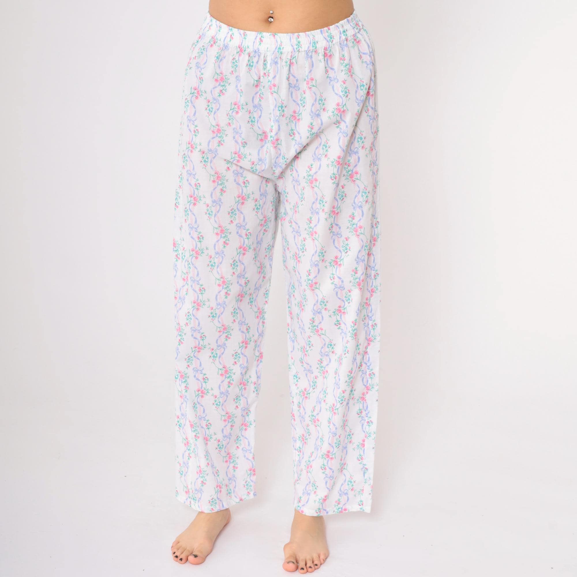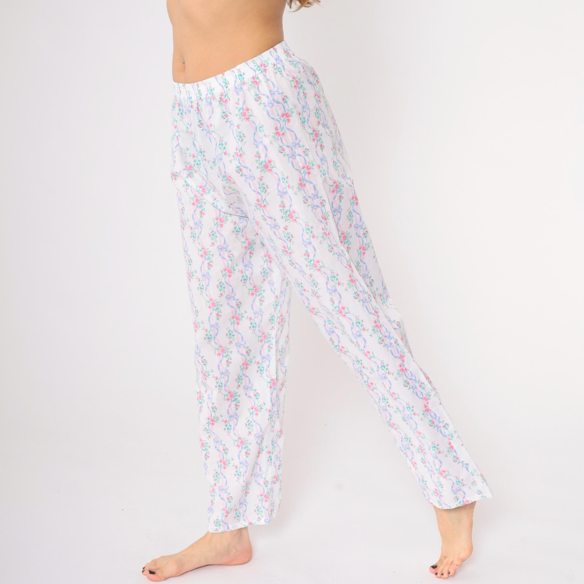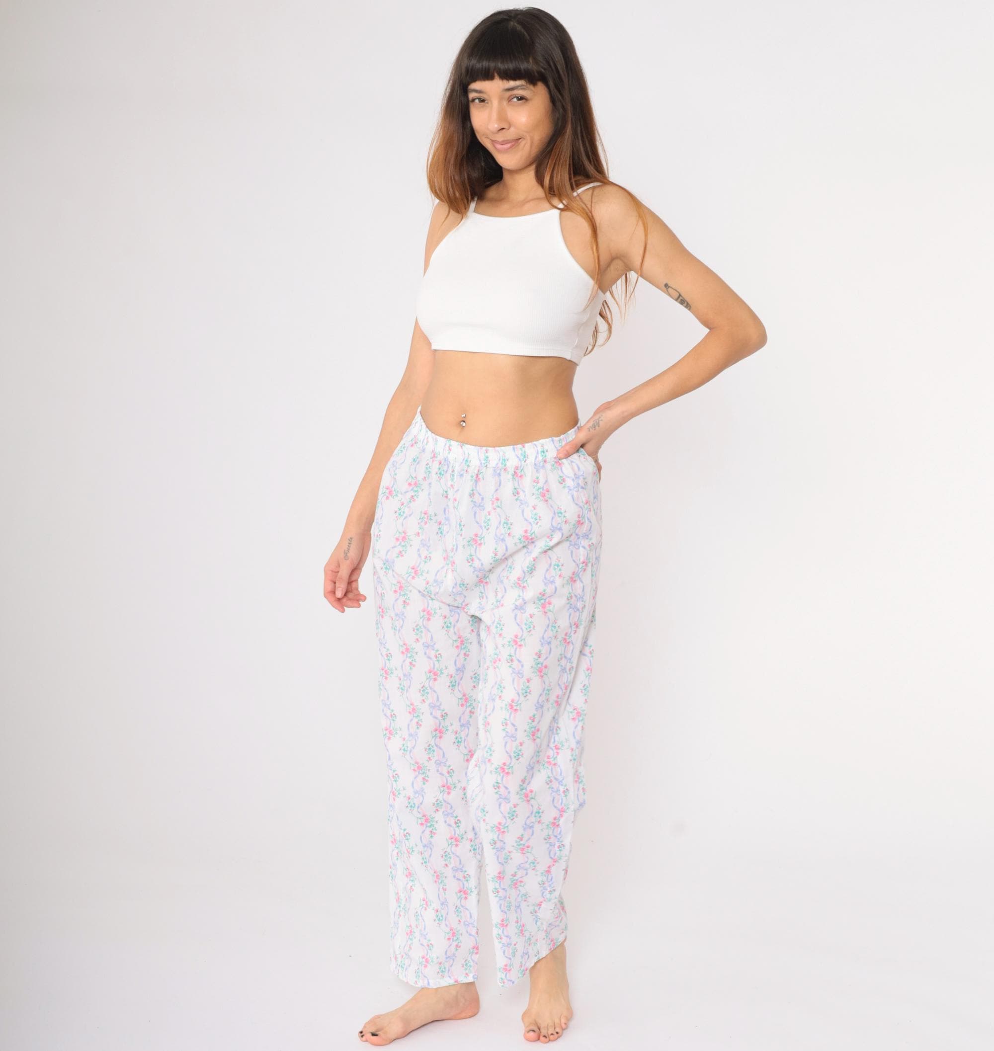 Vintage 80s pajama pants in white with a floral ribbon print. They feature a straight leg and an elastic waist.