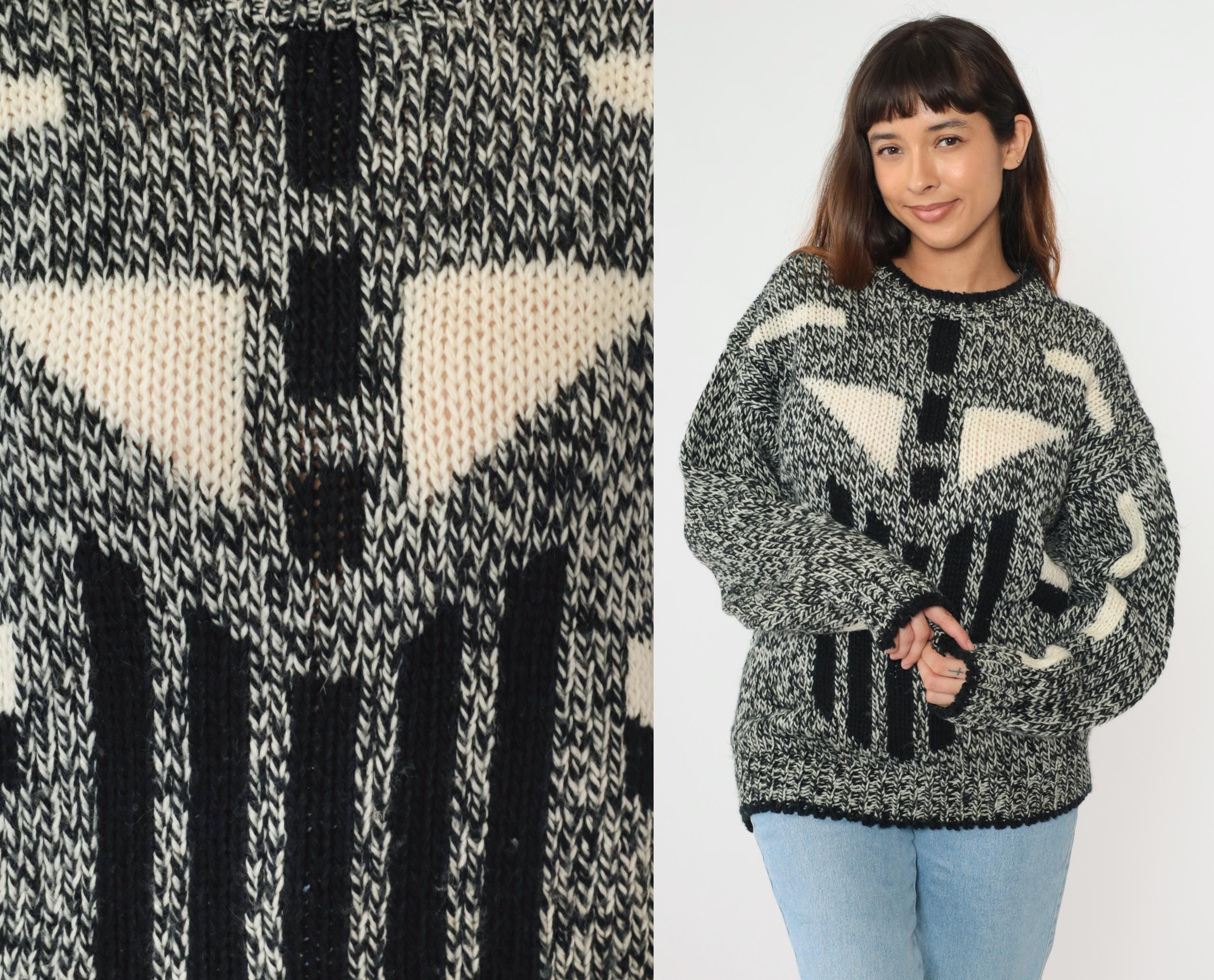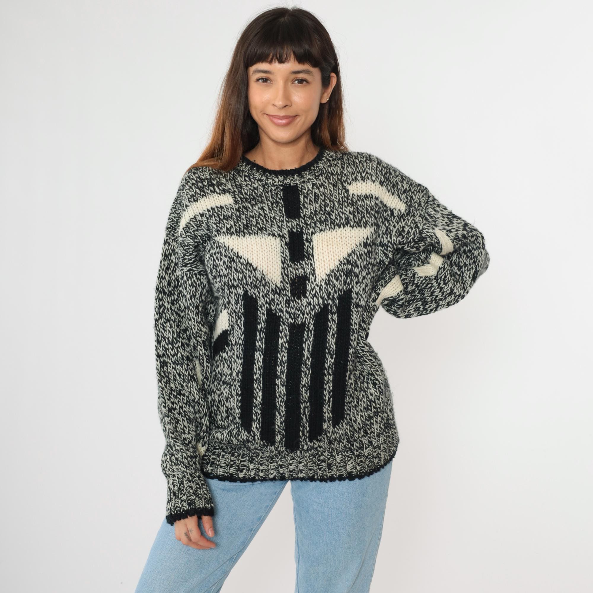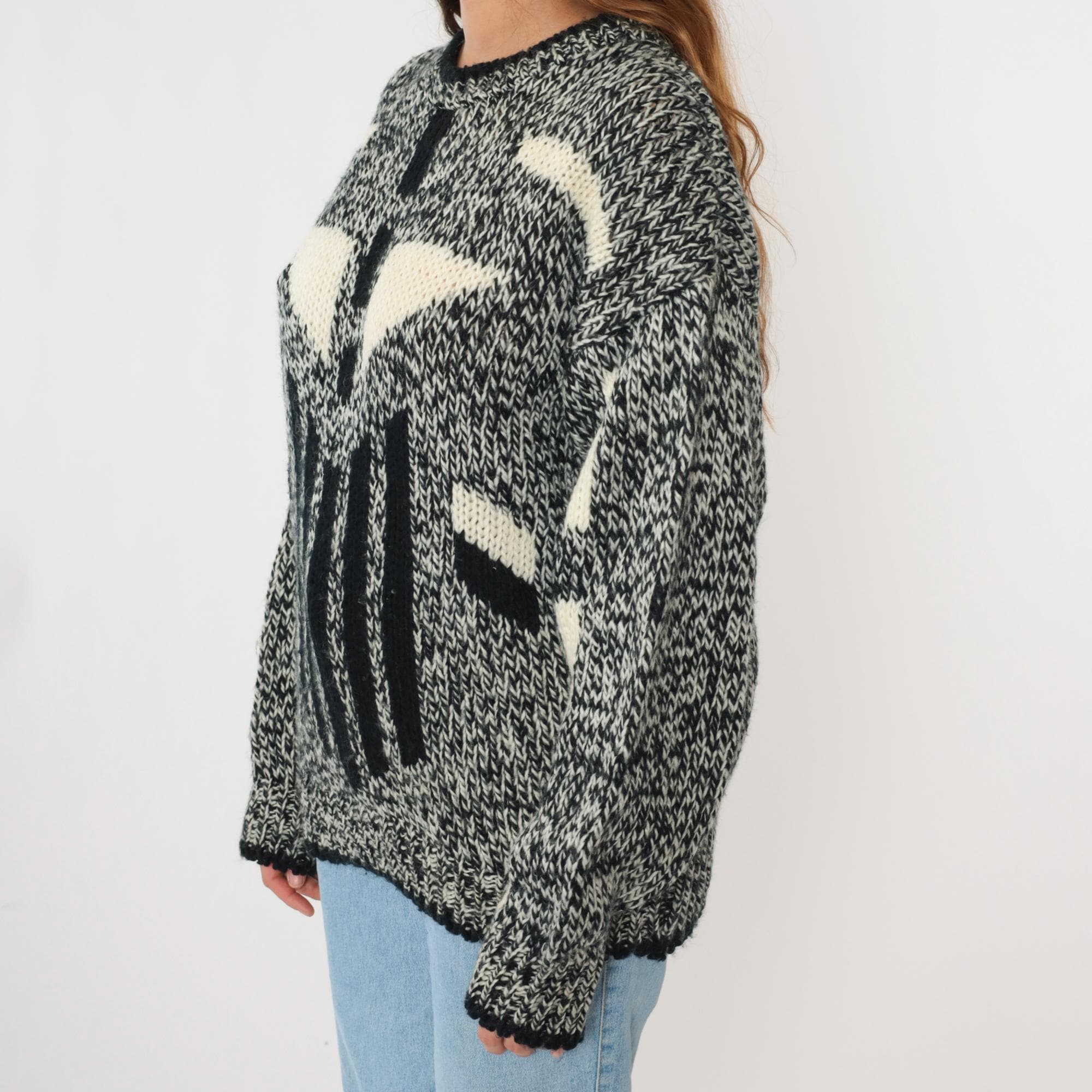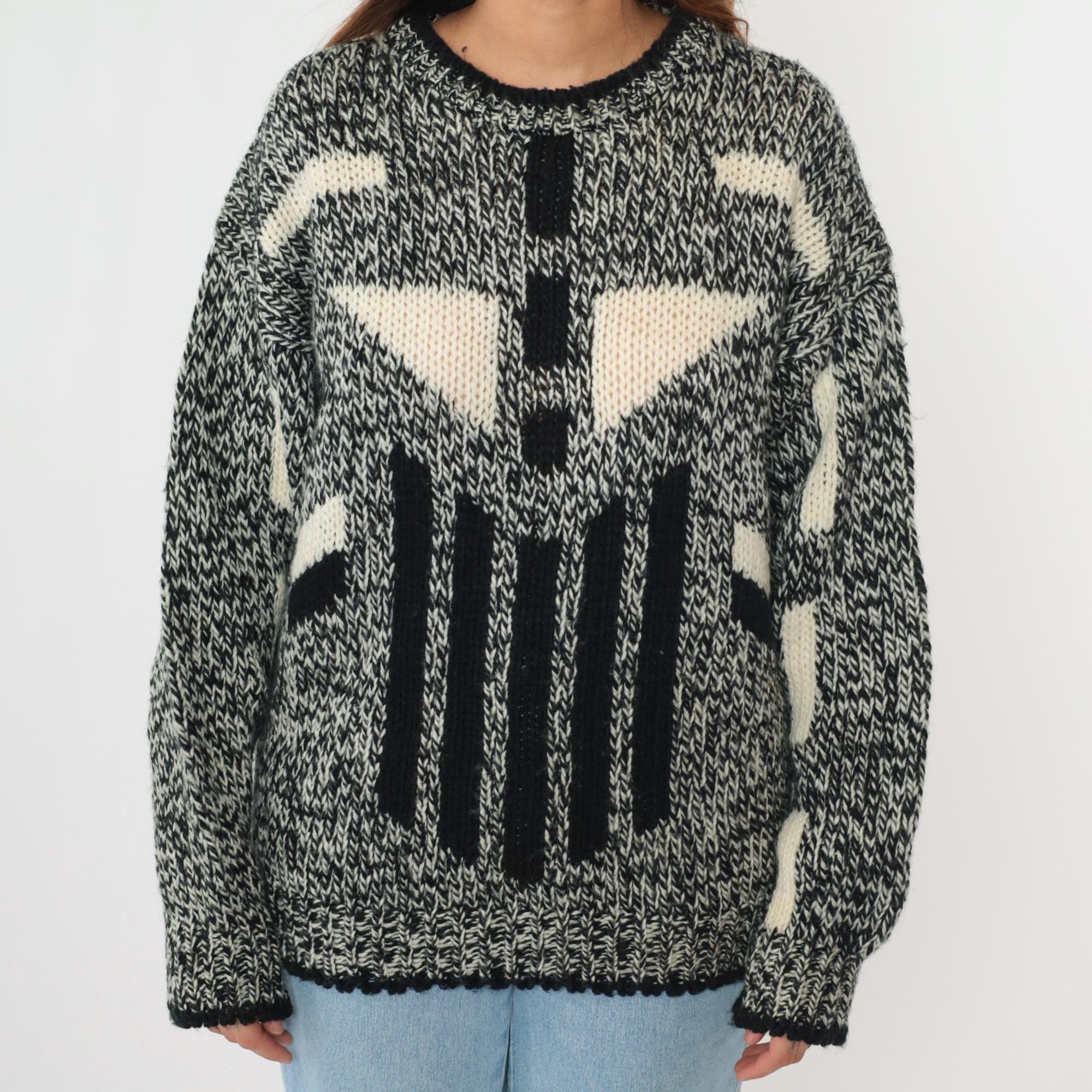 Vintage 1980s marled black and white chunky knit sweater featuring a bold geometric design across the front. This pullover sweater has a classic crew neck and a relaxed, oversized fit.